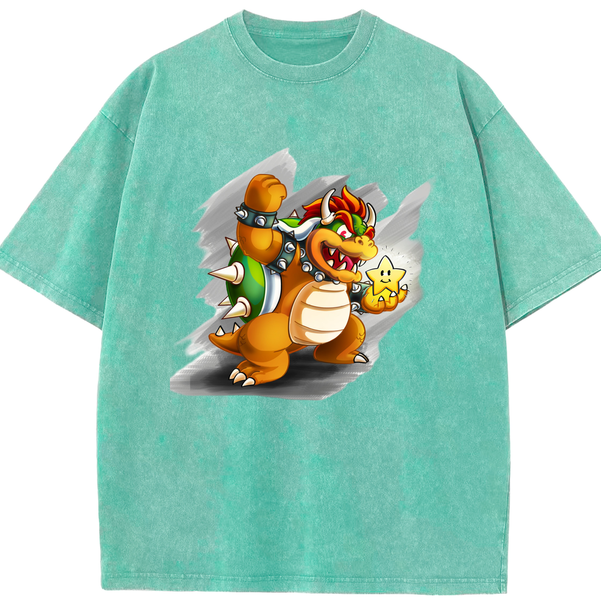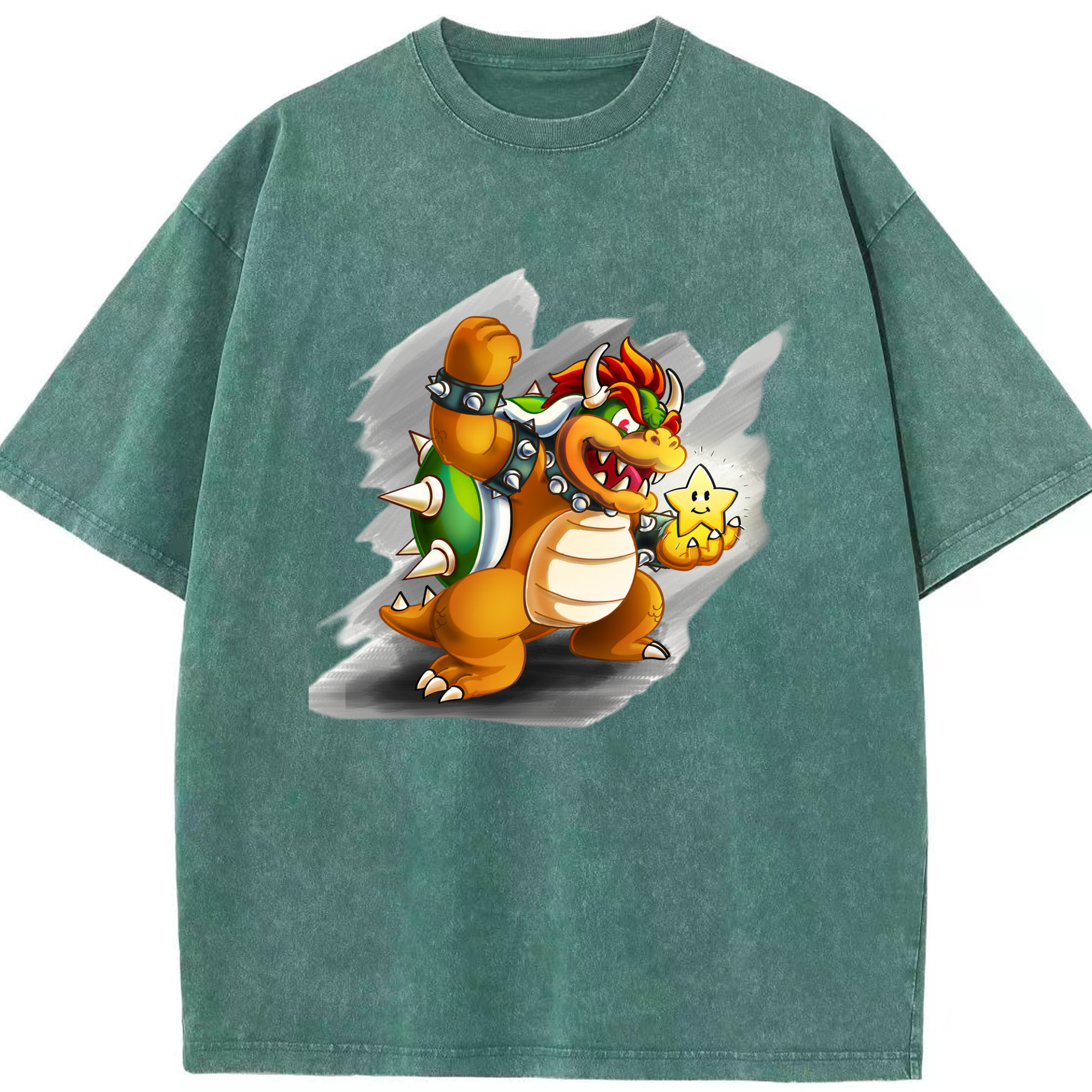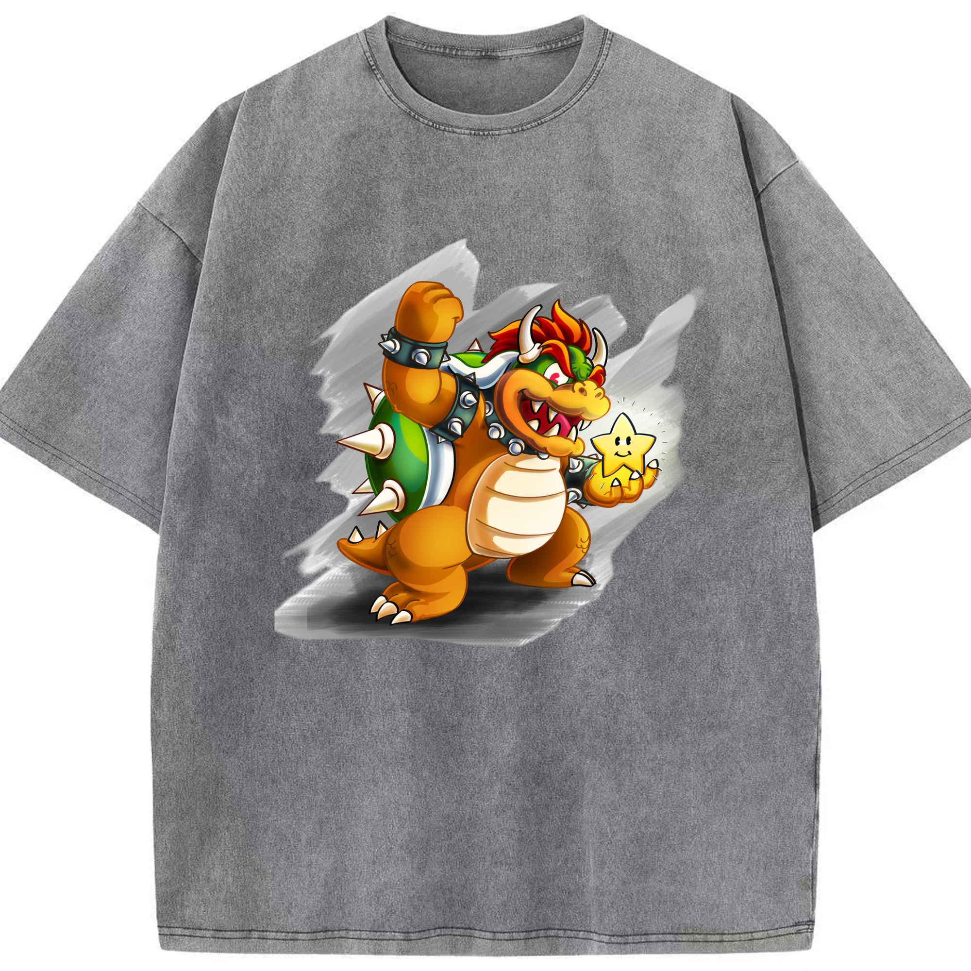 Bowser King Koopa celebratory gesture Graphic T-Shirt - Washed Vintage Look 230g Cotton Oversized T-Shirt With Front Heat Transfer Print – Soft, Lightweight, Stylish Fit – Comfortable Casual Wear For Sports & Everyday Use