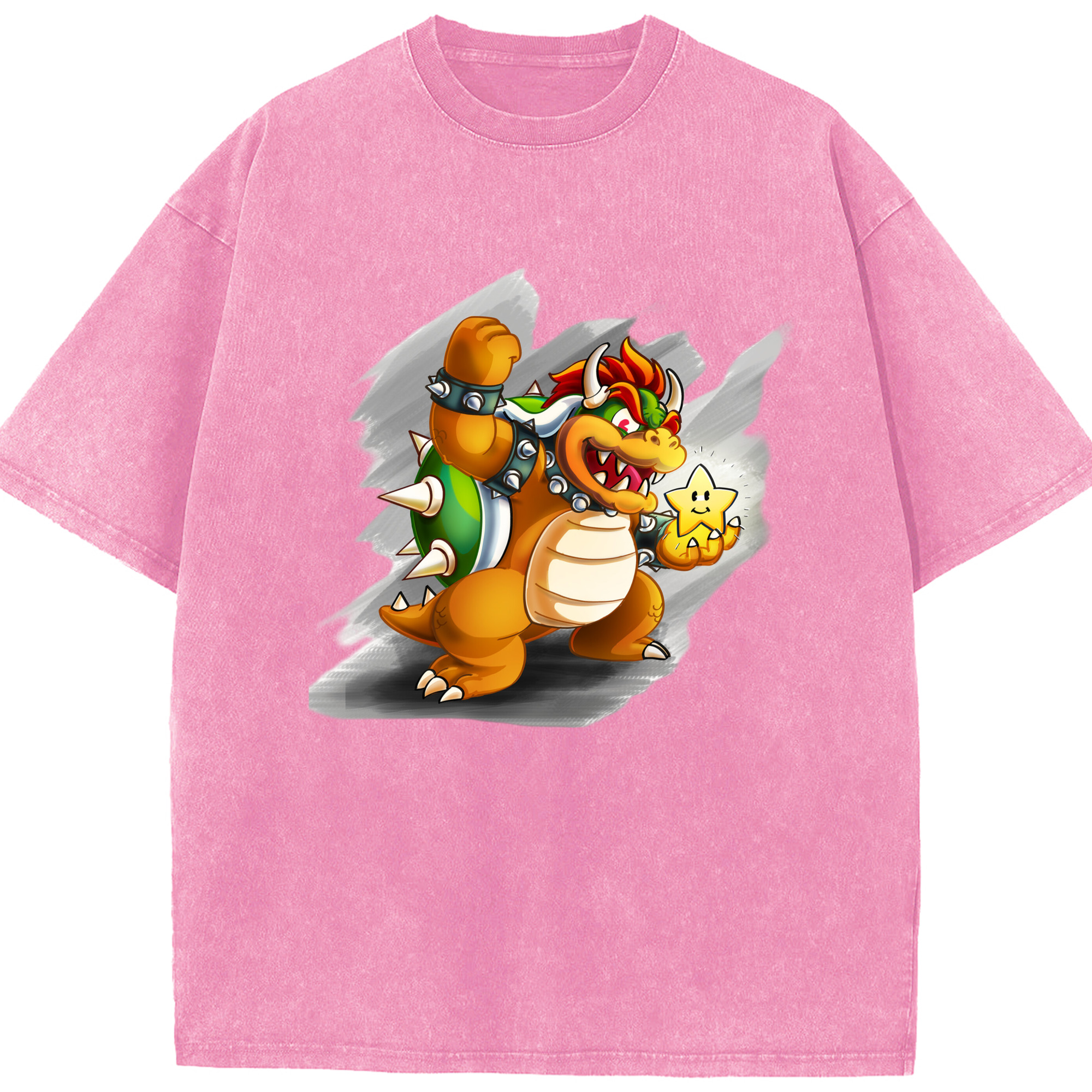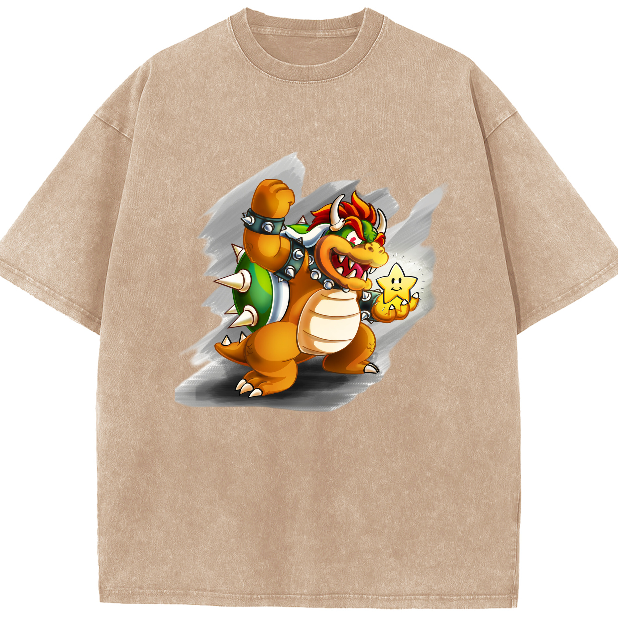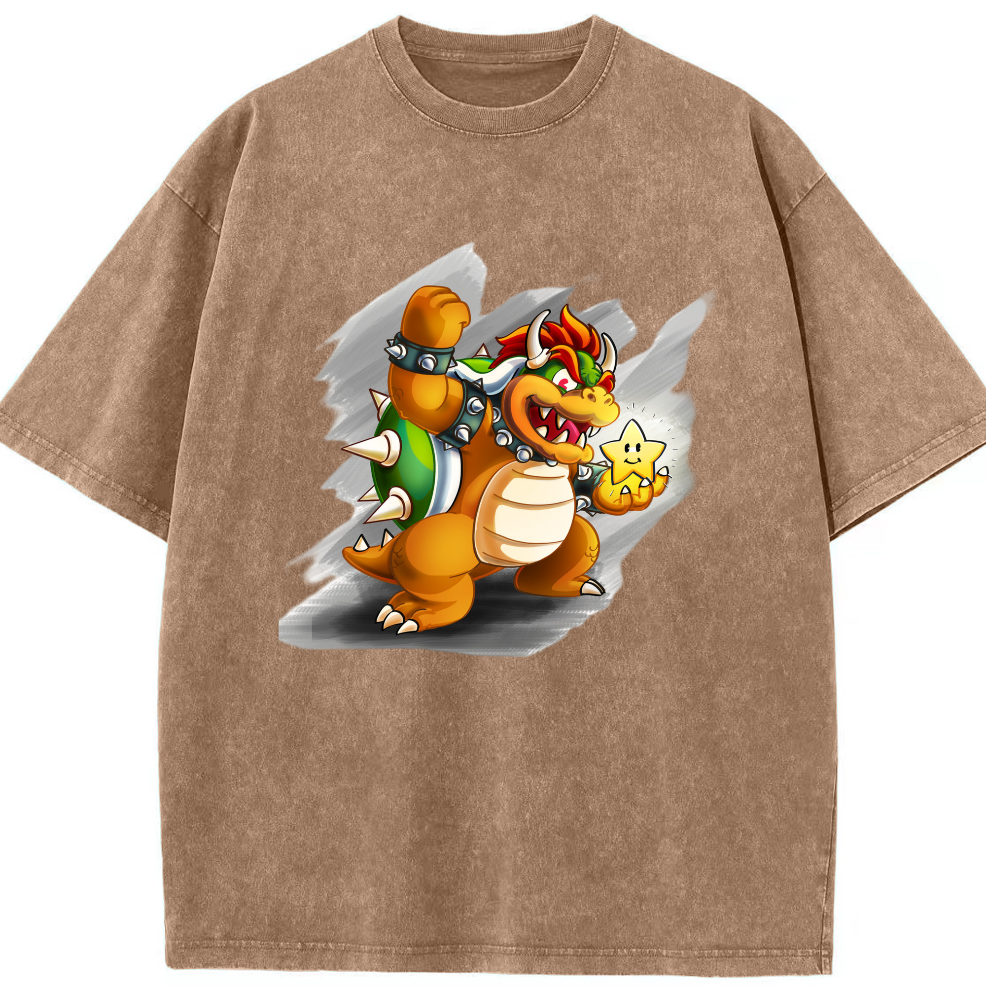 Bowser King Koopa celebratory gesture Graphic T-Shirt - Washed Vintage Look 230g Cotton Oversized T-Shirt With Front Heat Transfer Print – Soft, Lightweight, Stylish Fit – Comfortable Casual Wear For Sports & Everyday Use