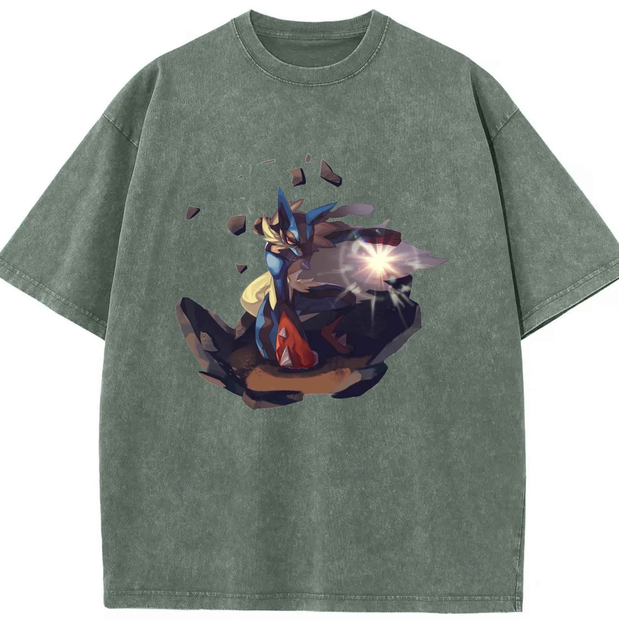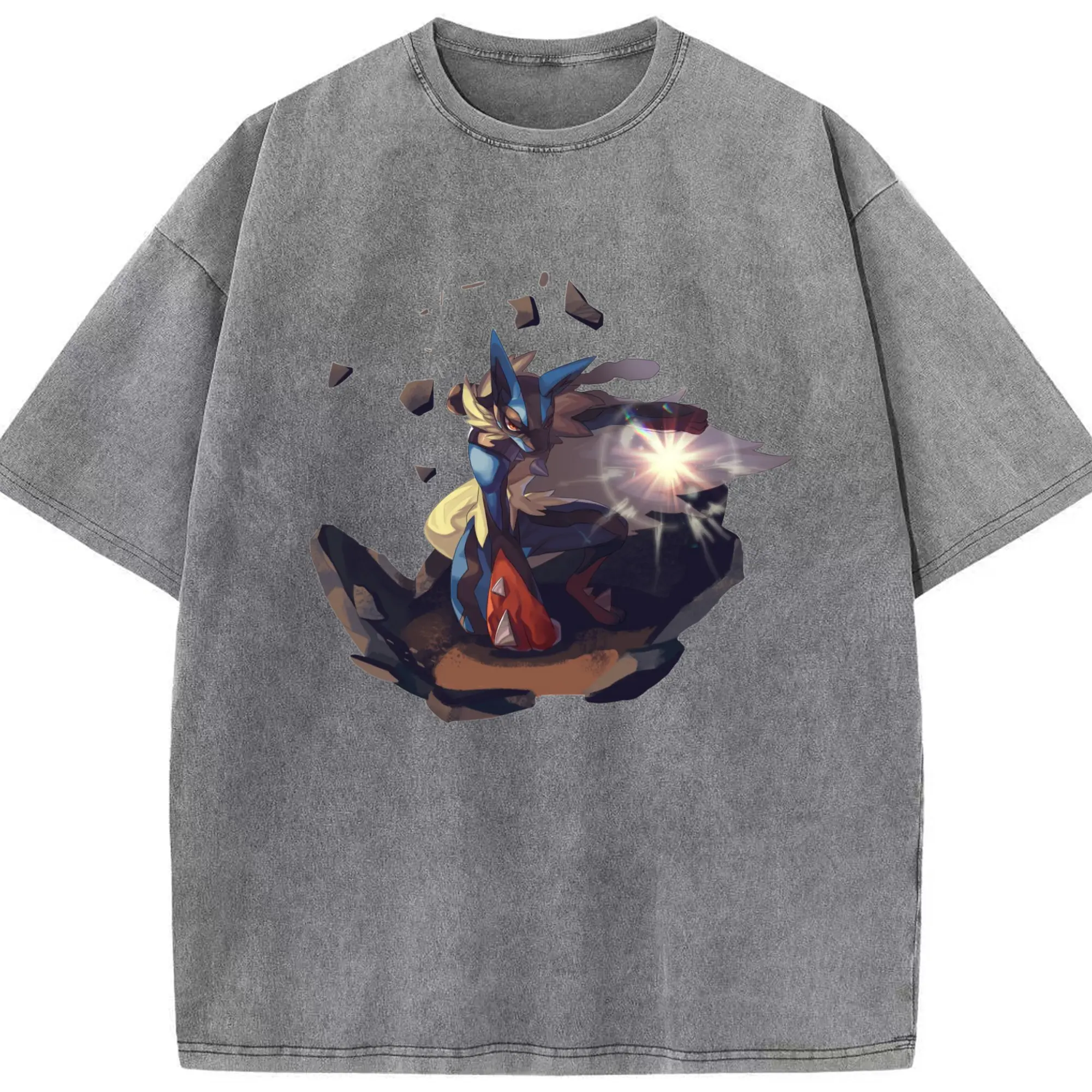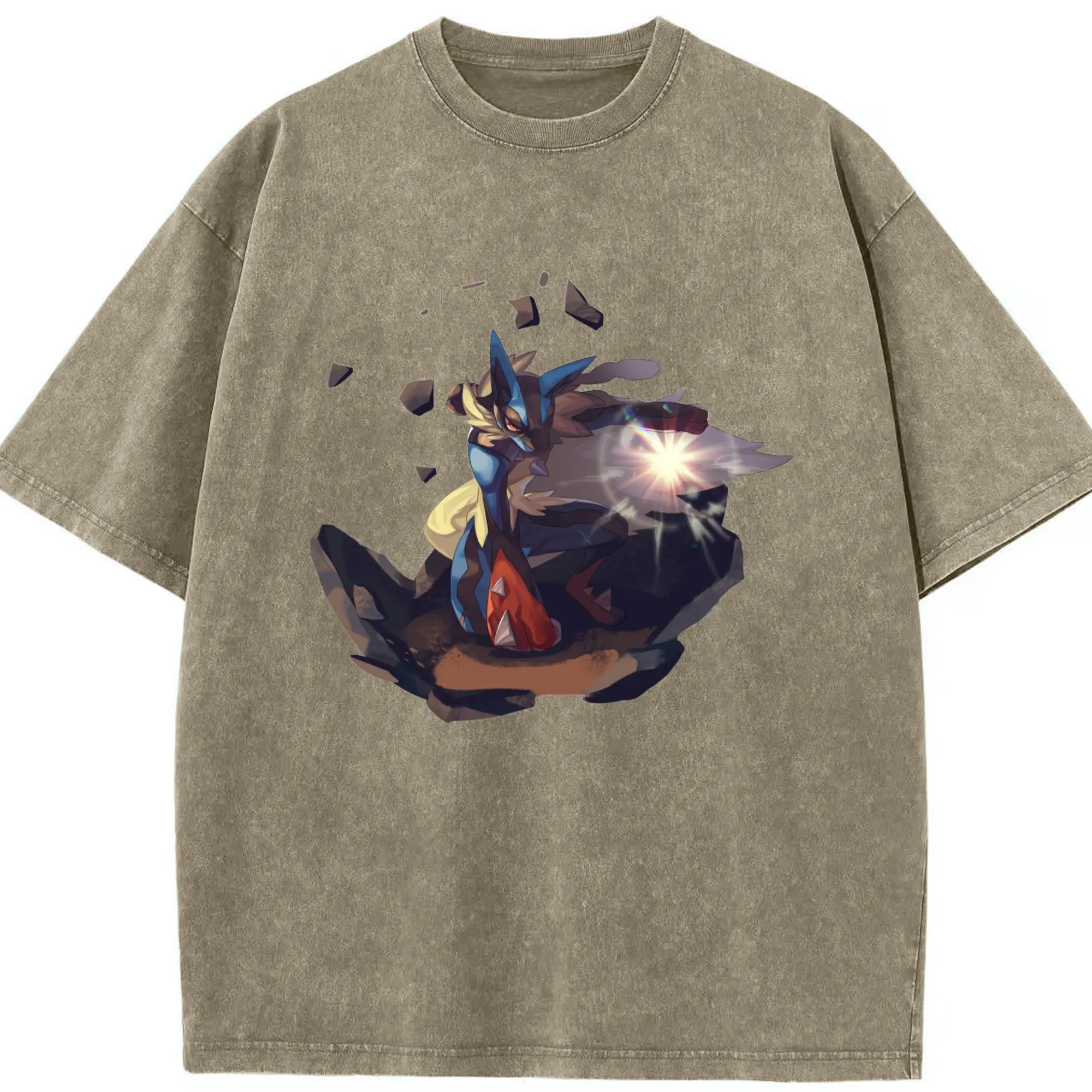 Cool Lucario collage graphic t shirt - Washed Vintage Look 230g Cotton Oversized T-Shirt With Front Heat Transfer Print – Soft, Lightweight, Stylish Fit – Comfortable Casual Wear For Sports & Everyday Use