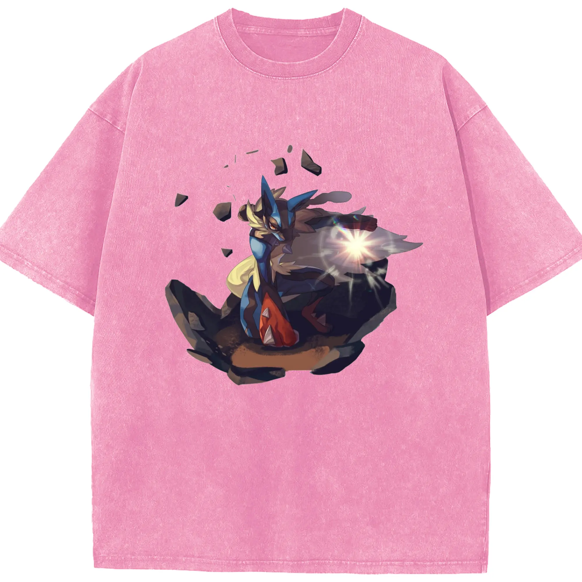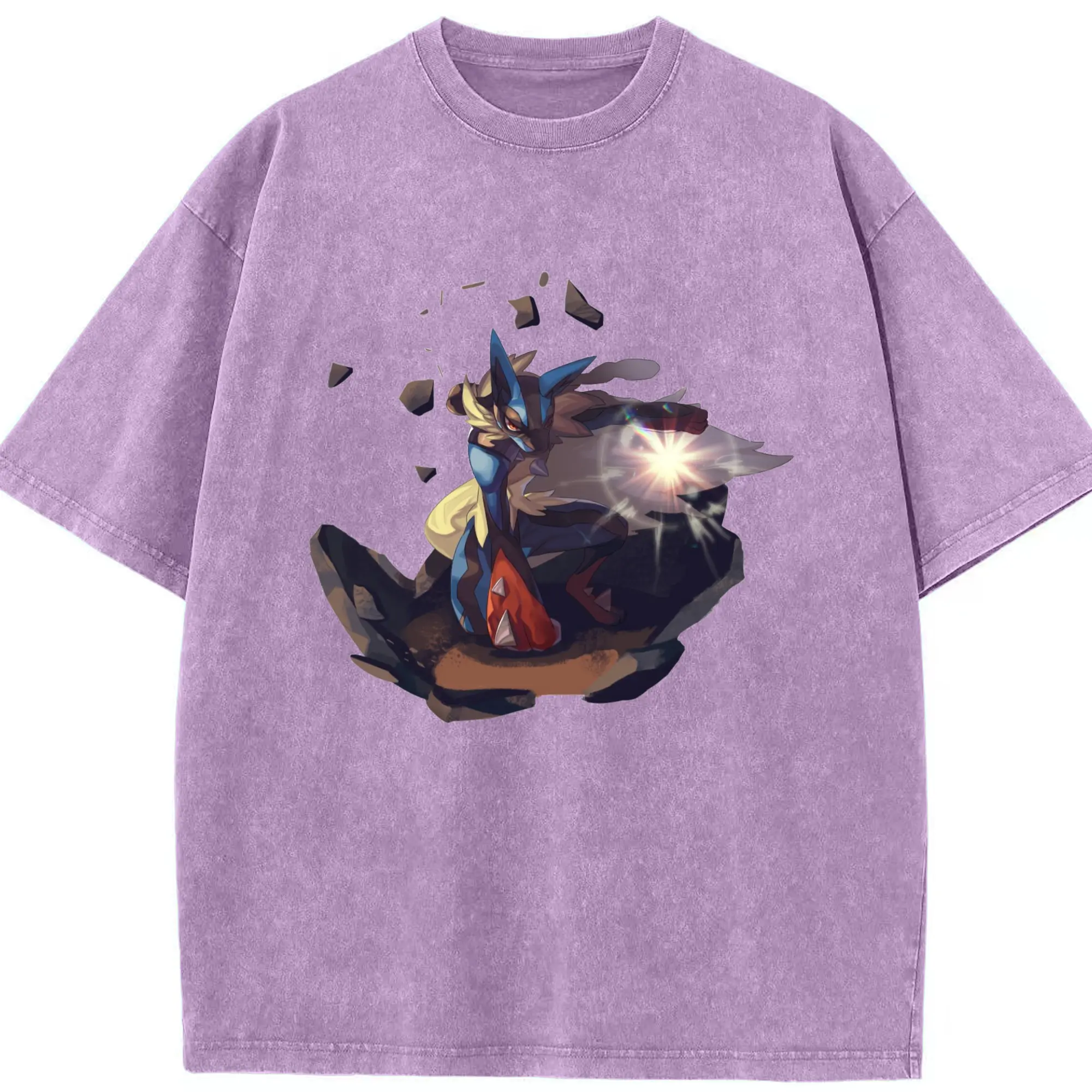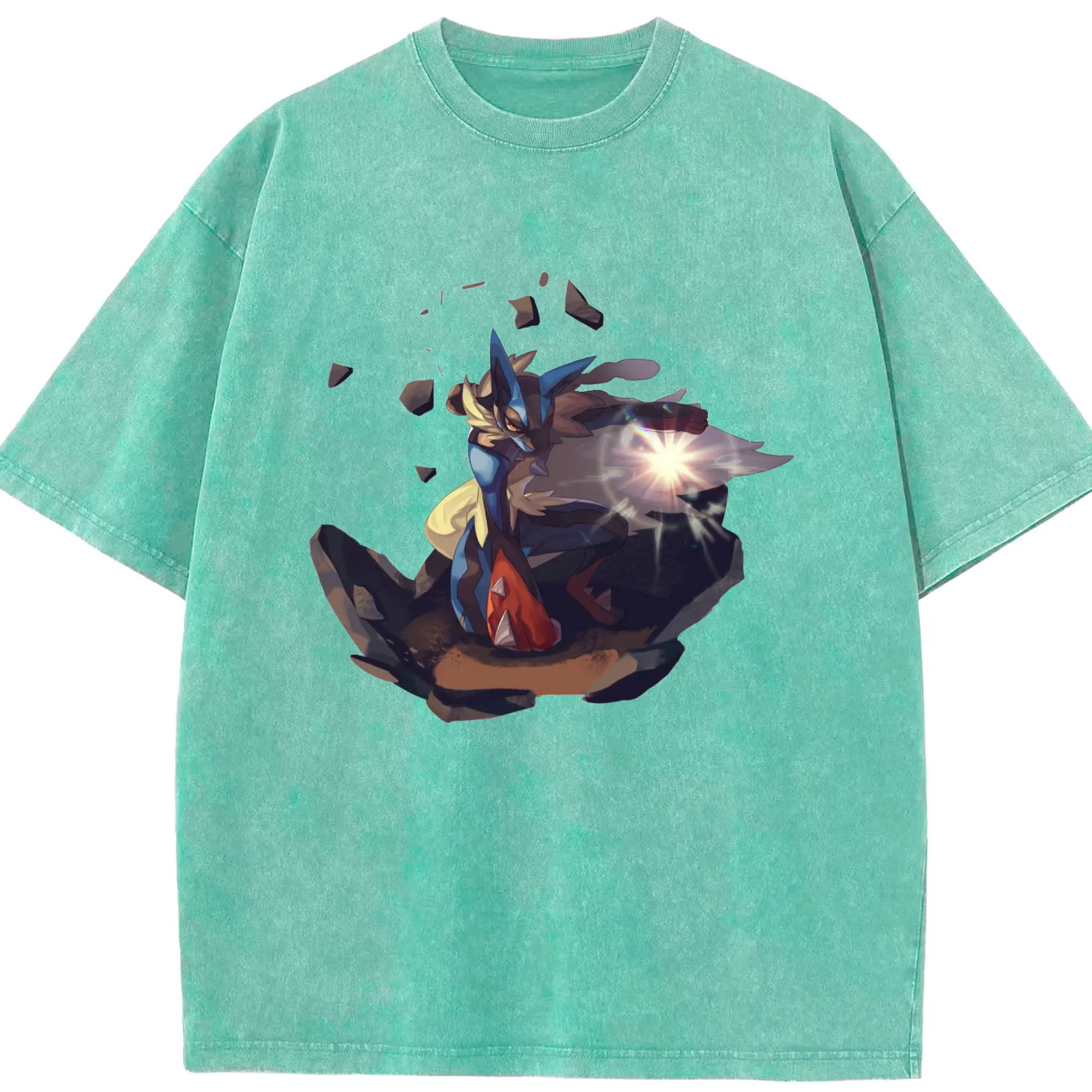 Cool Lucario collage graphic t shirt - Washed Vintage Look 230g Cotton Oversized T-Shirt With Front Heat Transfer Print – Soft, Lightweight, Stylish Fit – Comfortable Casual Wear For Sports & Everyday Use