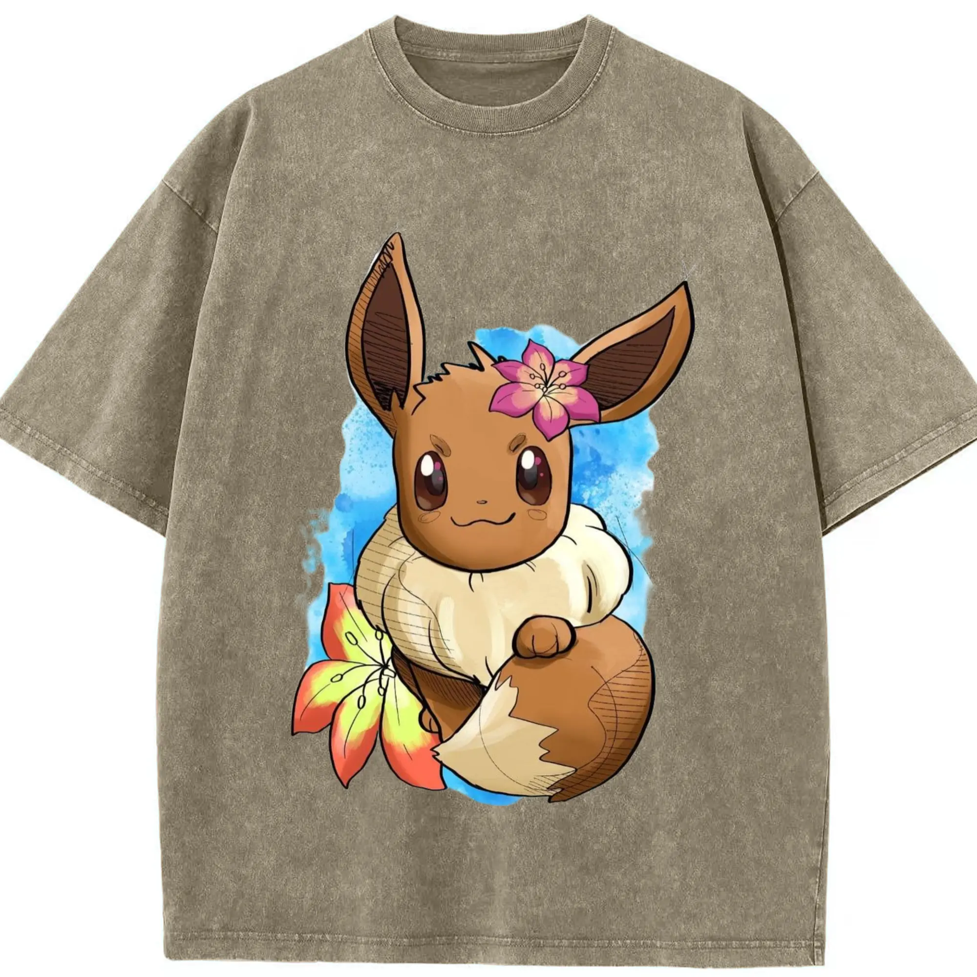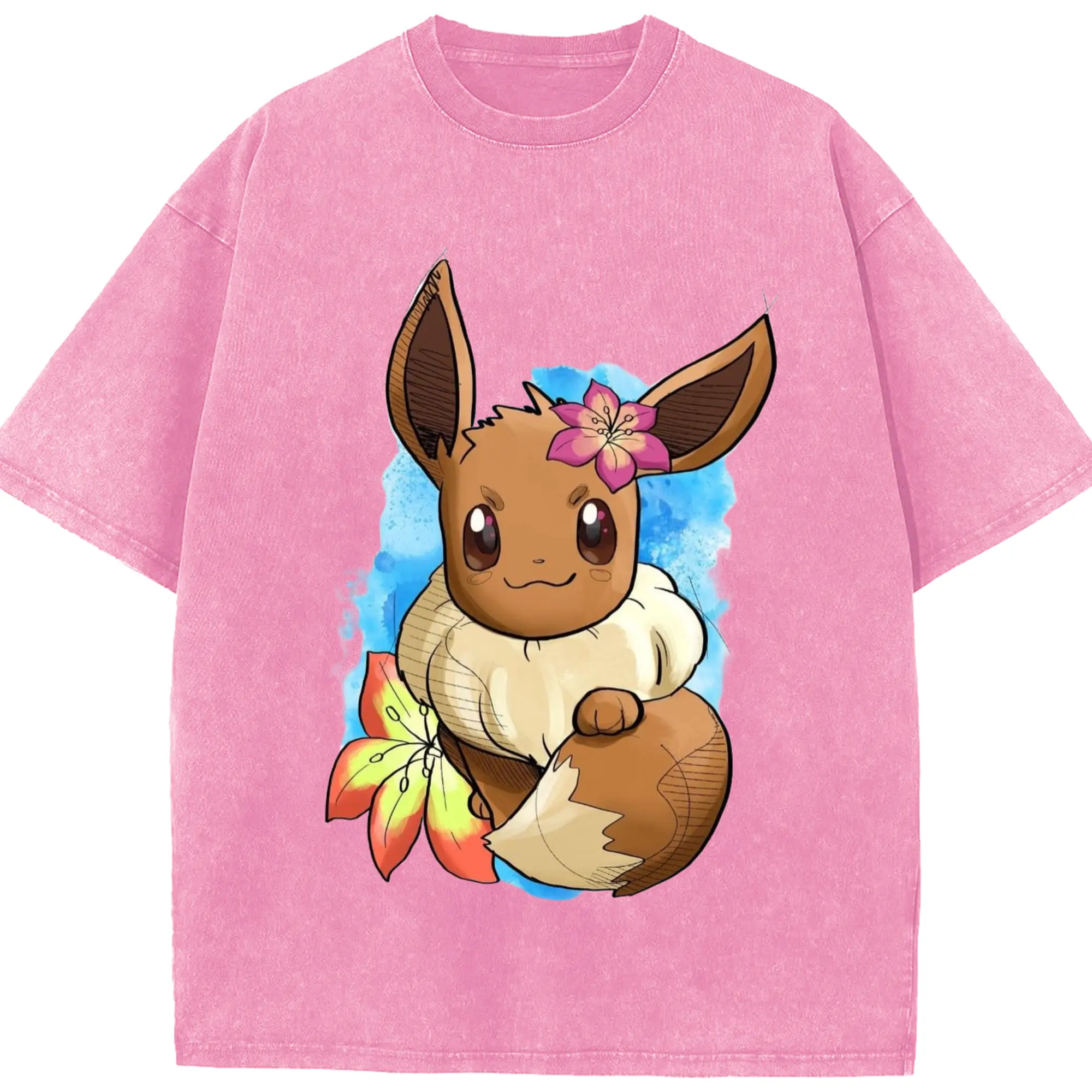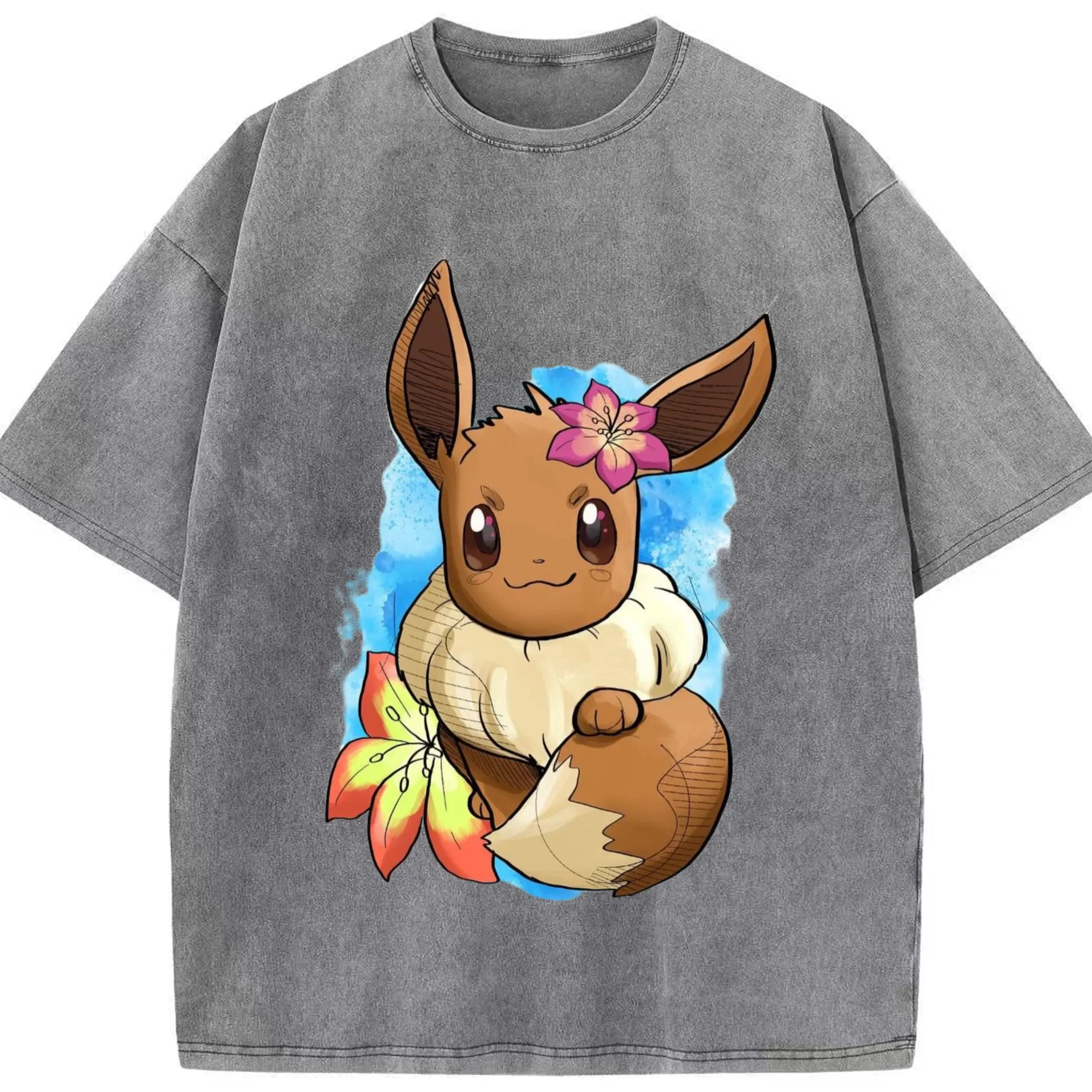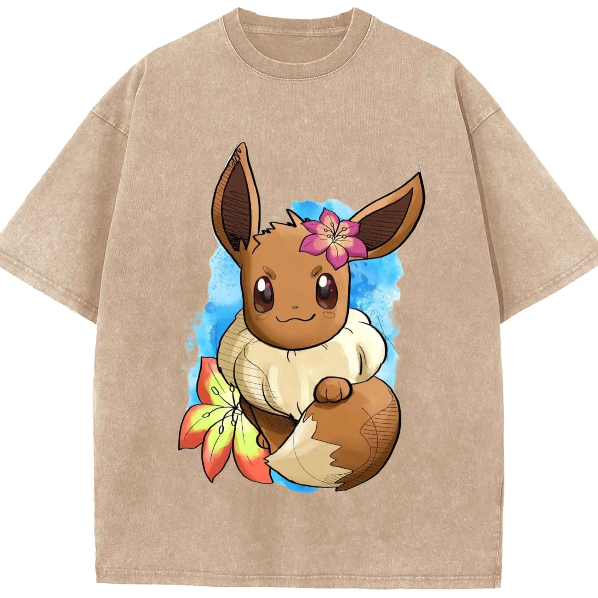 Eevee graphic tee - Washed Vintage Look 230g Cotton Oversized T-Shirt With Front Heat Transfer Print – Soft, Lightweight, Stylish Fit – Comfortable Casual Wear For Sports & Everyday Use