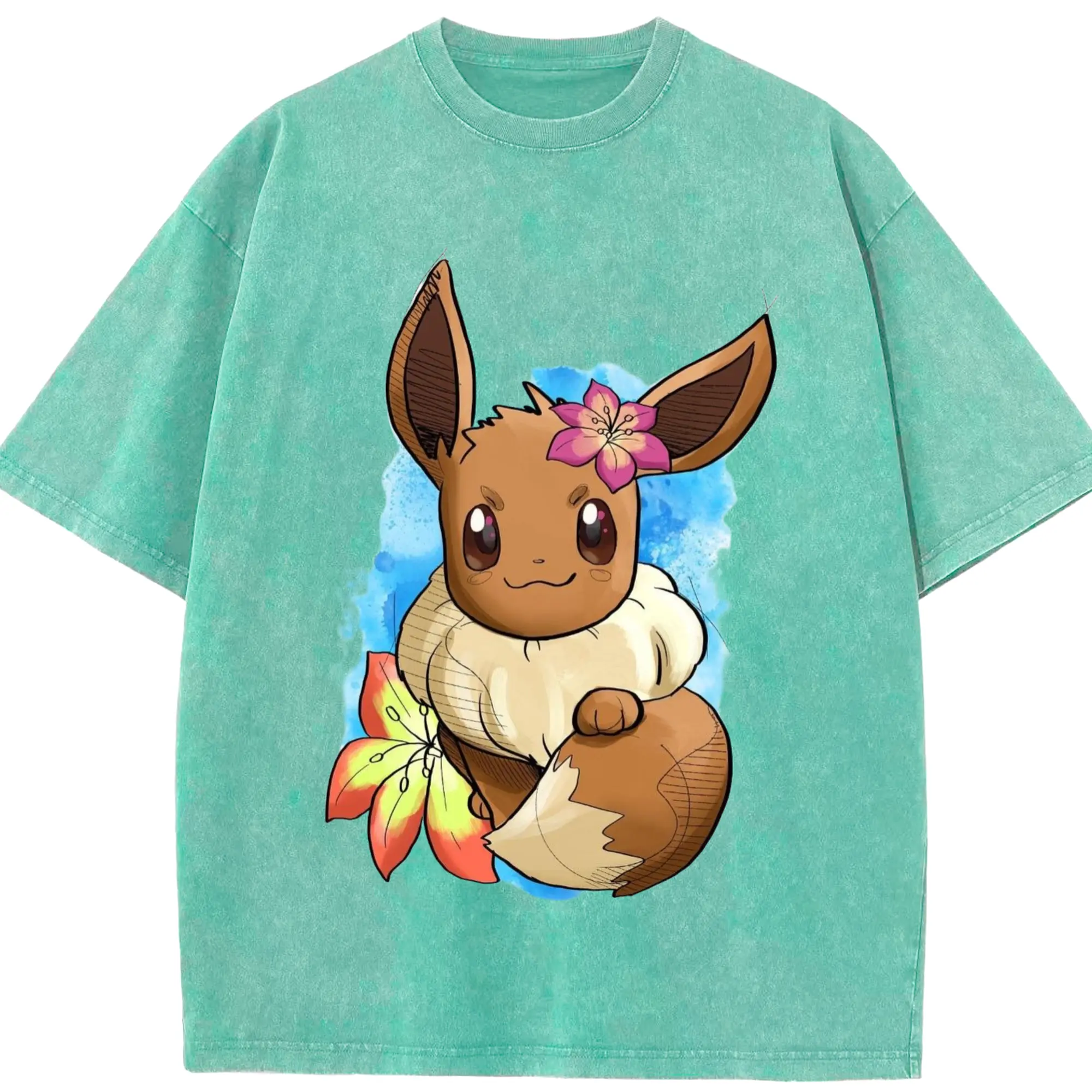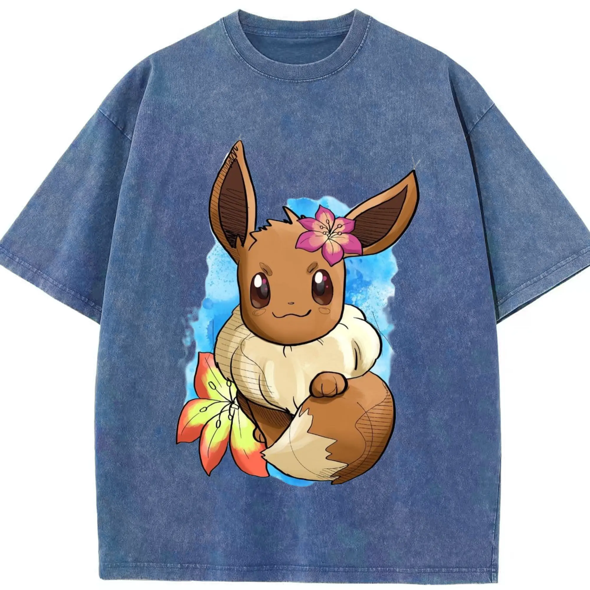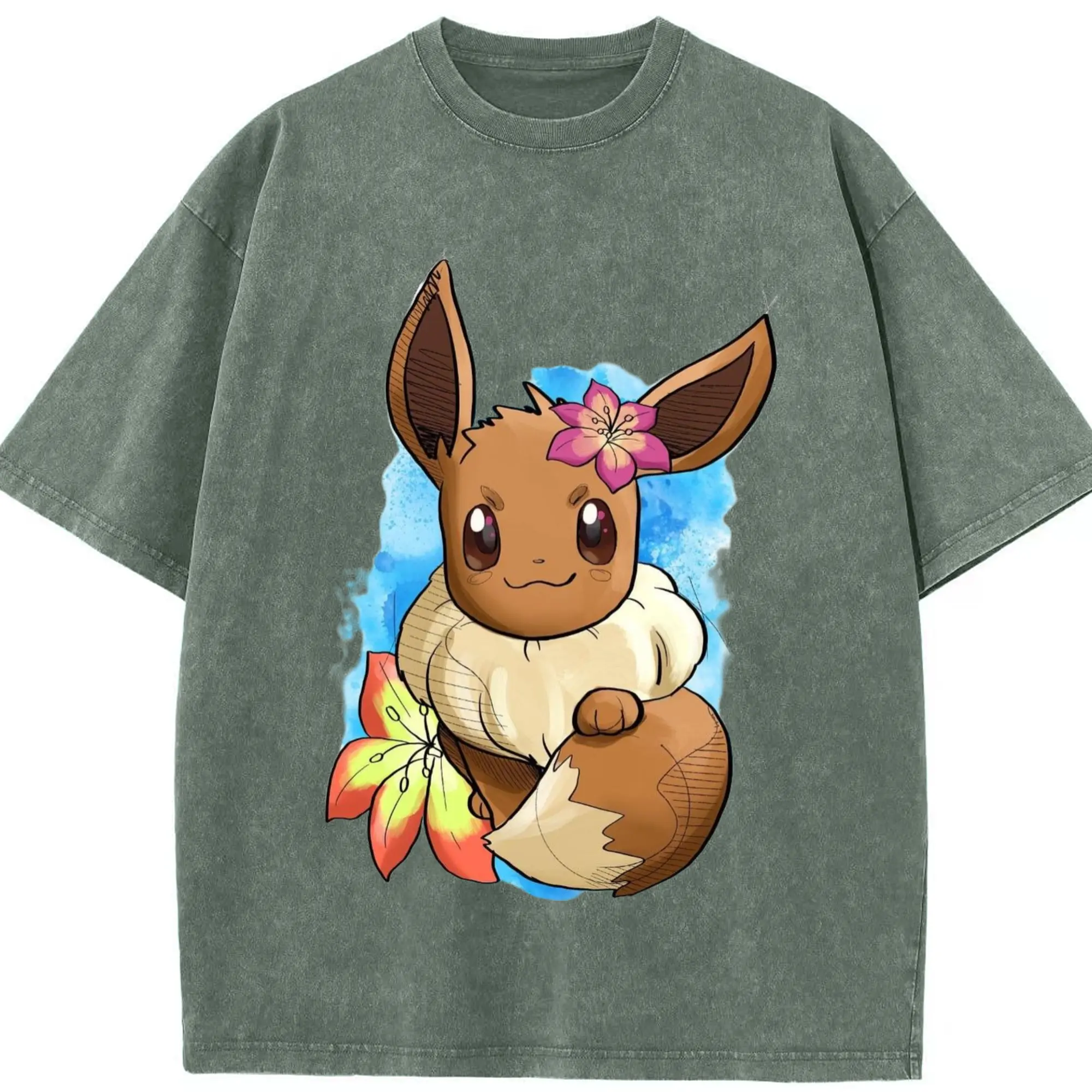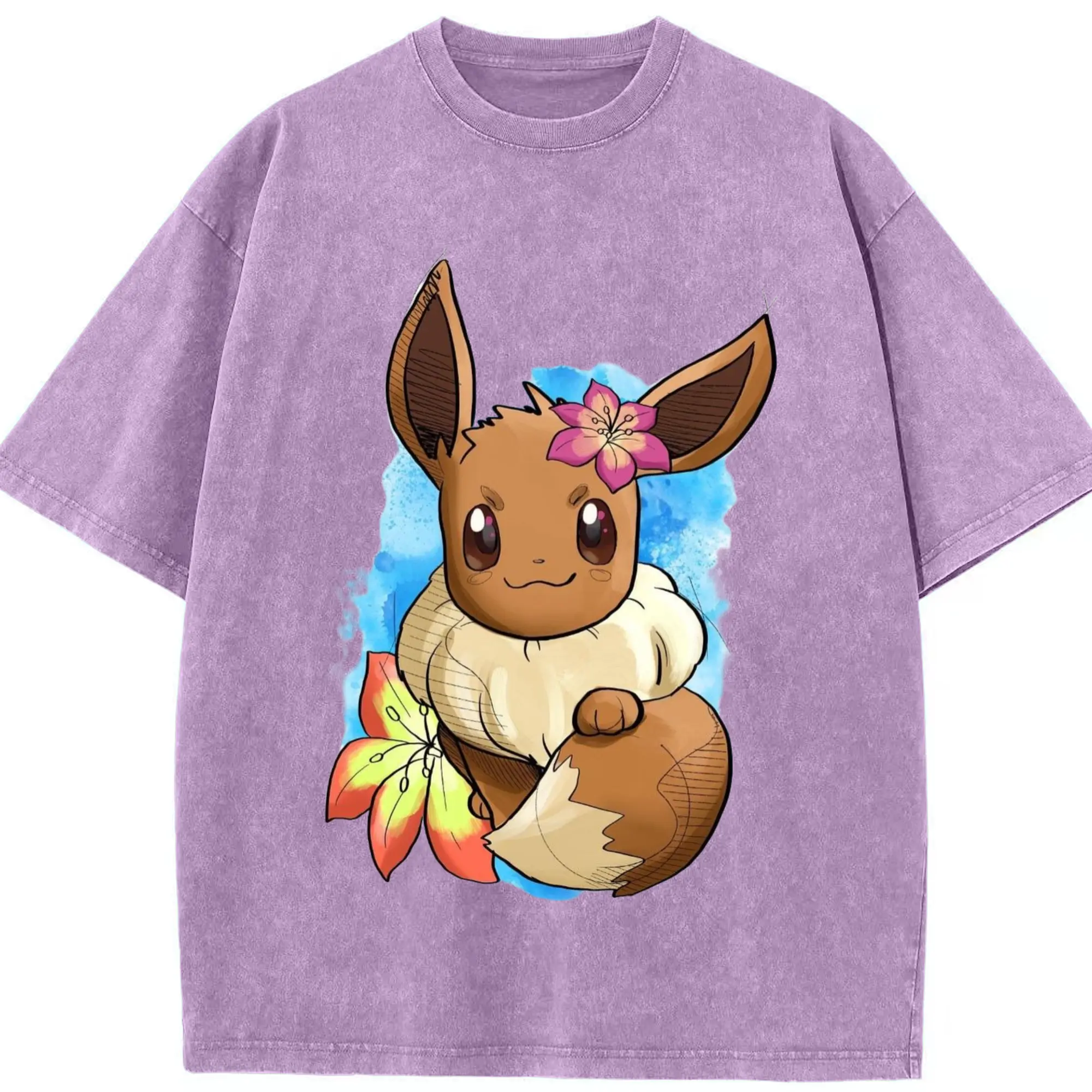 Eevee graphic tee - Washed Vintage Look 230g Cotton Oversized T-Shirt With Front Heat Transfer Print – Soft, Lightweight, Stylish Fit – Comfortable Casual Wear For Sports & Everyday Use