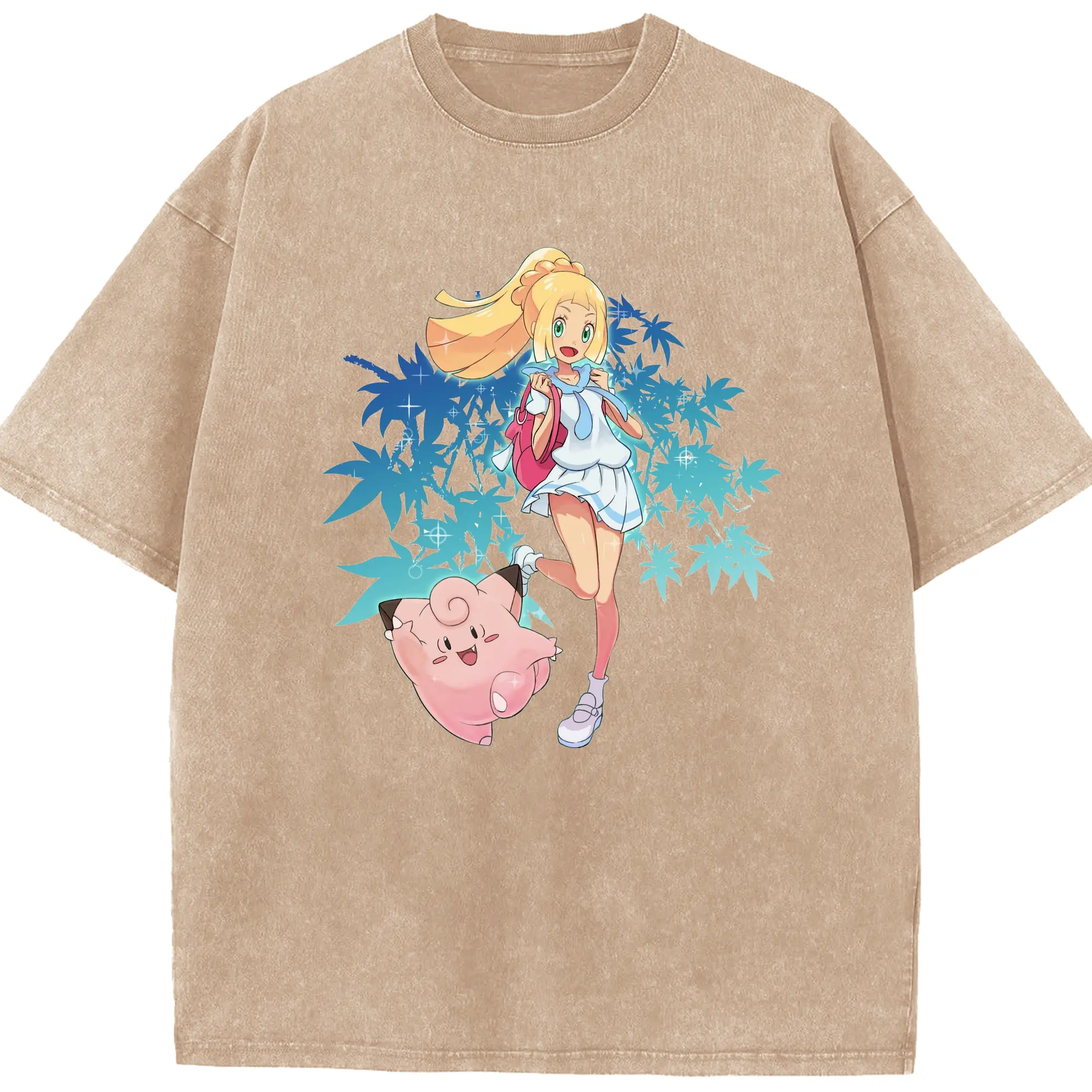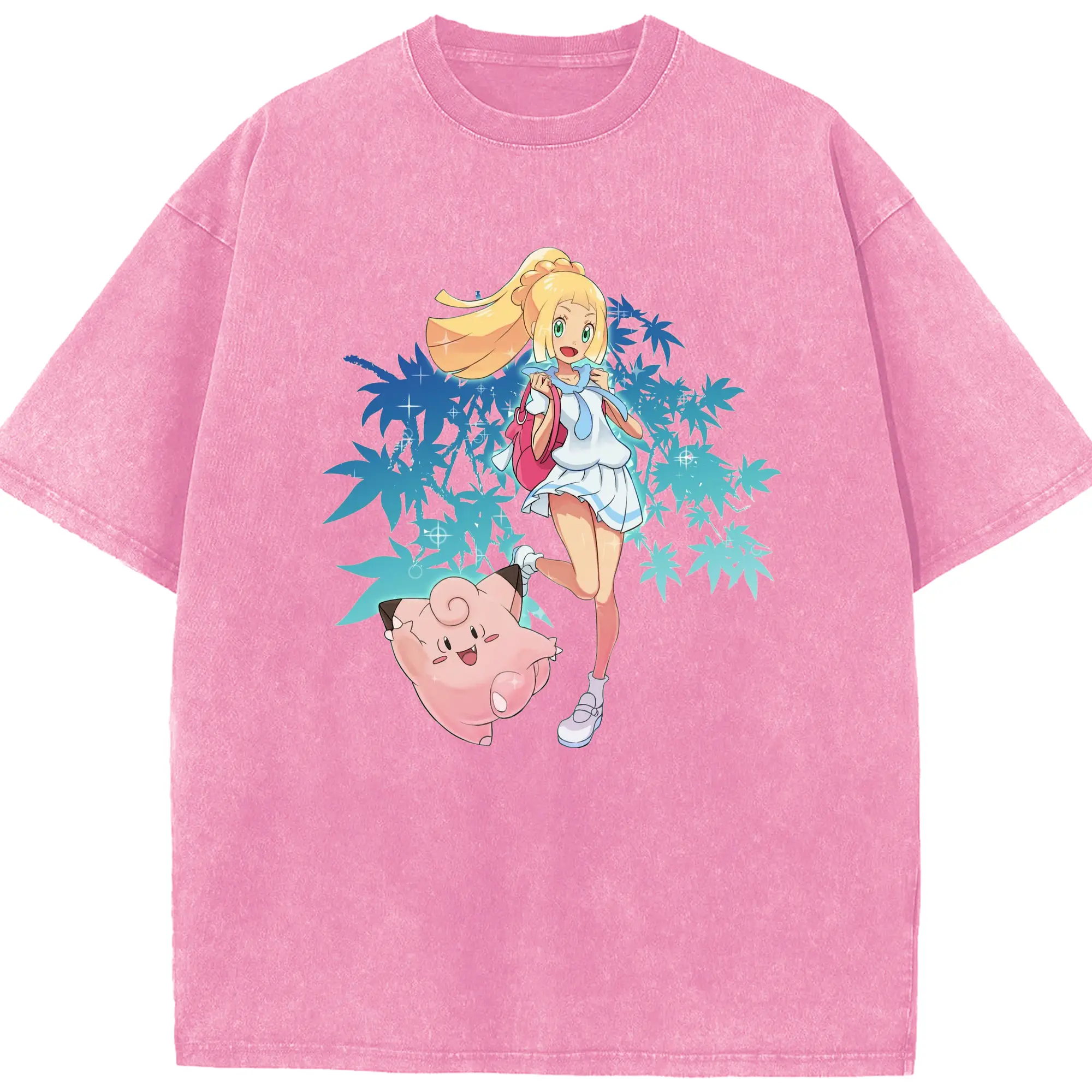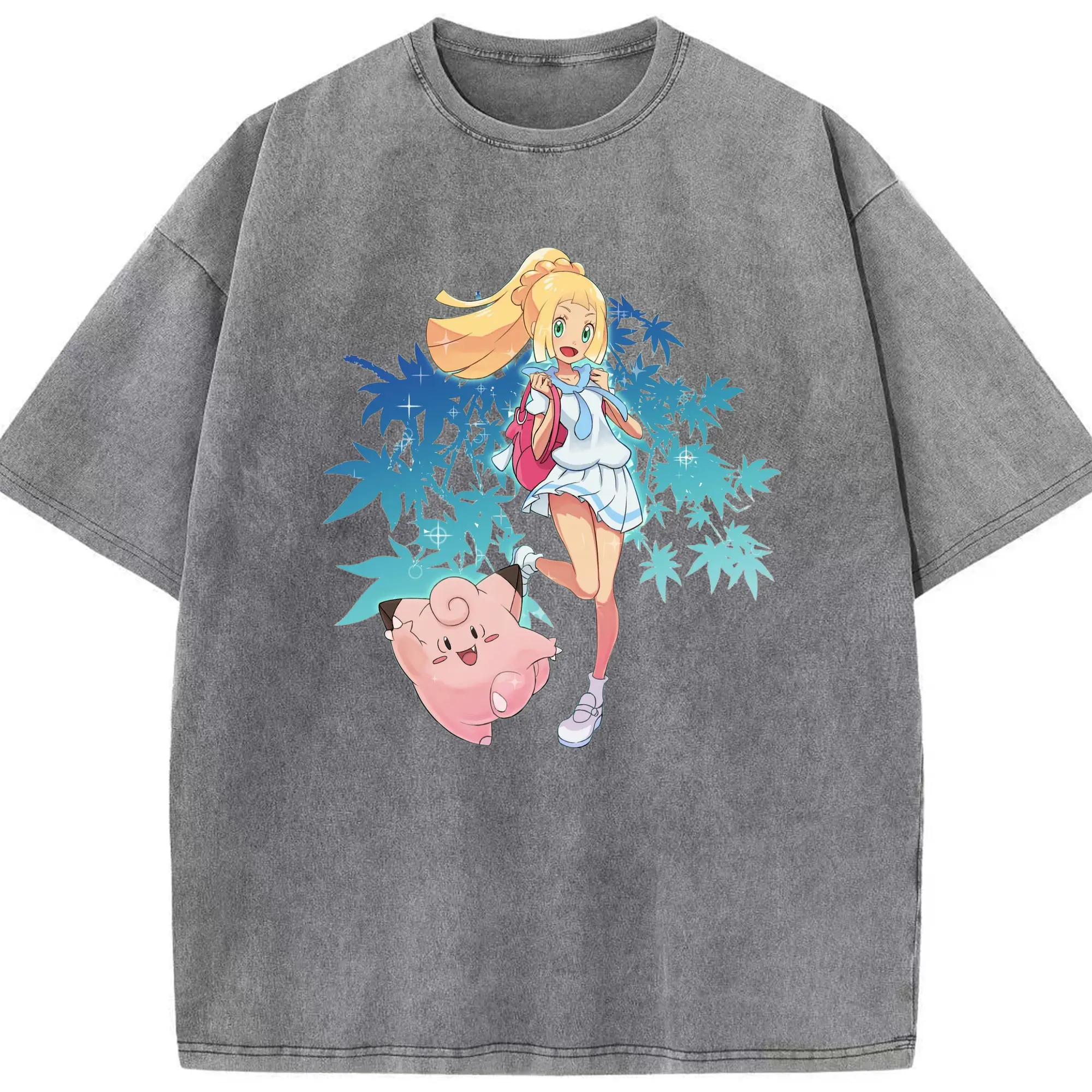 Girl Lillie Pokemon T-Shirt - Washed Vintage Look 230g Cotton Oversized T-Shirt With Front Heat Transfer Print – Soft, Lightweight, Stylish Fit – Comfortable Casual Wear For Sports & Everyday Use