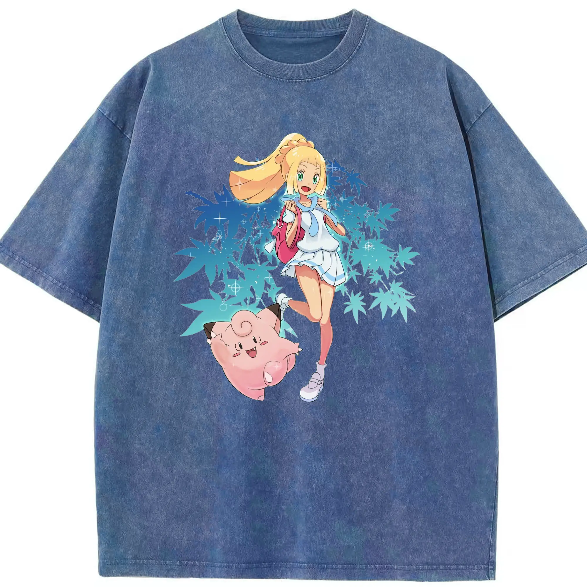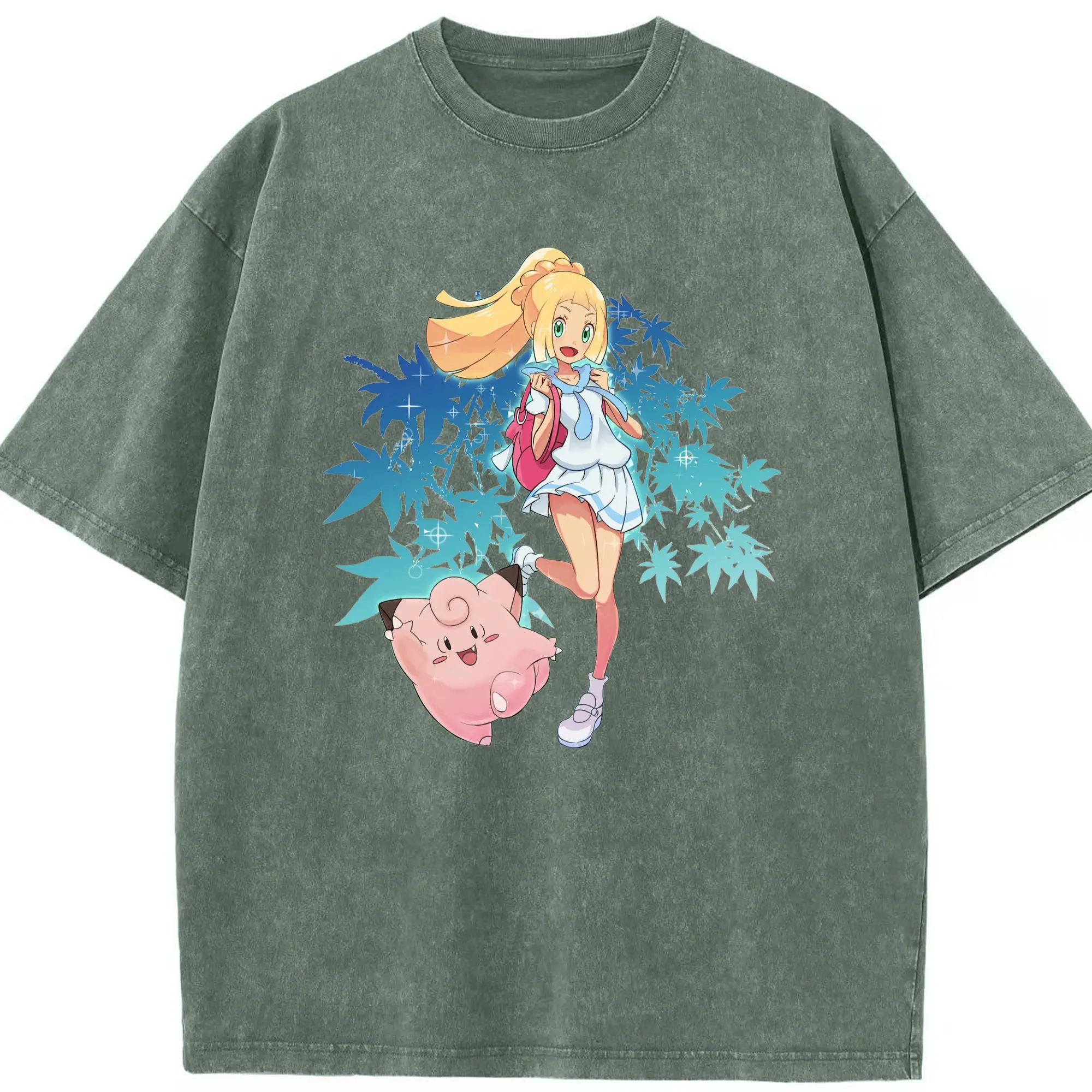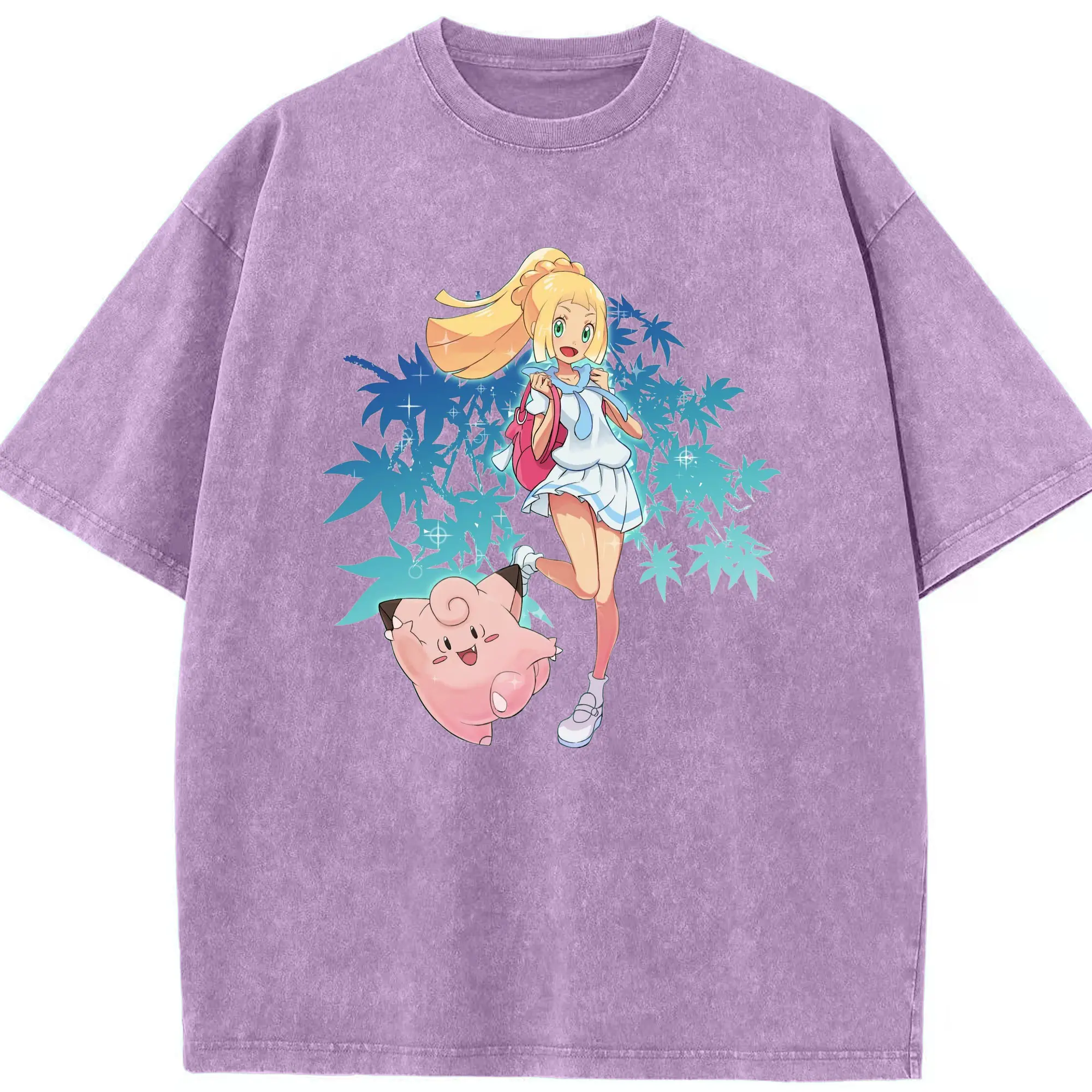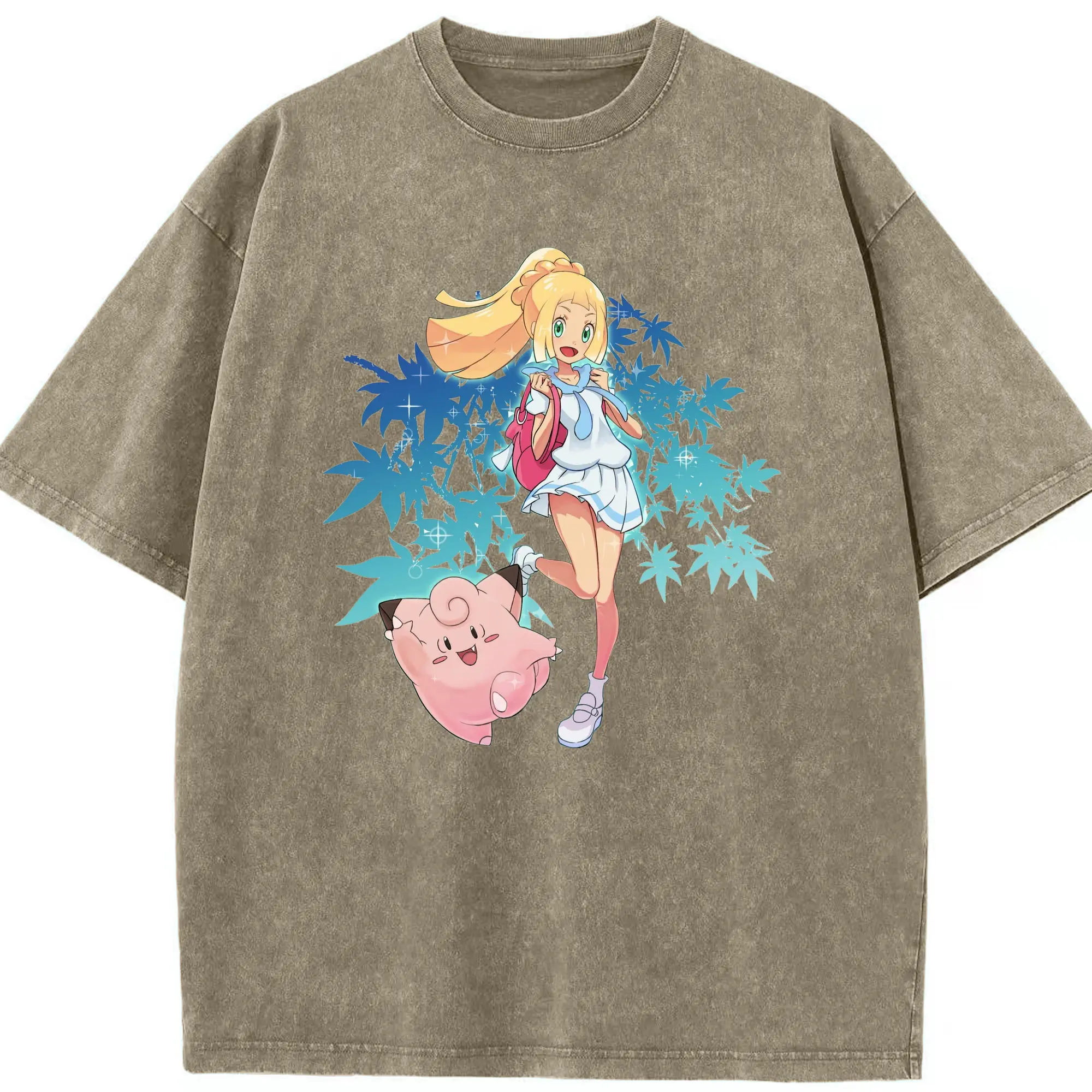 Girl Lillie Pokemon T-Shirt - Washed Vintage Look 230g Cotton Oversized T-Shirt With Front Heat Transfer Print – Soft, Lightweight, Stylish Fit – Comfortable Casual Wear For Sports & Everyday Use