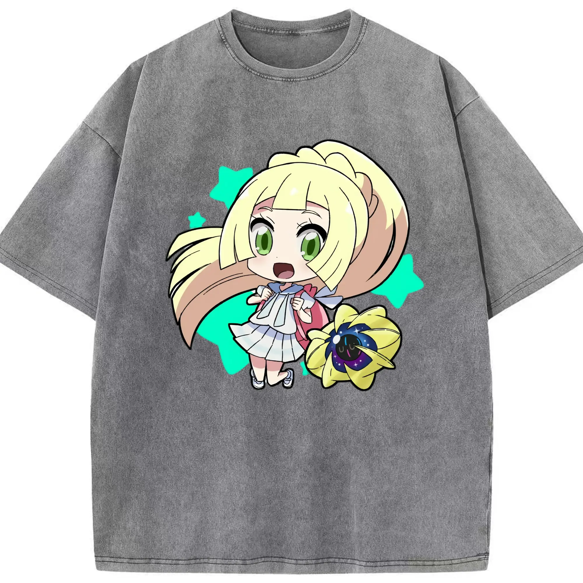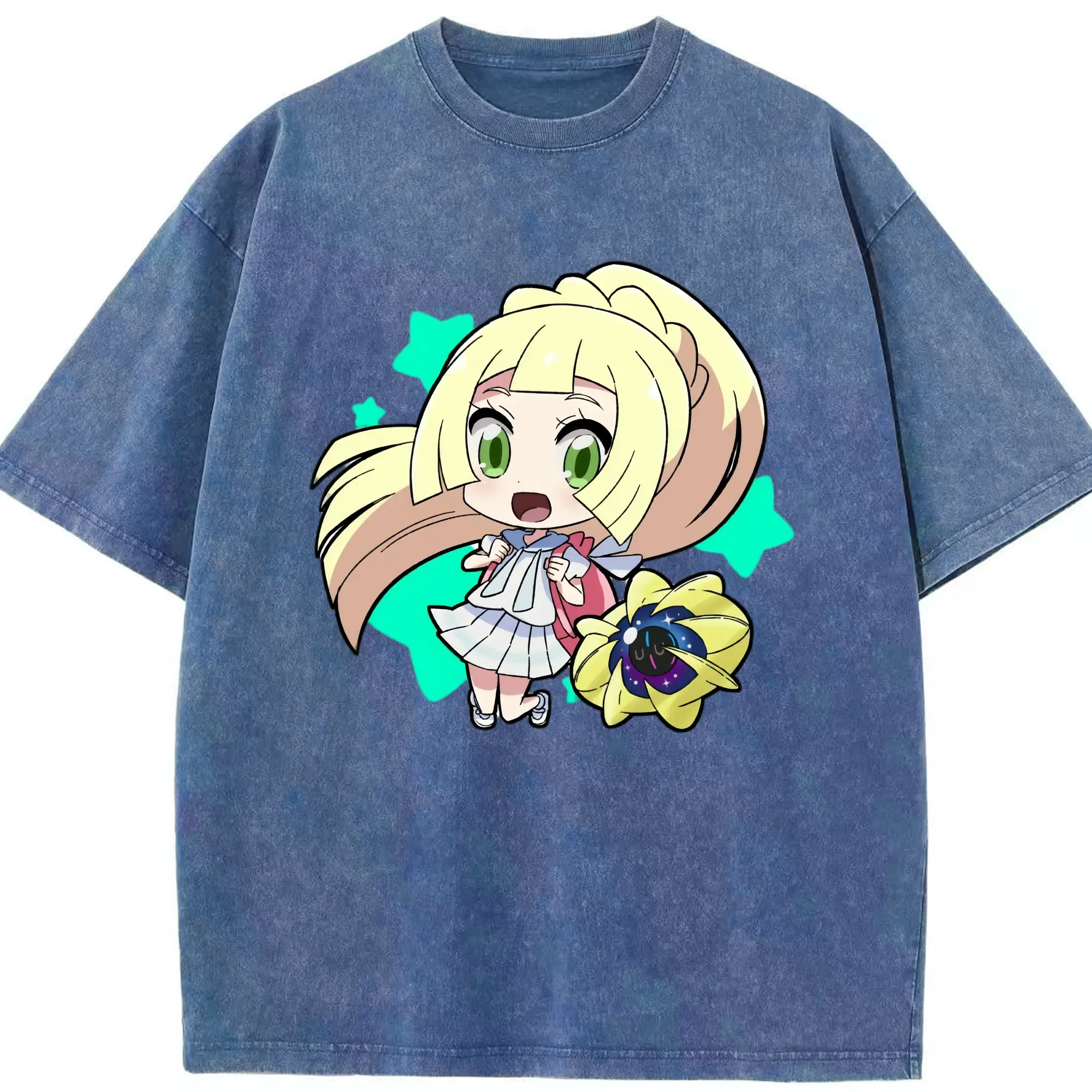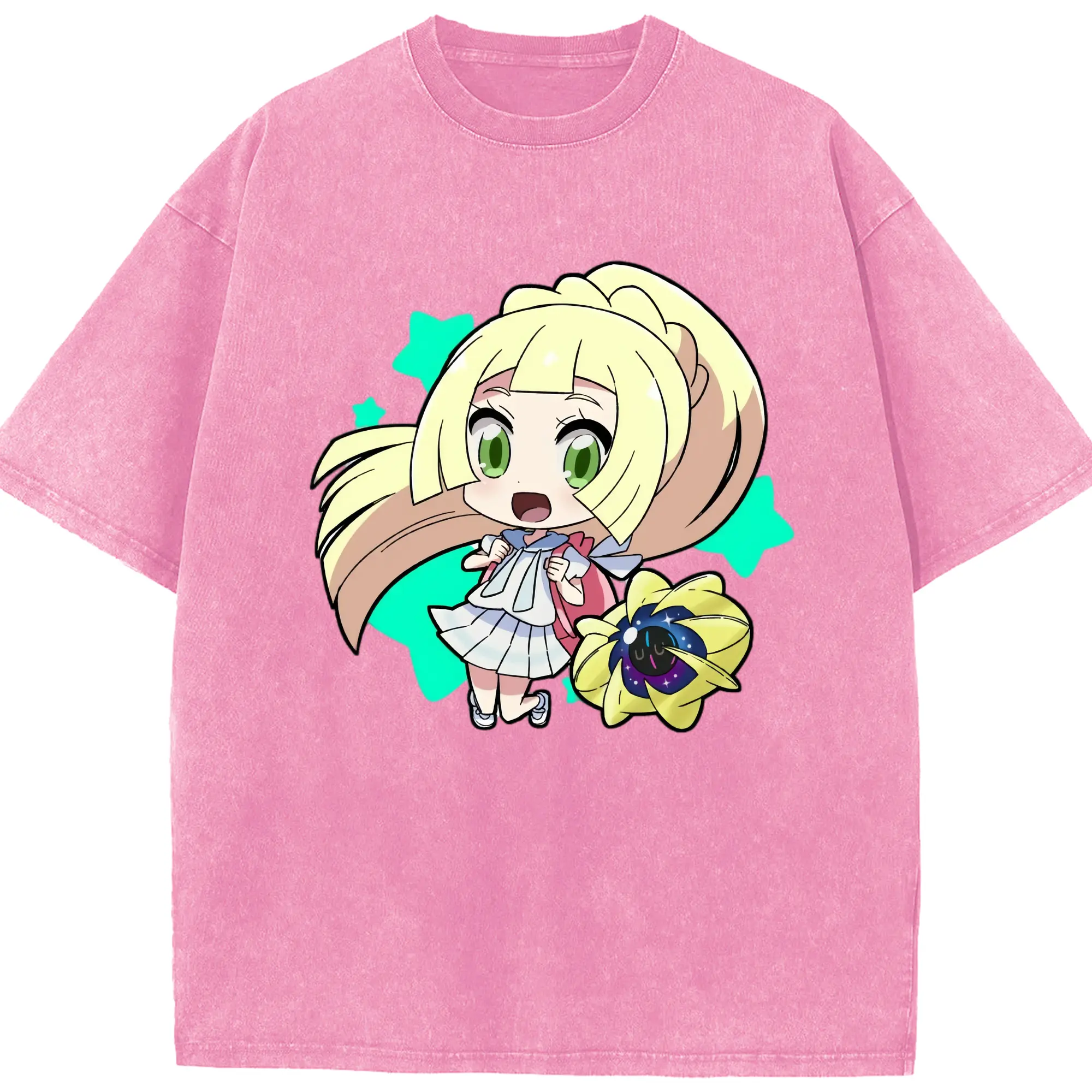 Girl Lillie Pokemon T-Shirts - Washed Vintage Look 230g Cotton Oversized T-Shirt With Front Heat Transfer Print – Soft, Lightweight, Stylish Fit – Comfortable Casual Wear For Sports & Everyday Use