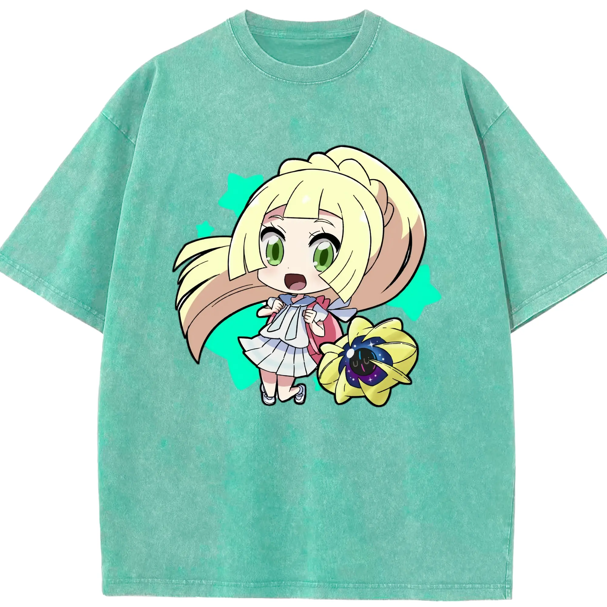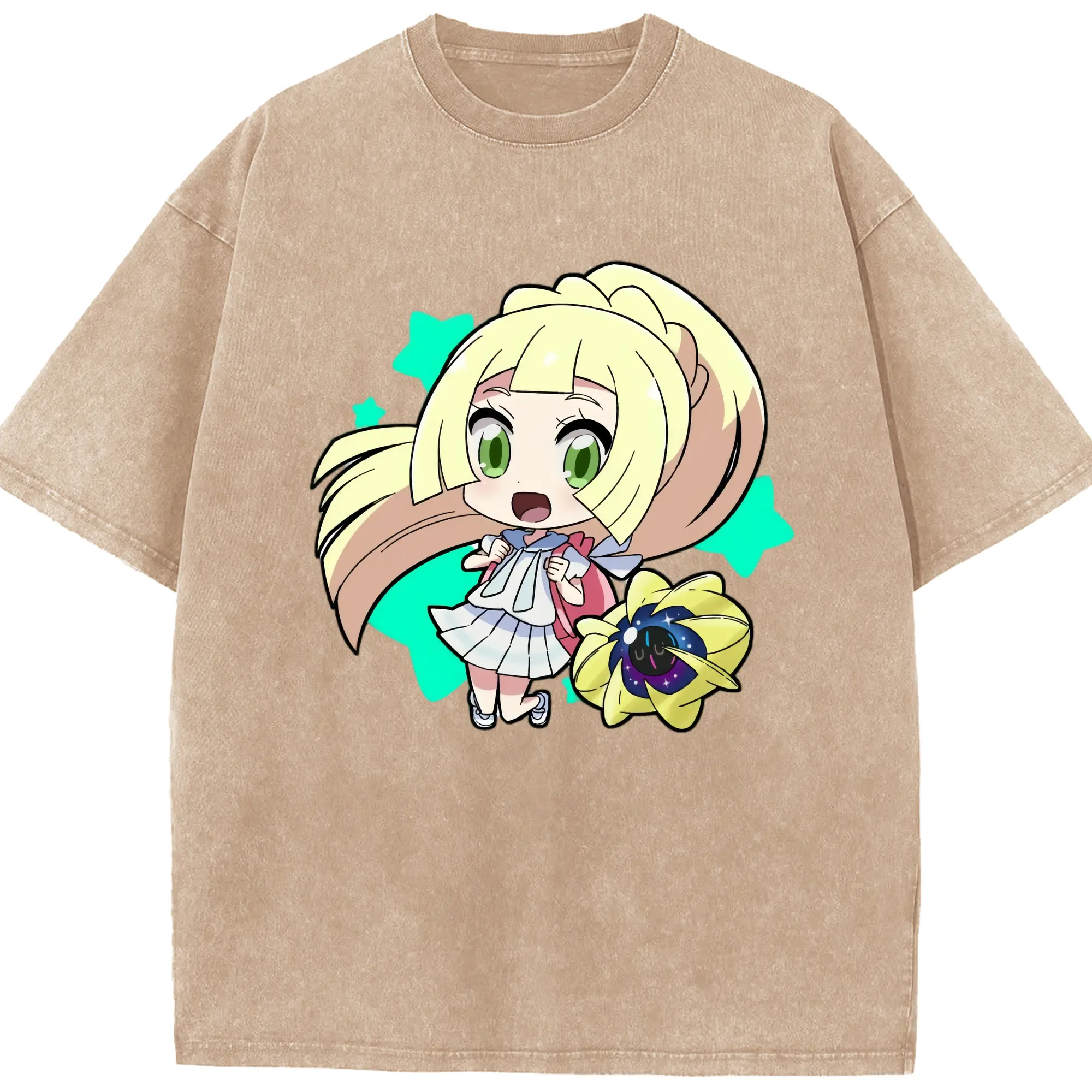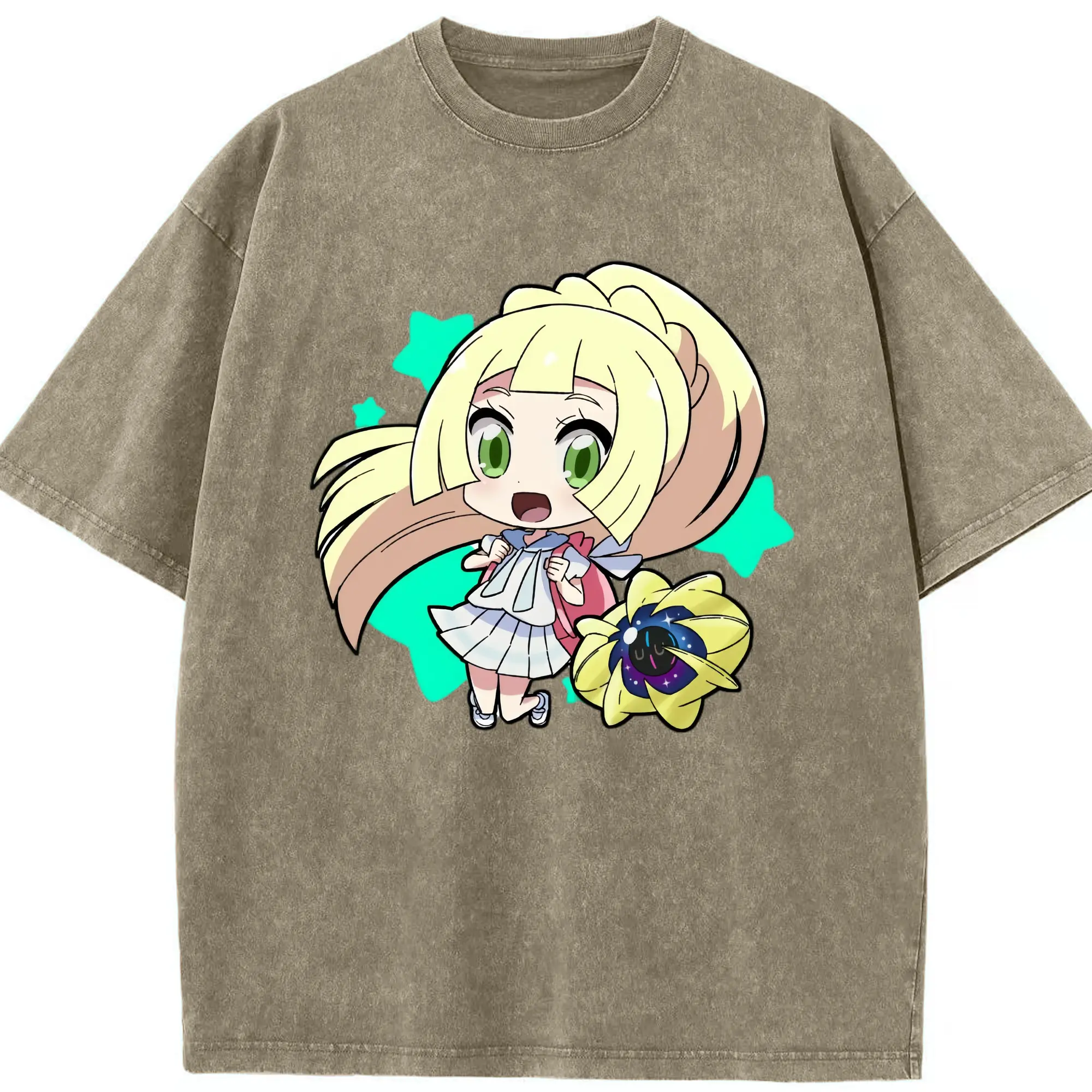 Girl Lillie Pokemon T-Shirts - Washed Vintage Look 230g Cotton Oversized T-Shirt With Front Heat Transfer Print – Soft, Lightweight, Stylish Fit – Comfortable Casual Wear For Sports & Everyday Use