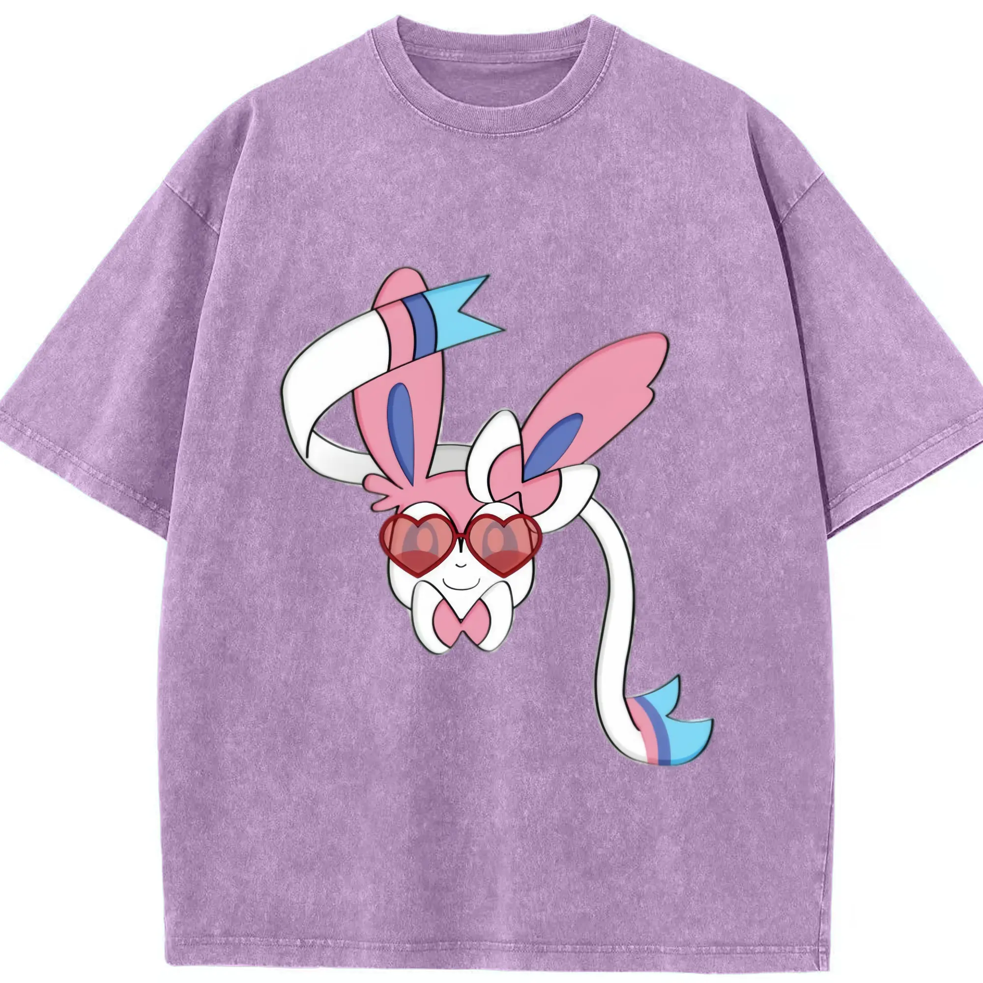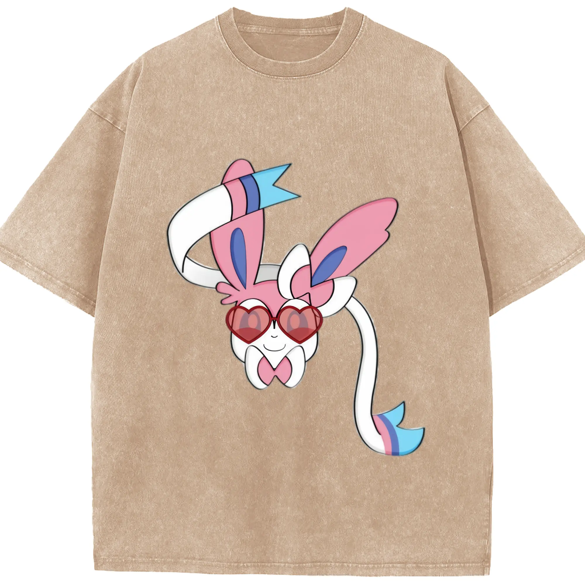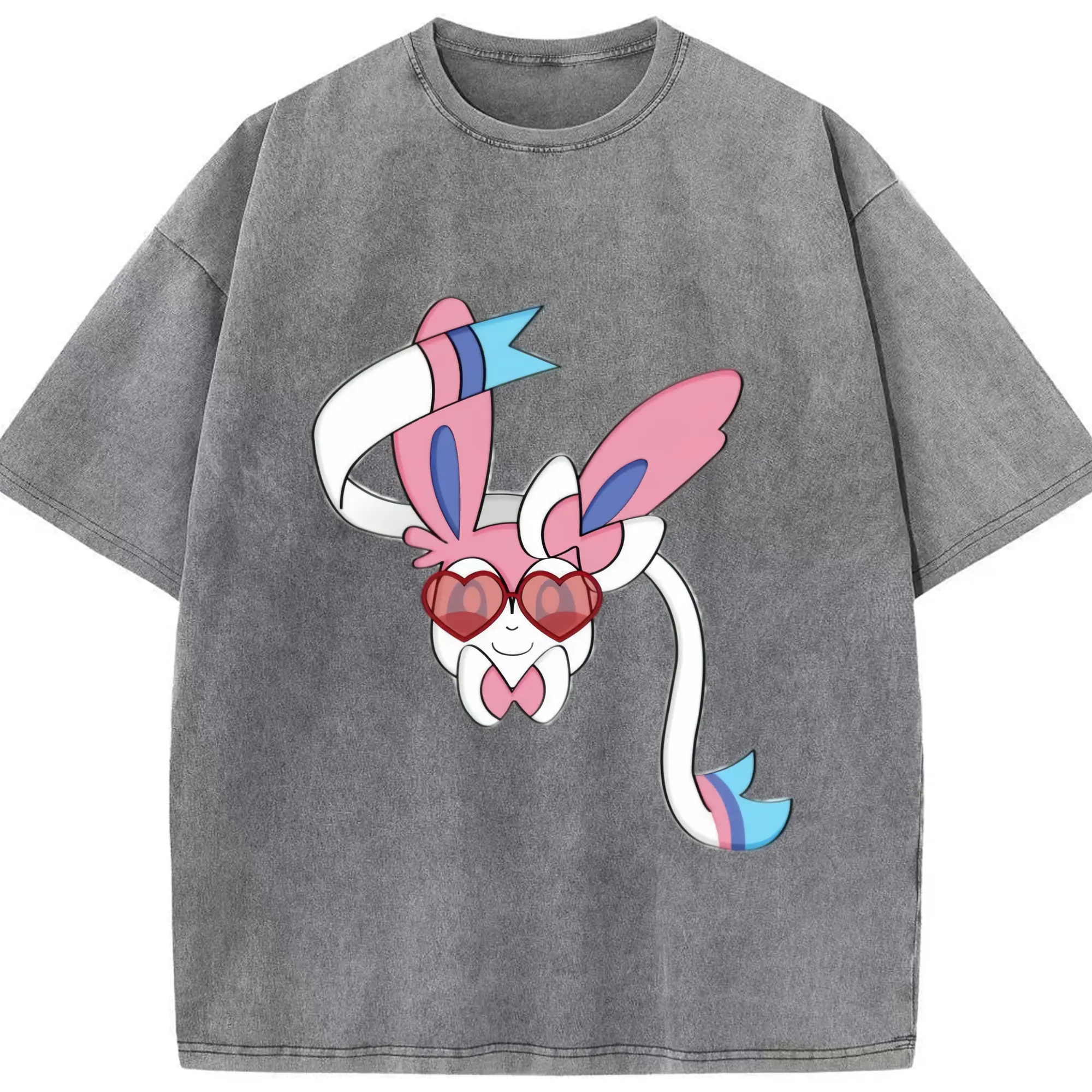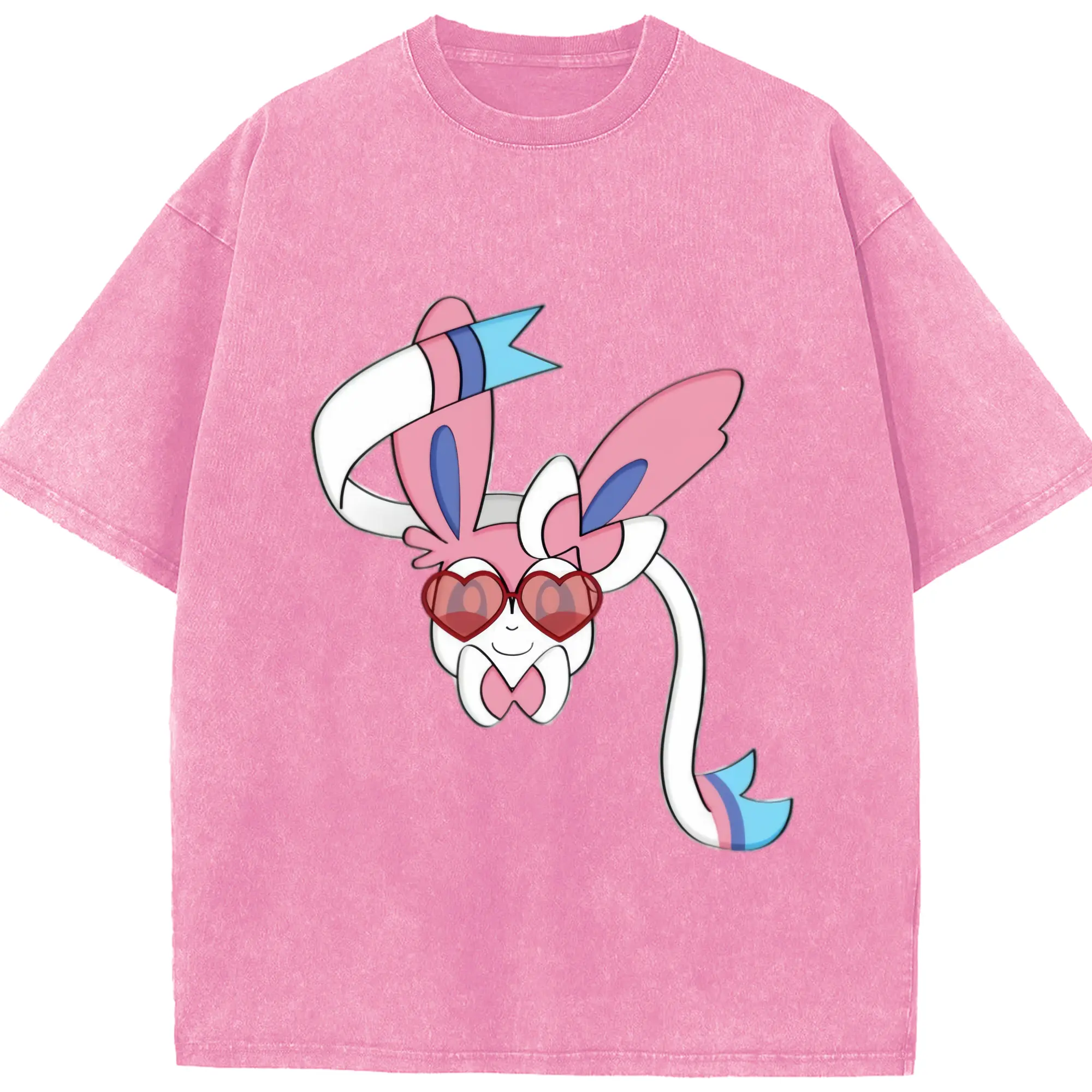 Girls sylveon face shirt​ - Washed Vintage Look 230g Cotton Oversized T-Shirt With Front Heat Transfer Print – Soft, Lightweight, Stylish Fit – Comfortable Casual Wear For Sports & Everyday Use