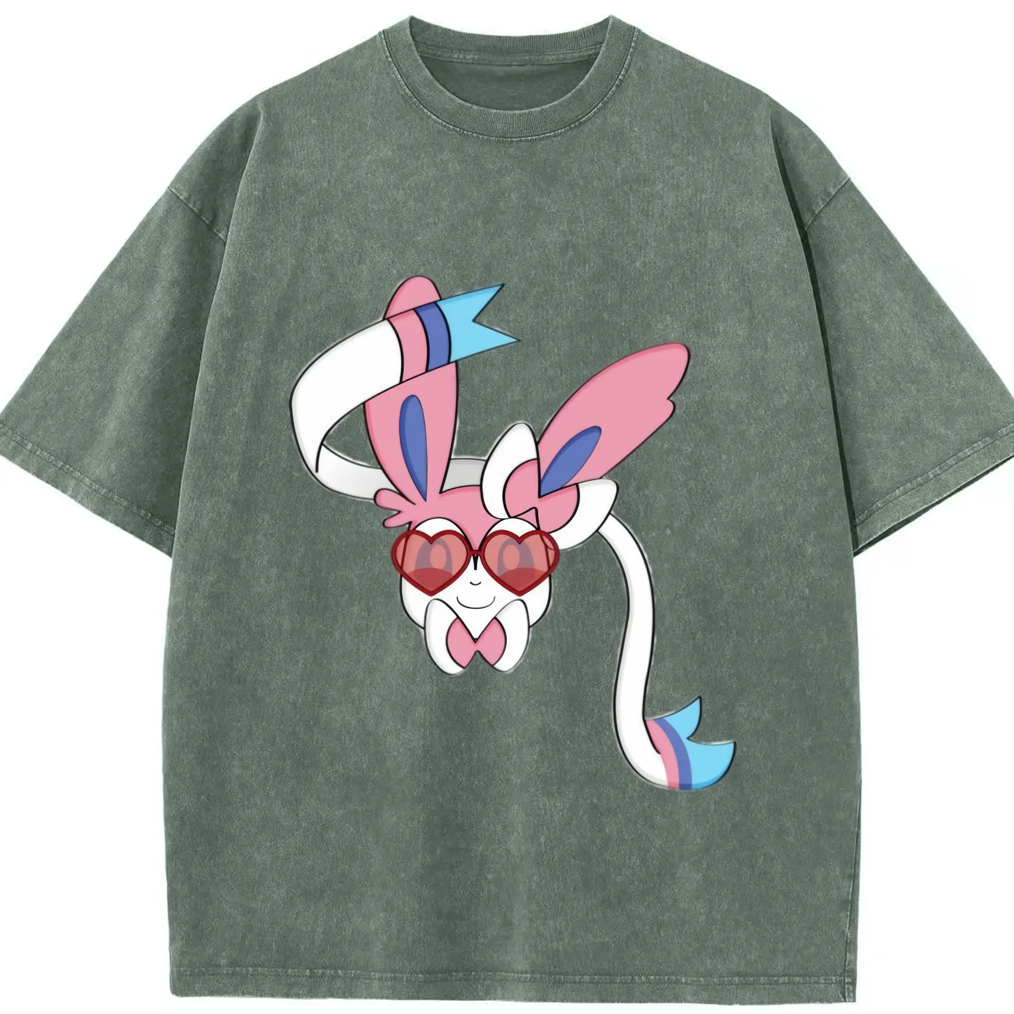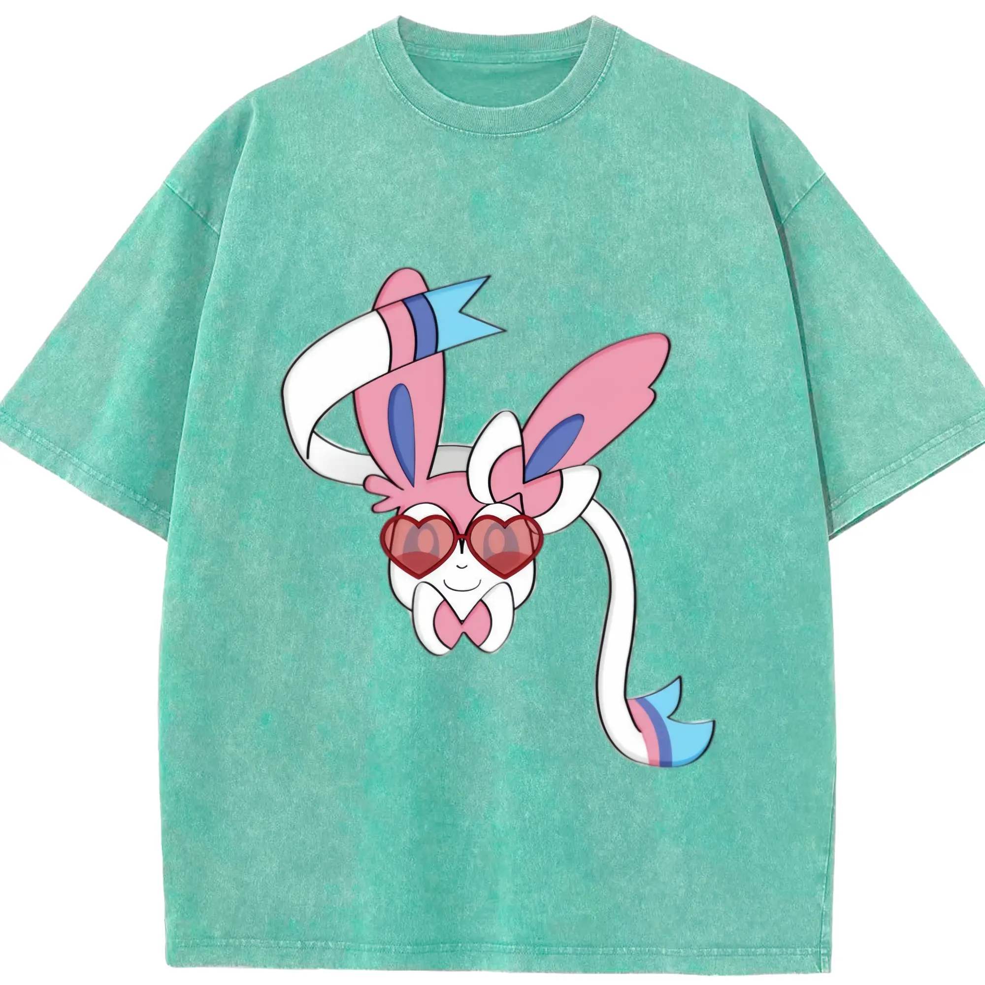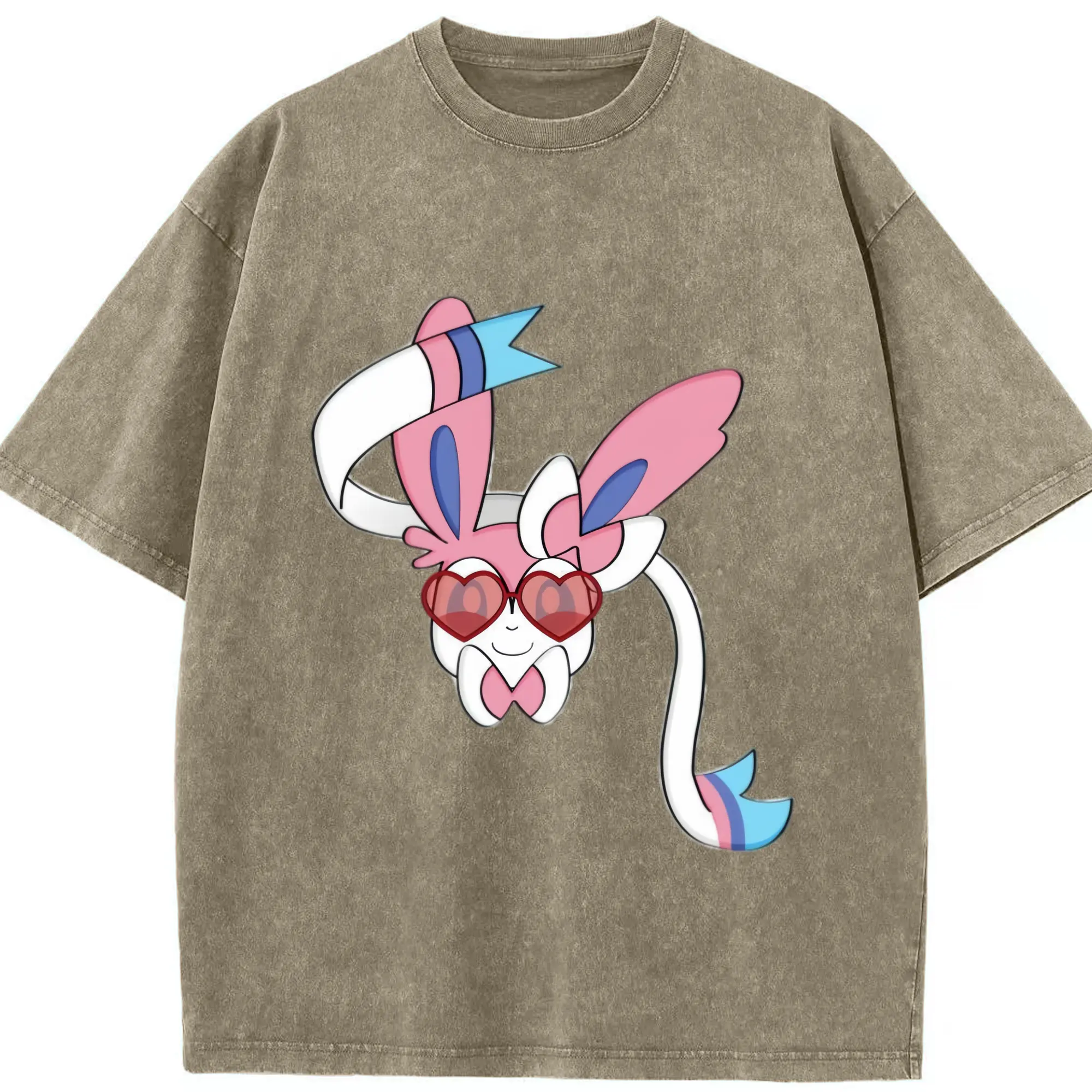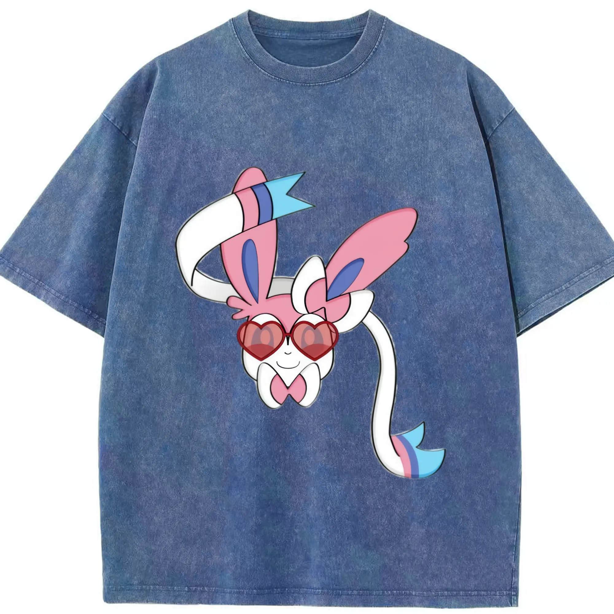 Girls sylveon face shirt​ - Washed Vintage Look 230g Cotton Oversized T-Shirt With Front Heat Transfer Print – Soft, Lightweight, Stylish Fit – Comfortable Casual Wear For Sports & Everyday Use