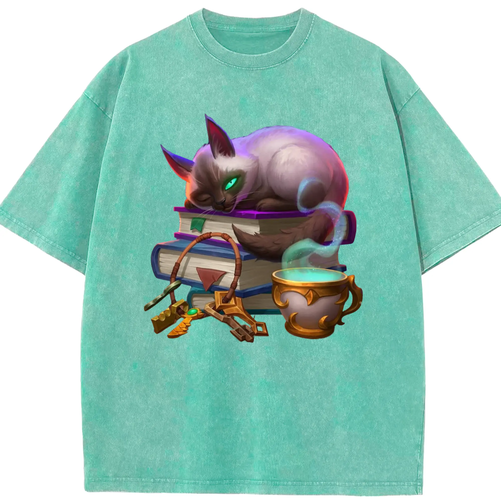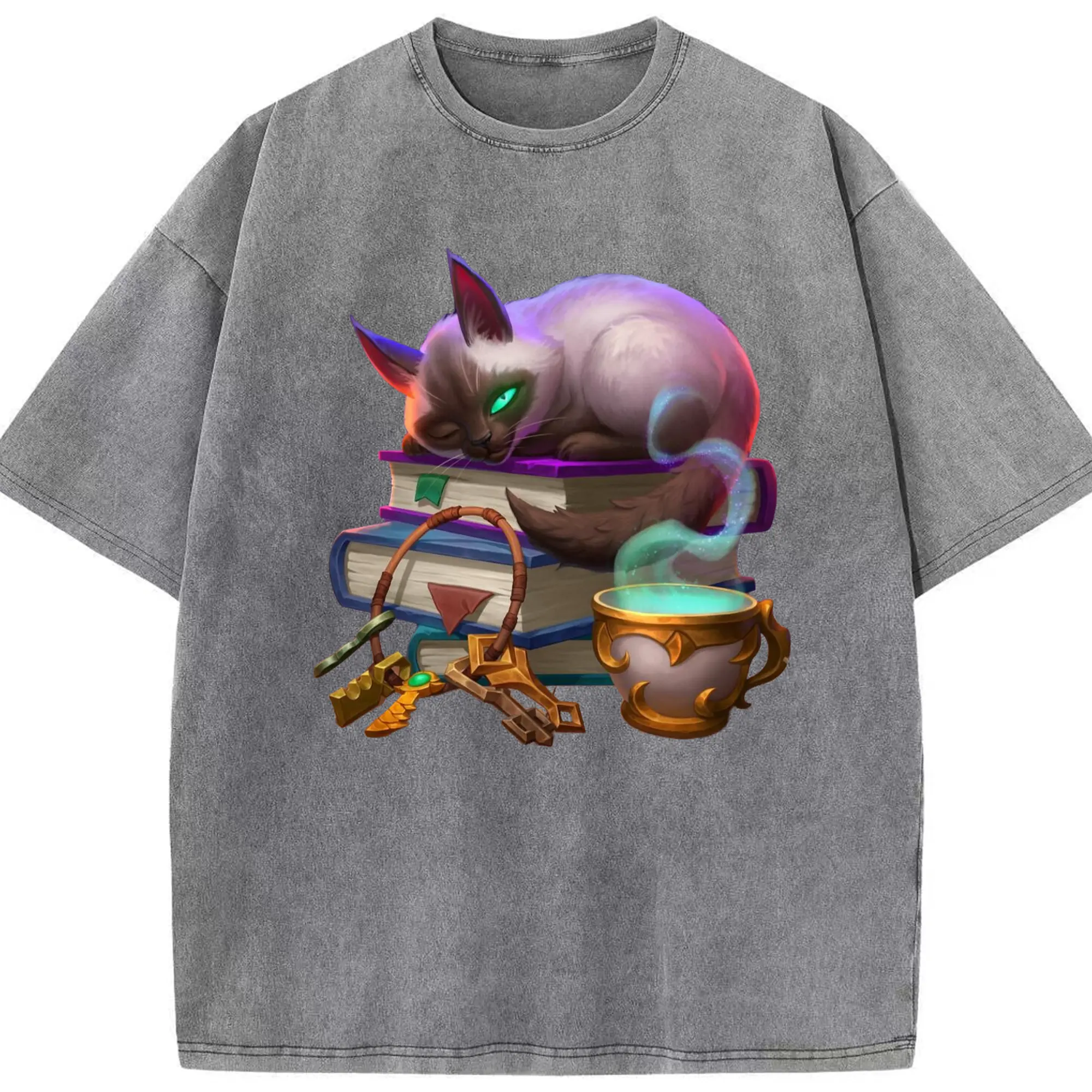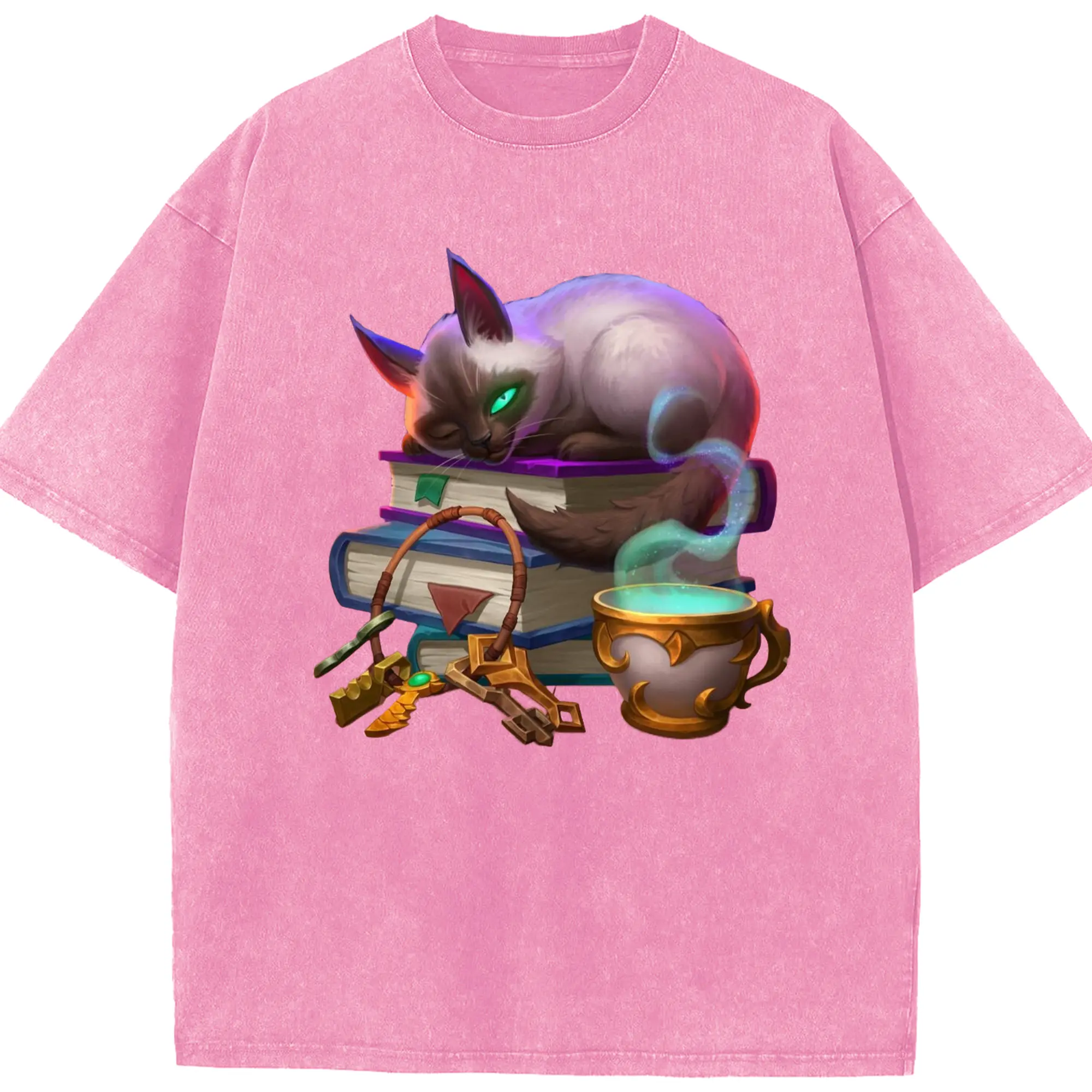 Hearthstone cat tee - Washed Vintage Look 230g Cotton Oversized T-Shirt With Front Heat Transfer Print – Soft, Lightweight, Stylish Fit – Comfortable Casual Wear For Sports & Everyday Use