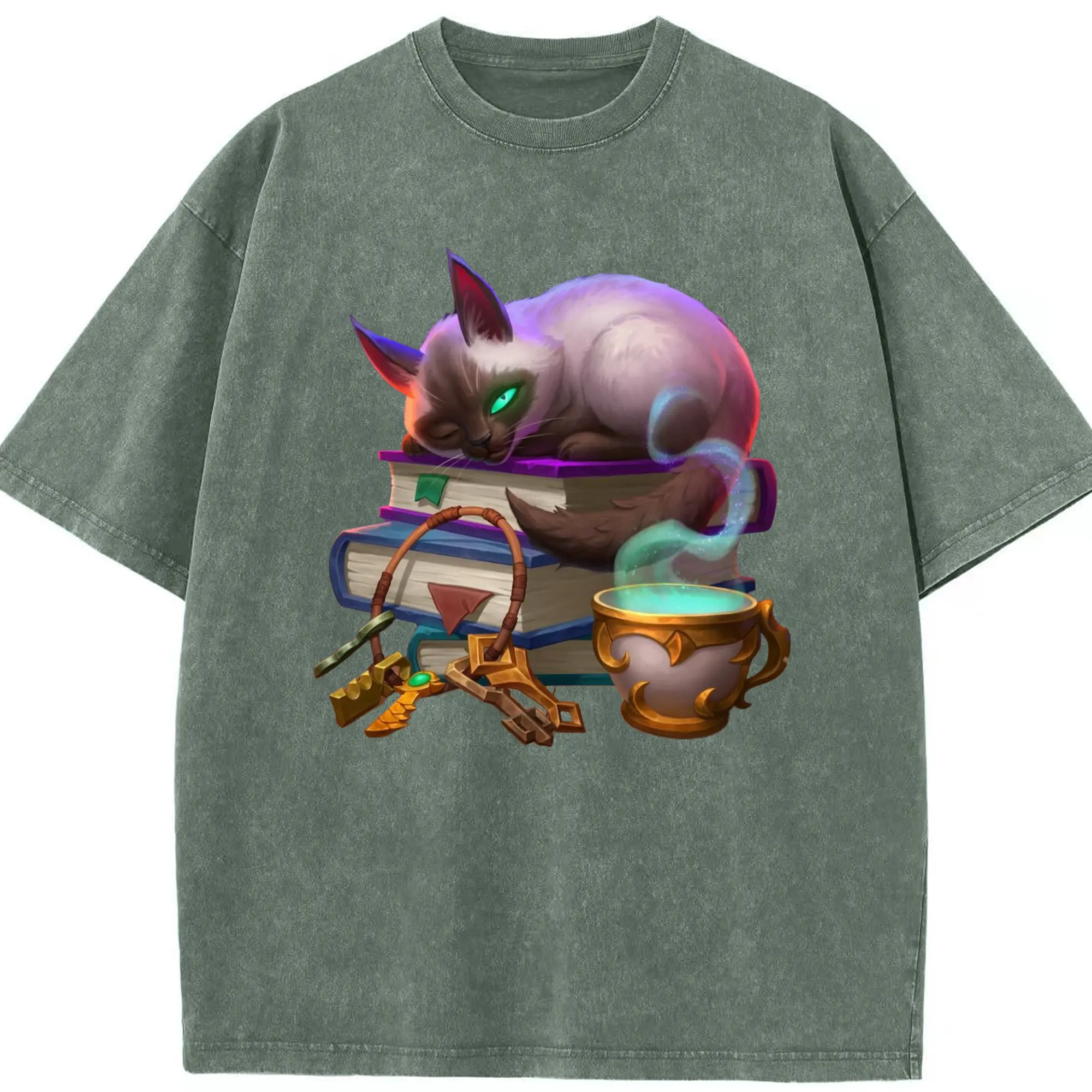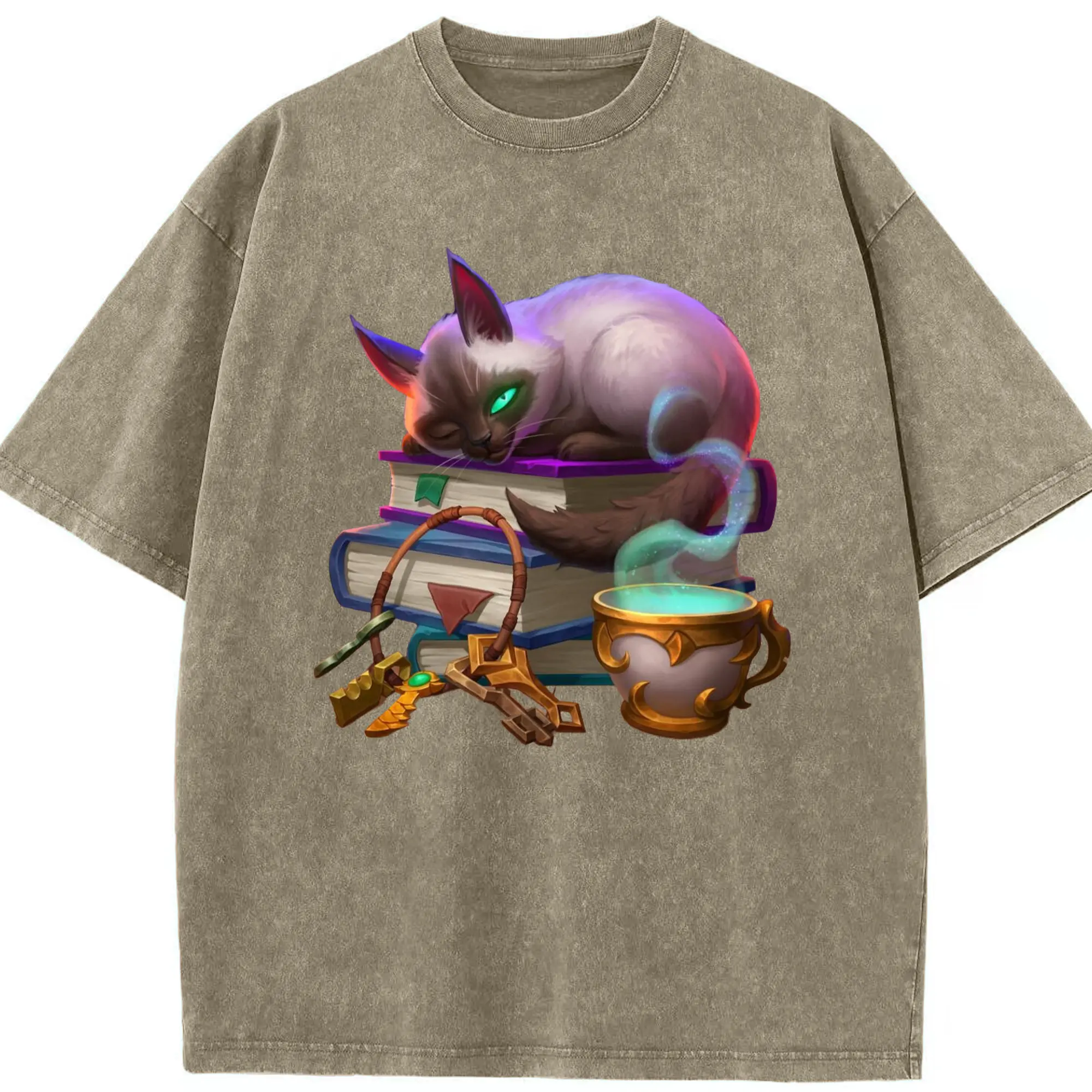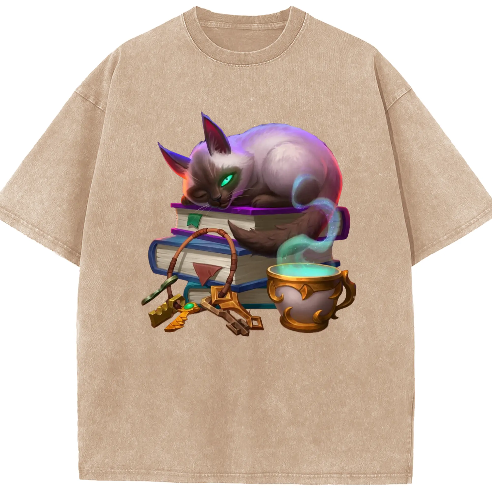 Hearthstone cat tee - Washed Vintage Look 230g Cotton Oversized T-Shirt With Front Heat Transfer Print – Soft, Lightweight, Stylish Fit – Comfortable Casual Wear For Sports & Everyday Use