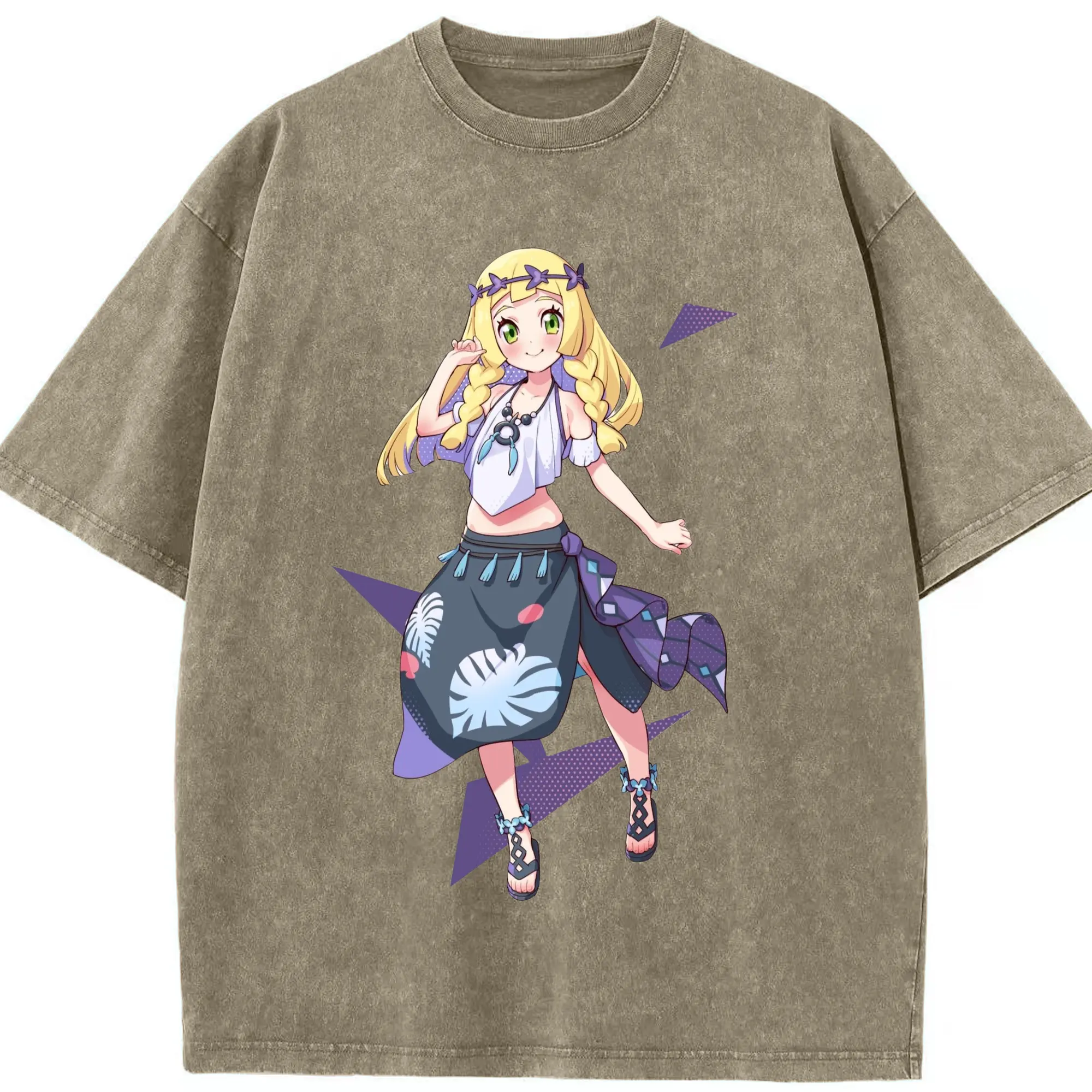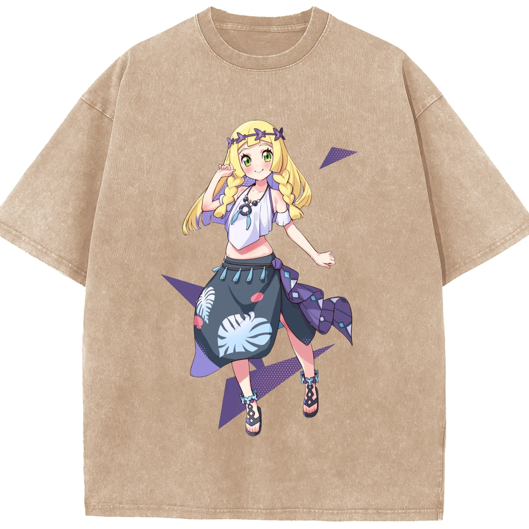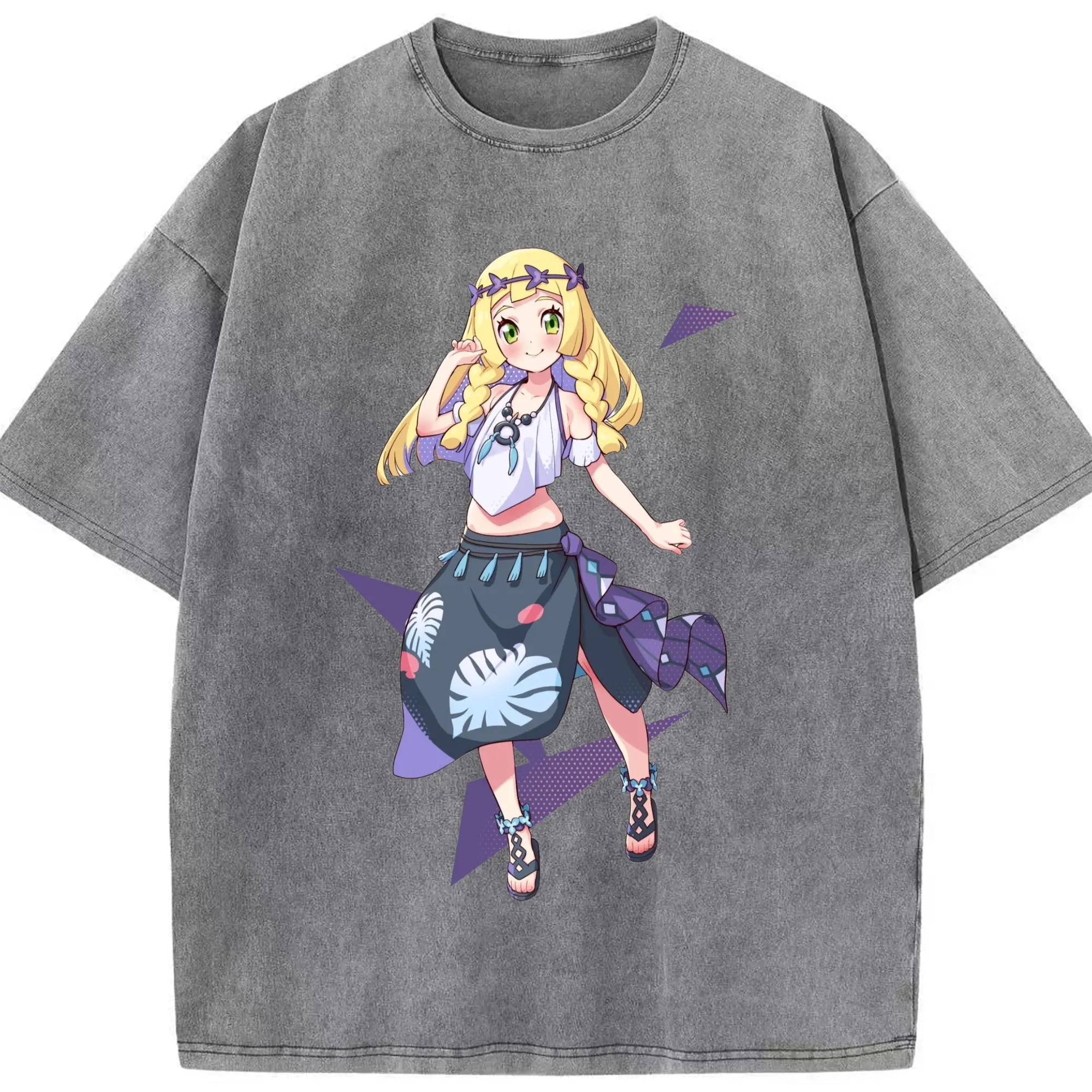 Lillie Pokemon art Tee - Washed Vintage Look 230g Cotton Oversized T-Shirt With Front Heat Transfer Print – Soft, Lightweight, Stylish Fit – Comfortable Casual Wear For Sports & Everyday Use