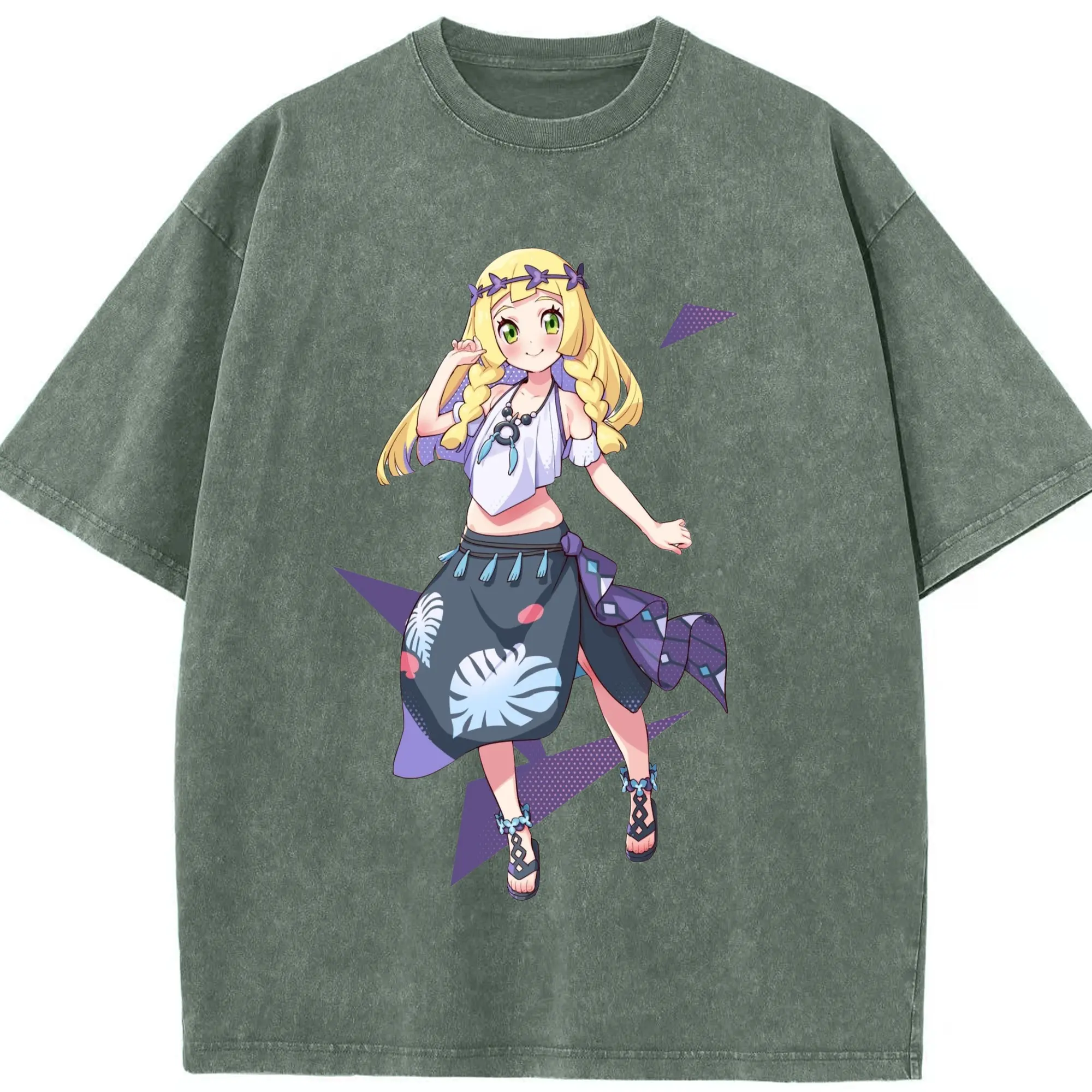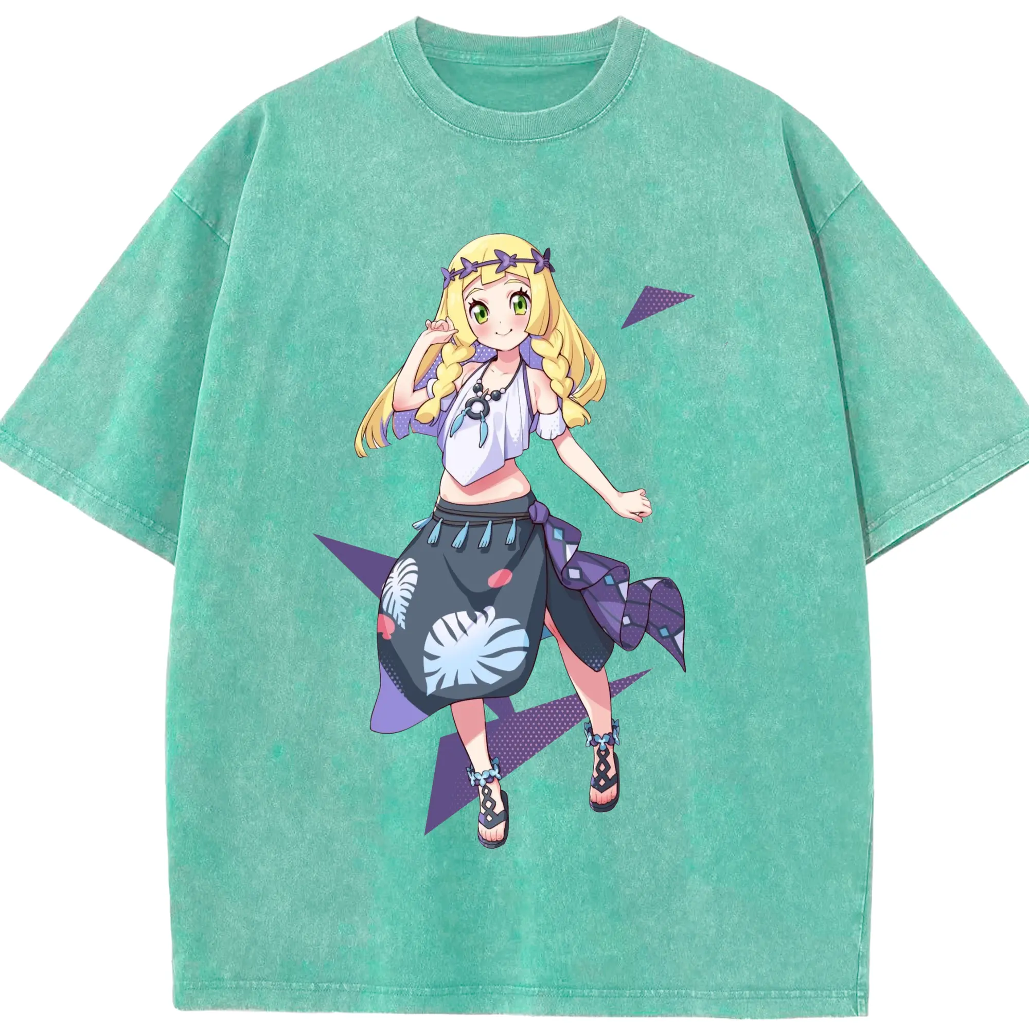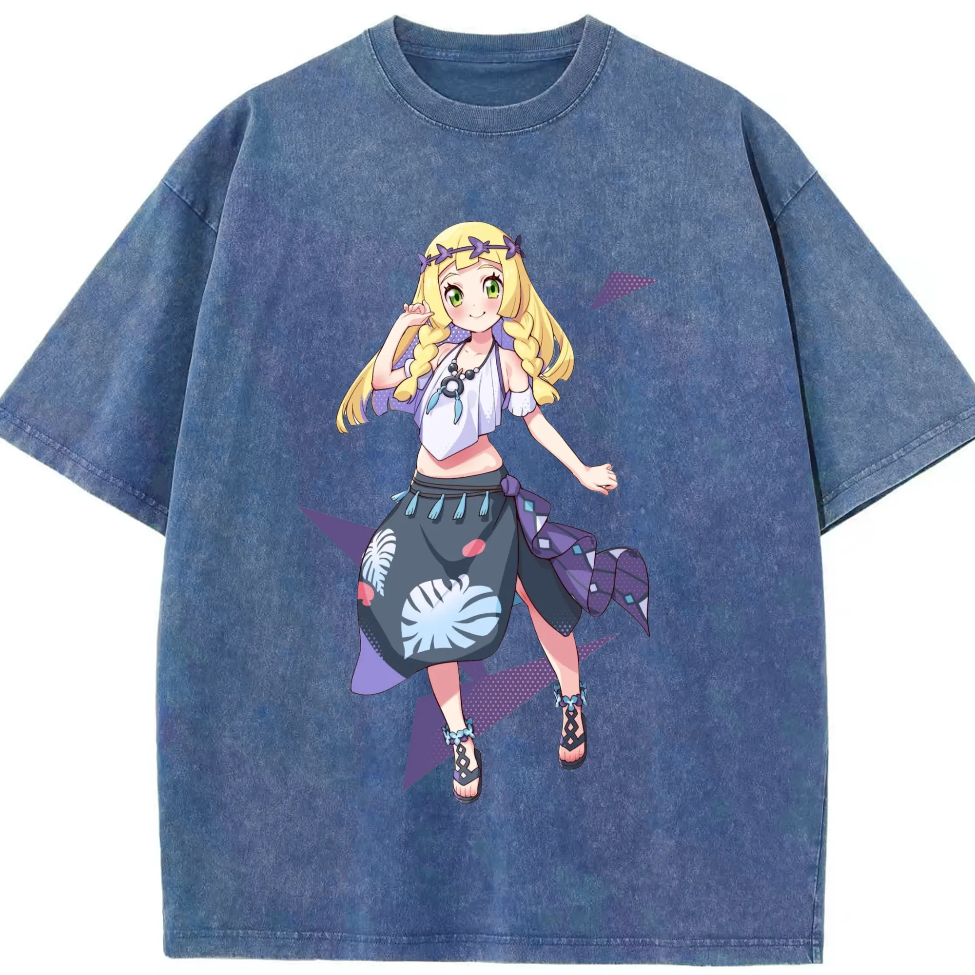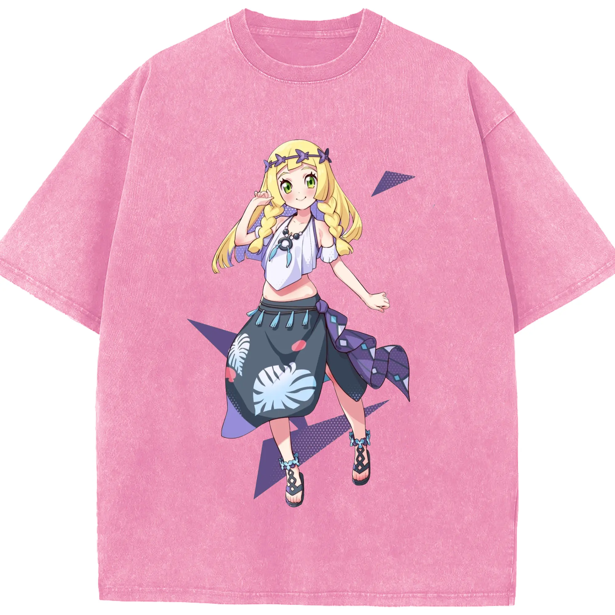 Lillie Pokemon art Tee - Washed Vintage Look 230g Cotton Oversized T-Shirt With Front Heat Transfer Print – Soft, Lightweight, Stylish Fit – Comfortable Casual Wear For Sports & Everyday Use