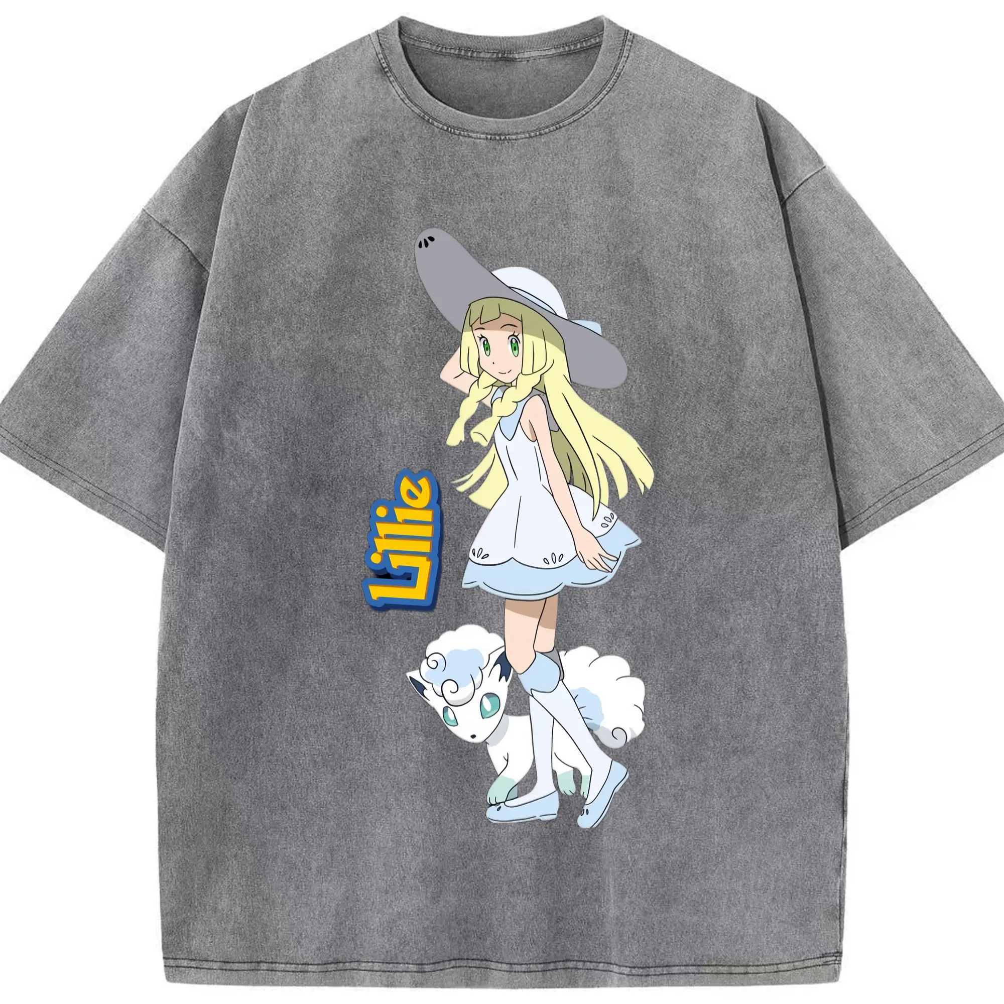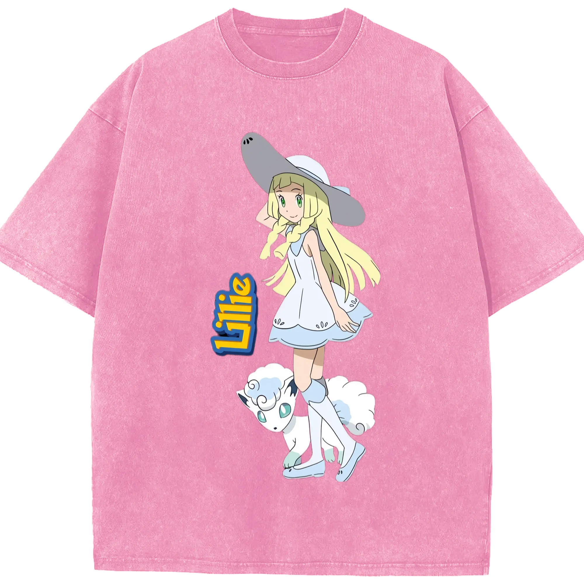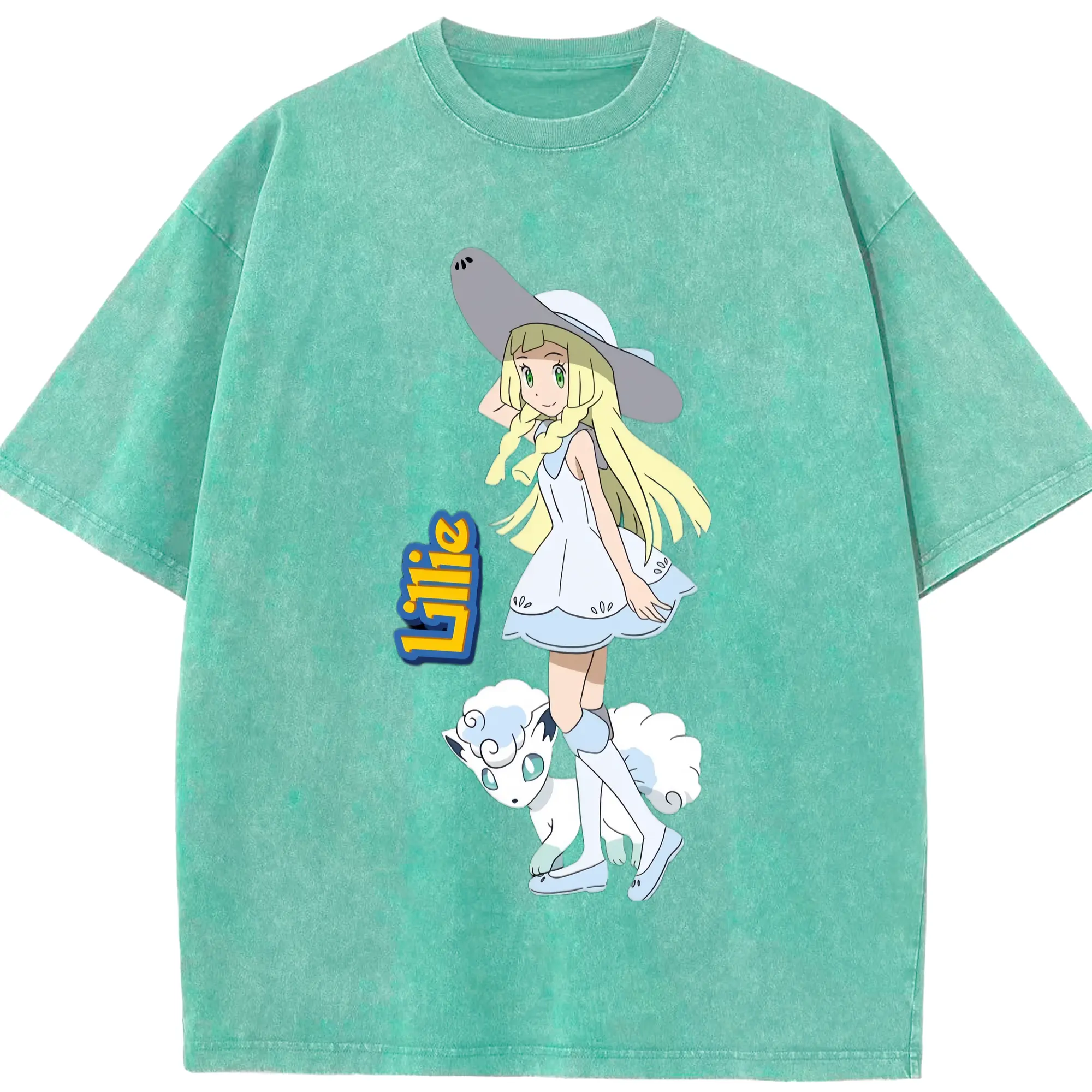 Lillie Pokemon graphic t-shirt - Washed Vintage Look 230g Cotton Oversized T-Shirt With Front Heat Transfer Print – Soft, Lightweight, Stylish Fit – Comfortable Casual Wear For Sports & Everyday Use