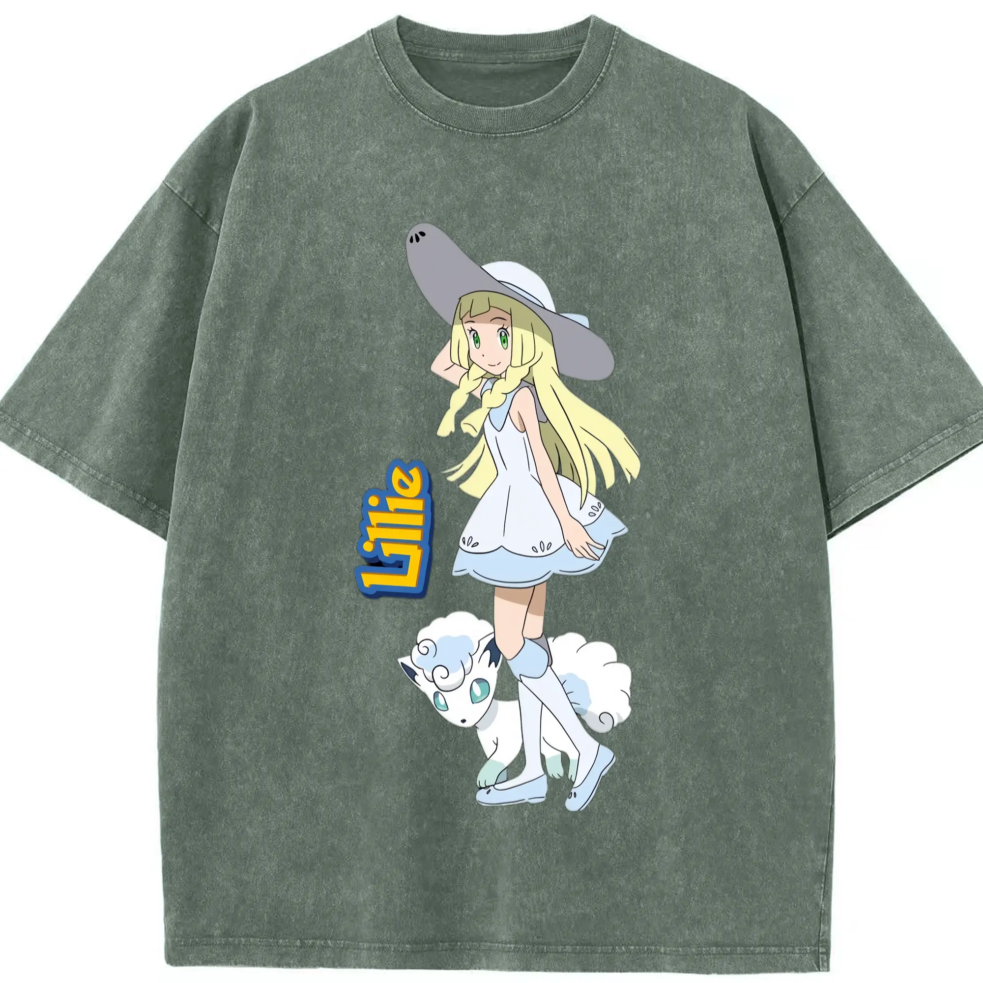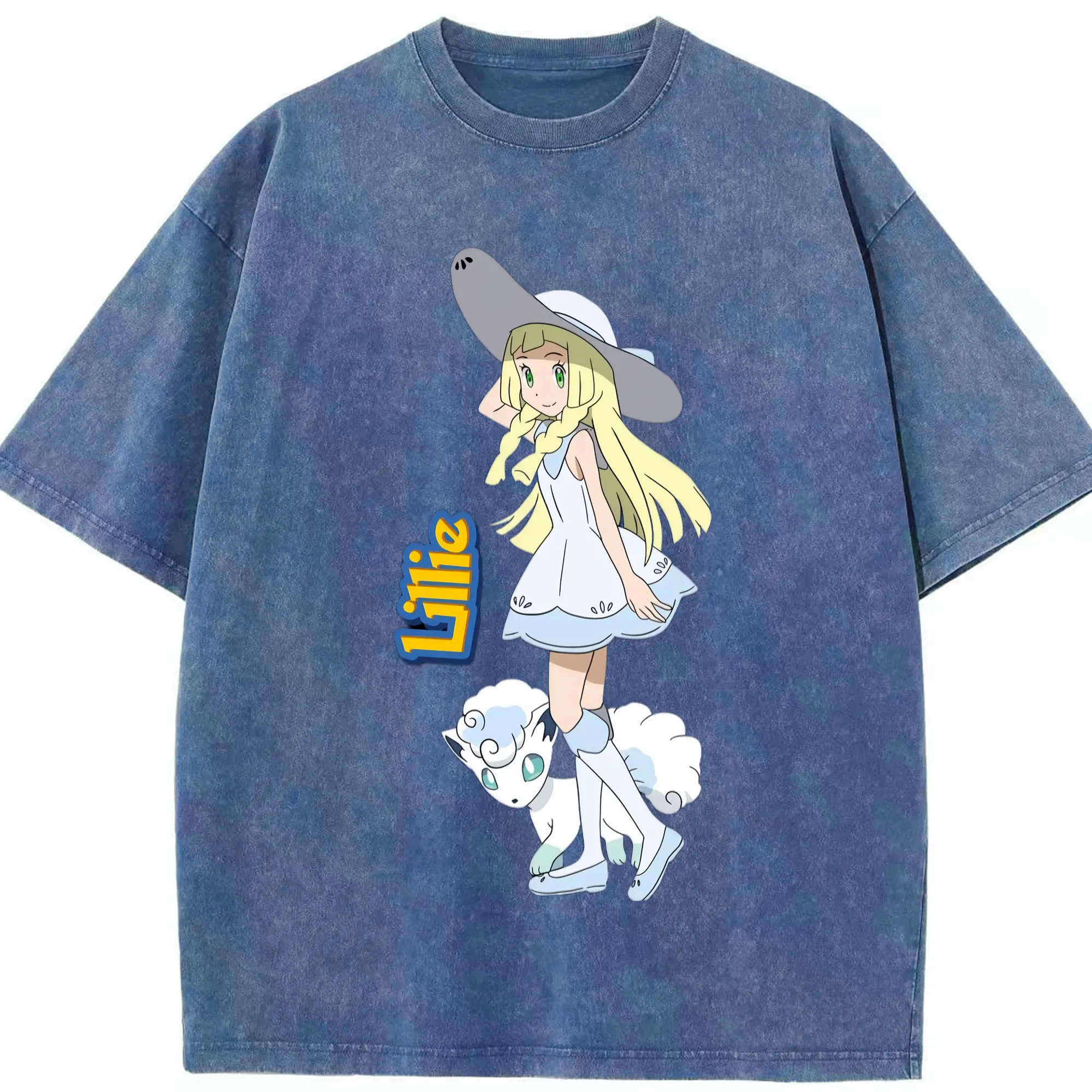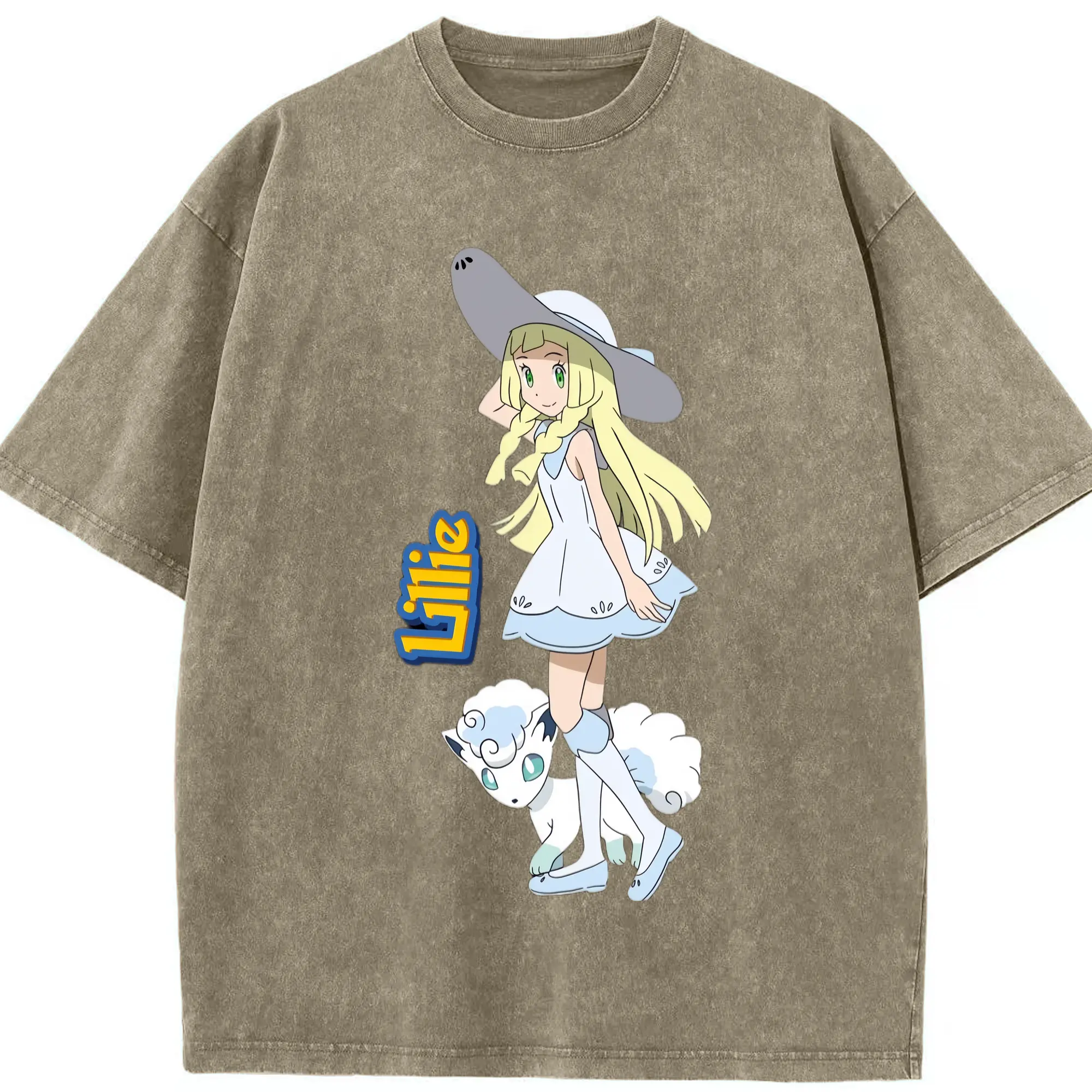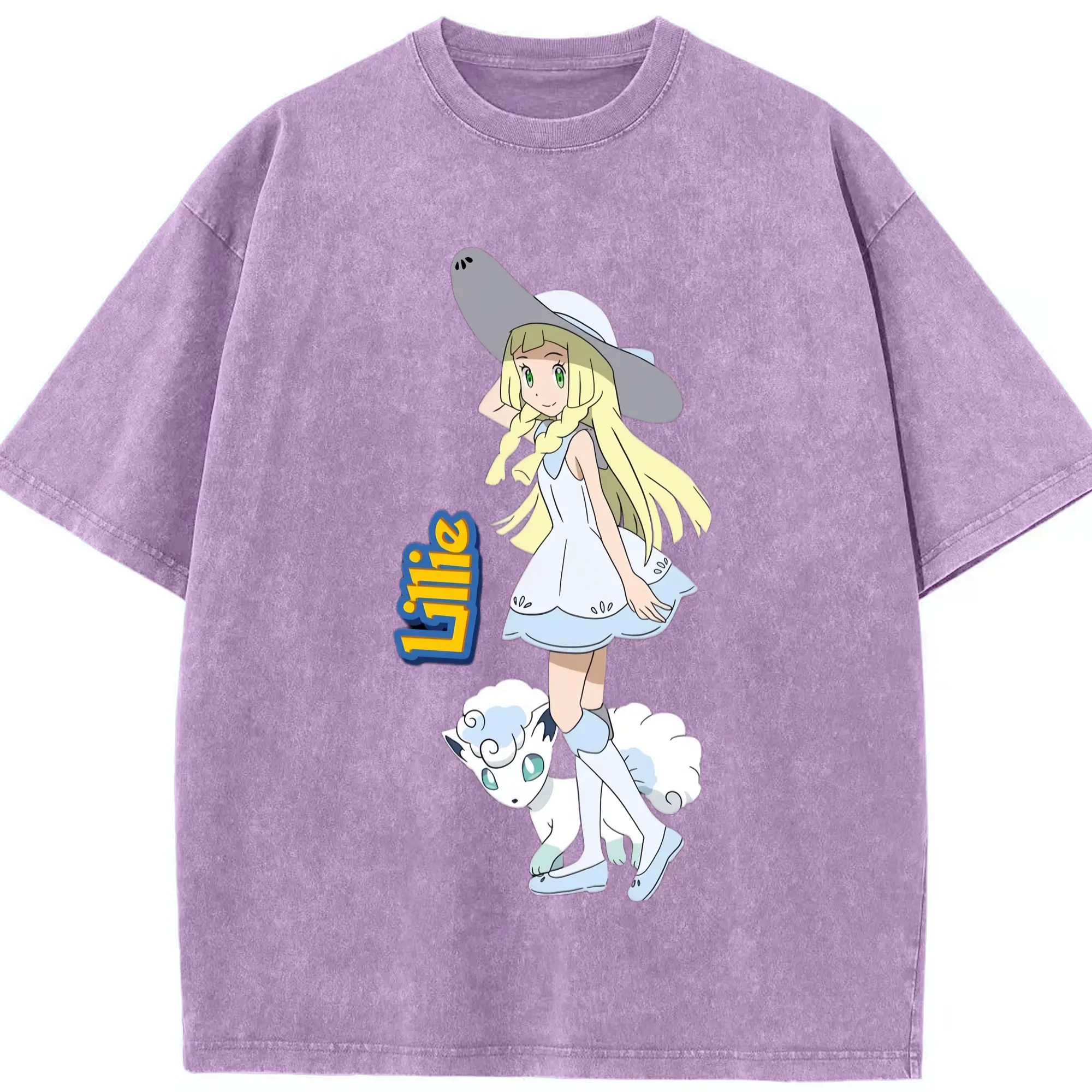 Lillie Pokemon graphic t-shirt - Washed Vintage Look 230g Cotton Oversized T-Shirt With Front Heat Transfer Print – Soft, Lightweight, Stylish Fit – Comfortable Casual Wear For Sports & Everyday Use