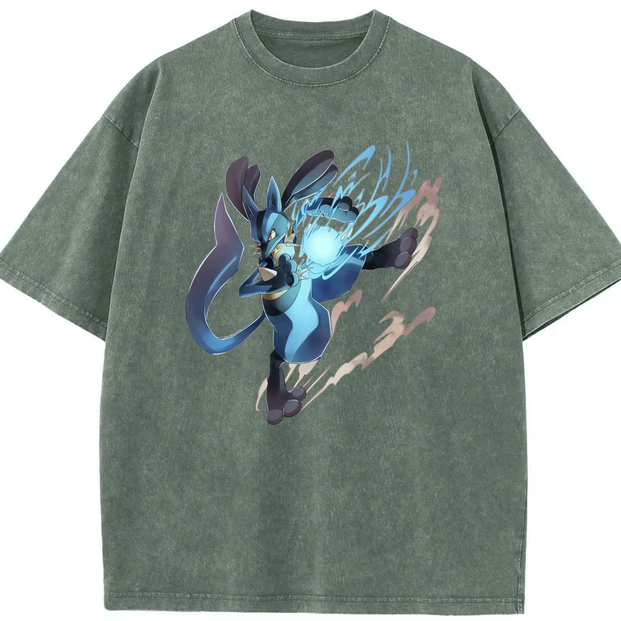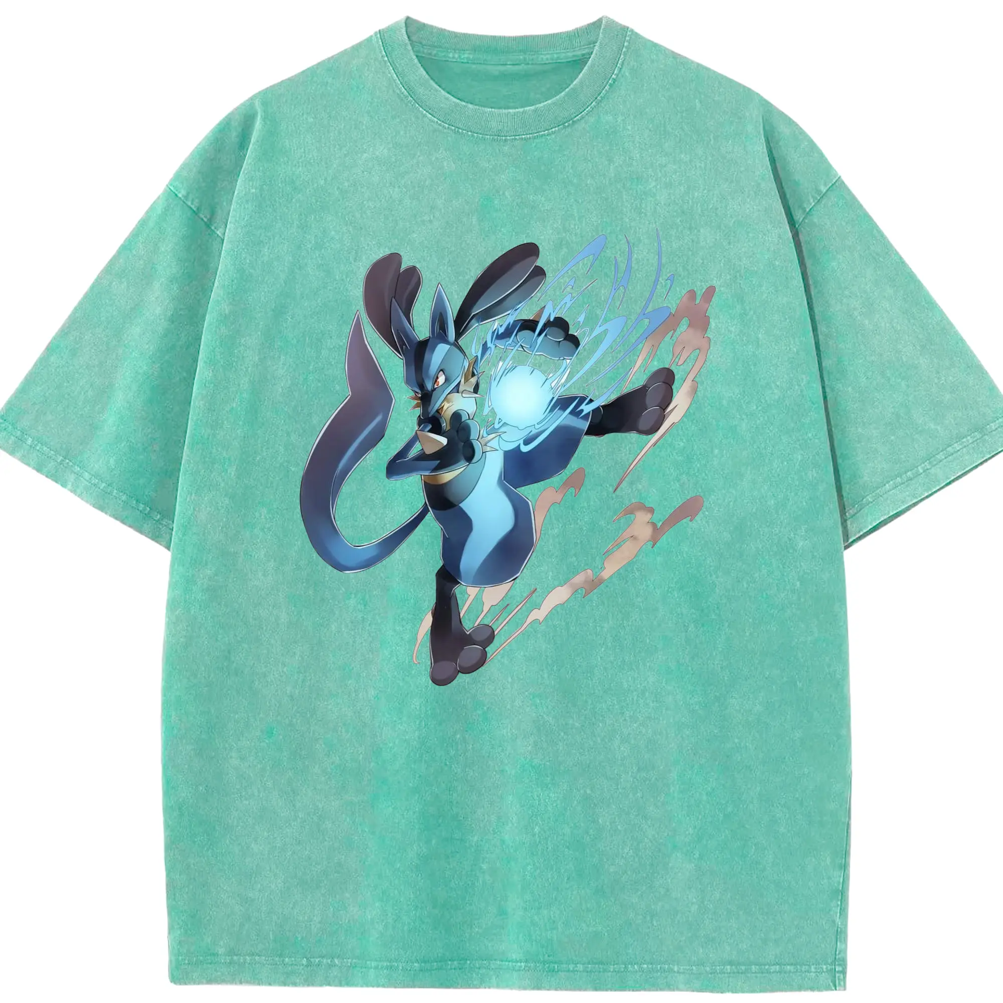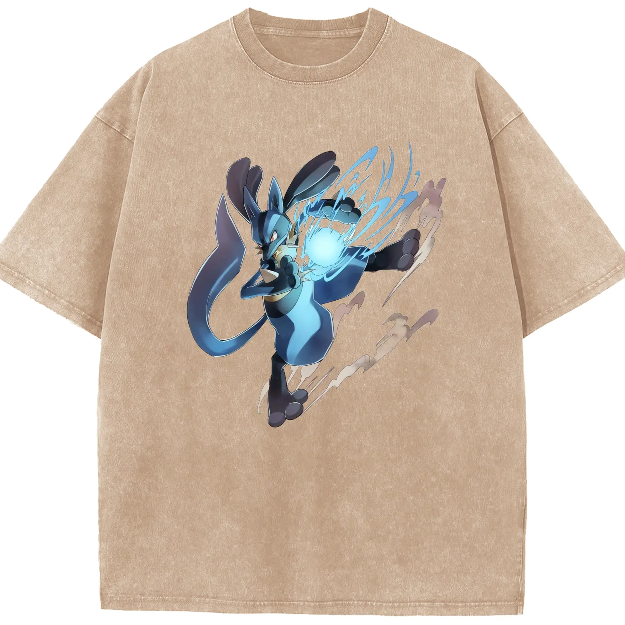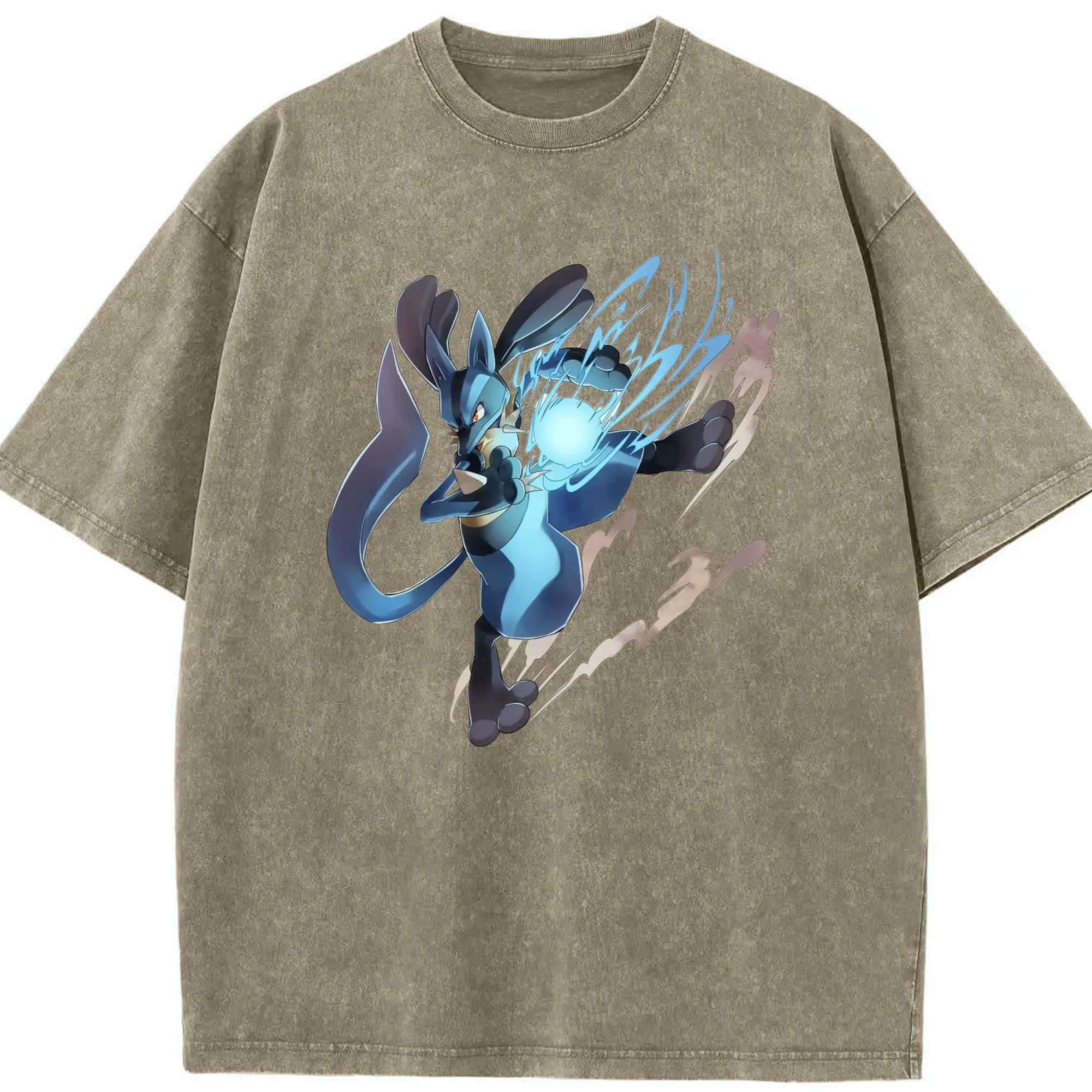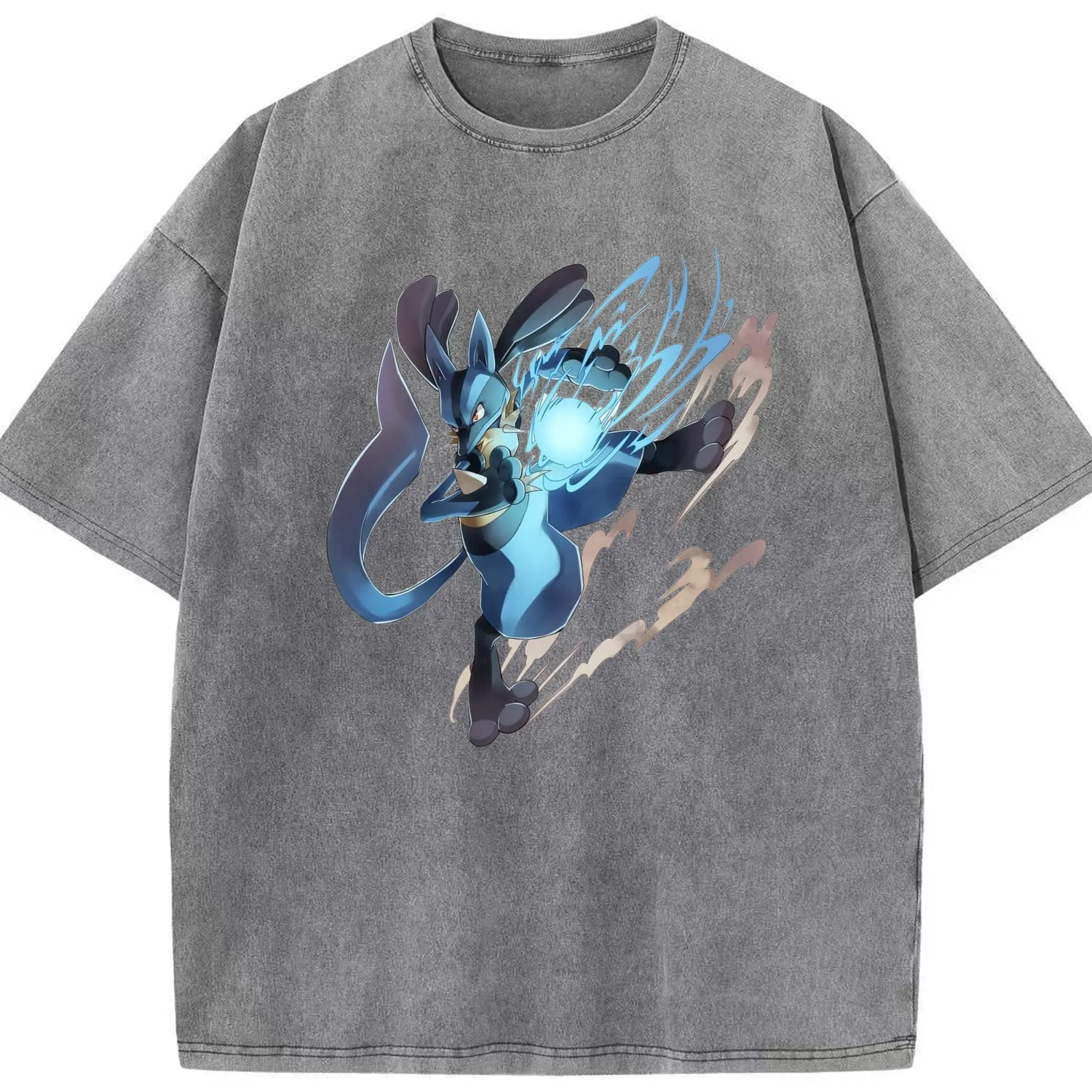 Lucario collage graphic t shirt - Washed Vintage Look 230g Cotton Oversized T-Shirt With Front Heat Transfer Print – Soft, Lightweight, Stylish Fit – Comfortable Casual Wear For Sports & Everyday Use
