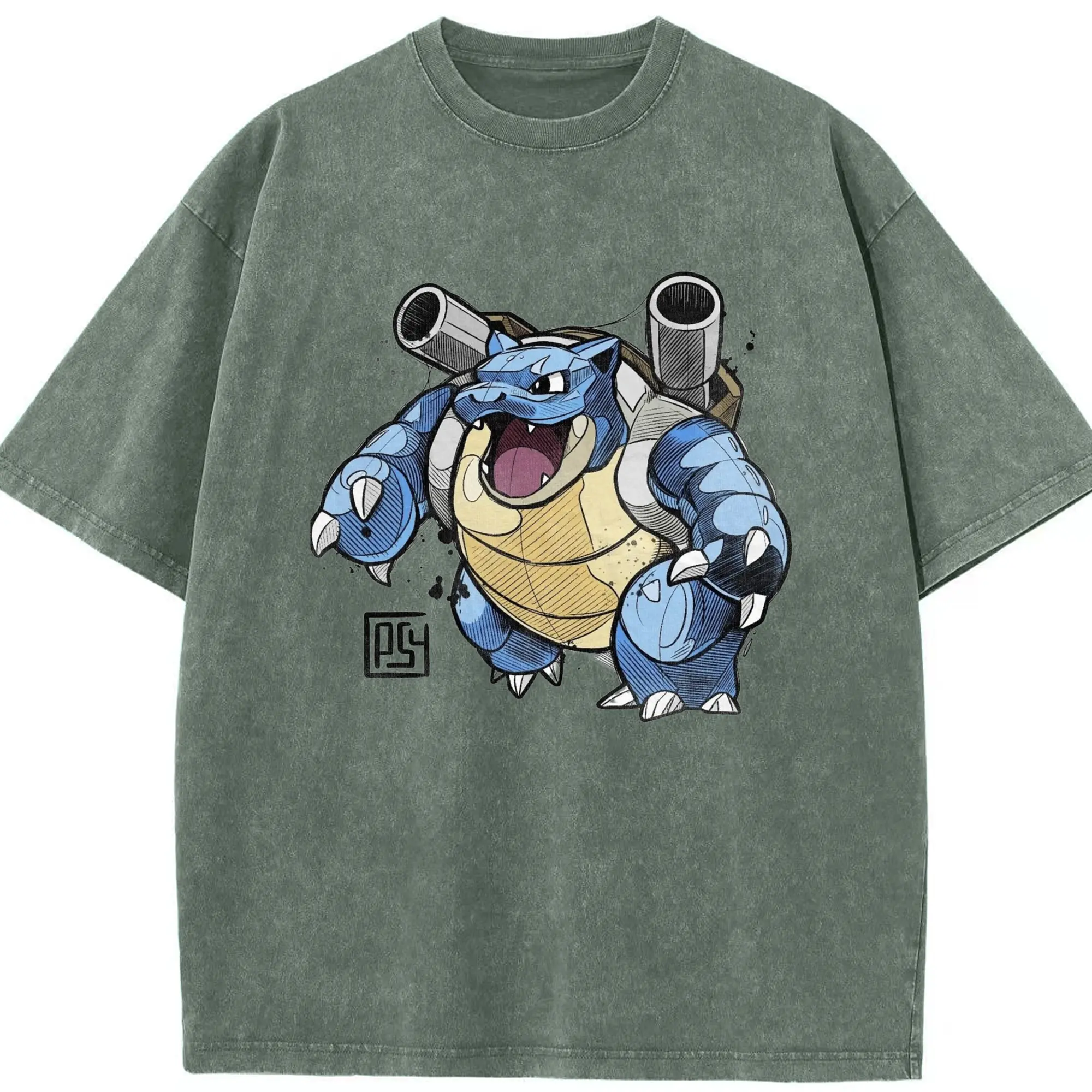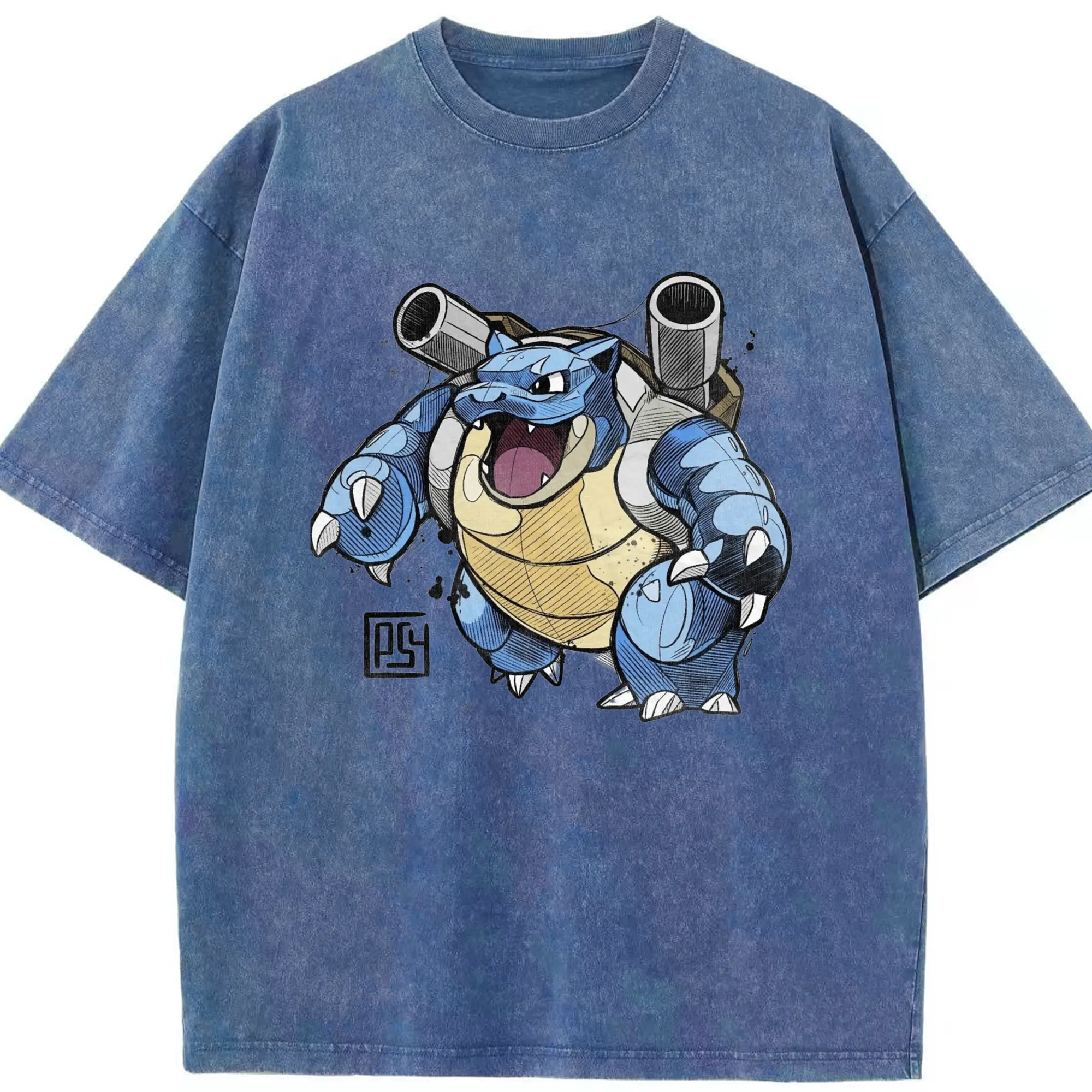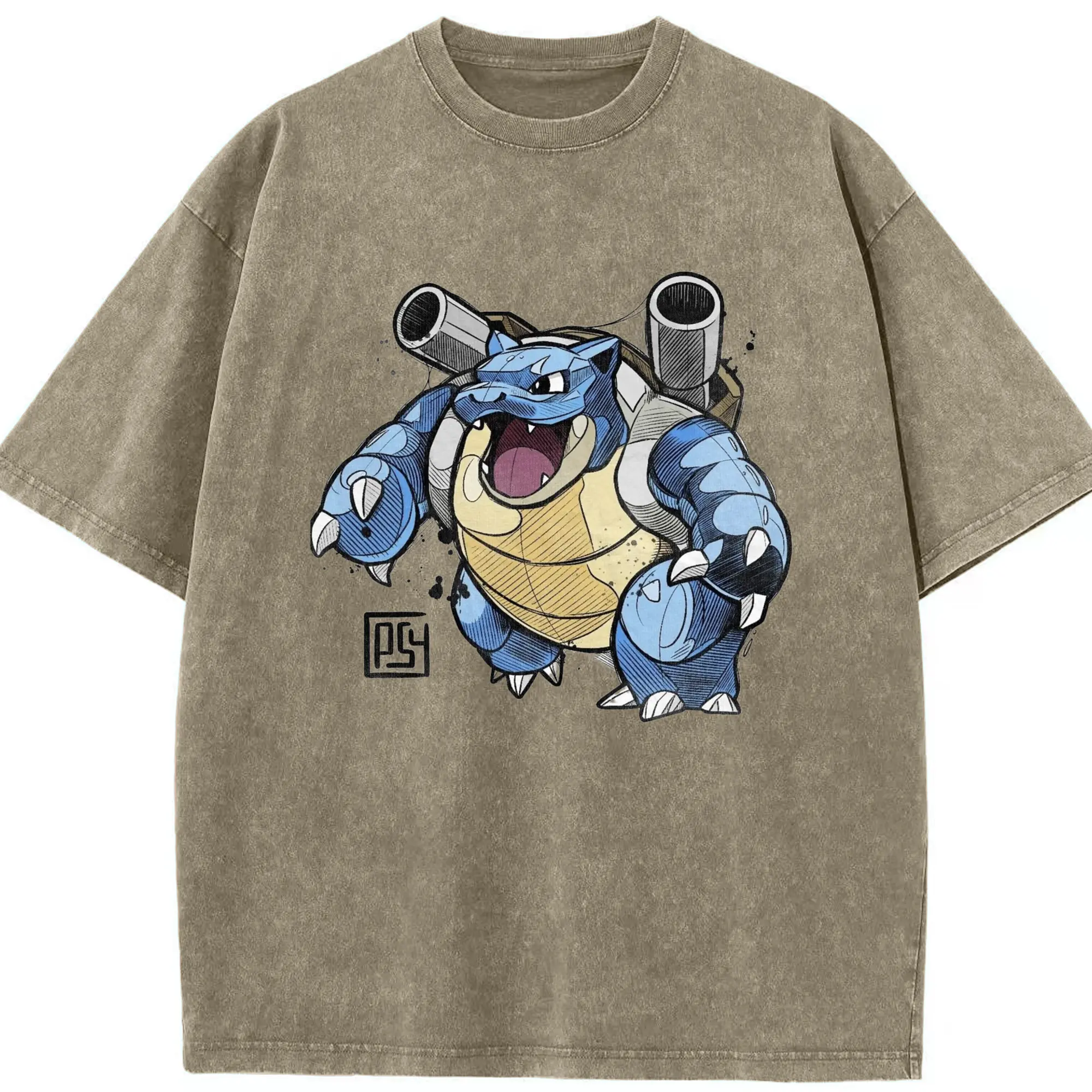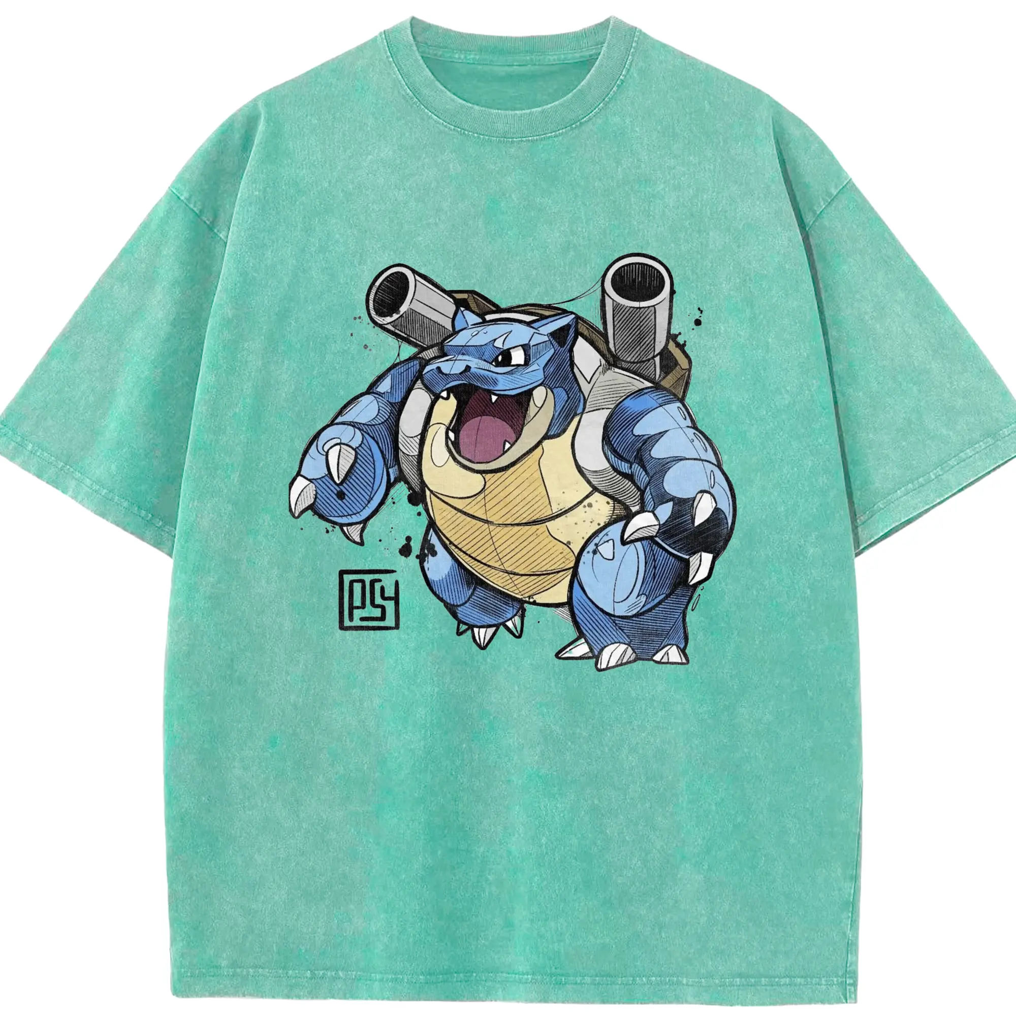 Man pokemon Blastoise T-Shirt - Washed Vintage Look 230g Cotton Oversized T-Shirt With Front Heat Transfer Print – Soft, Lightweight, Stylish Fit – Comfortable Casual Wear For Sports & Everyday Use