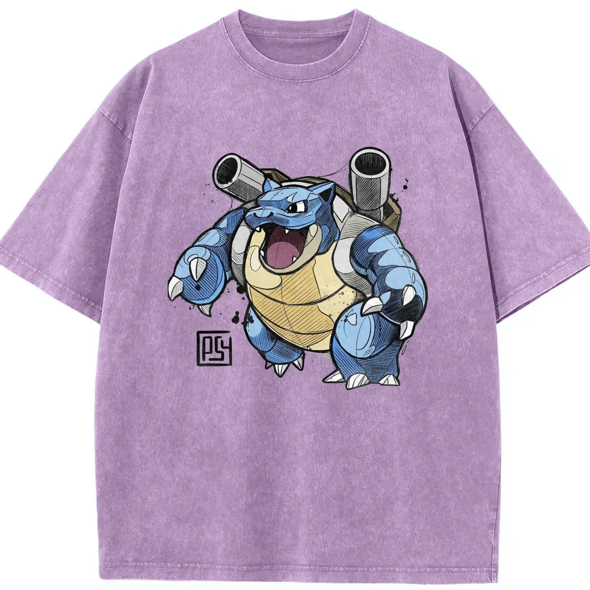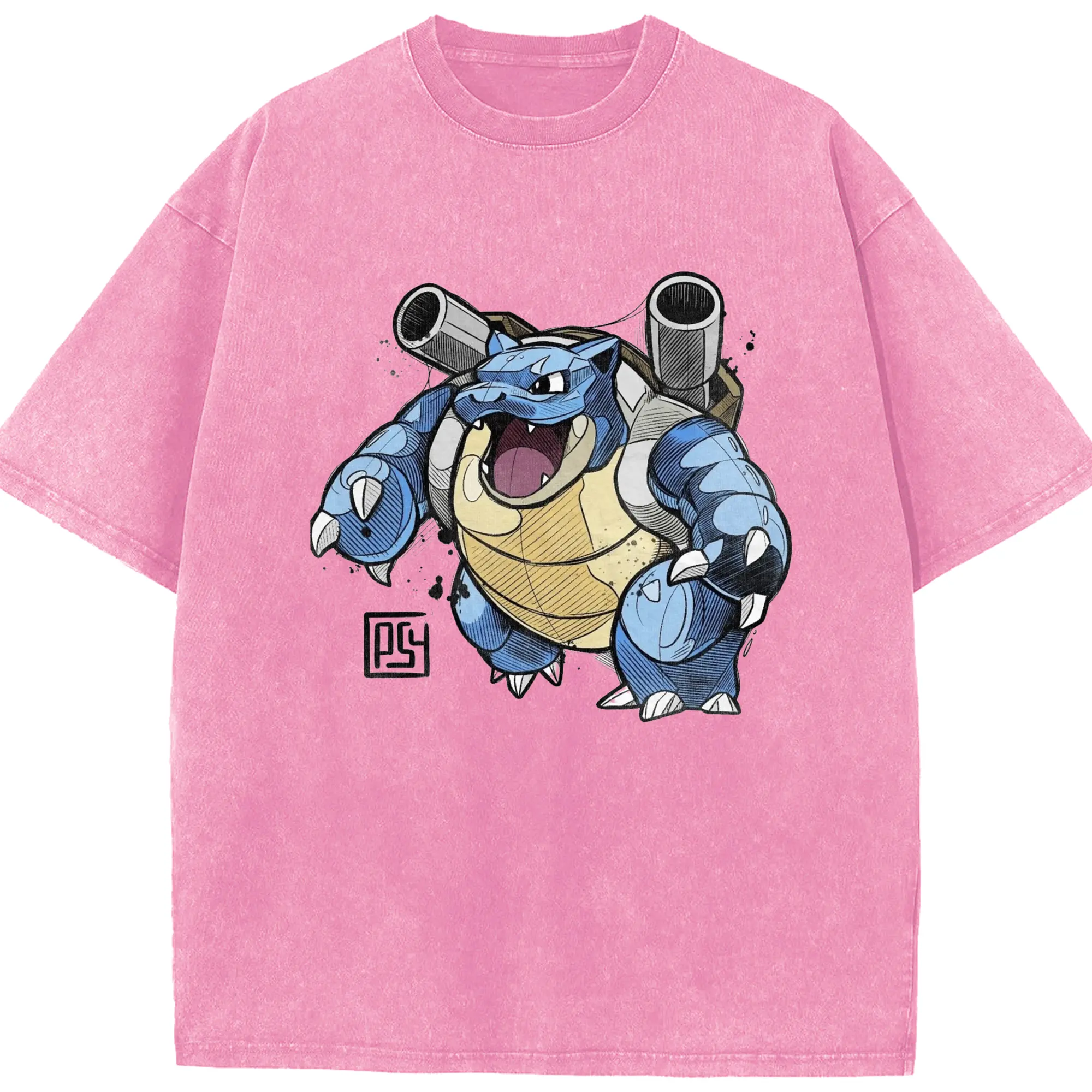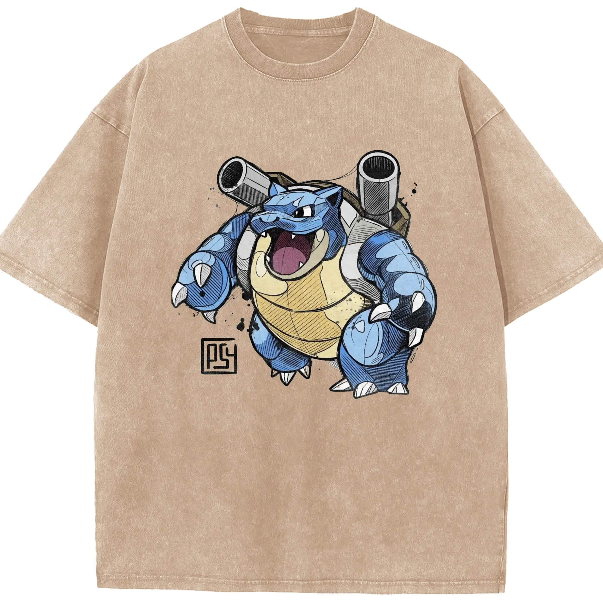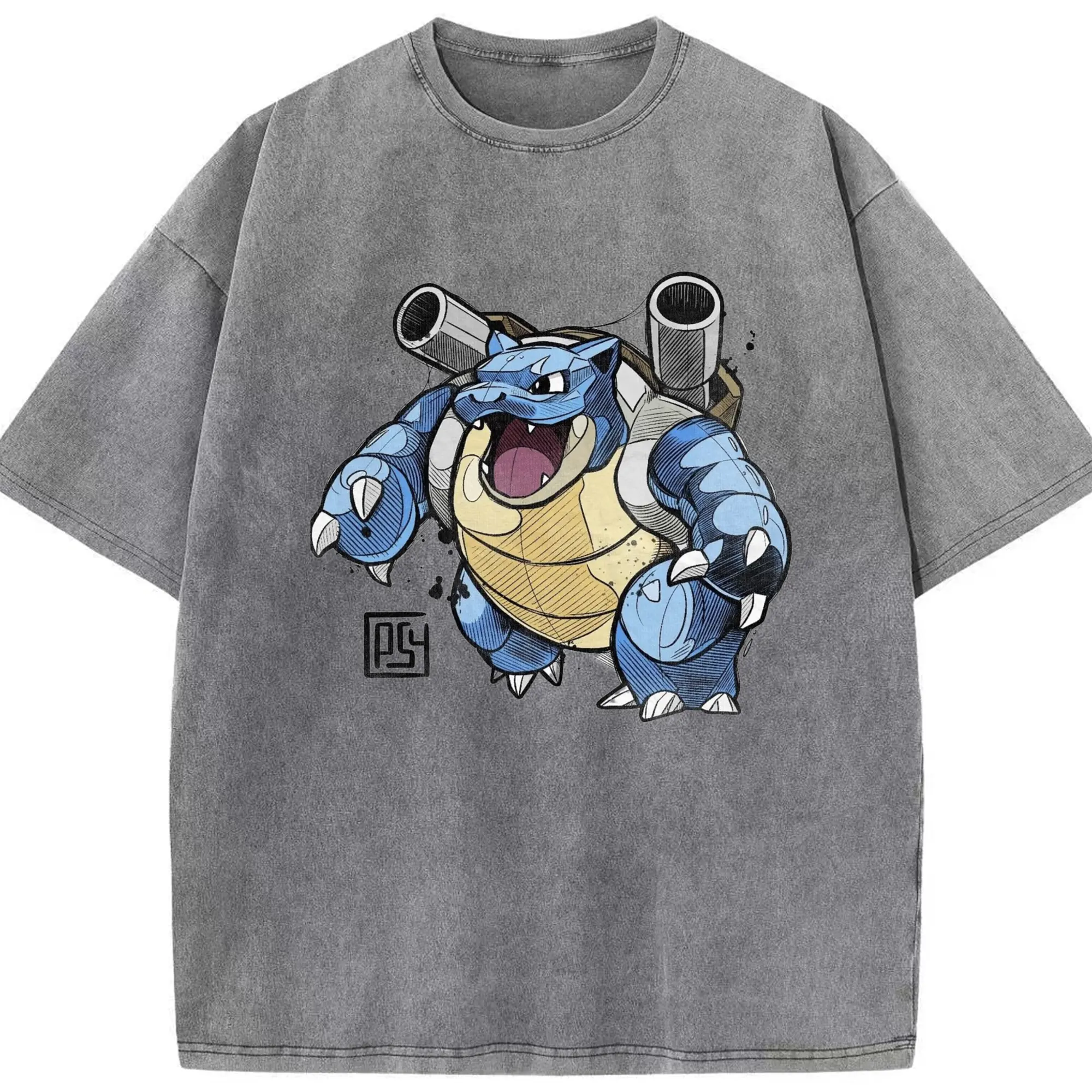 Man pokemon Blastoise T-Shirt - Washed Vintage Look 230g Cotton Oversized T-Shirt With Front Heat Transfer Print – Soft, Lightweight, Stylish Fit – Comfortable Casual Wear For Sports & Everyday Use