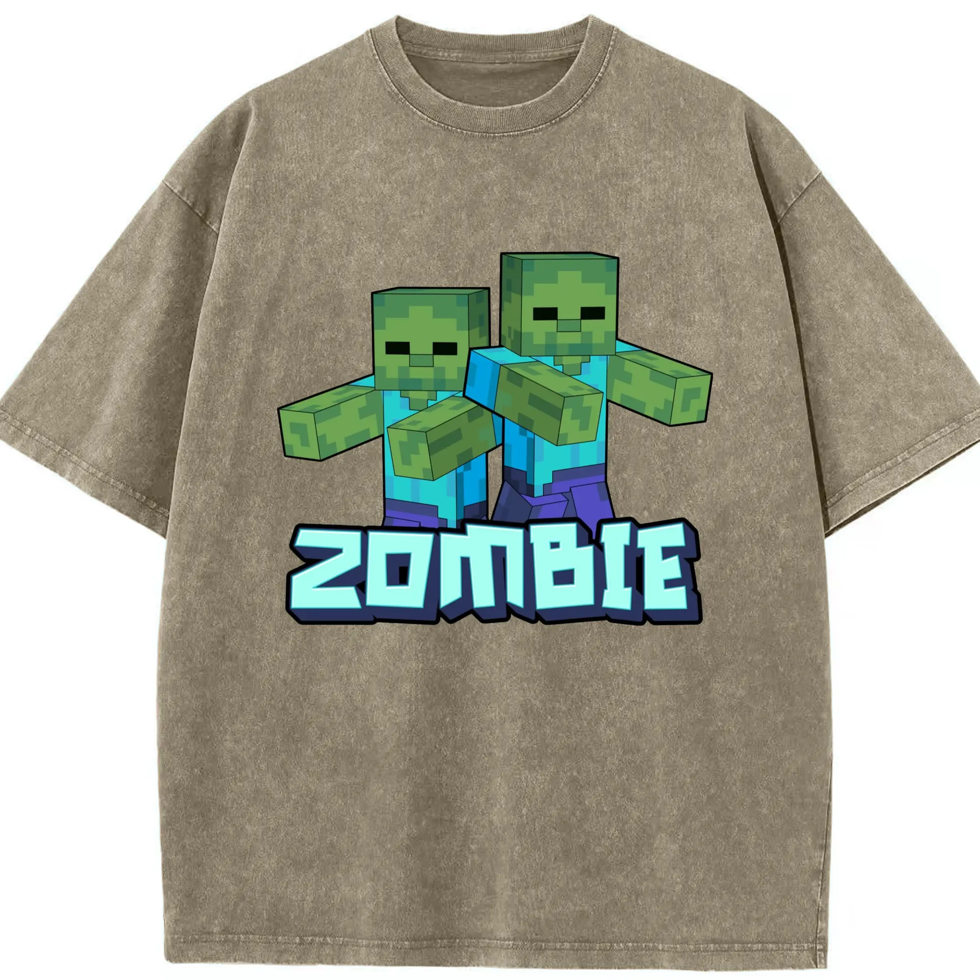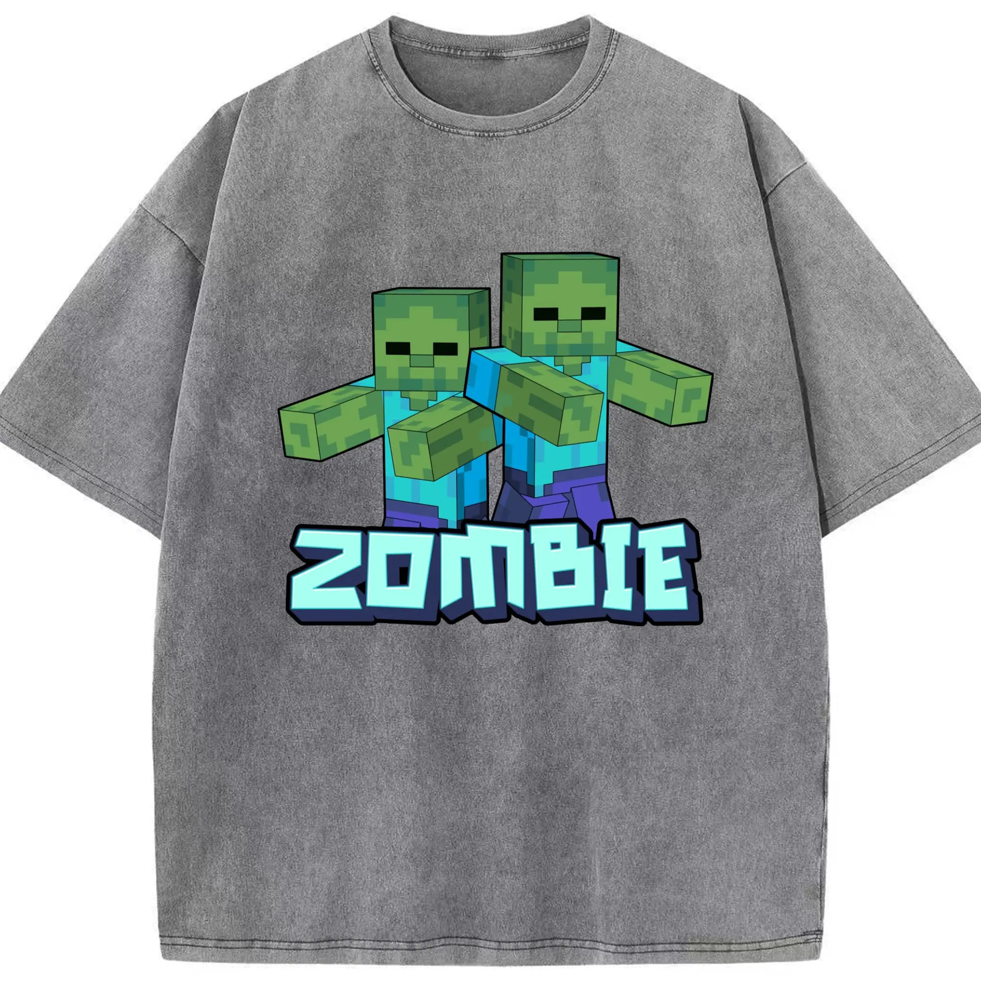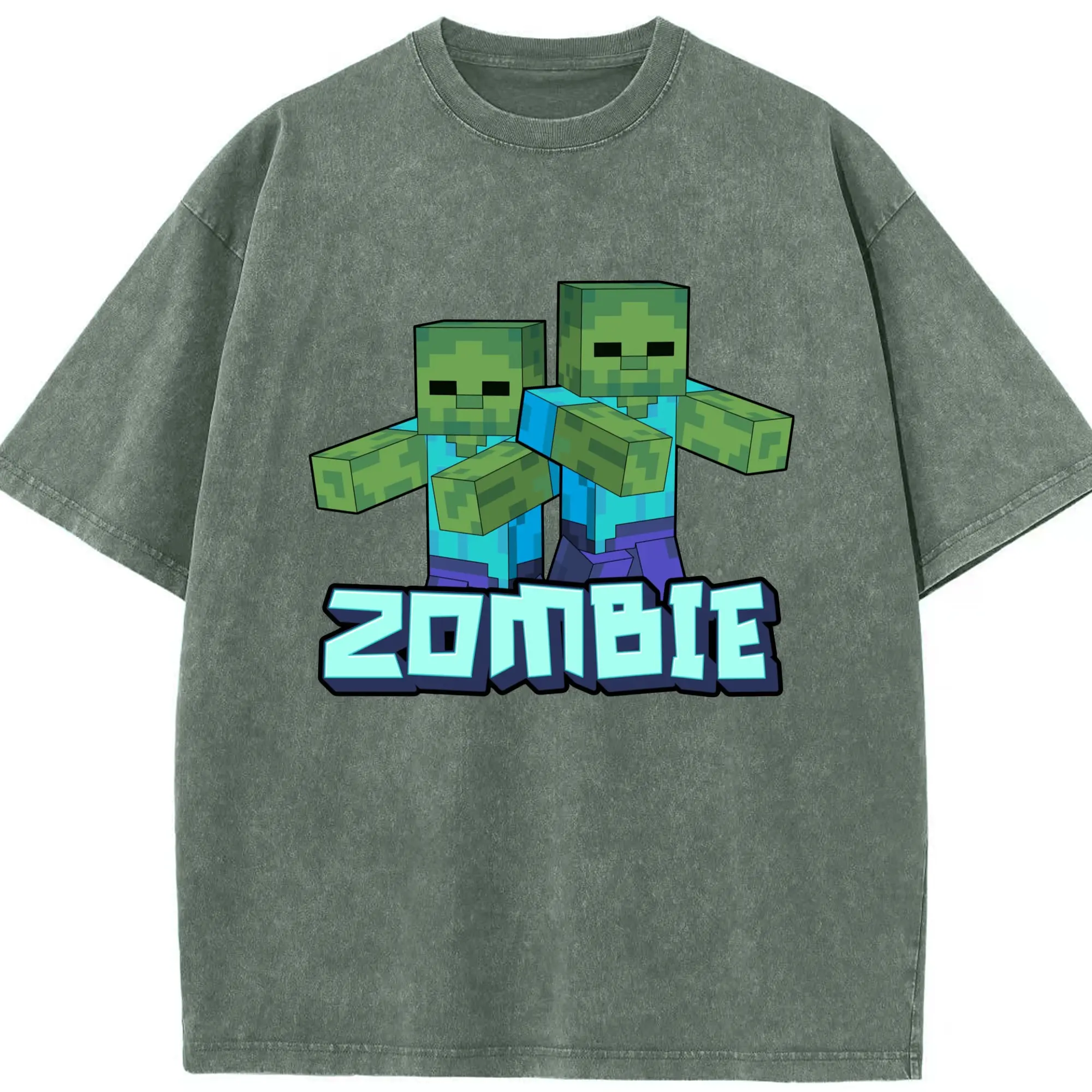 Men's Minecraft Zombies Graphic Tee - Washed Vintage Look 230g Cotton Oversized T-Shirt With Front Heat Transfer Print – Soft, Lightweight, Stylish Fit – Comfortable Casual Wear For Sports & Everyday Use