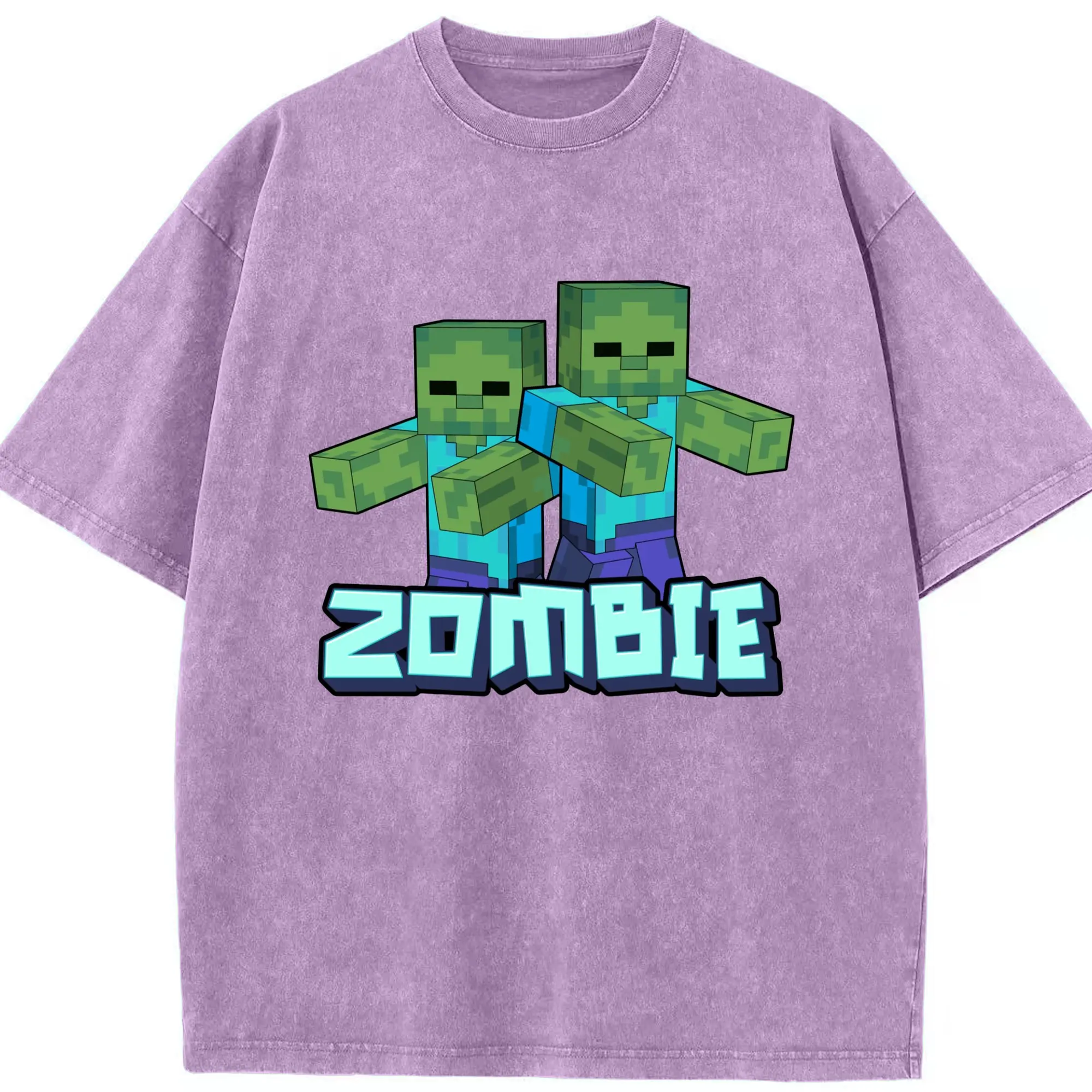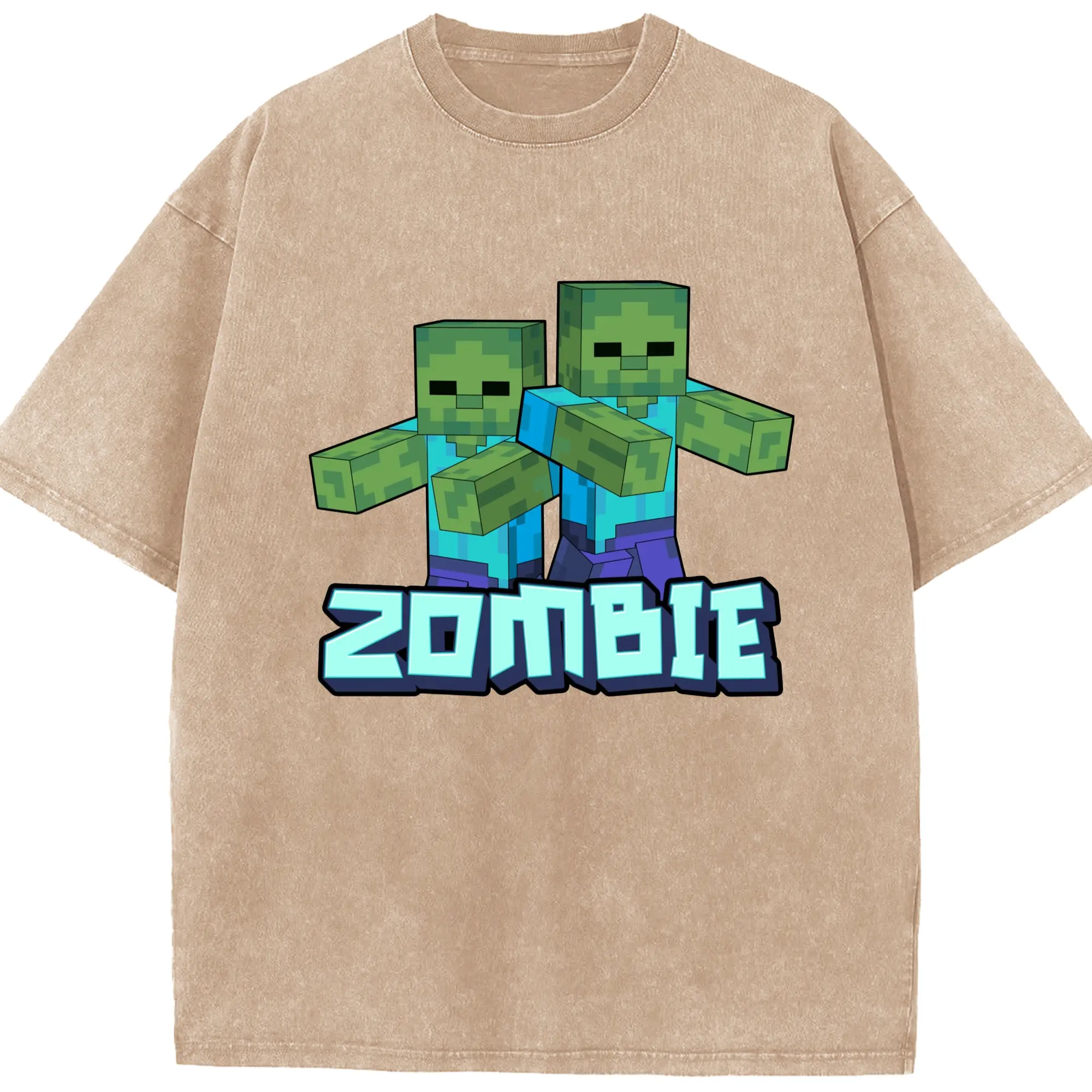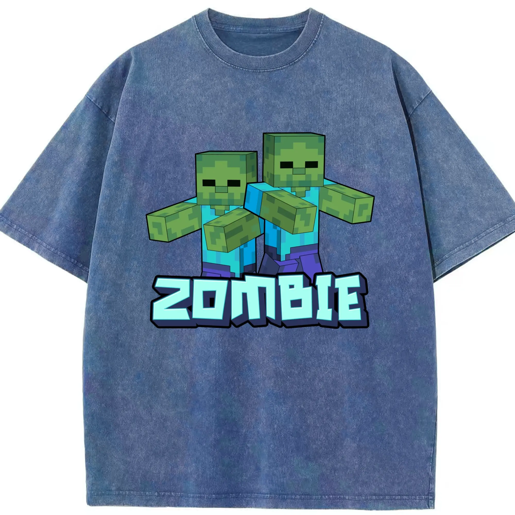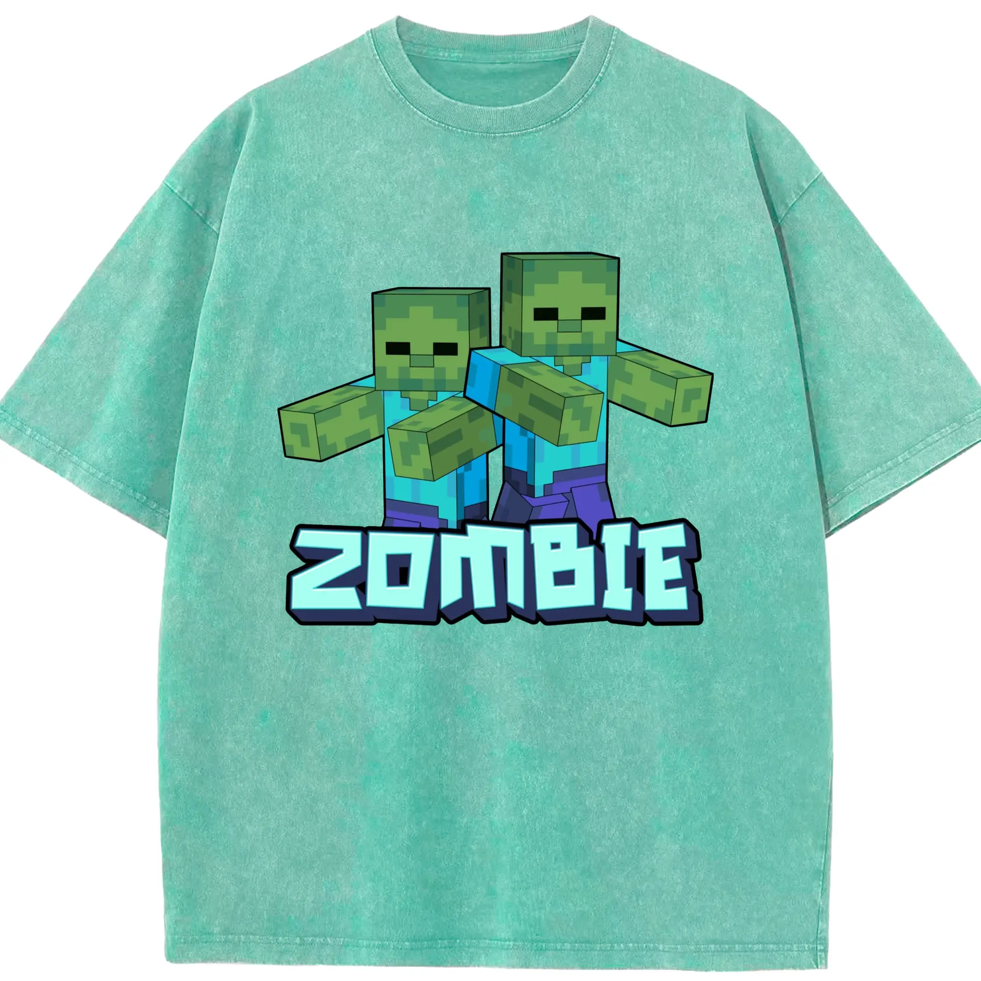 Men's Minecraft Zombies Graphic Tee - Washed Vintage Look 230g Cotton Oversized T-Shirt With Front Heat Transfer Print – Soft, Lightweight, Stylish Fit – Comfortable Casual Wear For Sports & Everyday Use