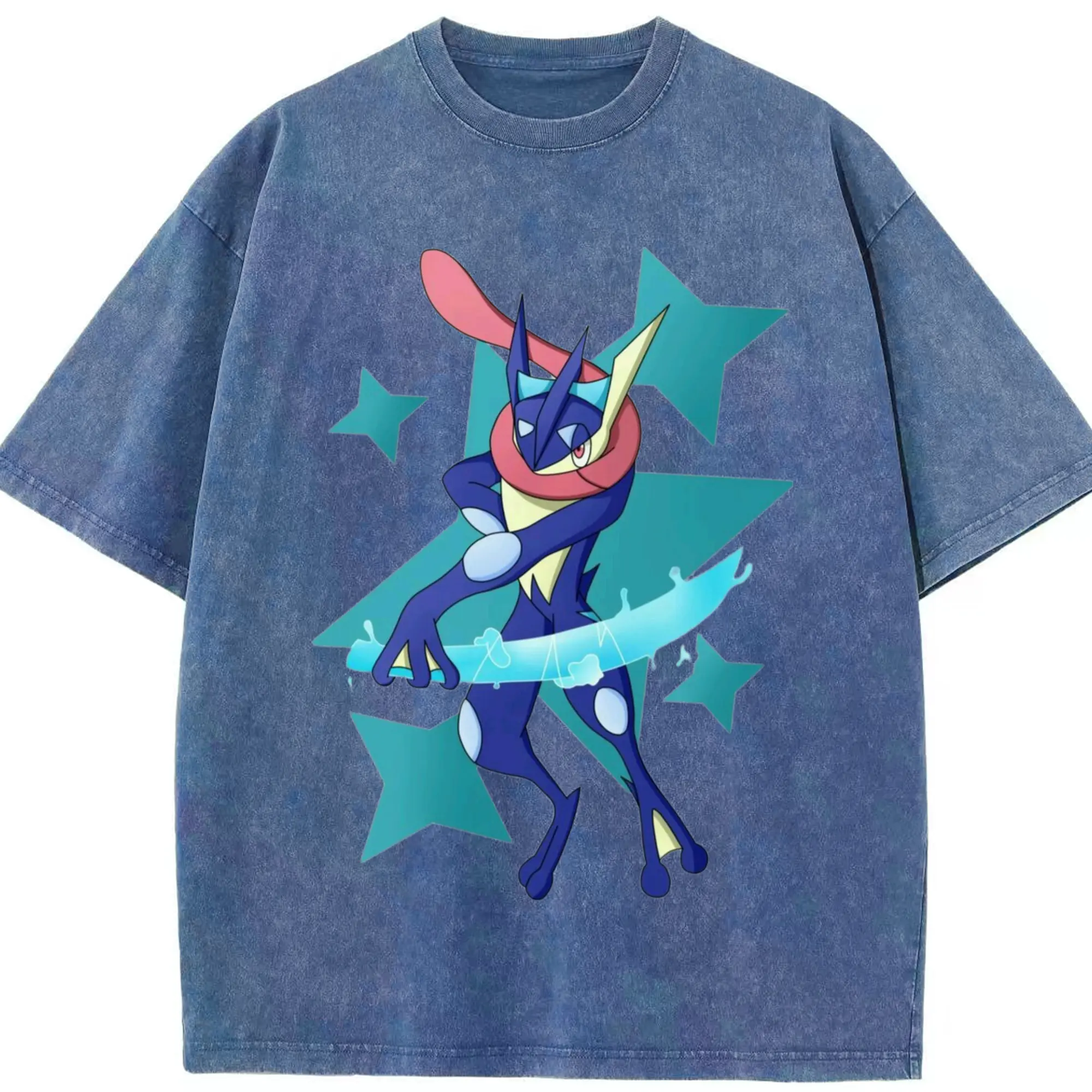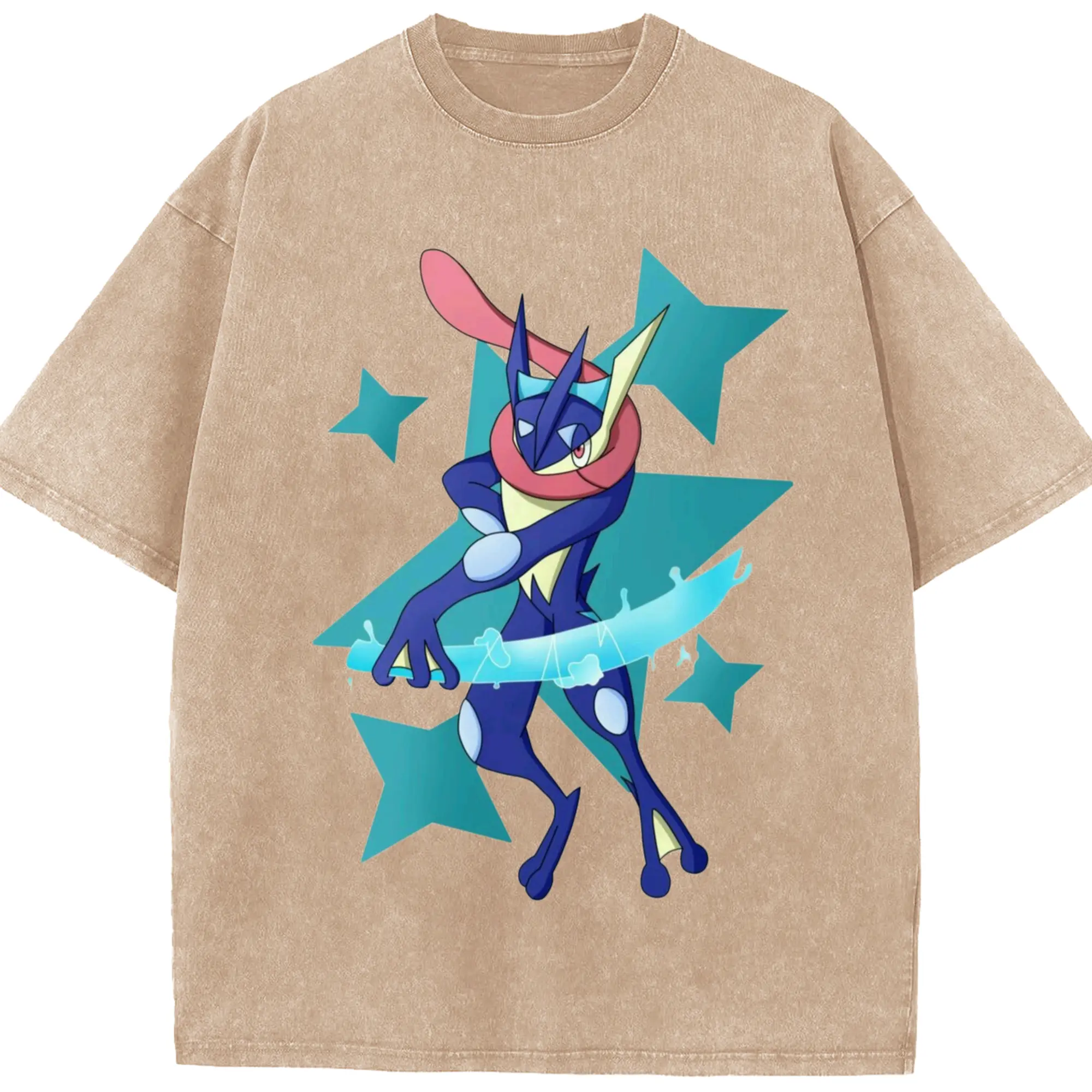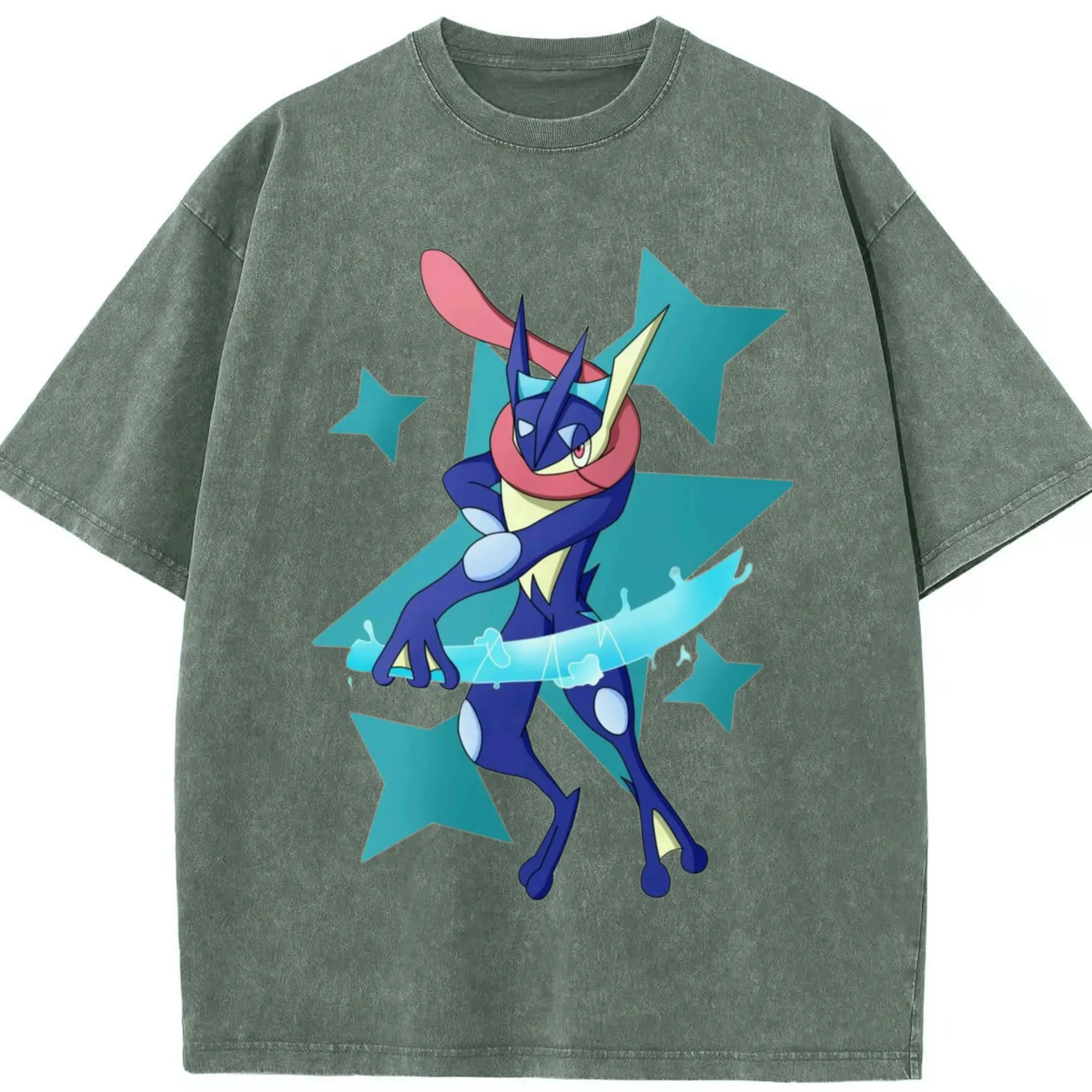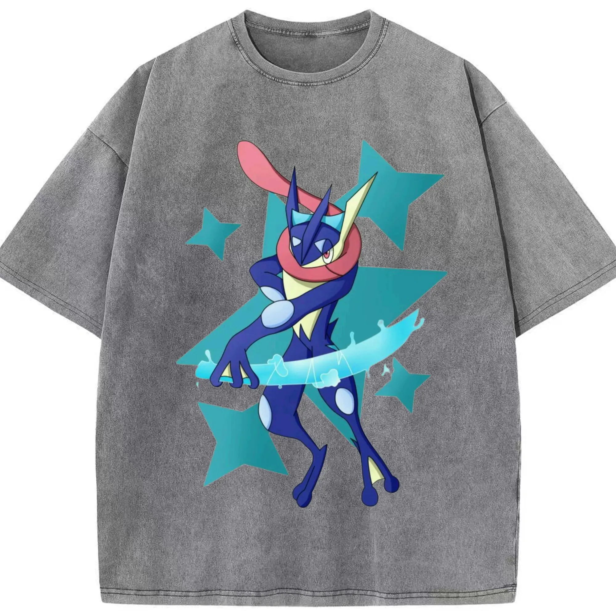 Men's Pokémon Greninja graphic shirt - Washed Vintage Look 230g Cotton Oversized T-Shirt With Front Heat Transfer Print – Soft, Lightweight, Stylish Fit – Comfortable Casual Wear For Sports & Everyday Use