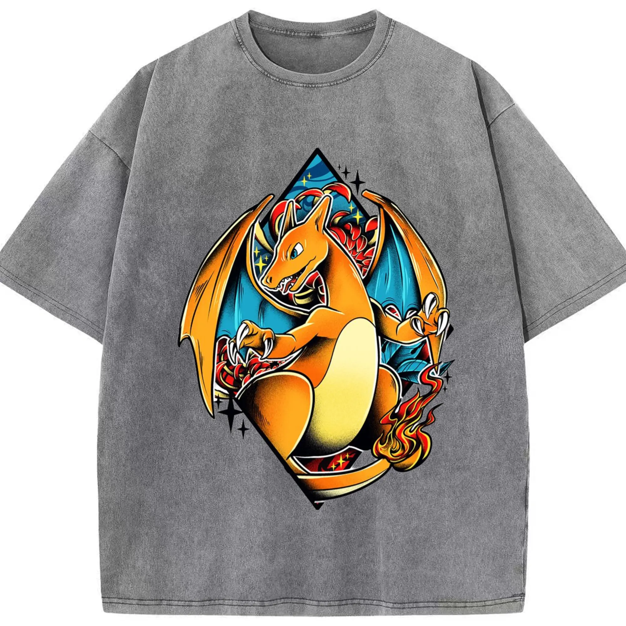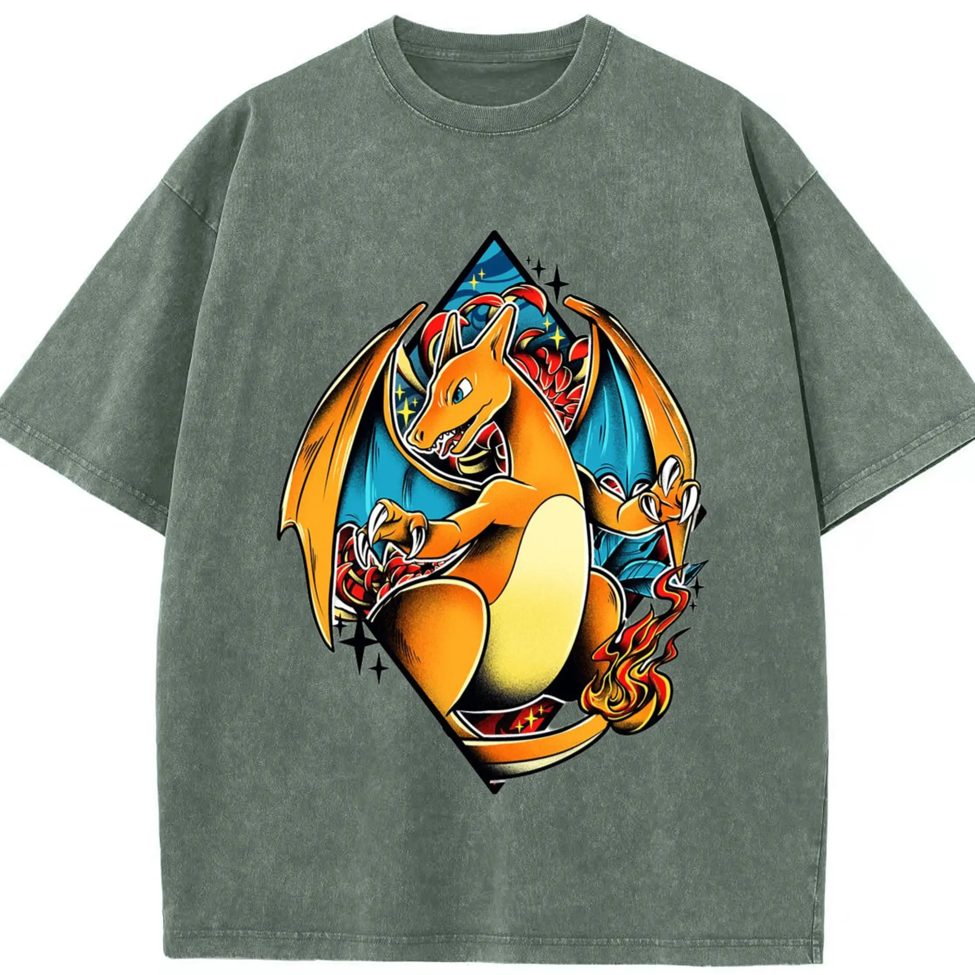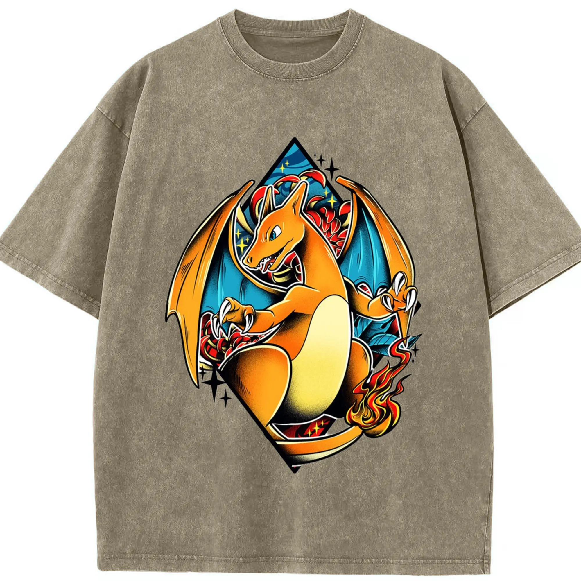Mens charizard graphic t shirt - Washed Vintage Look 230g Cotton Oversized T-Shirt With Front Heat Transfer Print – Soft, Lightweight, Stylish Fit – Comfortable Casual Wear For Sports & Everyday Use
