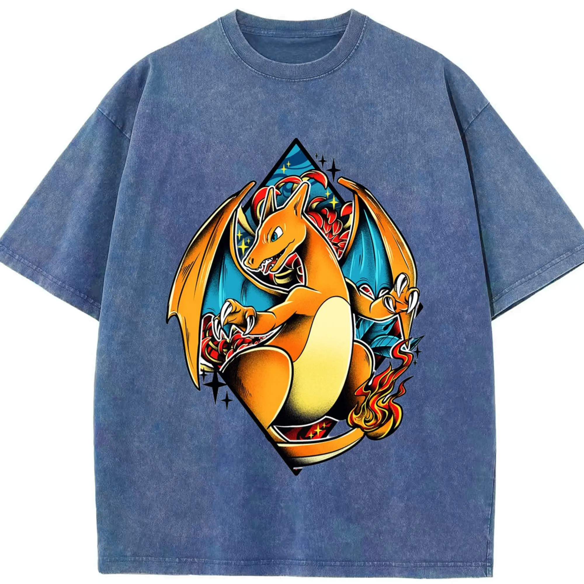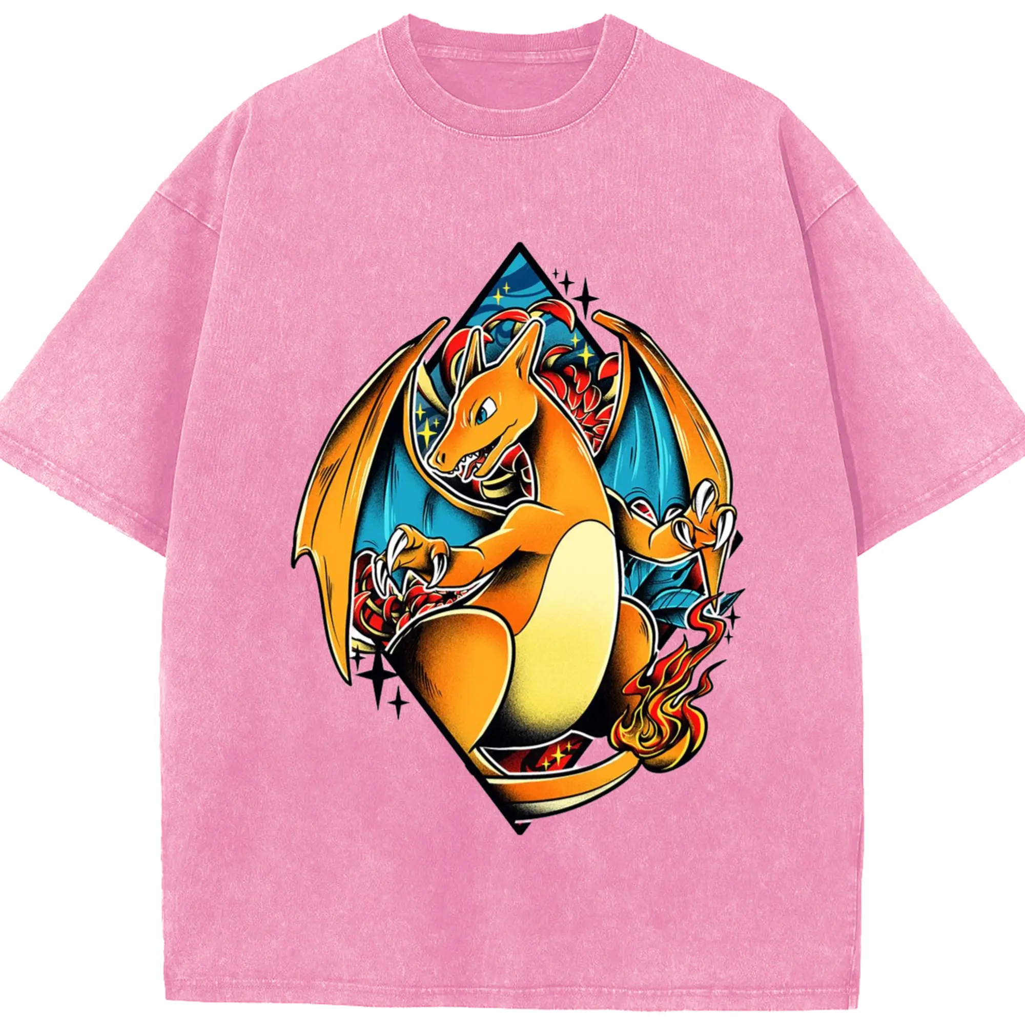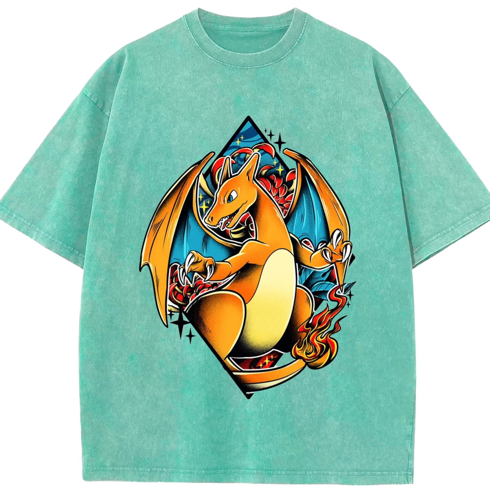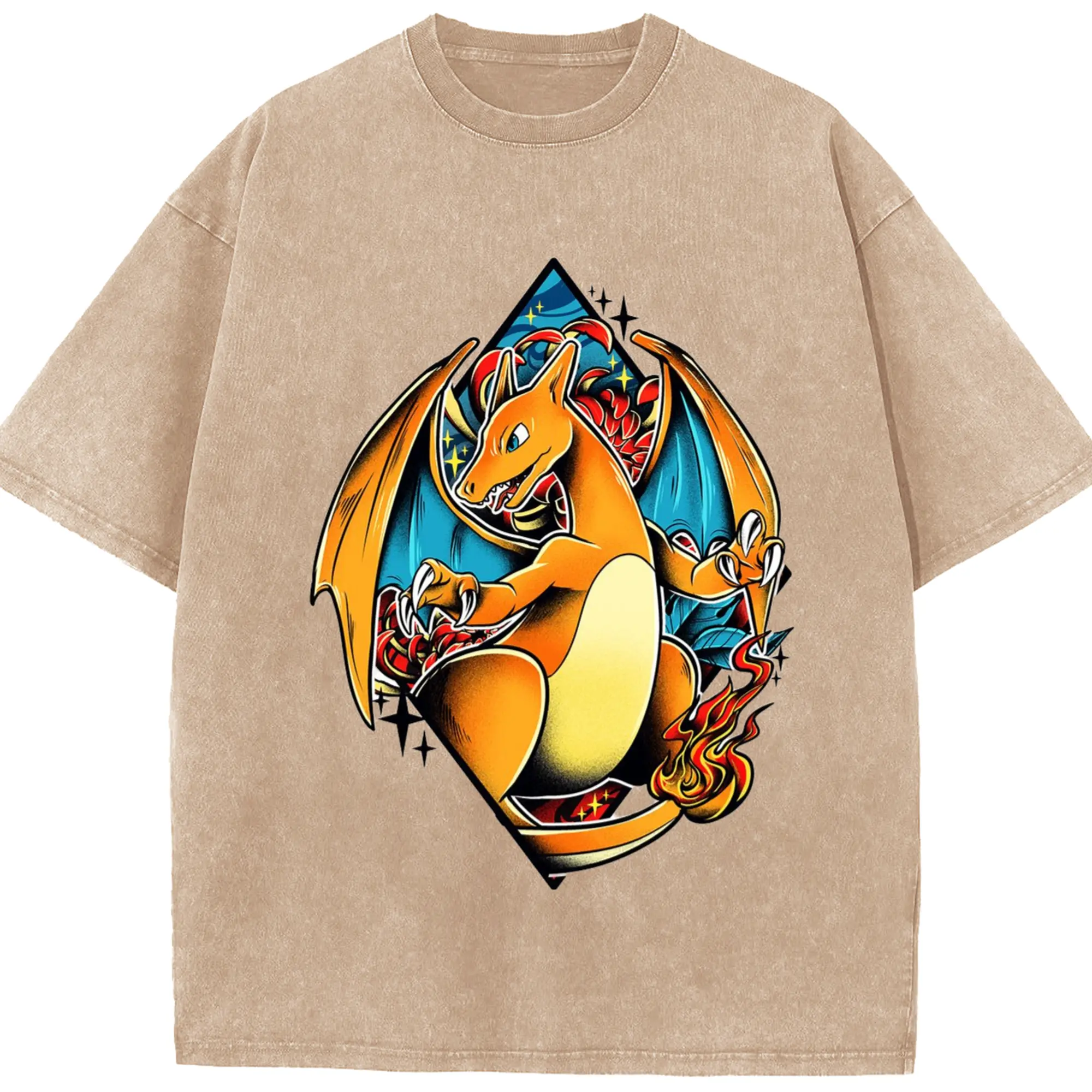 Mens charizard graphic t shirt - Washed Vintage Look 230g Cotton Oversized T-Shirt With Front Heat Transfer Print – Soft, Lightweight, Stylish Fit – Comfortable Casual Wear For Sports & Everyday Use
