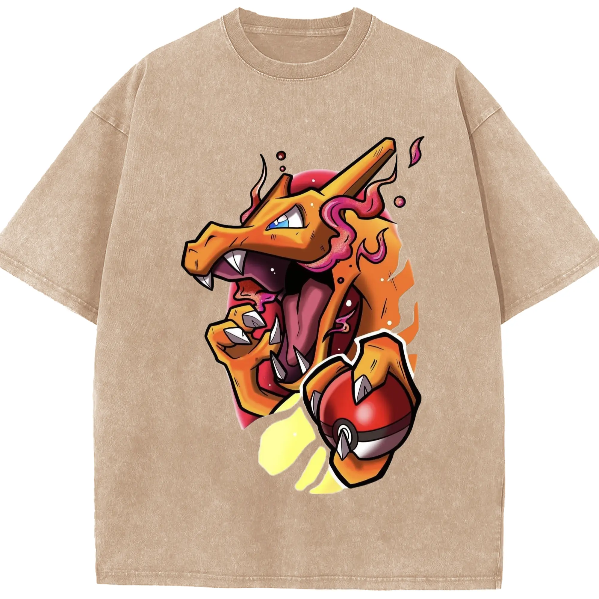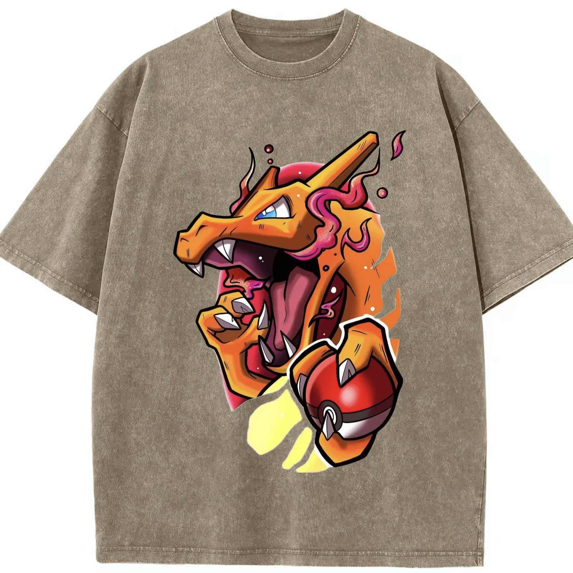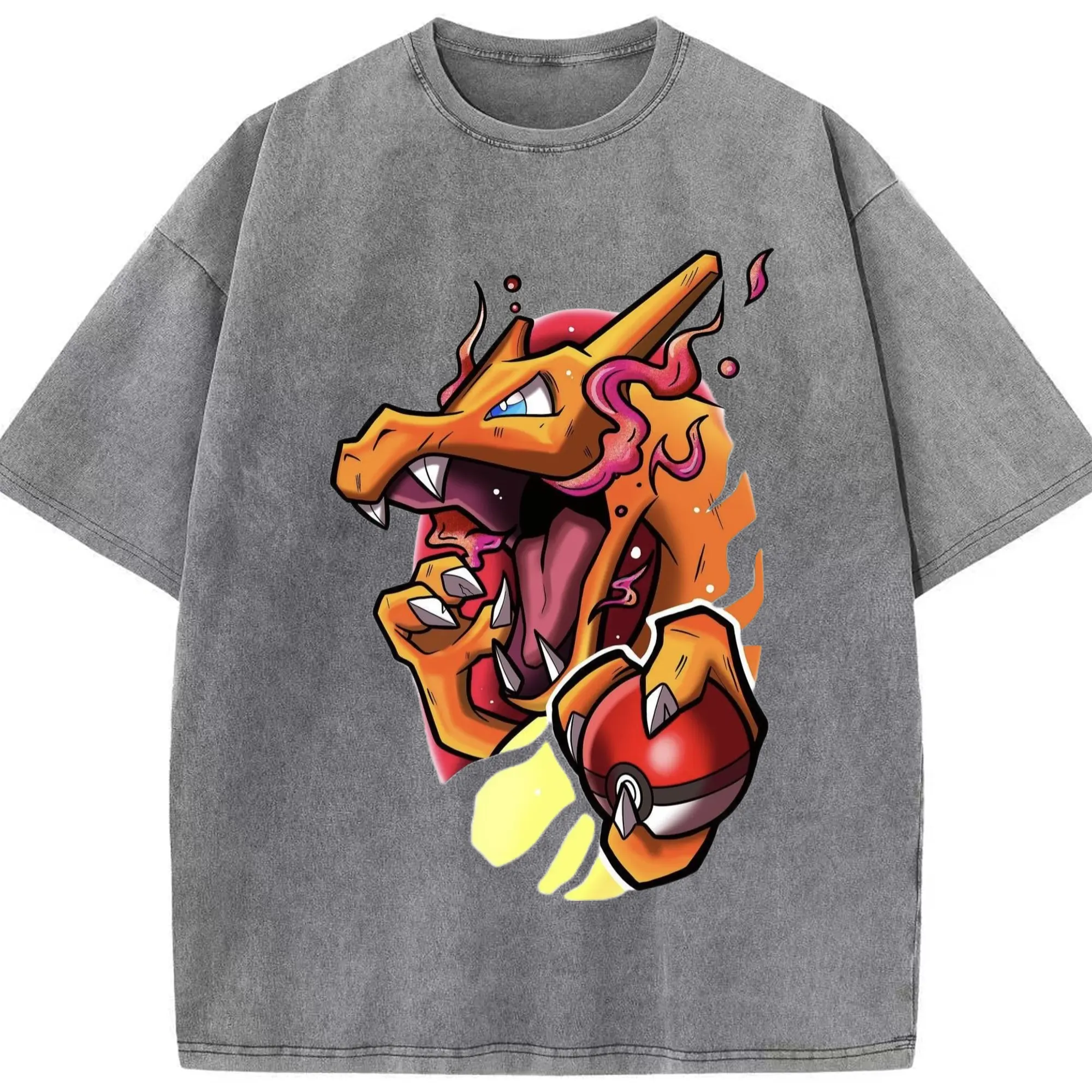 Mens charizard tee - Washed Vintage Look 230g Cotton Oversized T-Shirt With Front Heat Transfer Print – Soft, Lightweight, Stylish Fit – Comfortable Casual Wear For Sports & Everyday Use