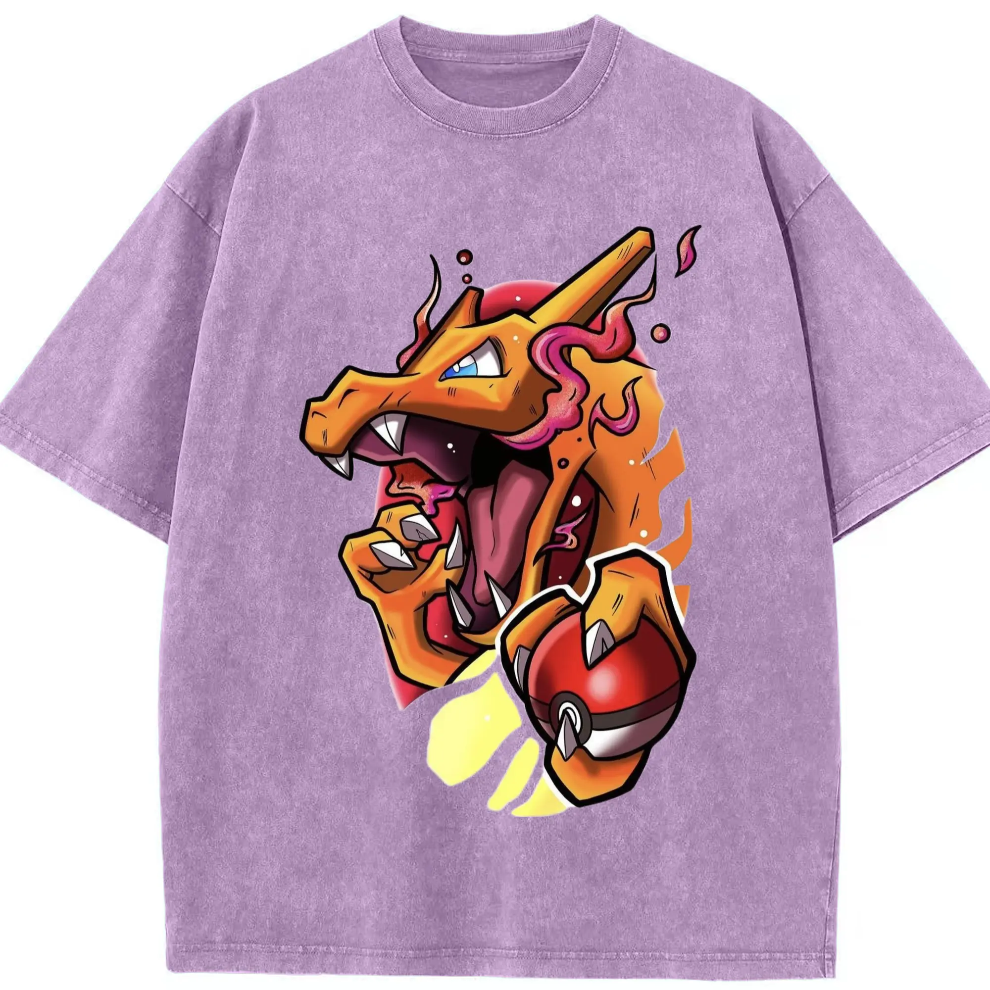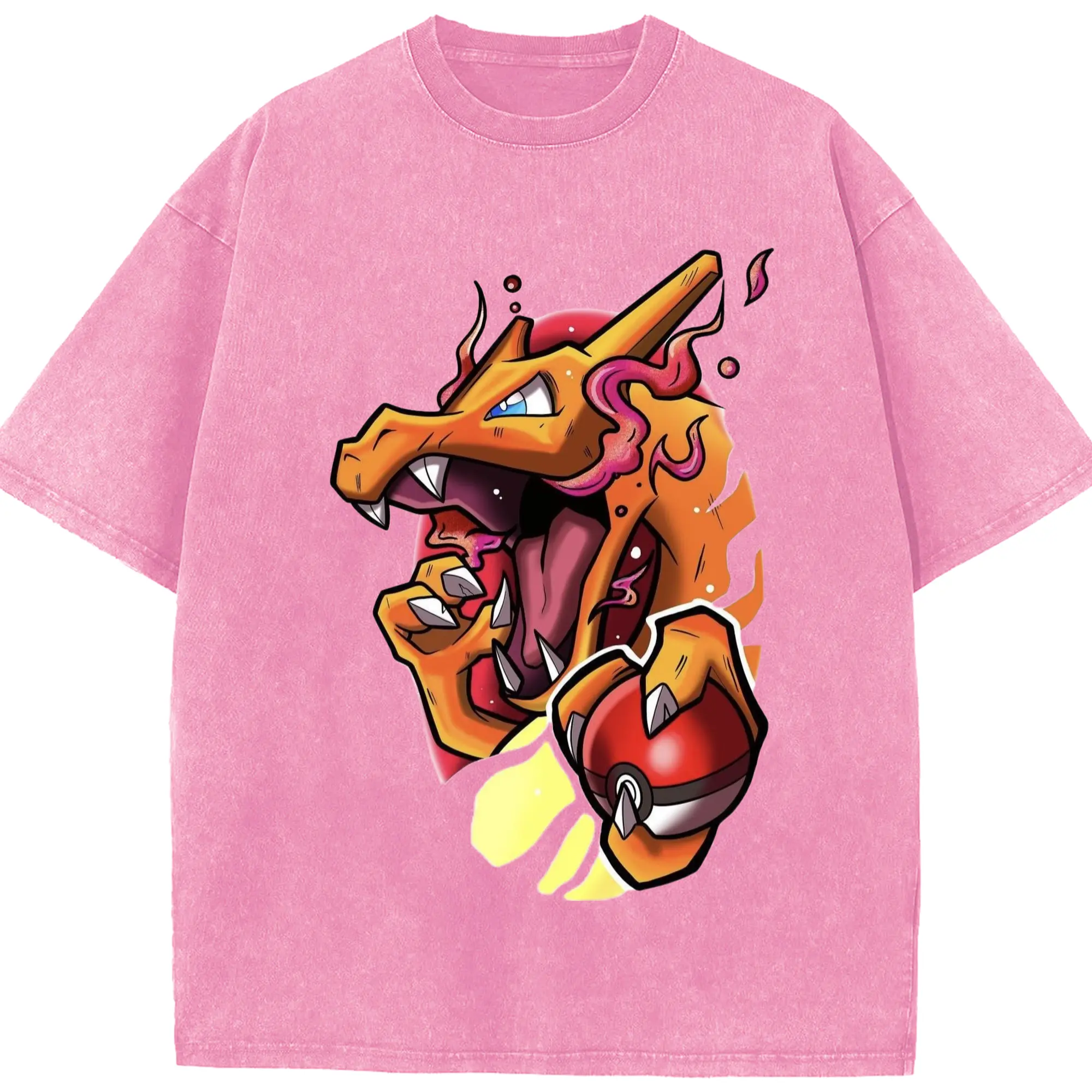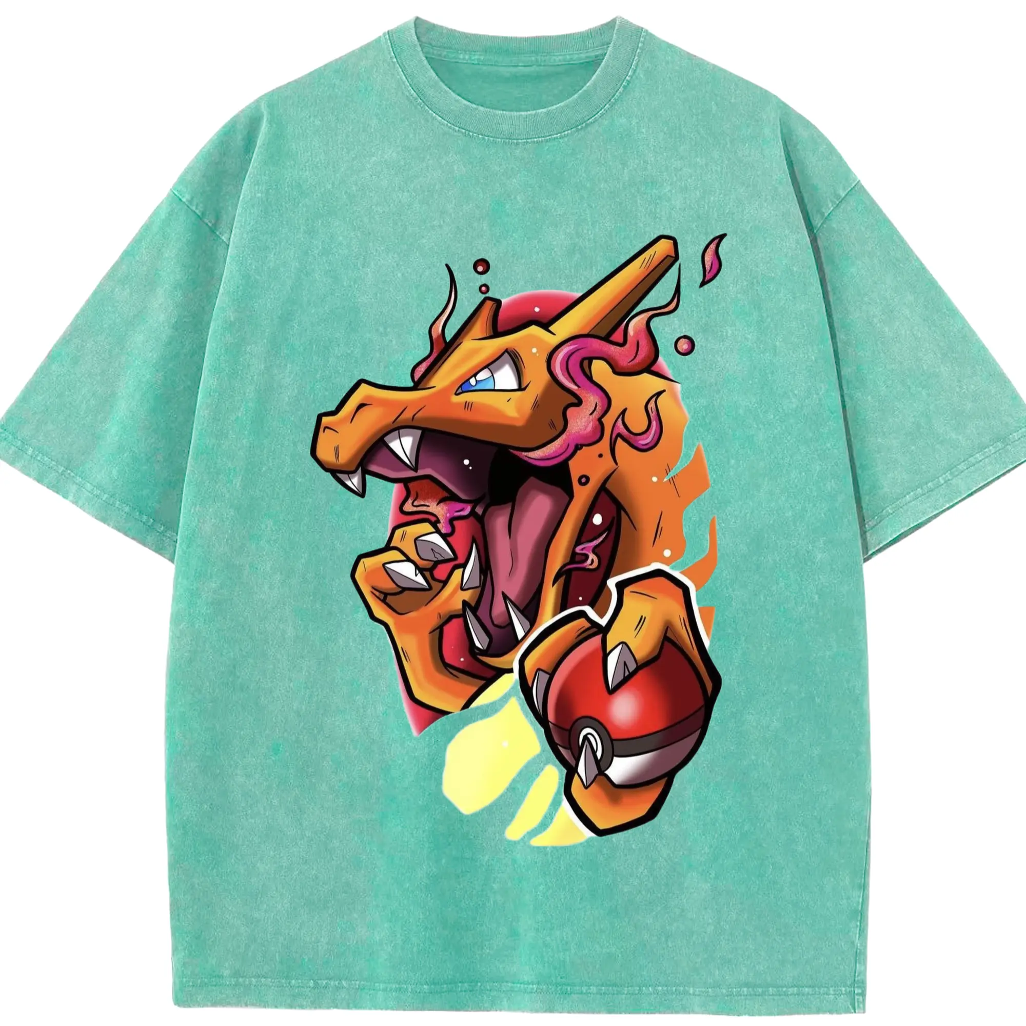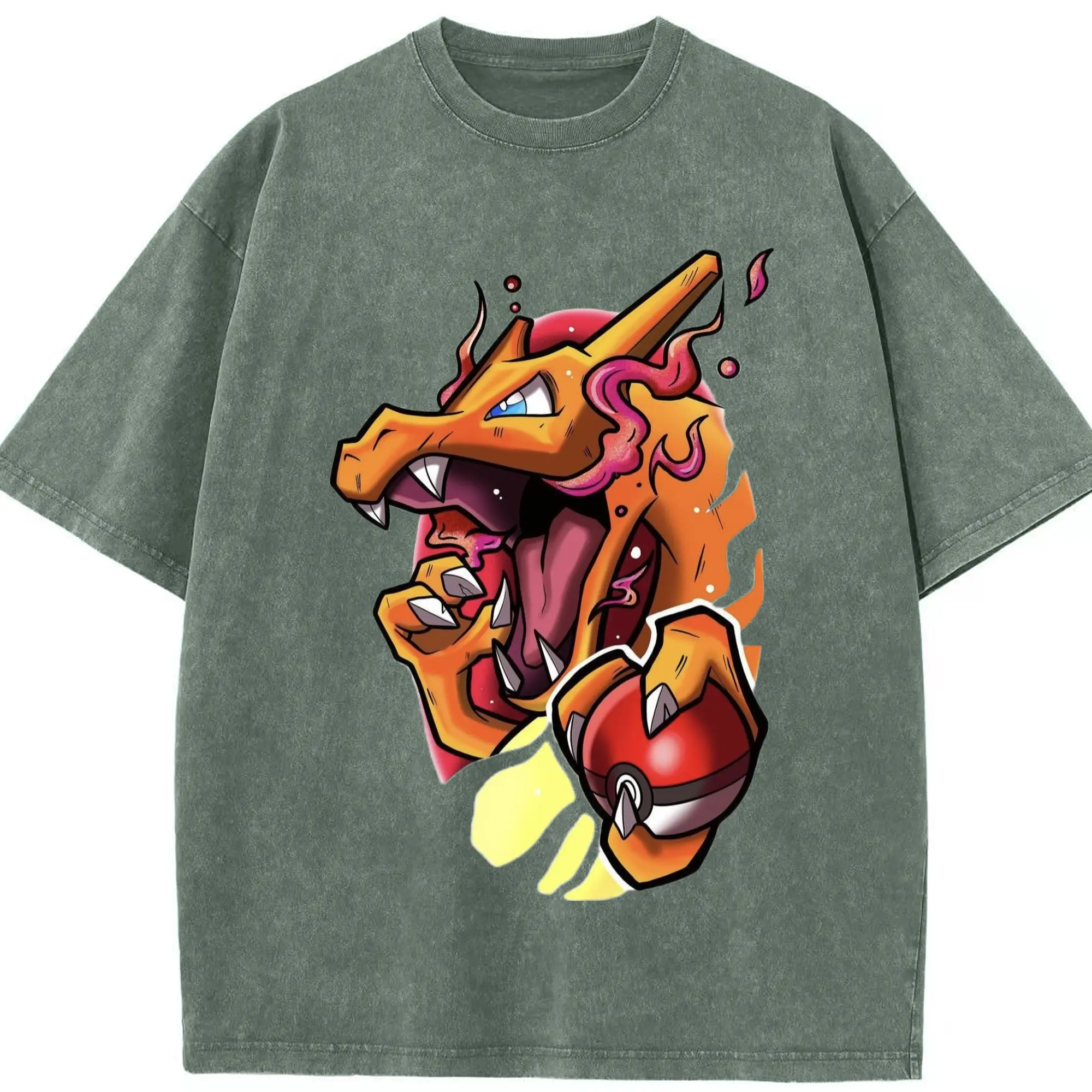 Mens charizard tee - Washed Vintage Look 230g Cotton Oversized T-Shirt With Front Heat Transfer Print – Soft, Lightweight, Stylish Fit – Comfortable Casual Wear For Sports & Everyday Use