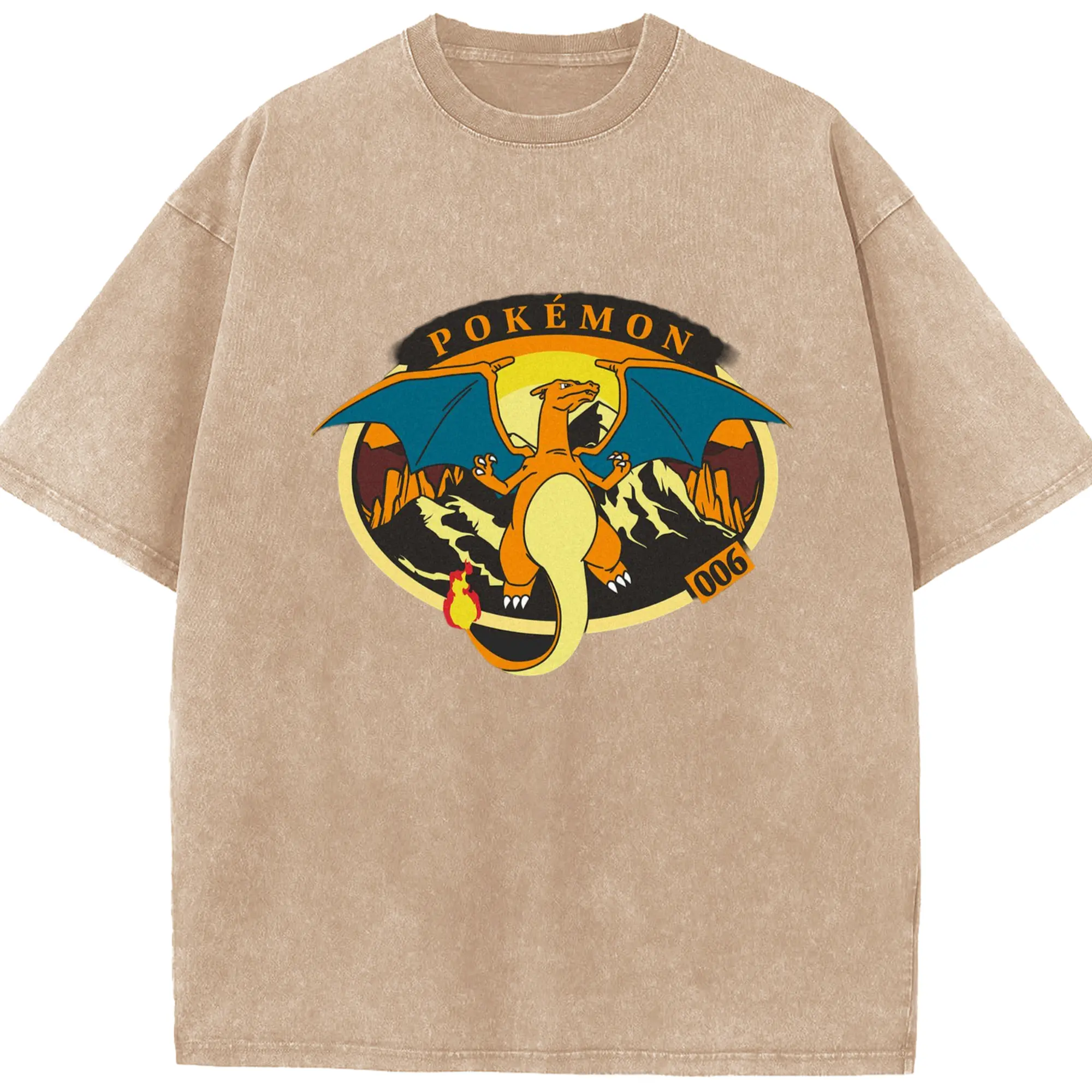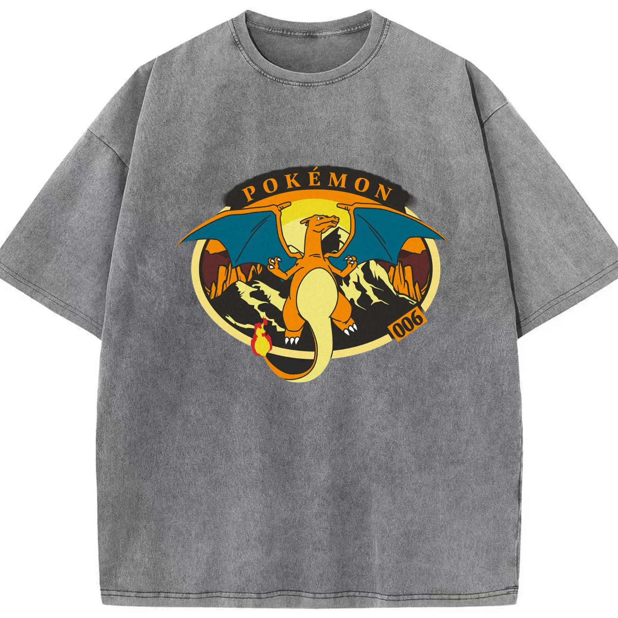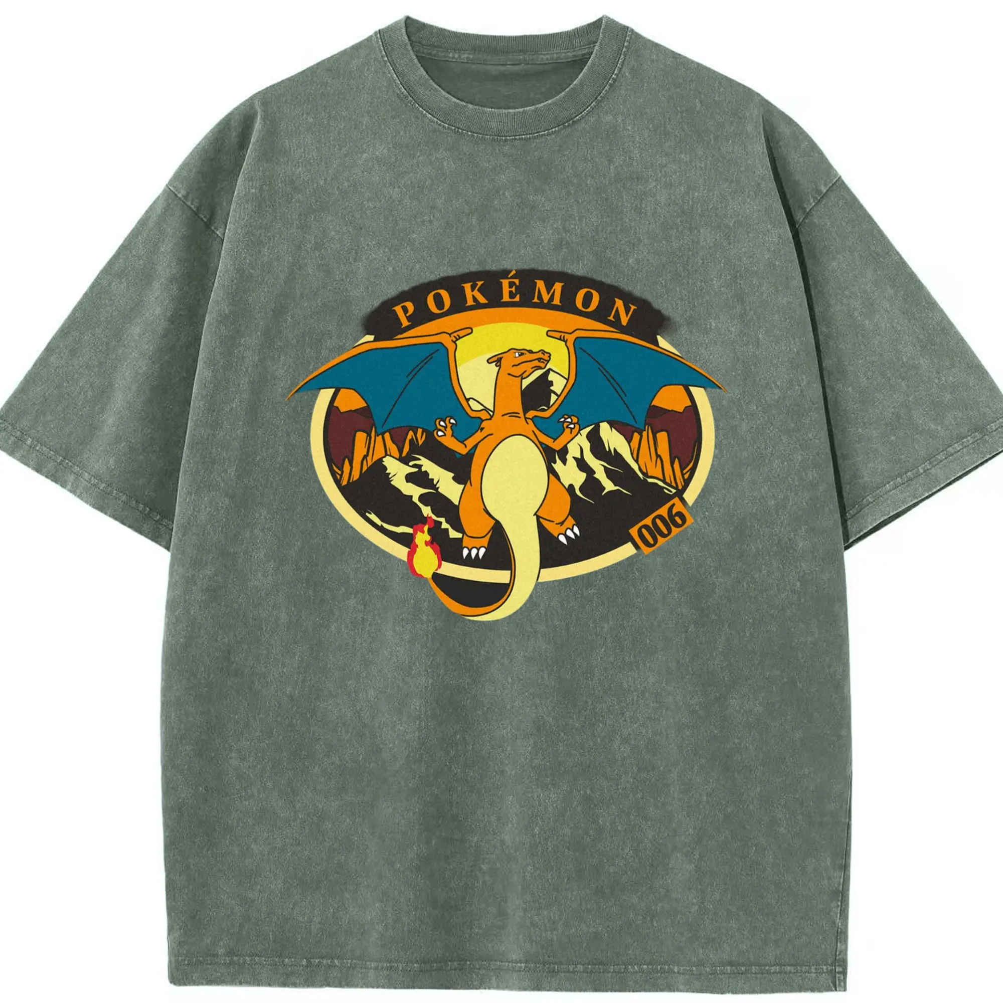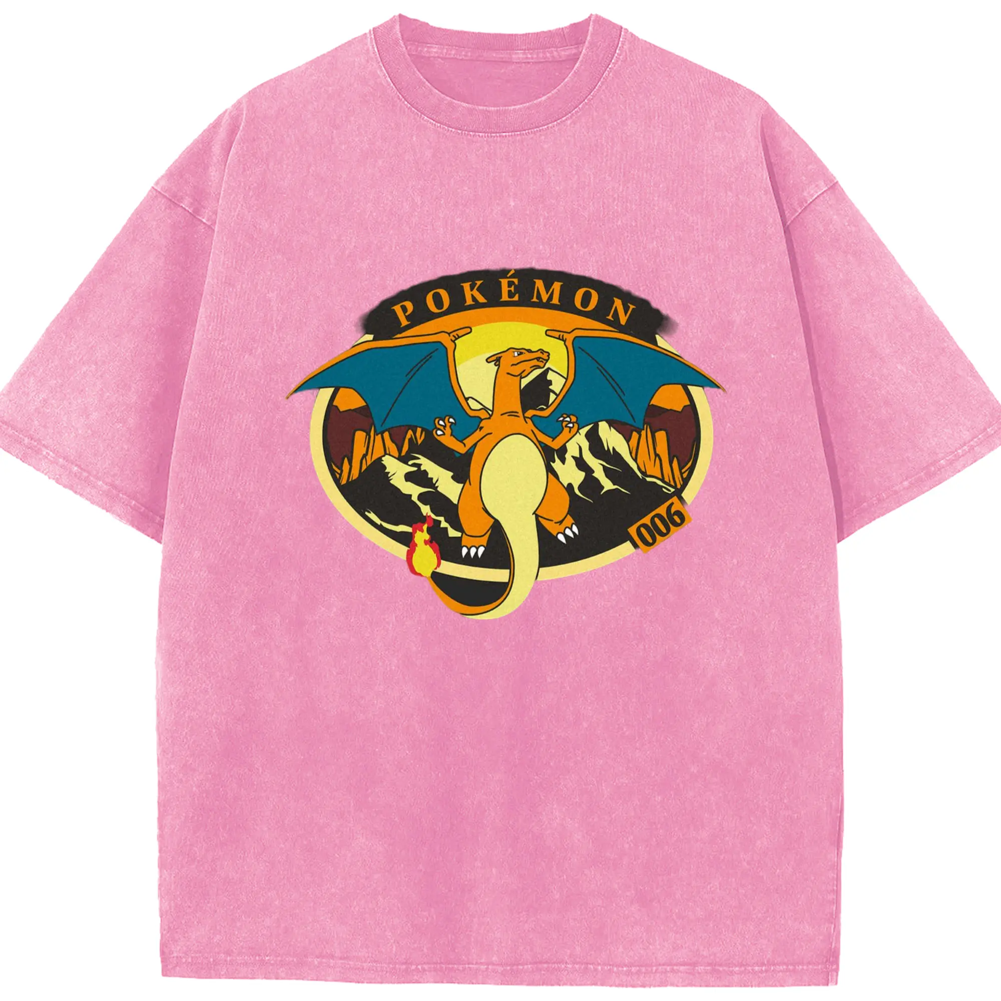 Mens pokemon charizard t shirt - Washed Vintage Look 230g Cotton Oversized T-Shirt With Front Heat Transfer Print – Soft, Lightweight, Stylish Fit – Comfortable Casual Wear For Sports & Everyday Use