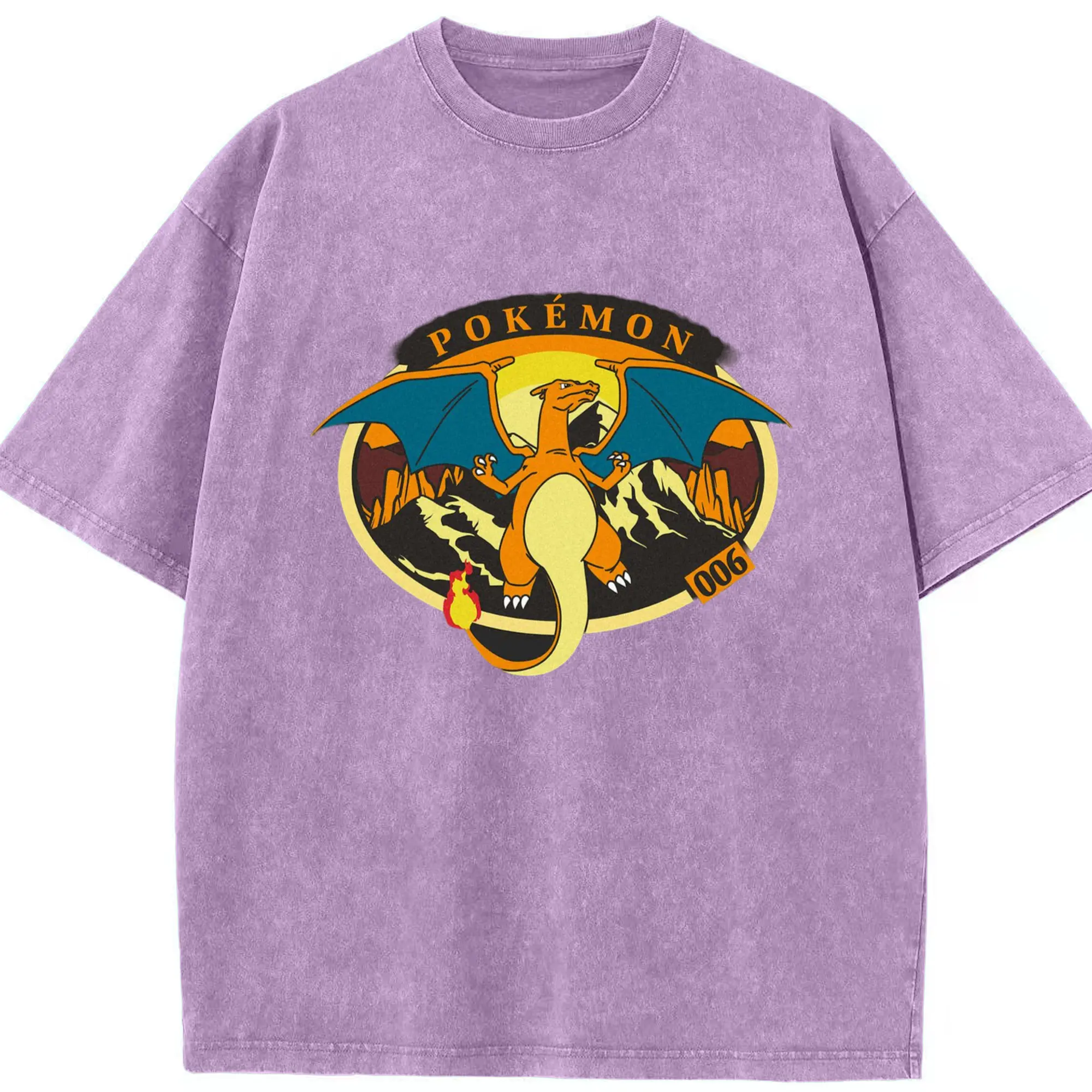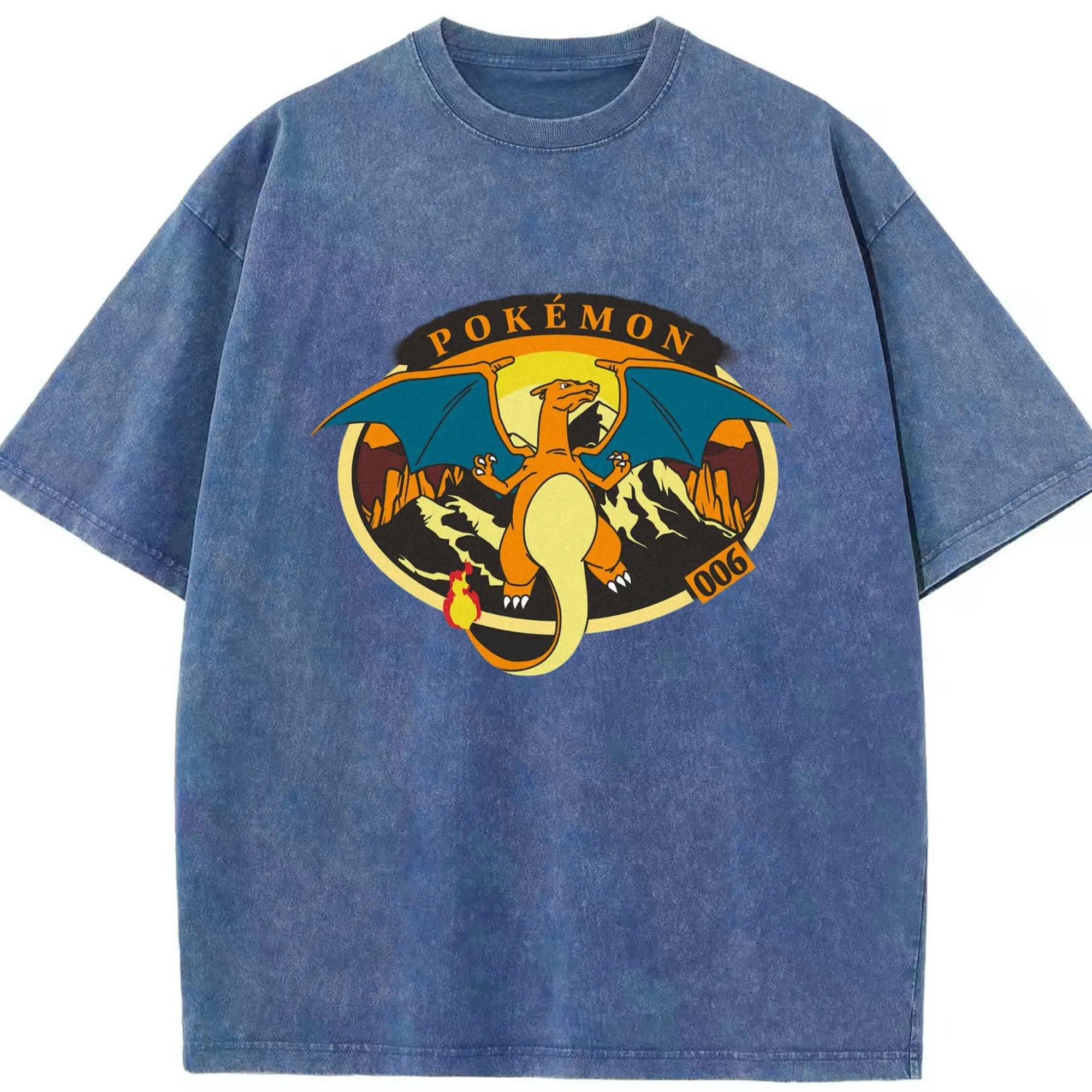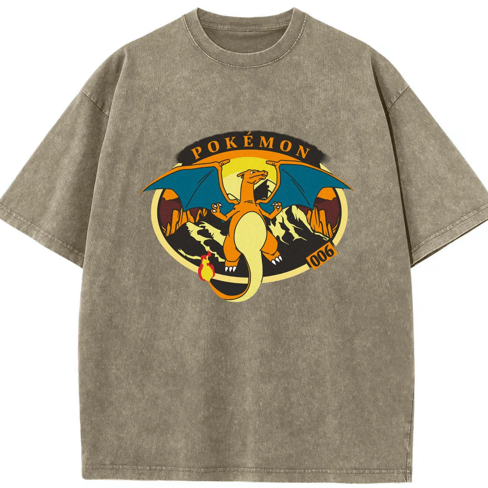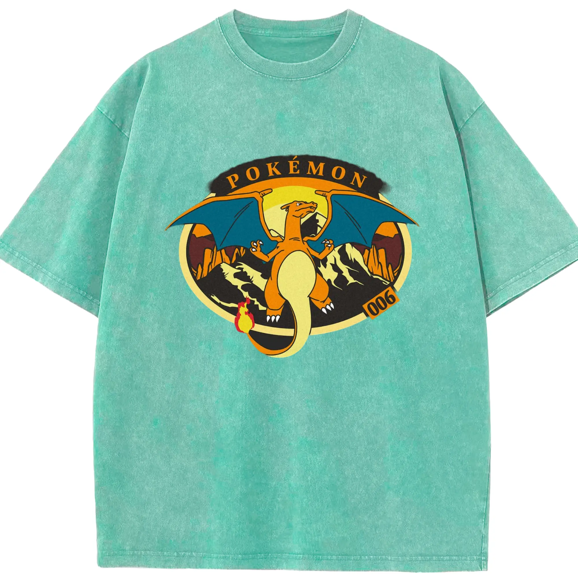 Mens pokemon charizard t shirt - Washed Vintage Look 230g Cotton Oversized T-Shirt With Front Heat Transfer Print – Soft, Lightweight, Stylish Fit – Comfortable Casual Wear For Sports & Everyday Use
