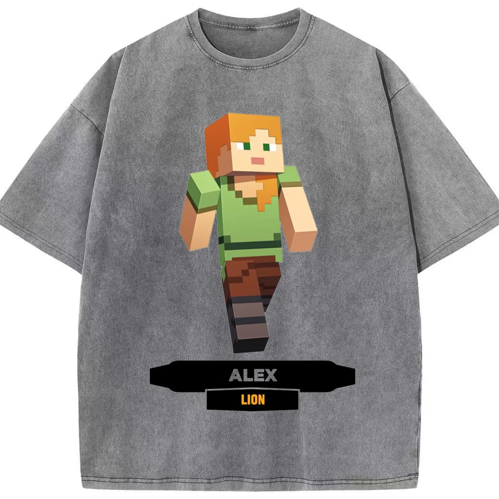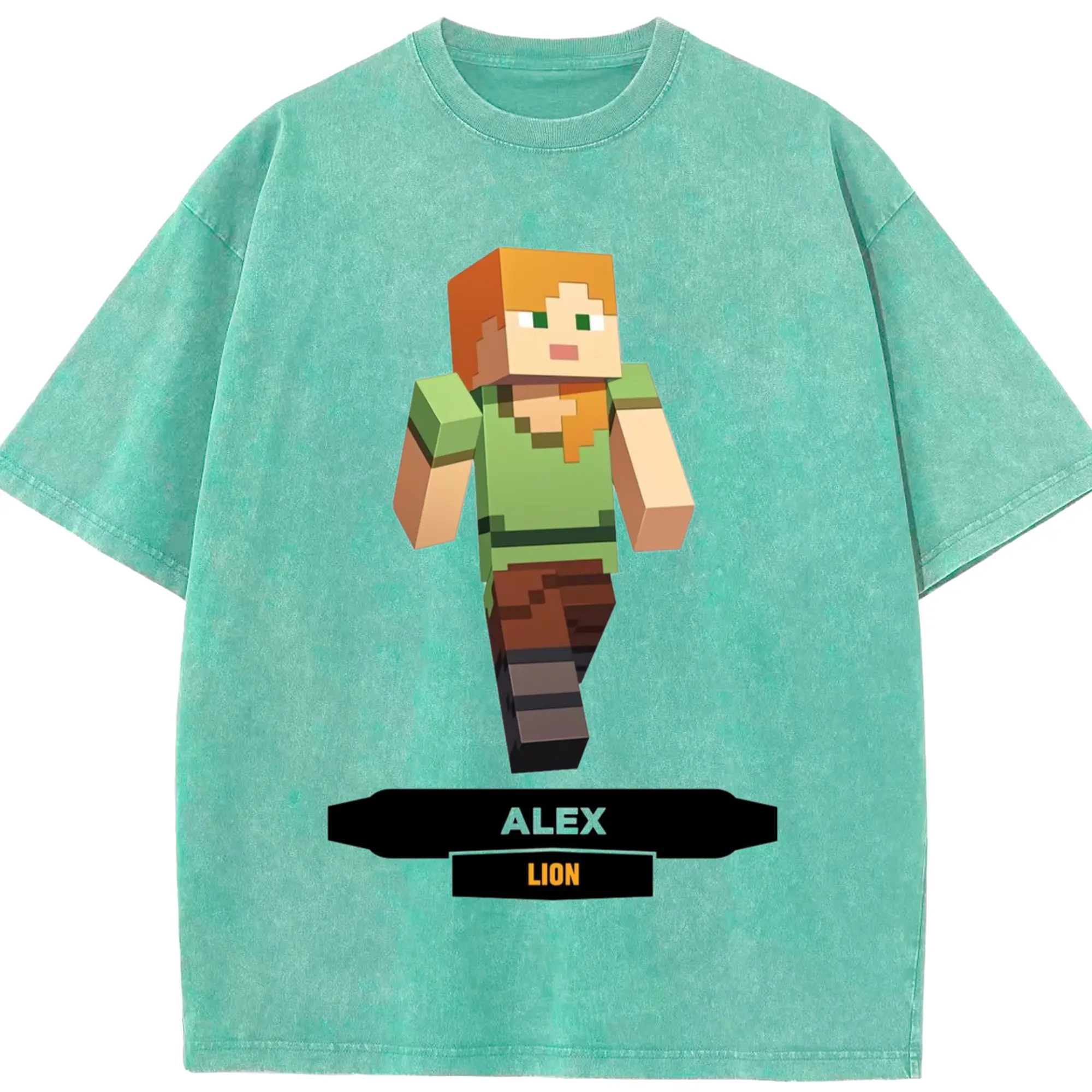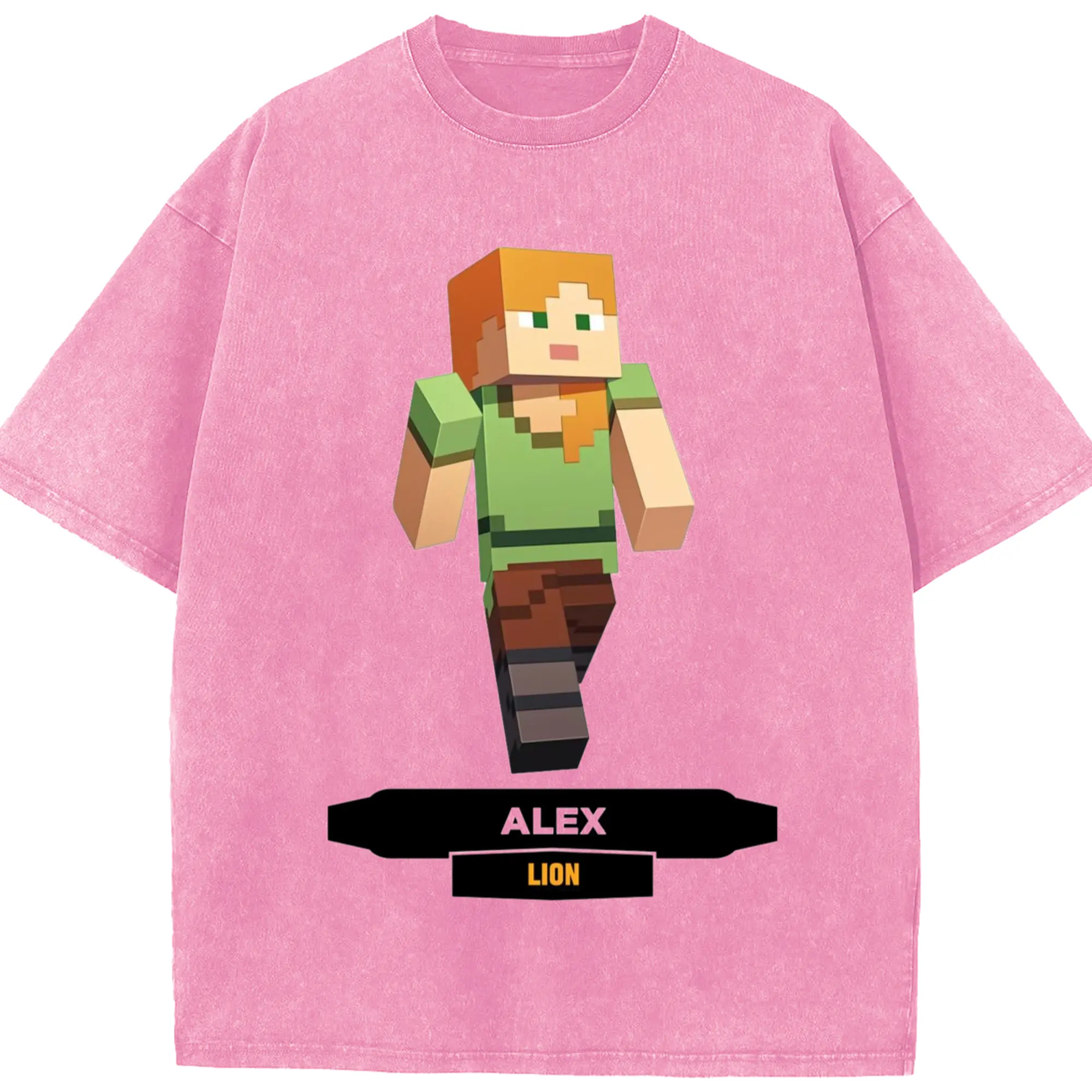 Minecraft alex t shirt - Washed Vintage Look 230g Cotton Oversized T-Shirt With Front Heat Transfer Print – Soft, Lightweight, Stylish Fit – Comfortable Casual Wear For Sports & Everyday Use