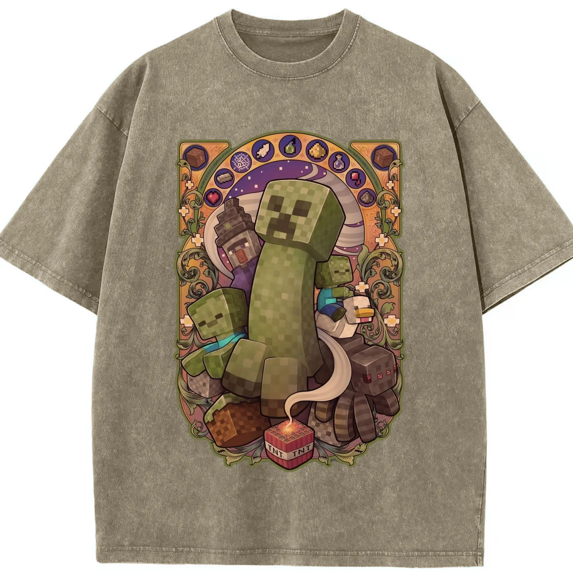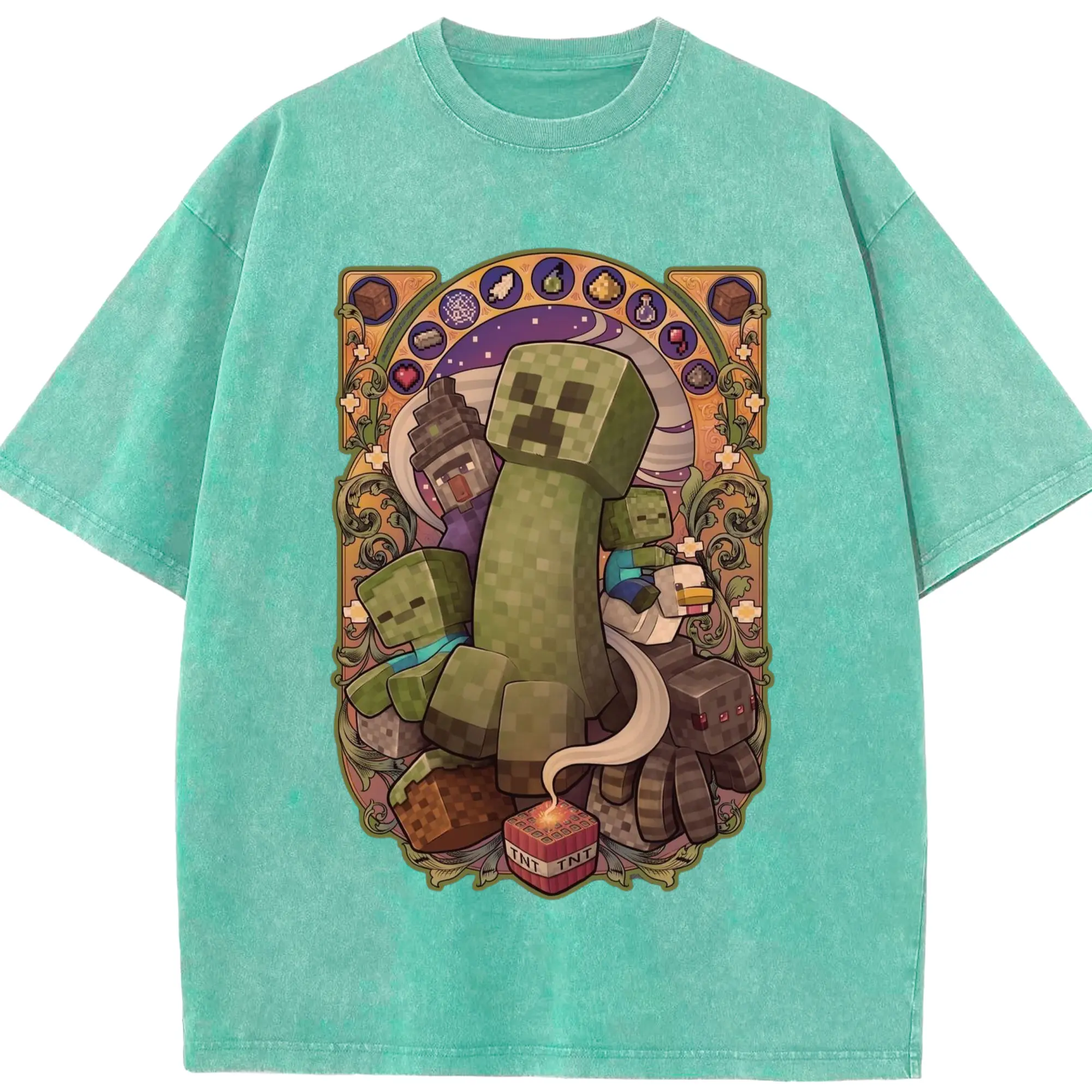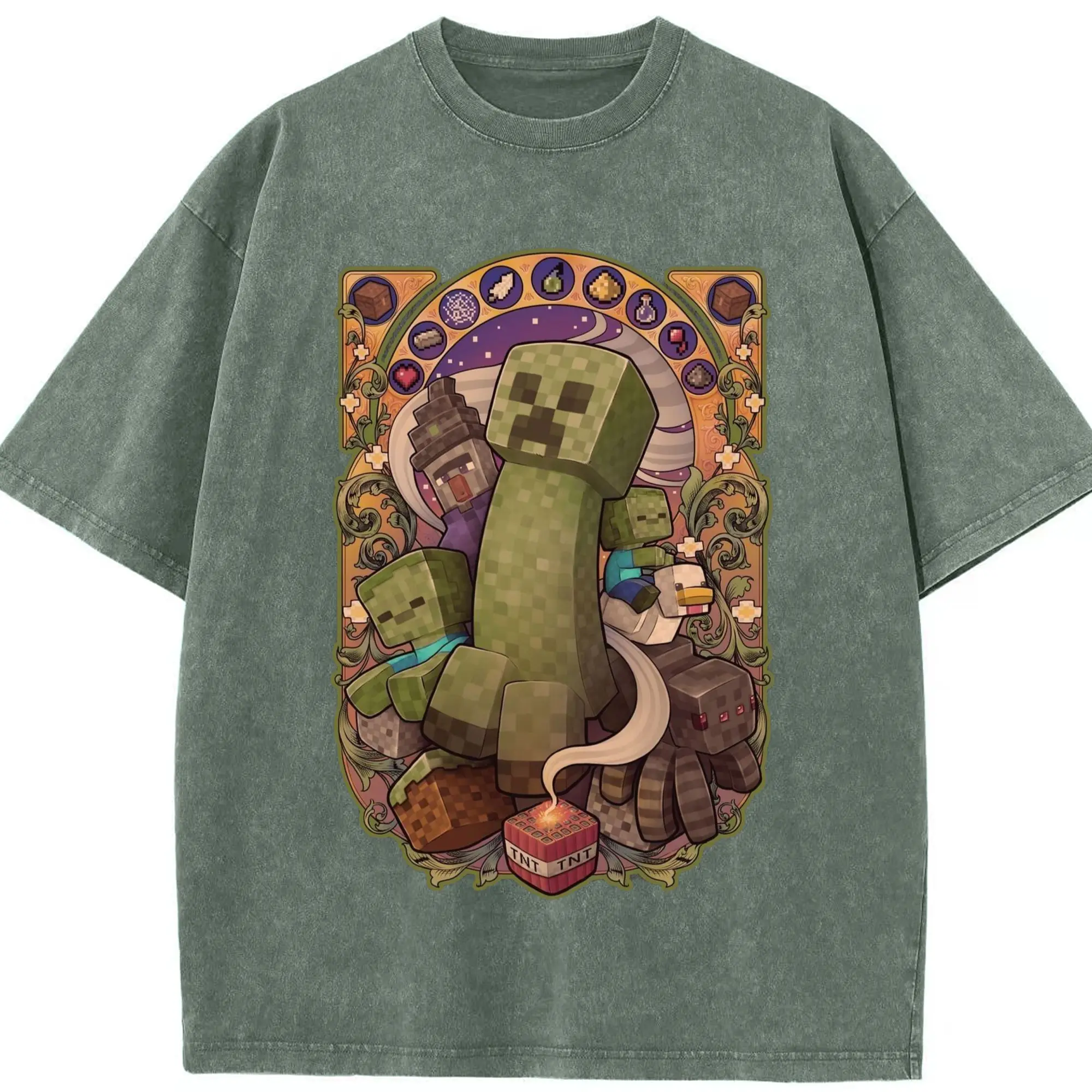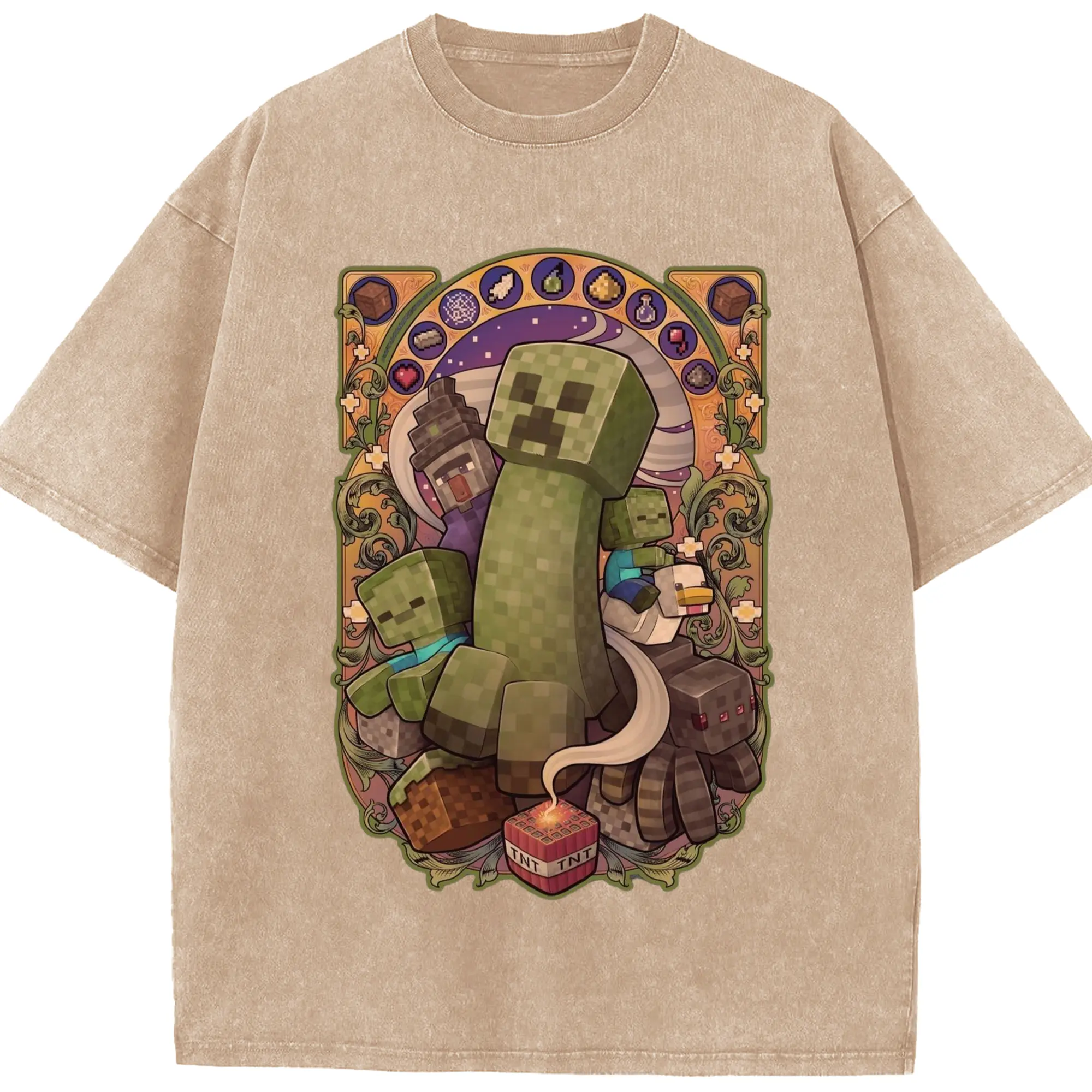 Minecraft Creeper art T-Shirt - Washed Vintage Look 230g Cotton Oversized T-Shirt With Front Heat Transfer Print – Soft, Lightweight, Stylish Fit – Comfortable Casual Wear For Sports & Everyday Use