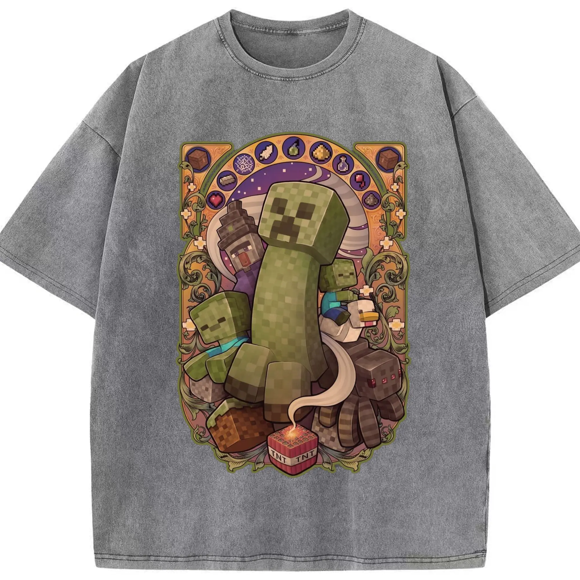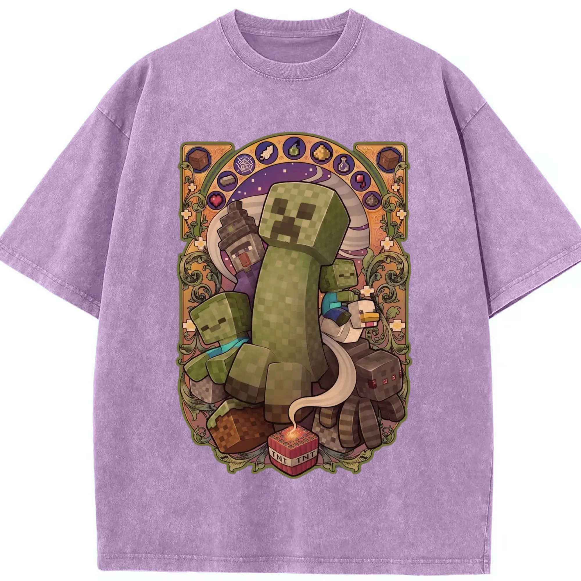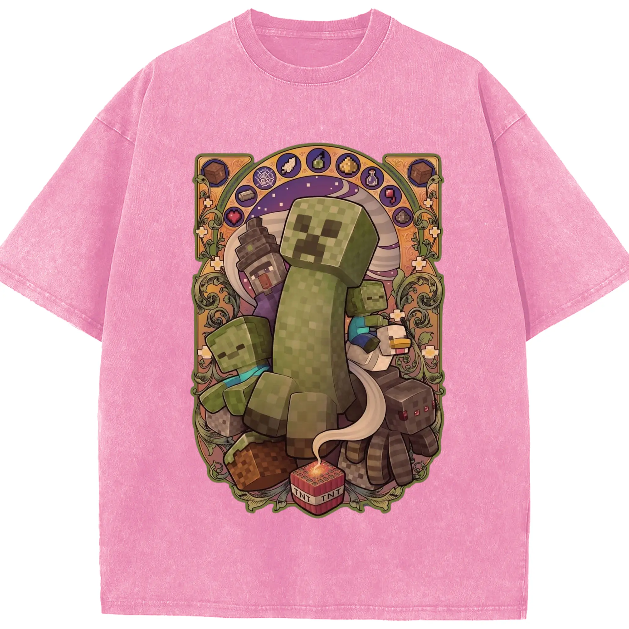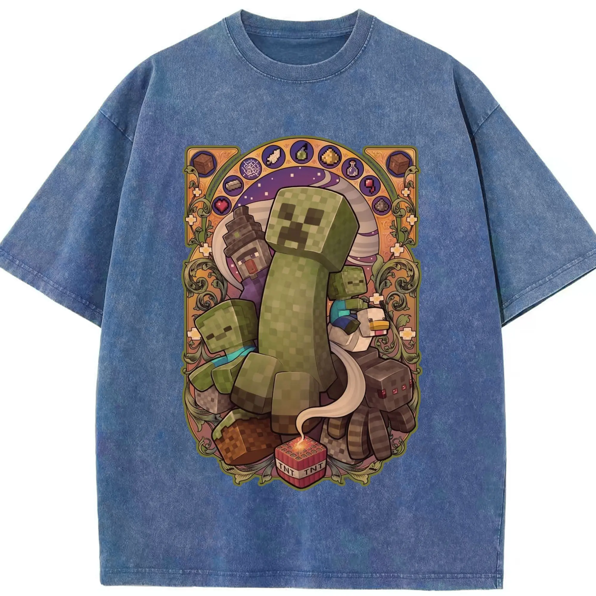 Minecraft Creeper art T-Shirt - Washed Vintage Look 230g Cotton Oversized T-Shirt With Front Heat Transfer Print – Soft, Lightweight, Stylish Fit – Comfortable Casual Wear For Sports & Everyday Use