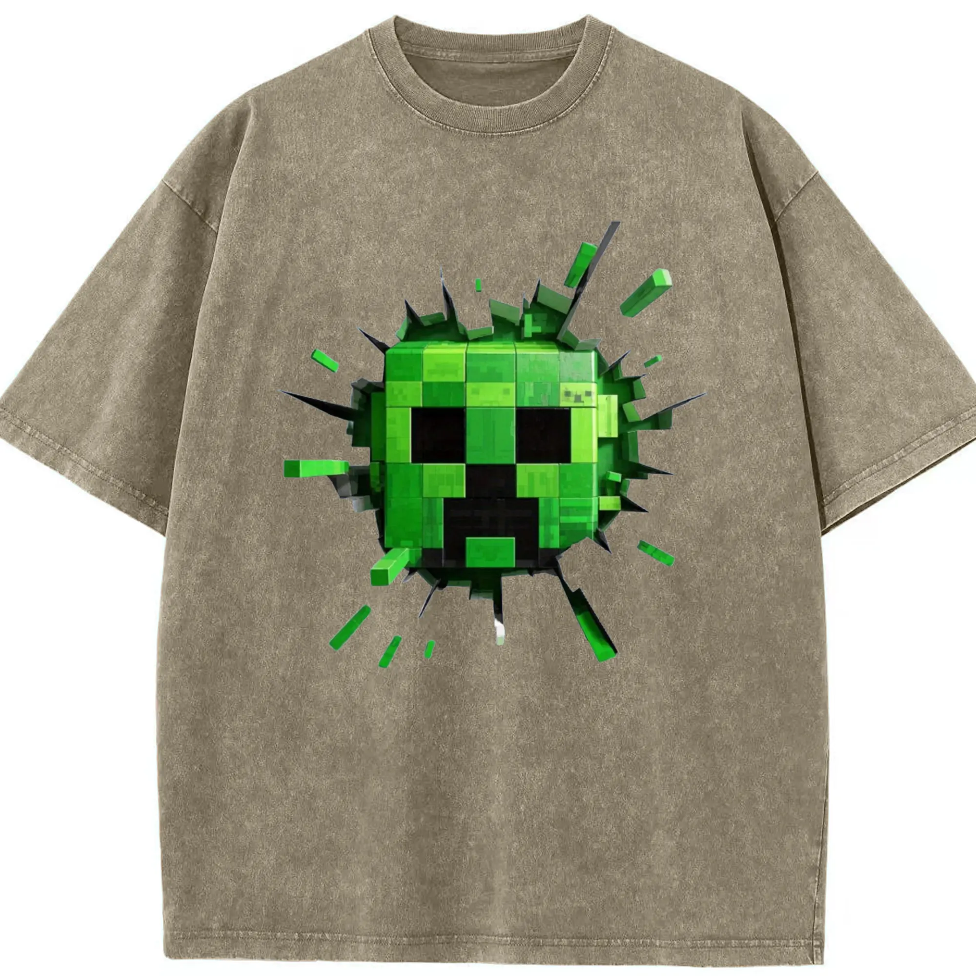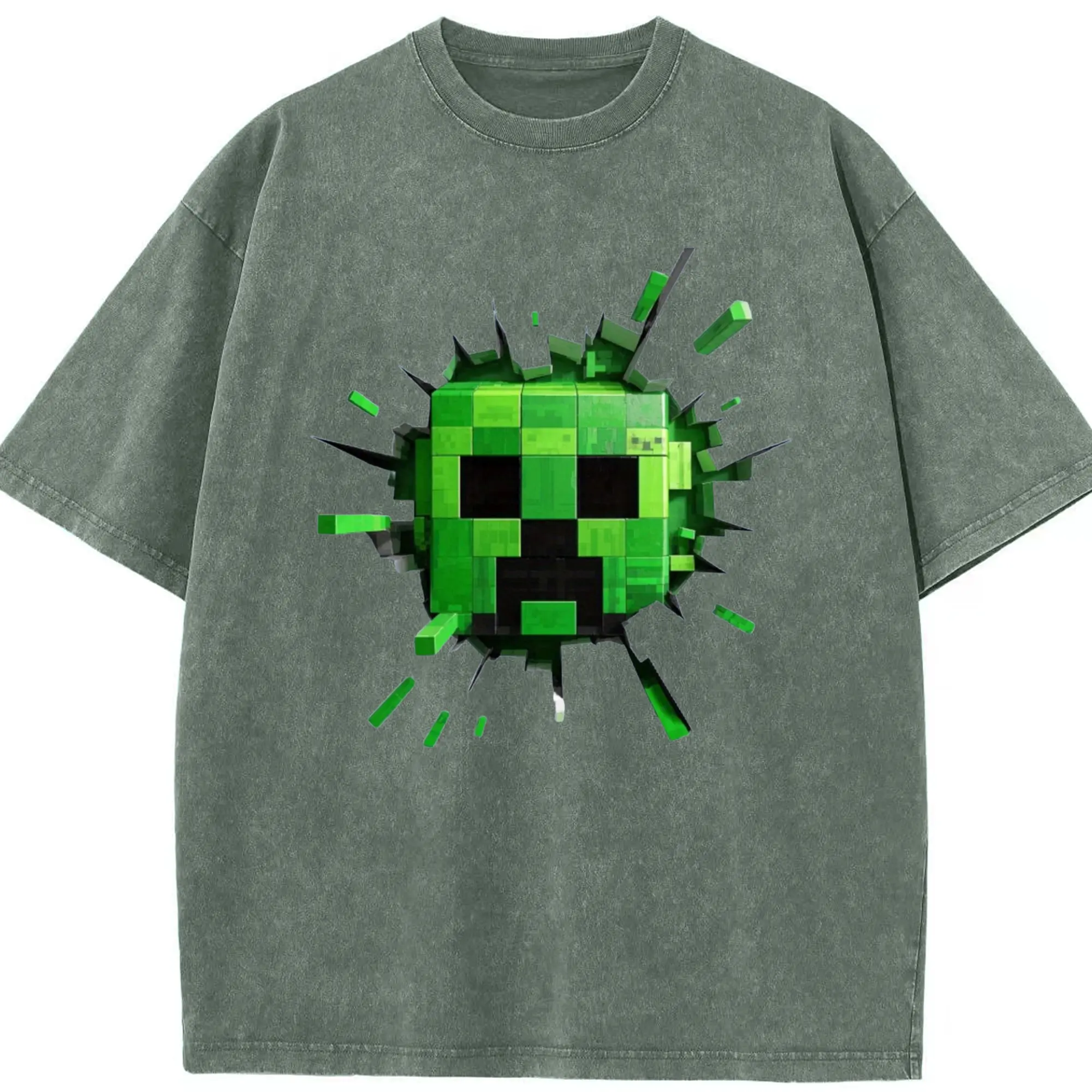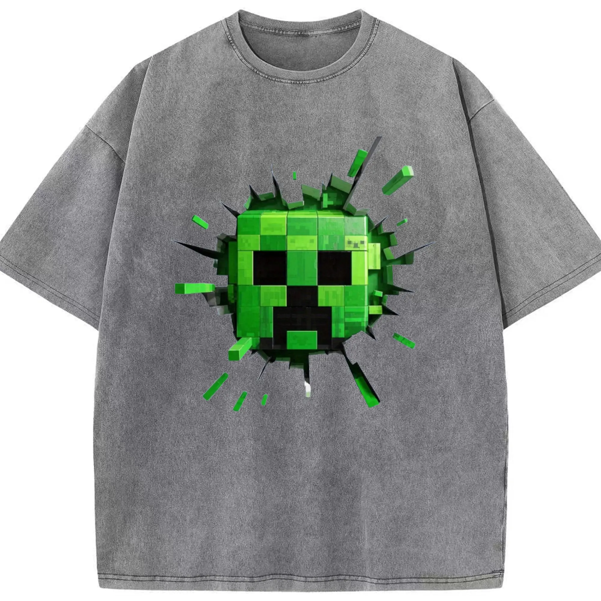 Minecraft Creeper Classic T-Shirt - Washed Vintage Look 230g Cotton Oversized T-Shirt With Front Heat Transfer Print – Soft, Lightweight, Stylish Fit – Comfortable Casual Wear For Sports & Everyday Use