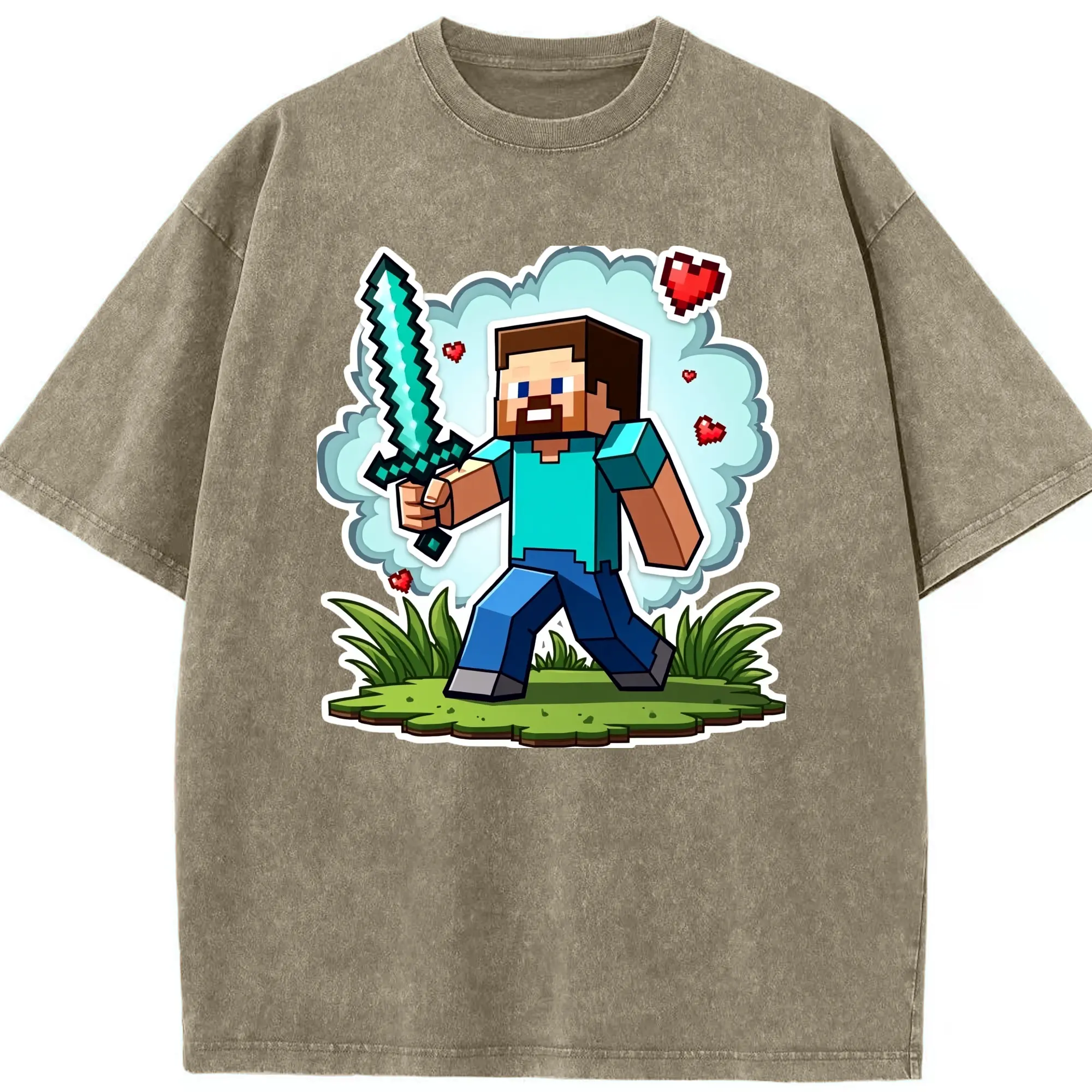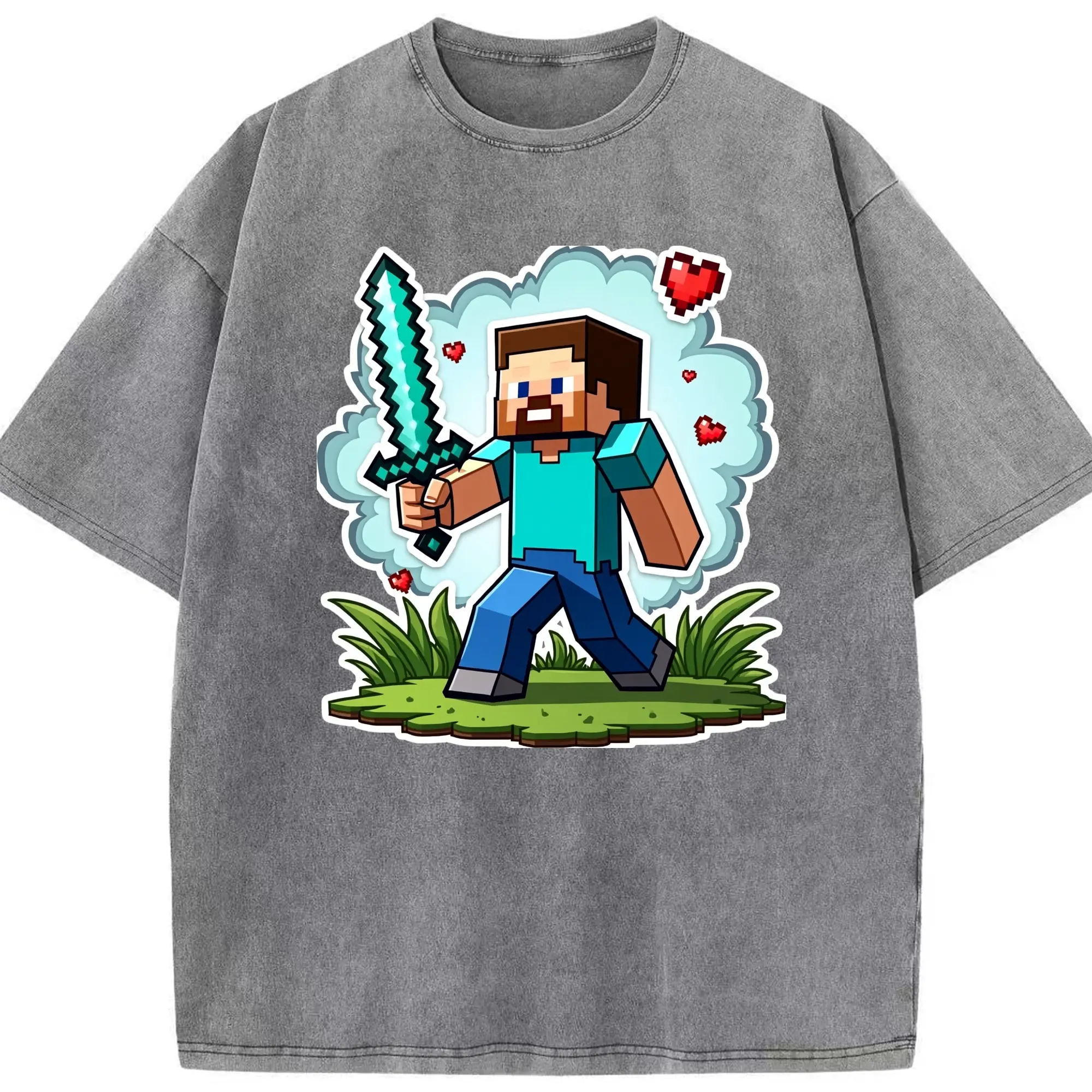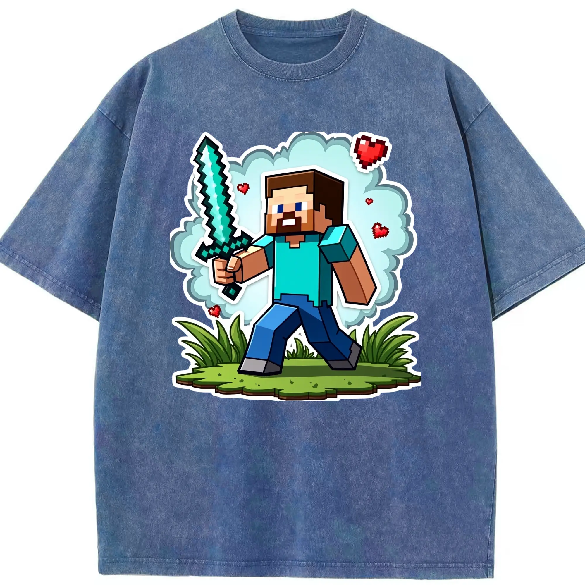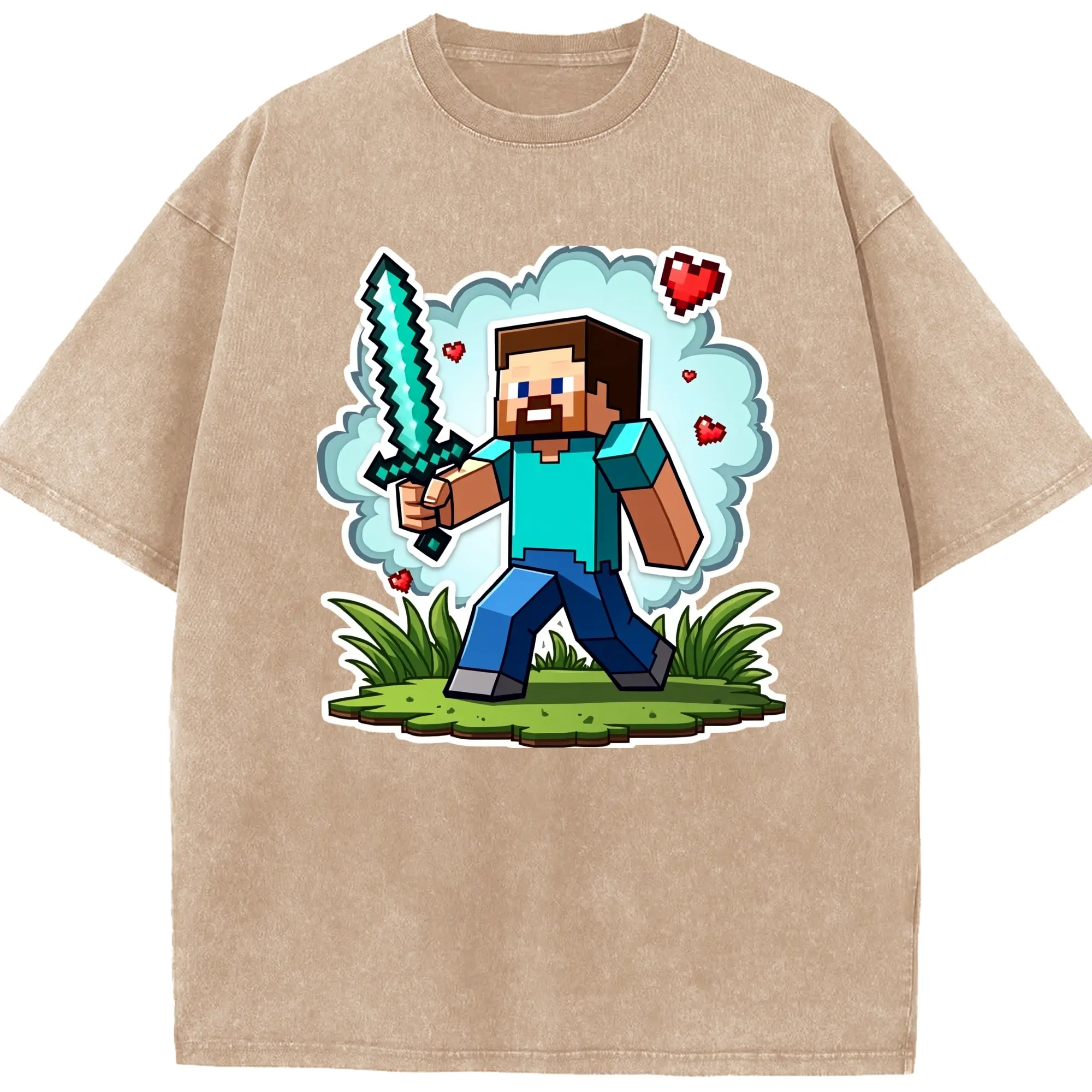 Minecraft steve art t-shirt - Washed Vintage Look 230g Cotton Oversized T-Shirt With Front Heat Transfer Print – Soft, Lightweight, Stylish Fit – Comfortable Casual Wear For Sports & Everyday Use