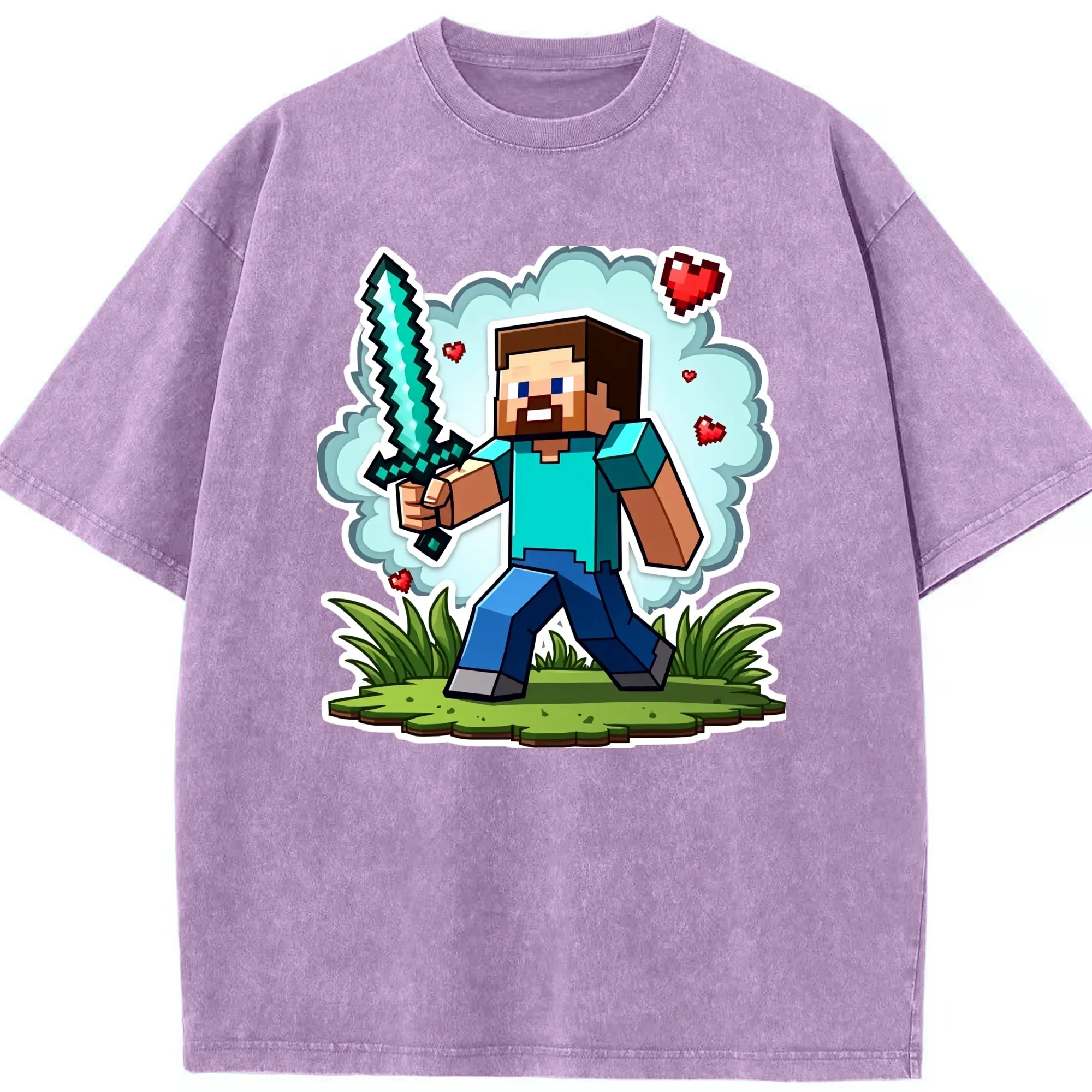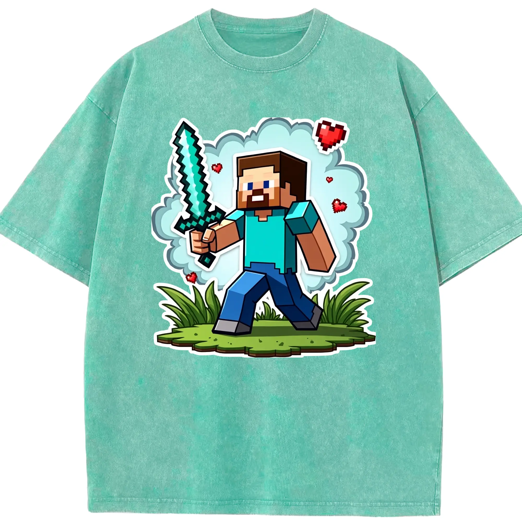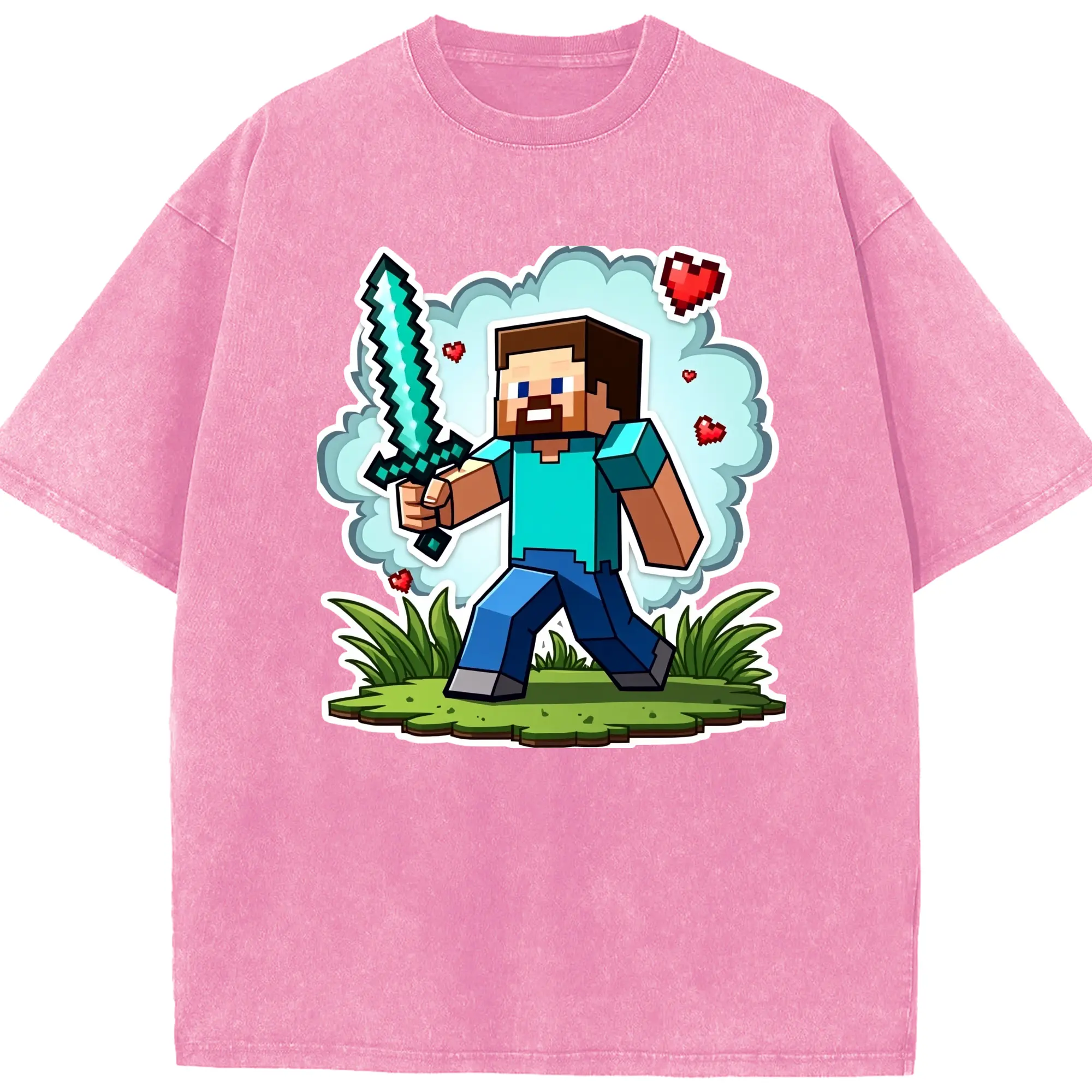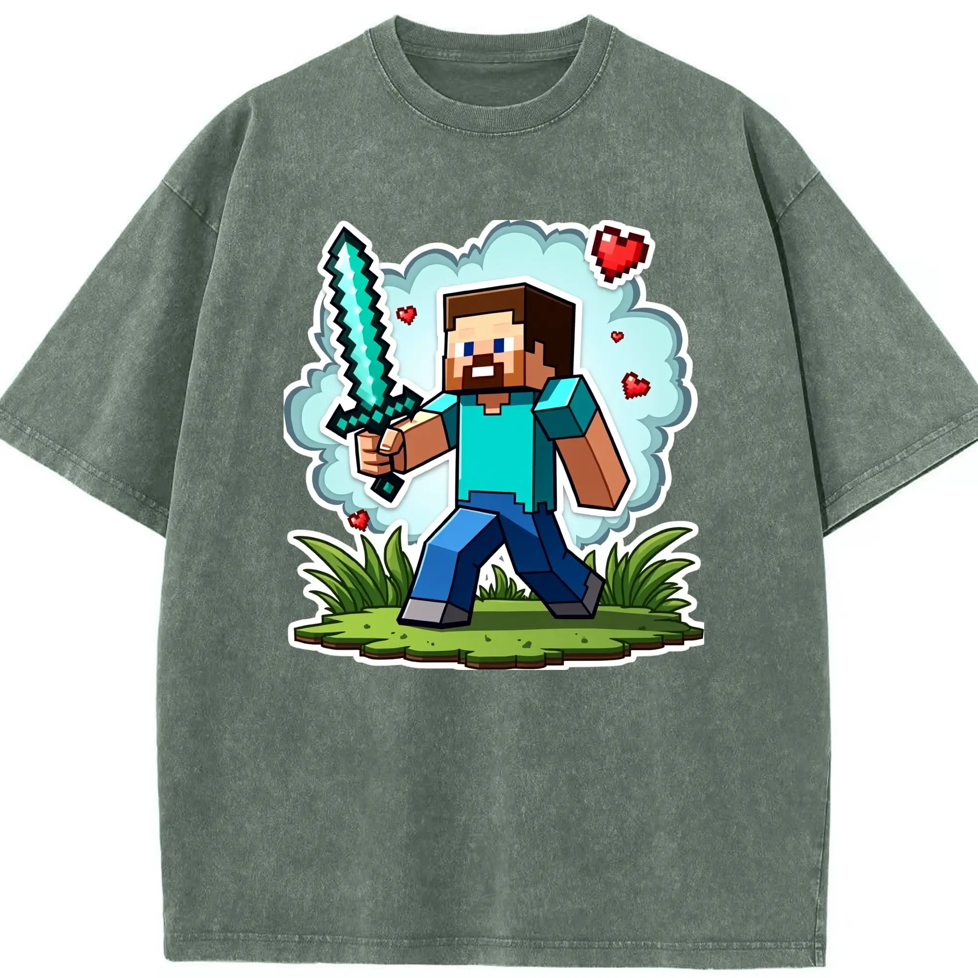 Minecraft steve art t-shirt - Washed Vintage Look 230g Cotton Oversized T-Shirt With Front Heat Transfer Print – Soft, Lightweight, Stylish Fit – Comfortable Casual Wear For Sports & Everyday Use