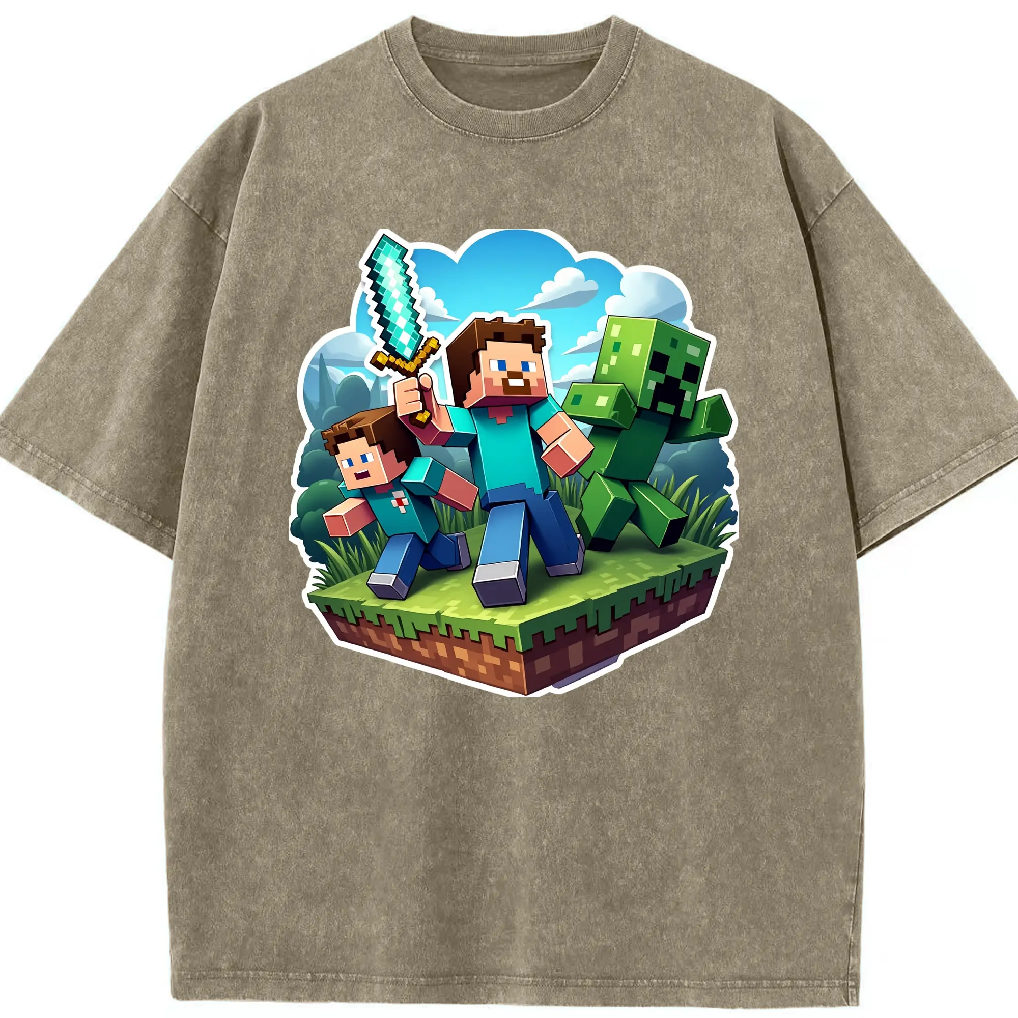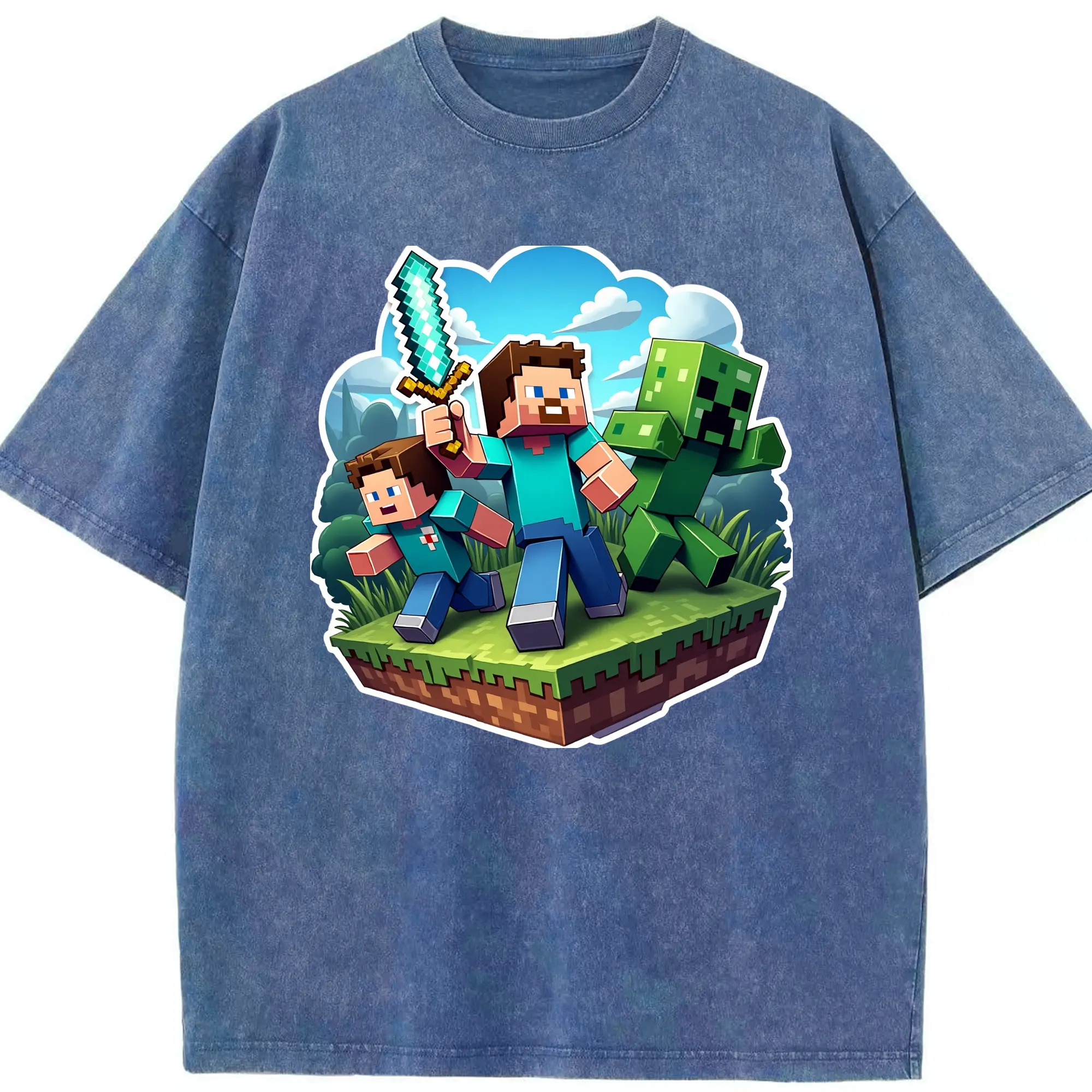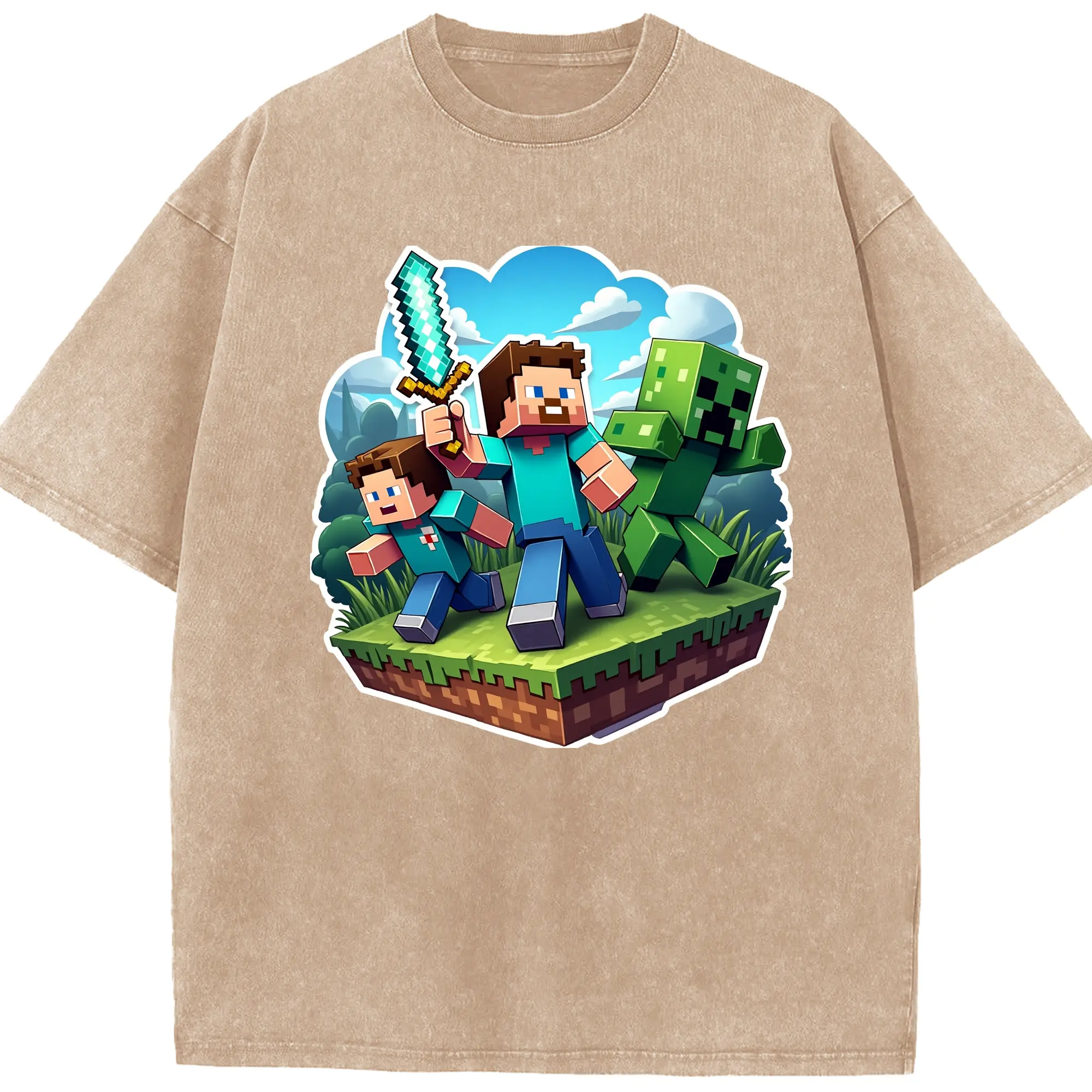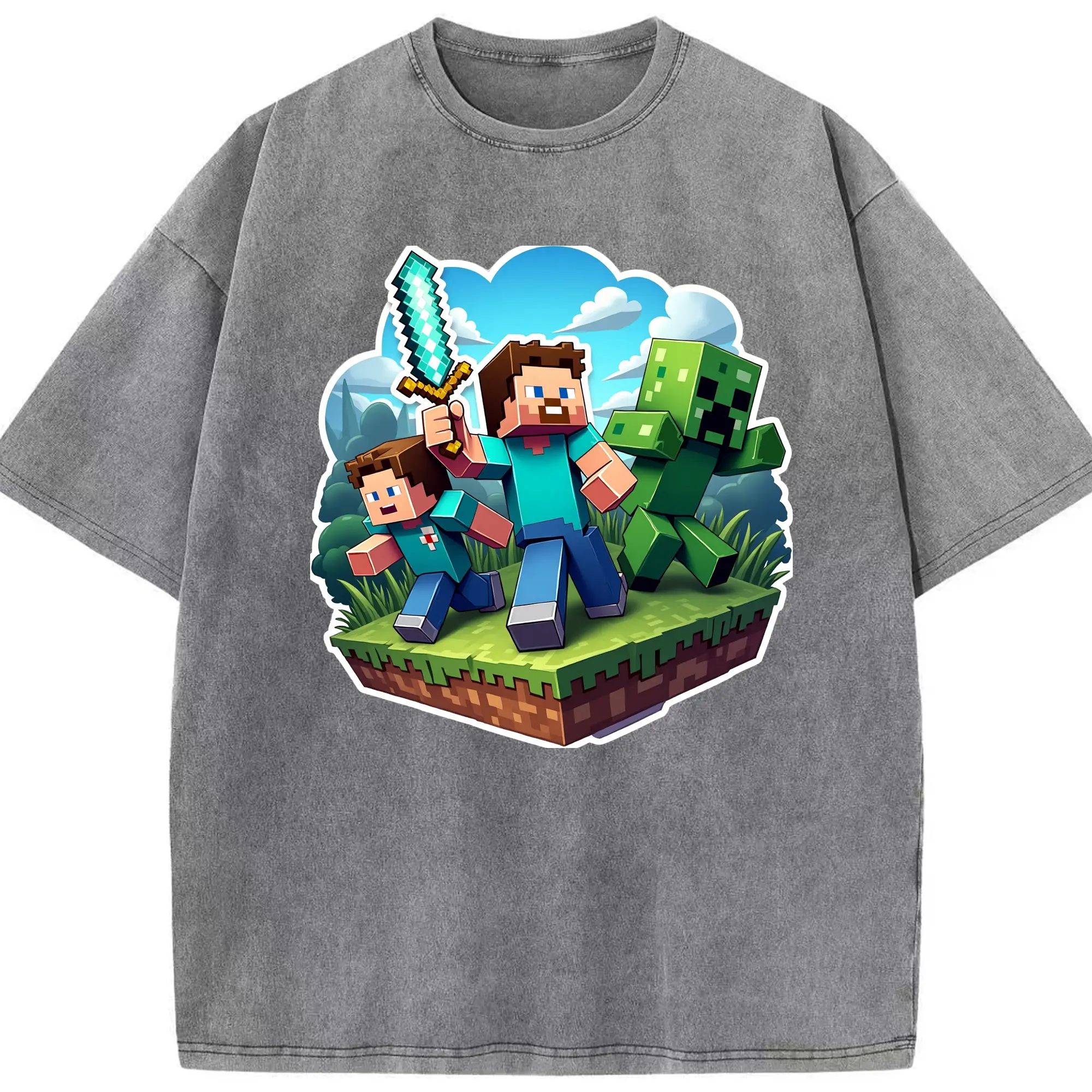 Minecraft steve shirt - Washed Vintage Look 230g Cotton Oversized T-Shirt With Front Heat Transfer Print – Soft, Lightweight, Stylish Fit – Comfortable Casual Wear For Sports & Everyday Use