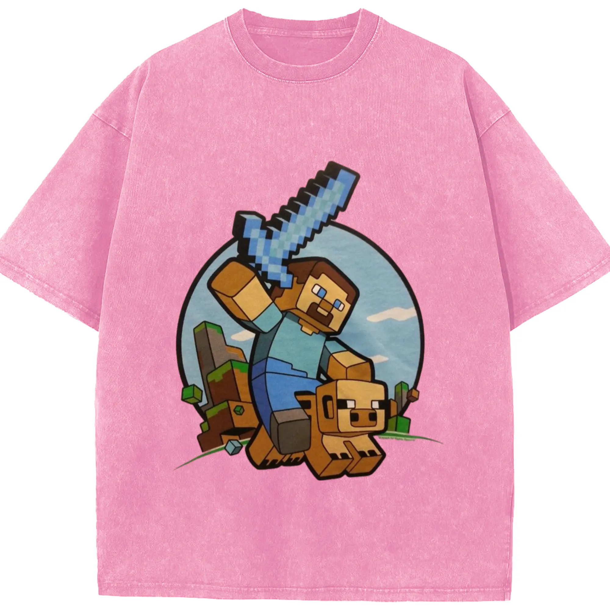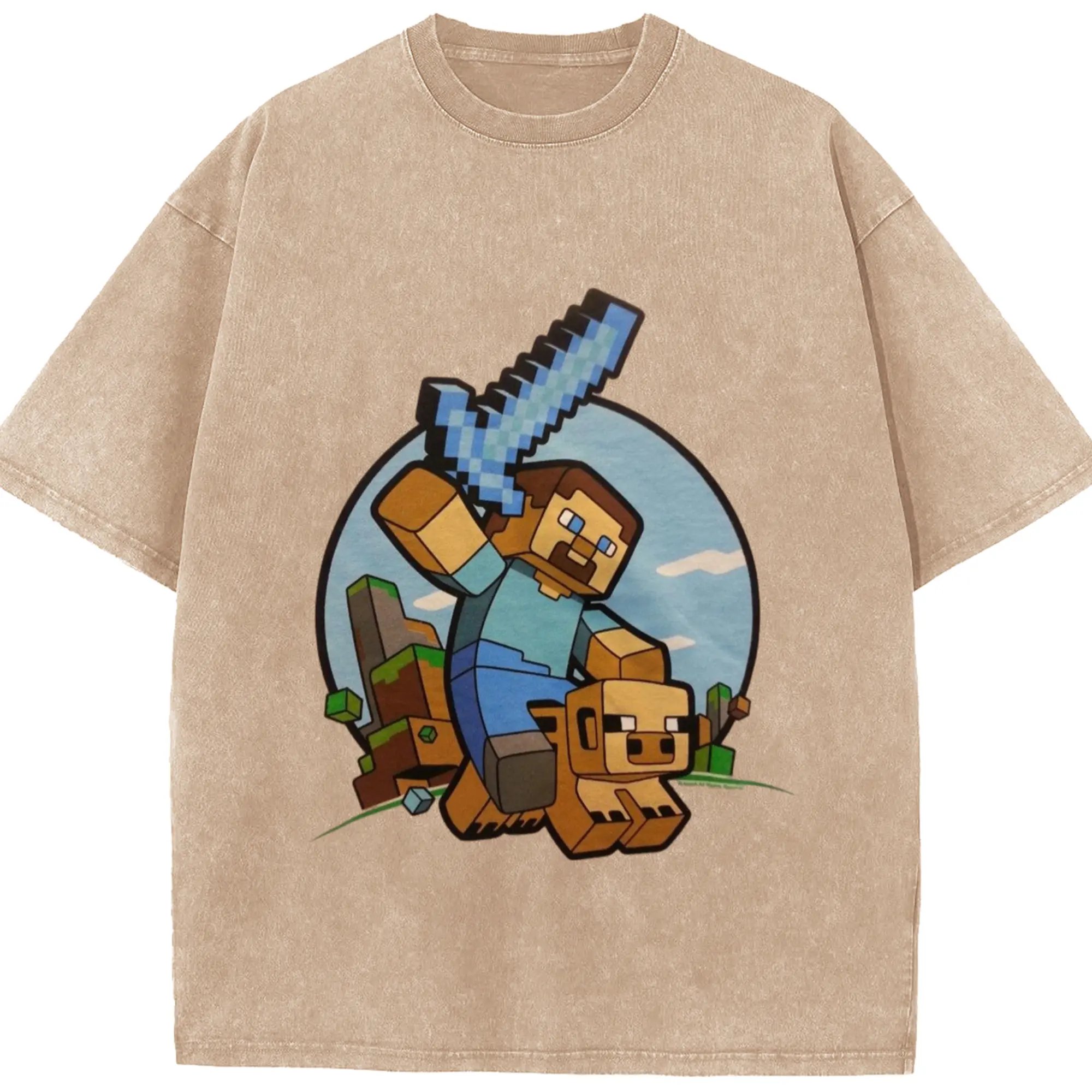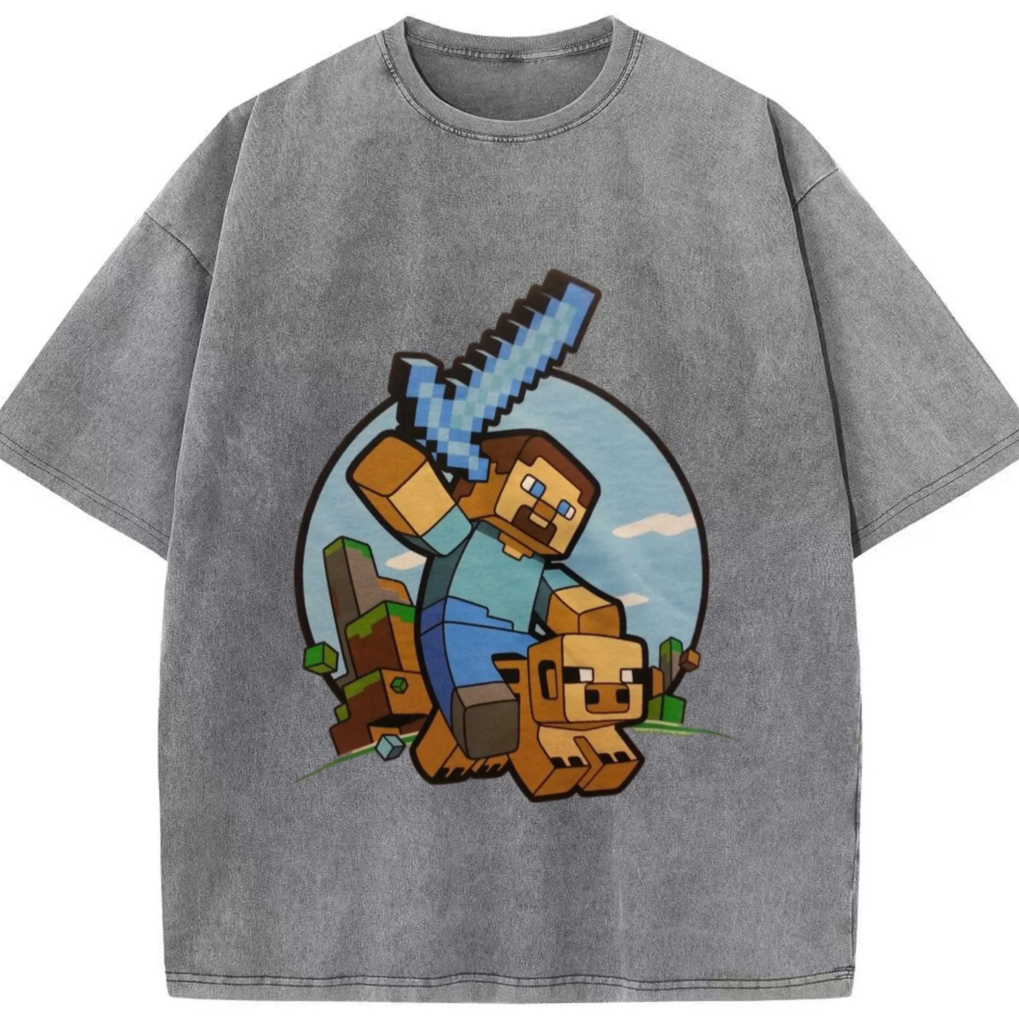 Minecraft steve tee shirt​ - Washed Vintage Look 230g Cotton Oversized T-Shirt With Front Heat Transfer Print – Soft, Lightweight, Stylish Fit – Comfortable Casual Wear For Sports & Everyday Use