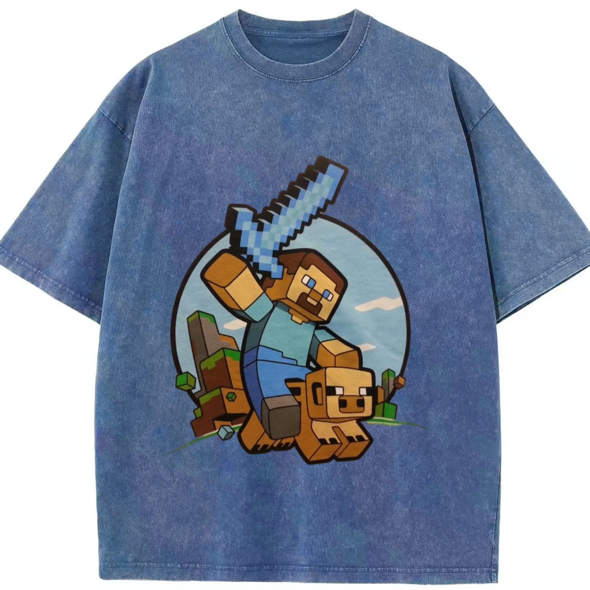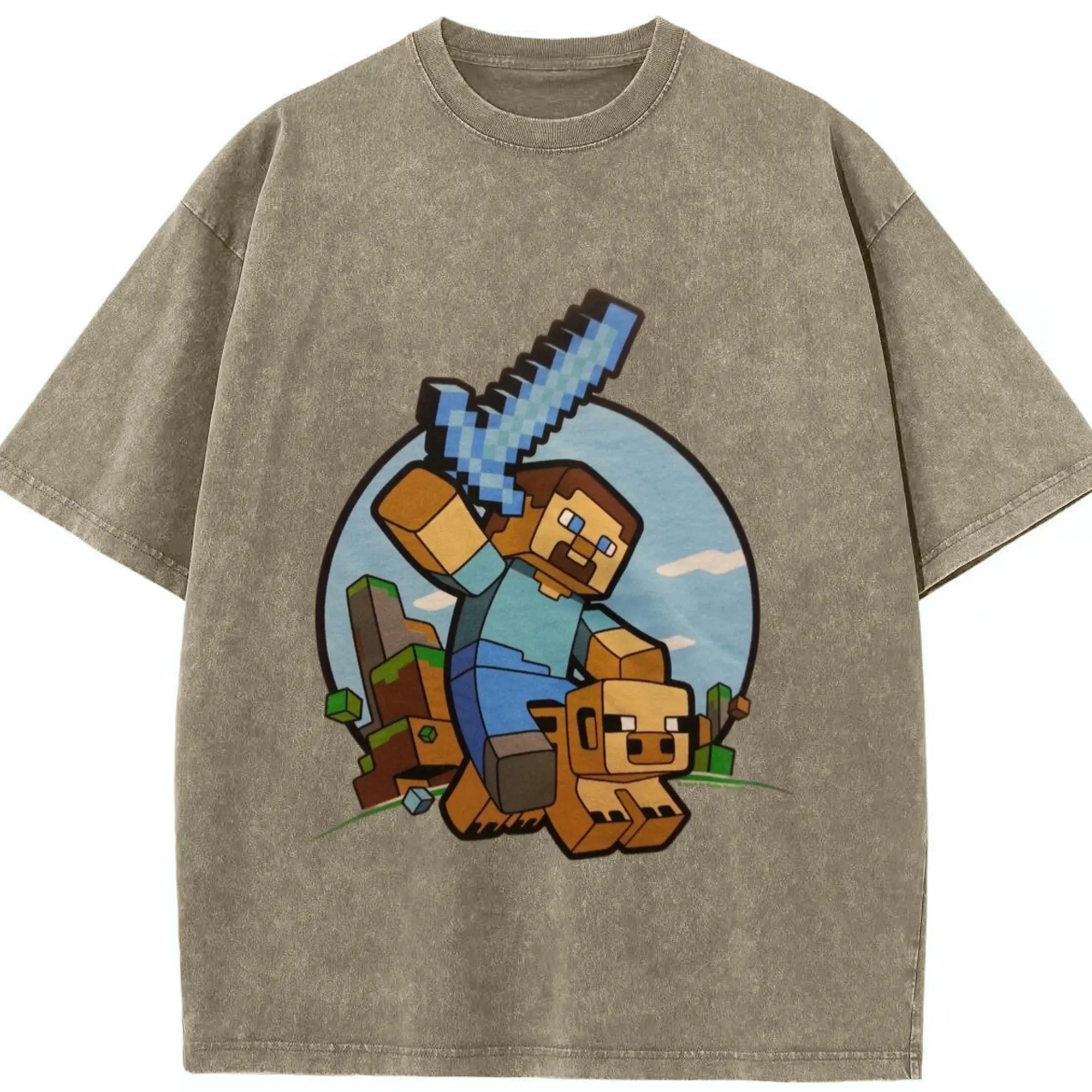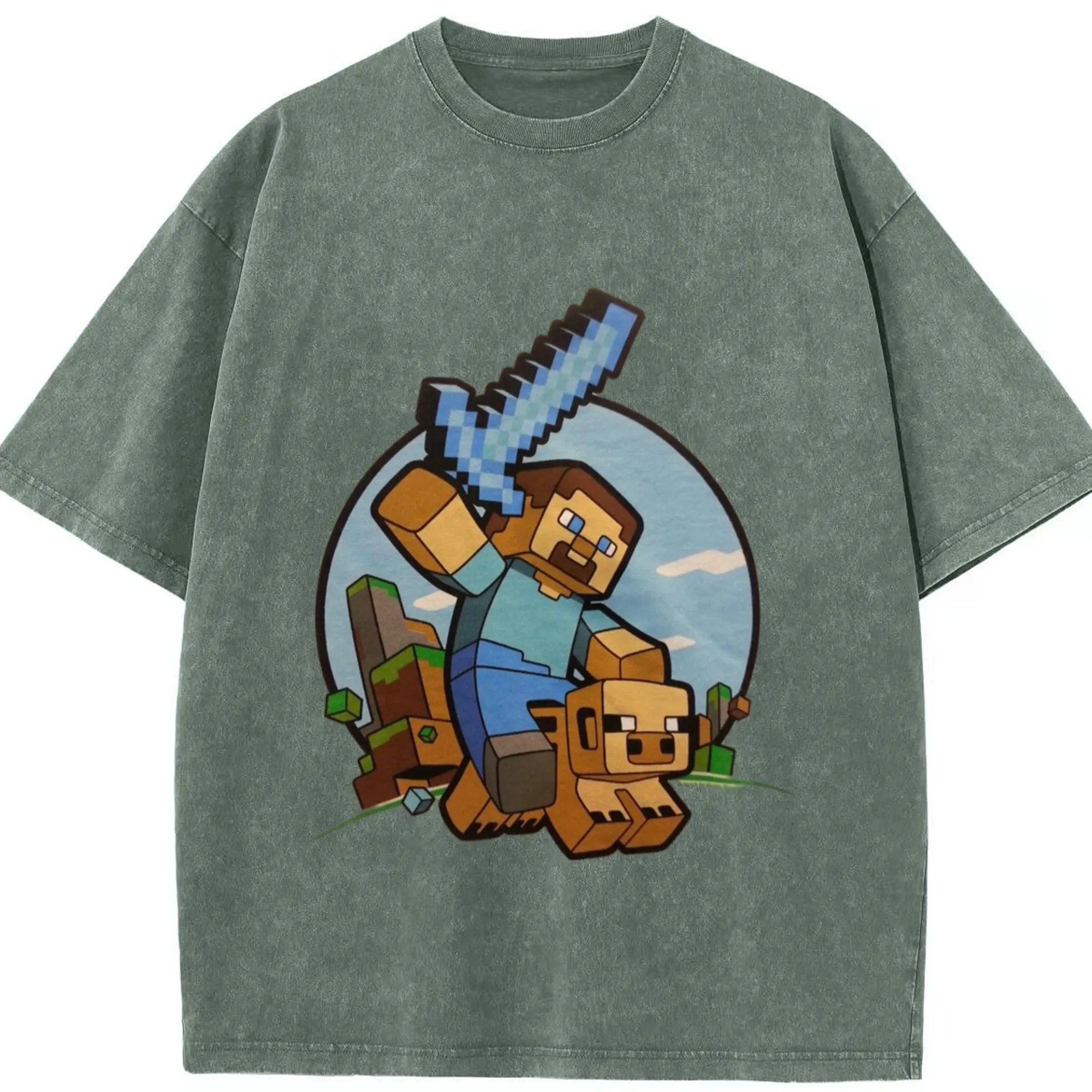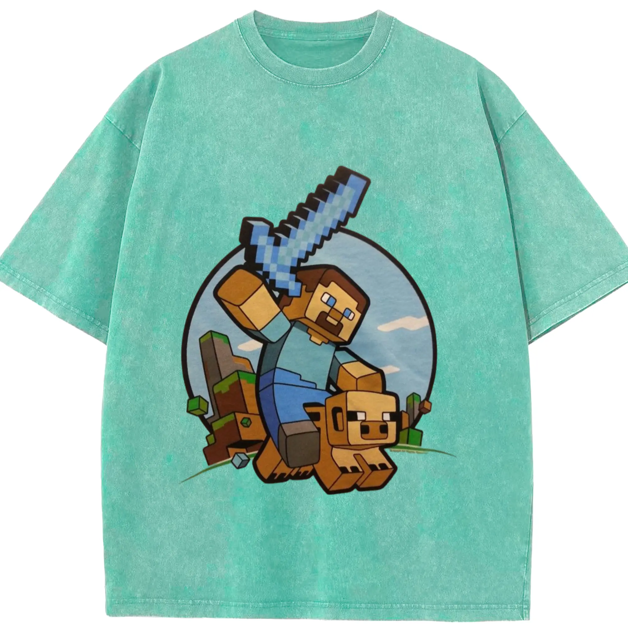 Minecraft steve tee shirt​ - Washed Vintage Look 230g Cotton Oversized T-Shirt With Front Heat Transfer Print – Soft, Lightweight, Stylish Fit – Comfortable Casual Wear For Sports & Everyday Use