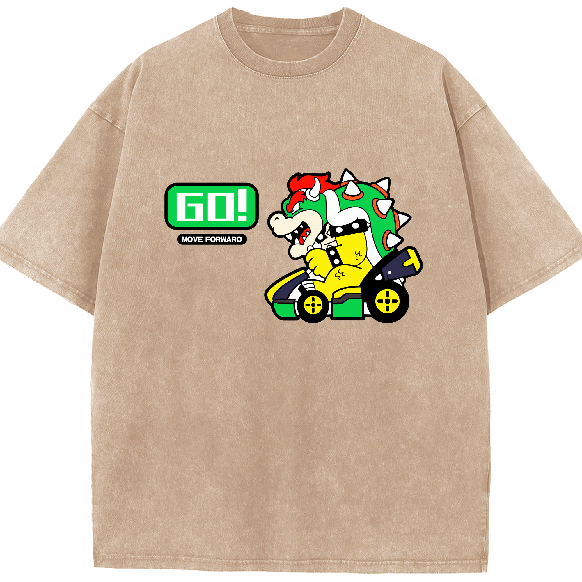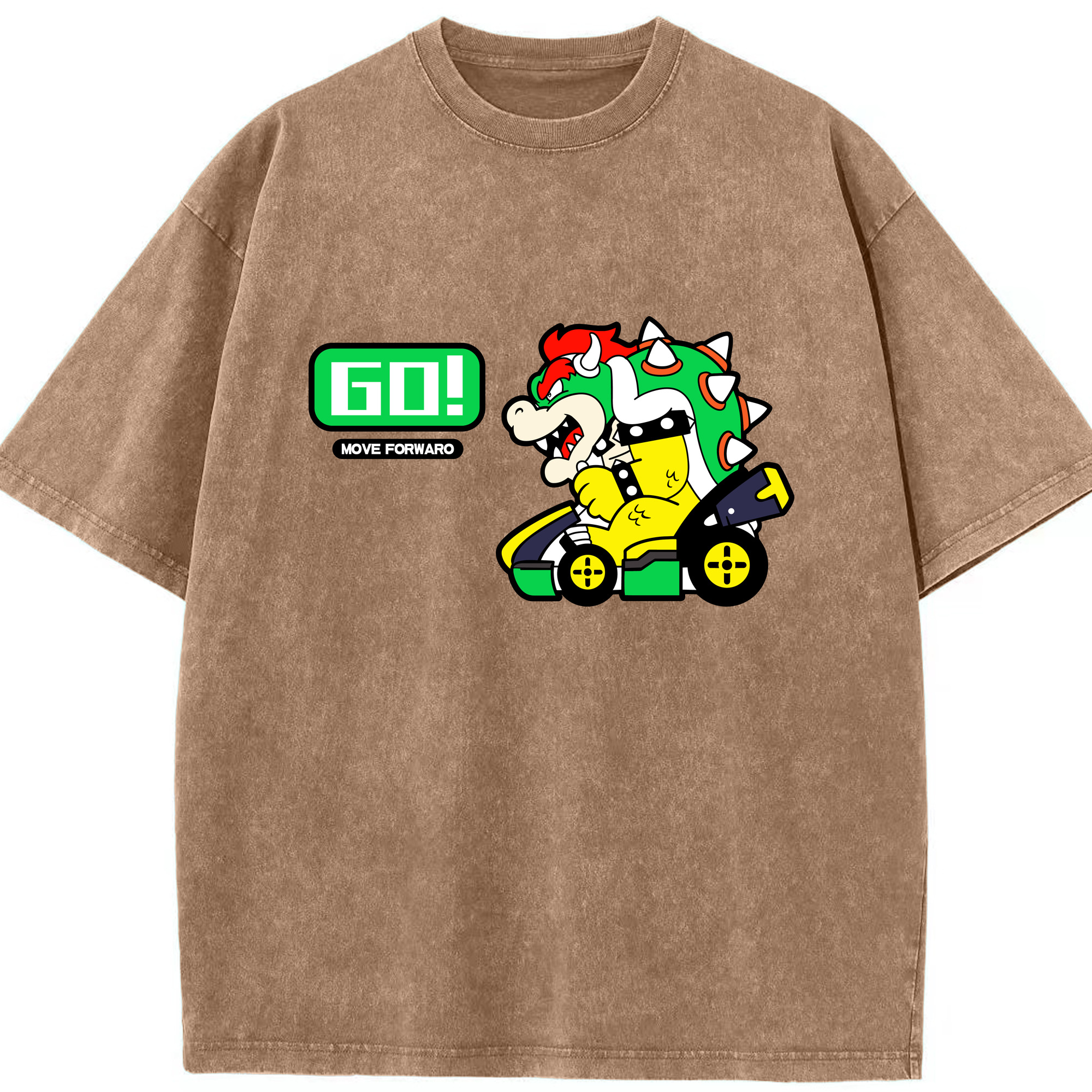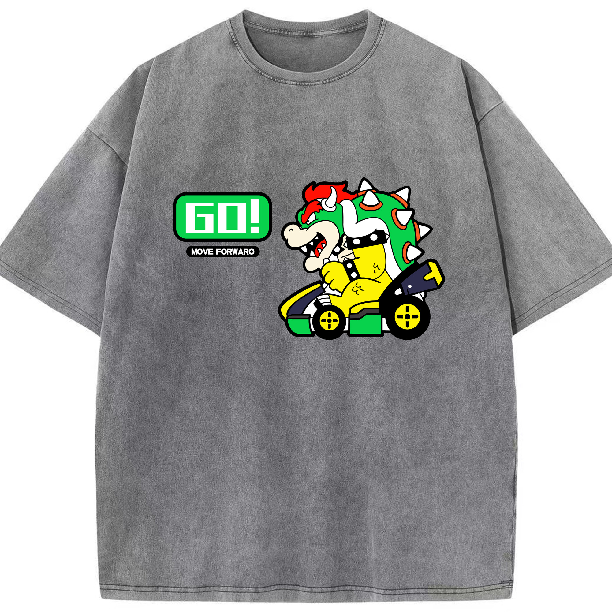 Nintendo King Koopa 'GO!'kart T-shirt - Washed Vintage Look 230g Cotton Oversized T-Shirt With Front Heat Transfer Print – Soft, Lightweight, Stylish Fit – Comfortable Casual Wear For Sports & Everyday Use