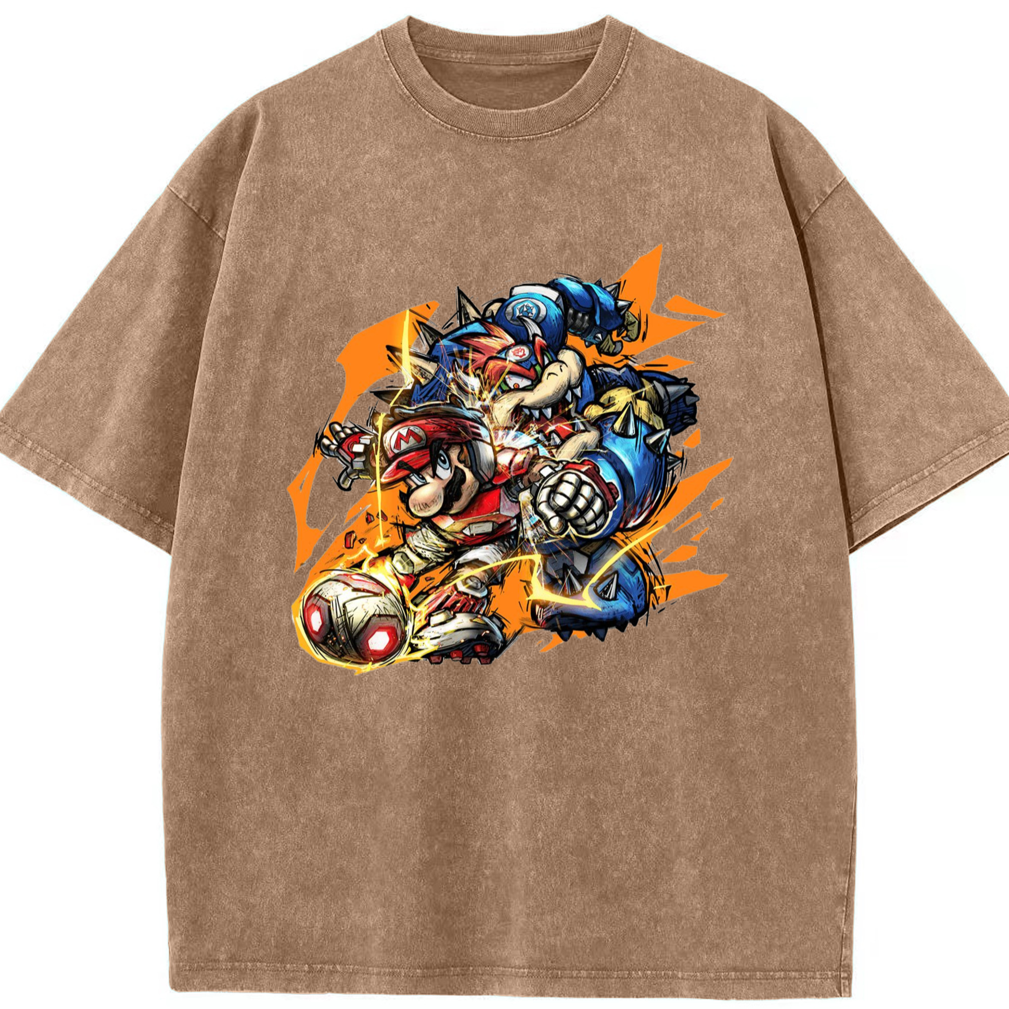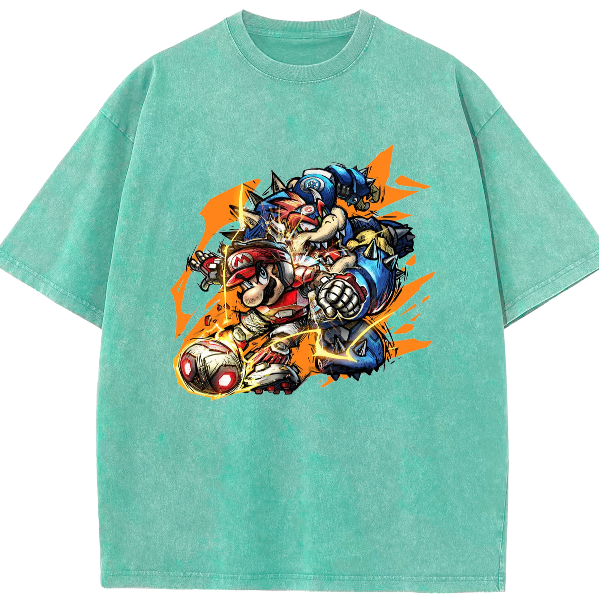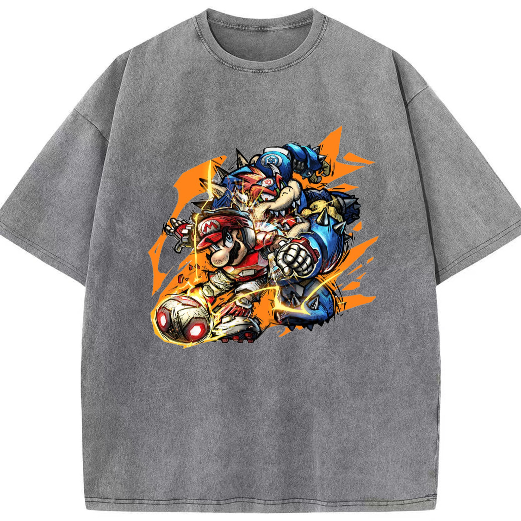 Nintendo King Koopa and mario football T-shirt - Washed Vintage Look 230g Cotton Oversized T-Shirt With Front Heat Transfer Print – Soft, Lightweight, Stylish Fit – Comfortable Casual Wear For Sports & Everyday Use