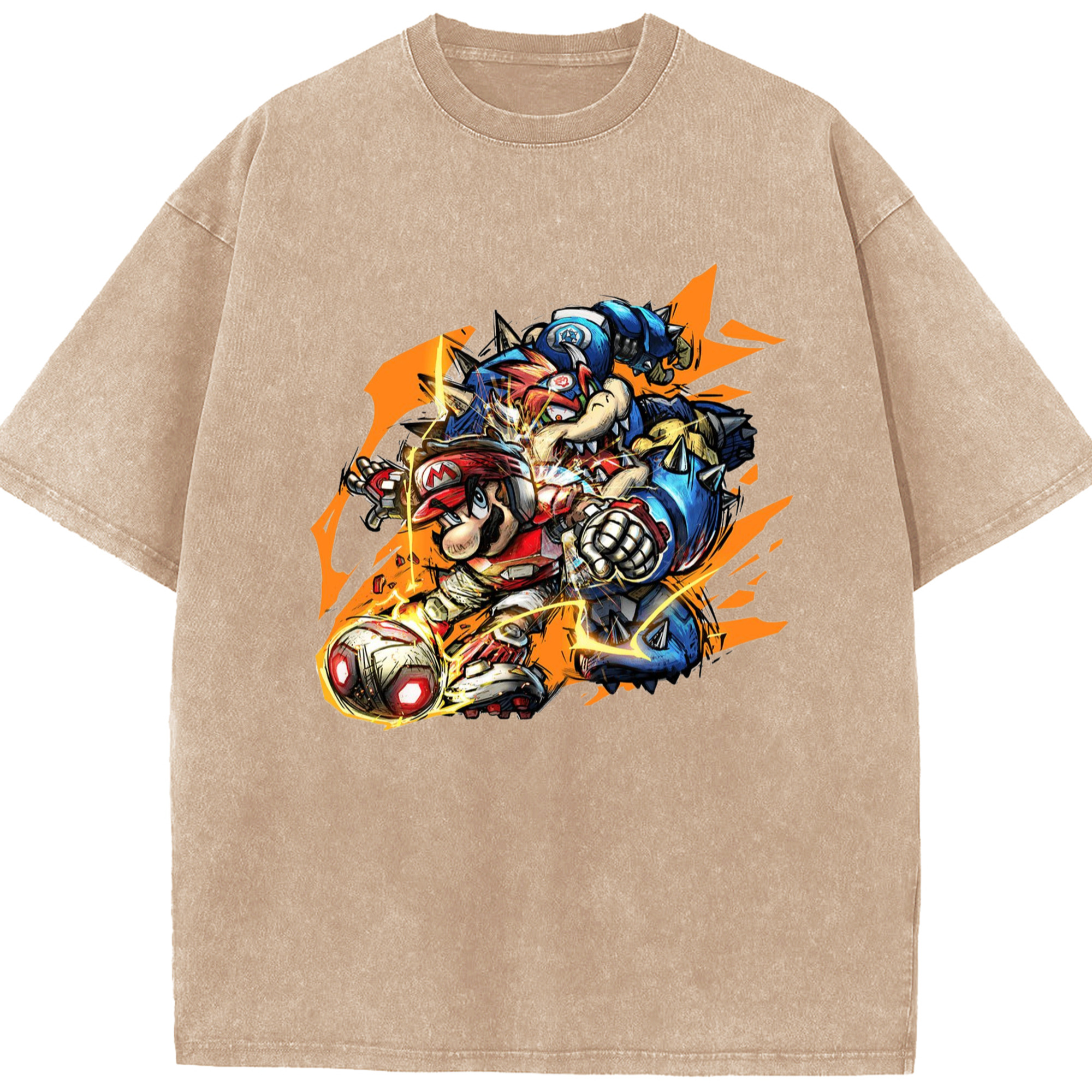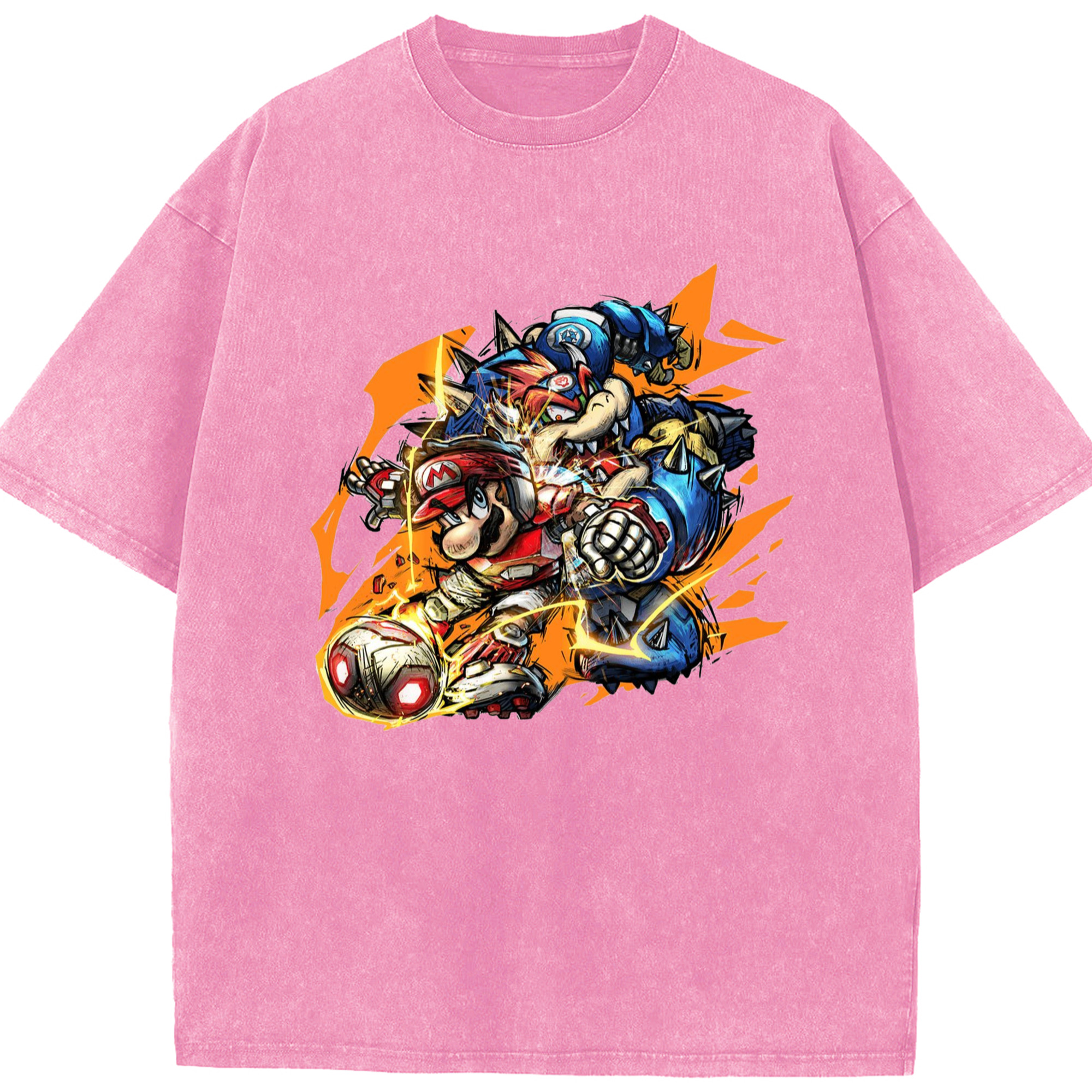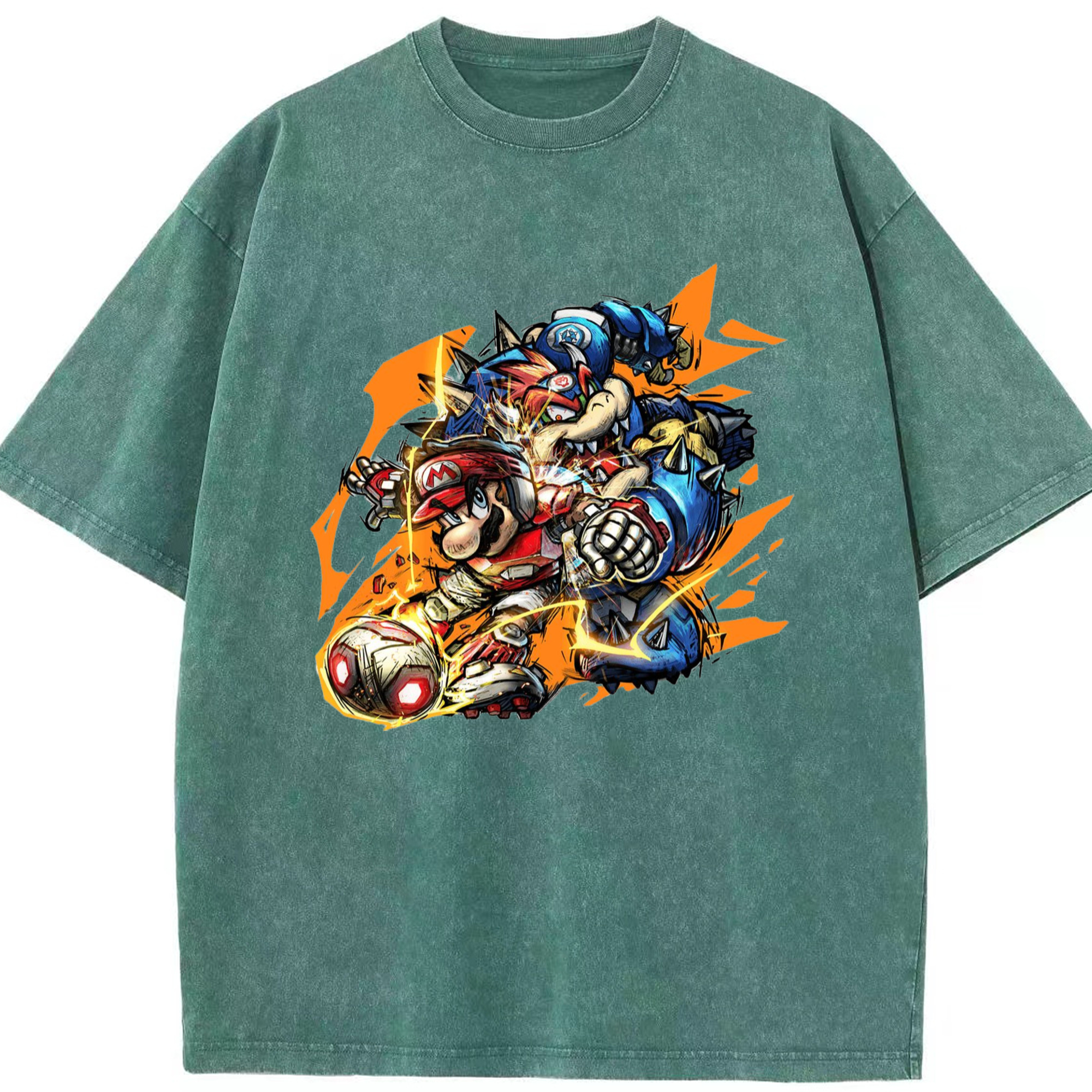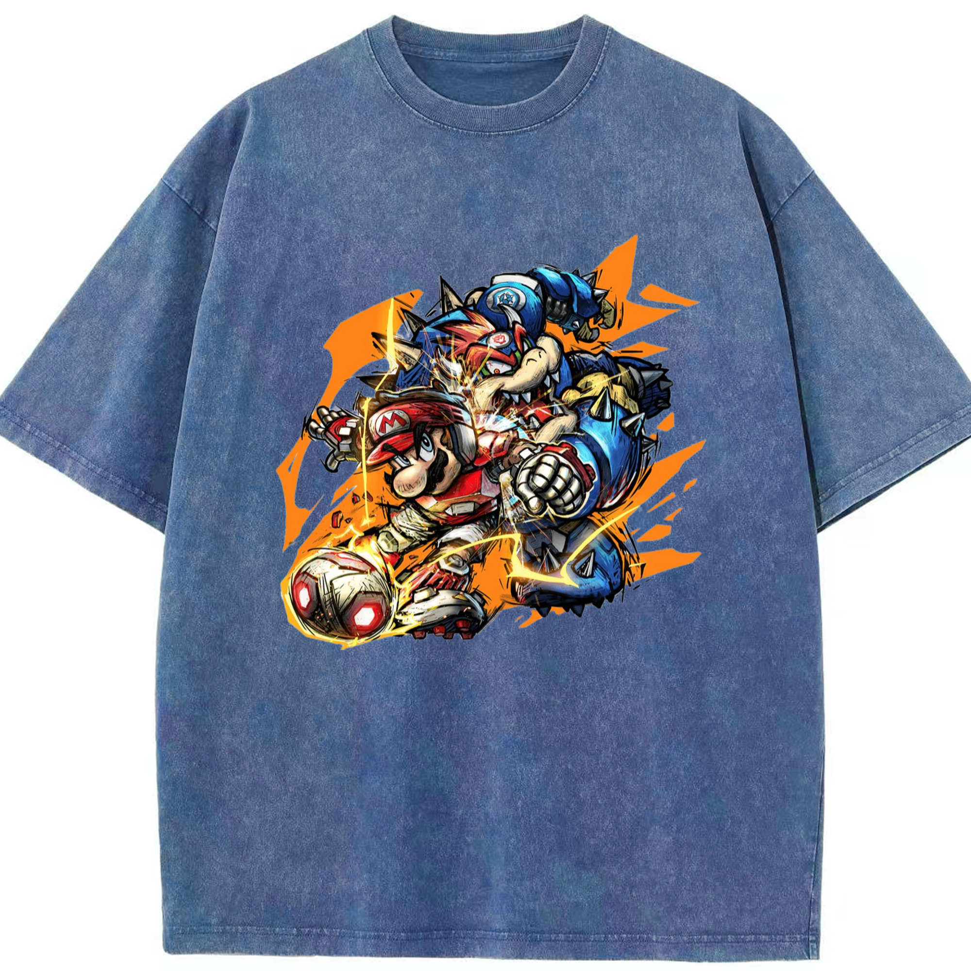 Nintendo King Koopa and mario football T-shirt - Washed Vintage Look 230g Cotton Oversized T-Shirt With Front Heat Transfer Print – Soft, Lightweight, Stylish Fit – Comfortable Casual Wear For Sports & Everyday Use