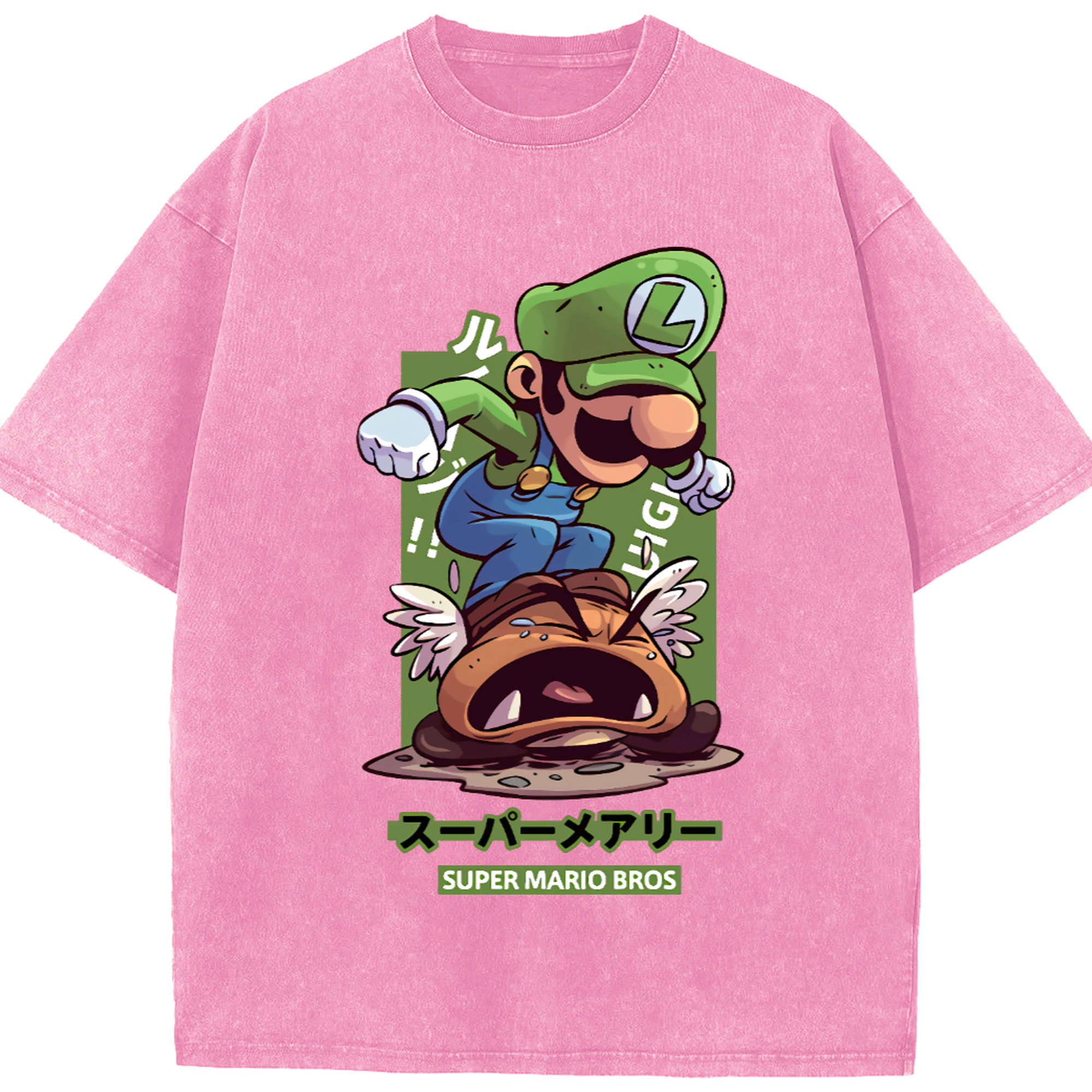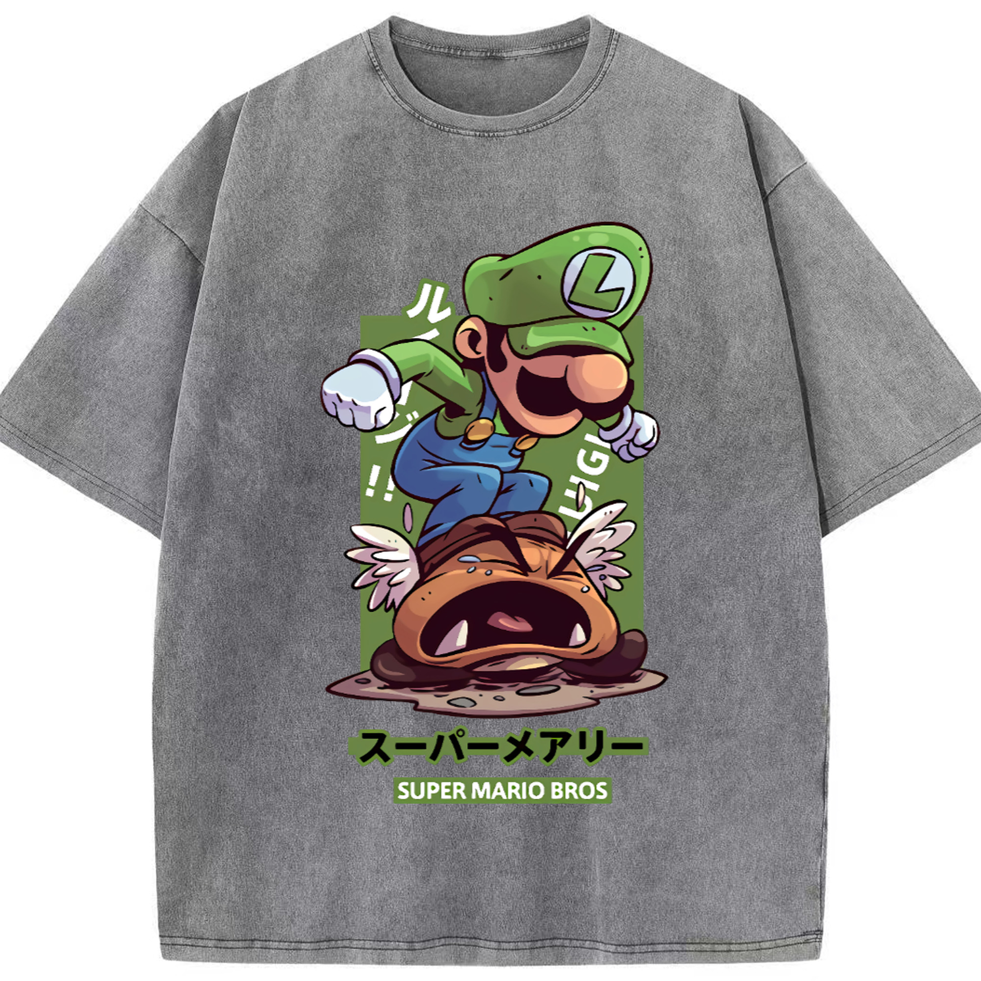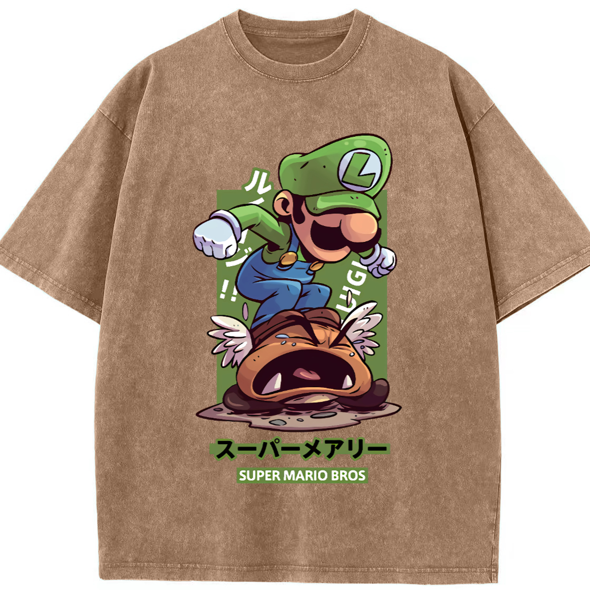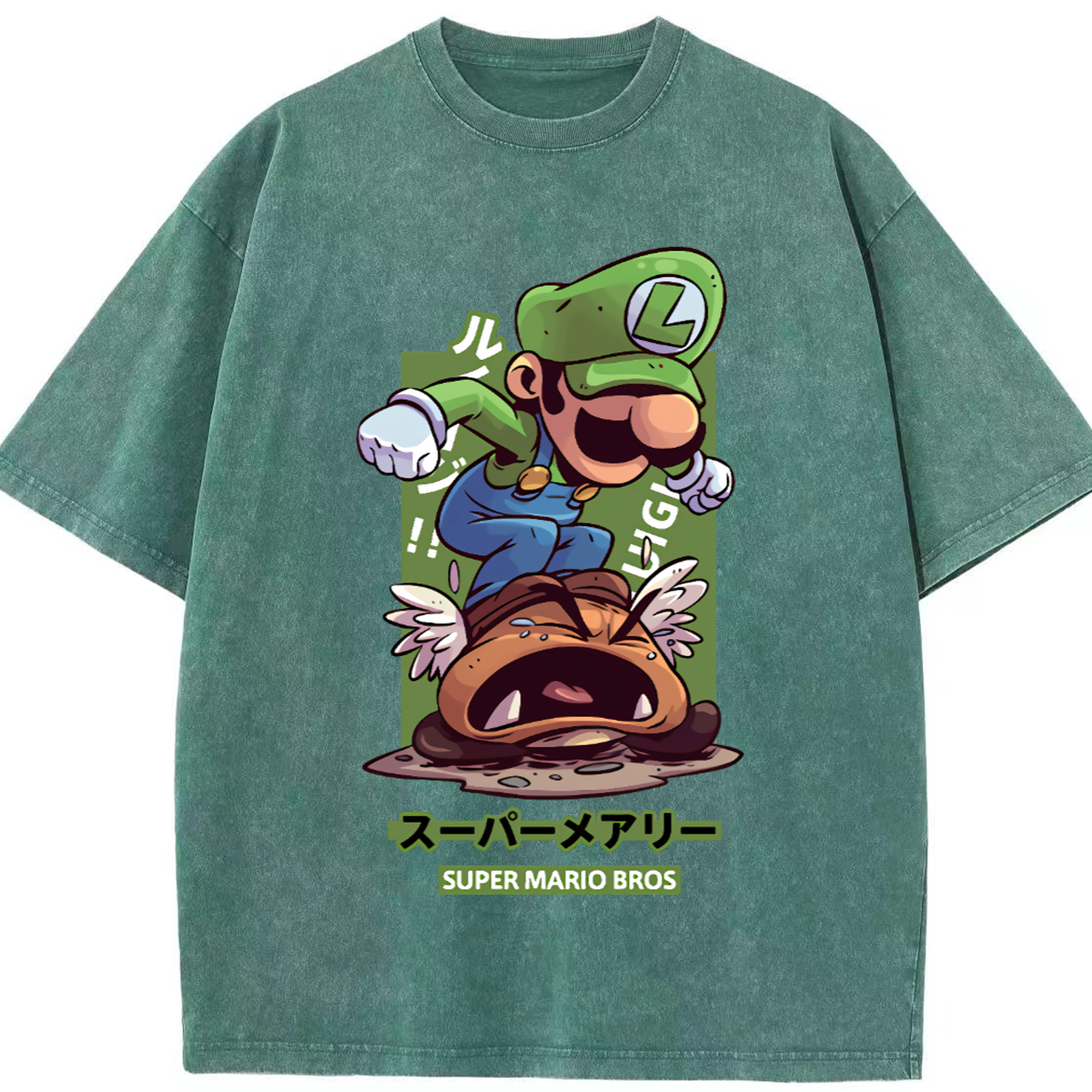 Nintendo Luigi 'Stamp Goomba' Cartoon Art T-shirt - Washed Vintage Look 230g Cotton Oversized T-Shirt With Front Heat Transfer Print – Soft, Lightweight, Stylish Fit – Comfortable Casual Wear For Sports & Everyday Use