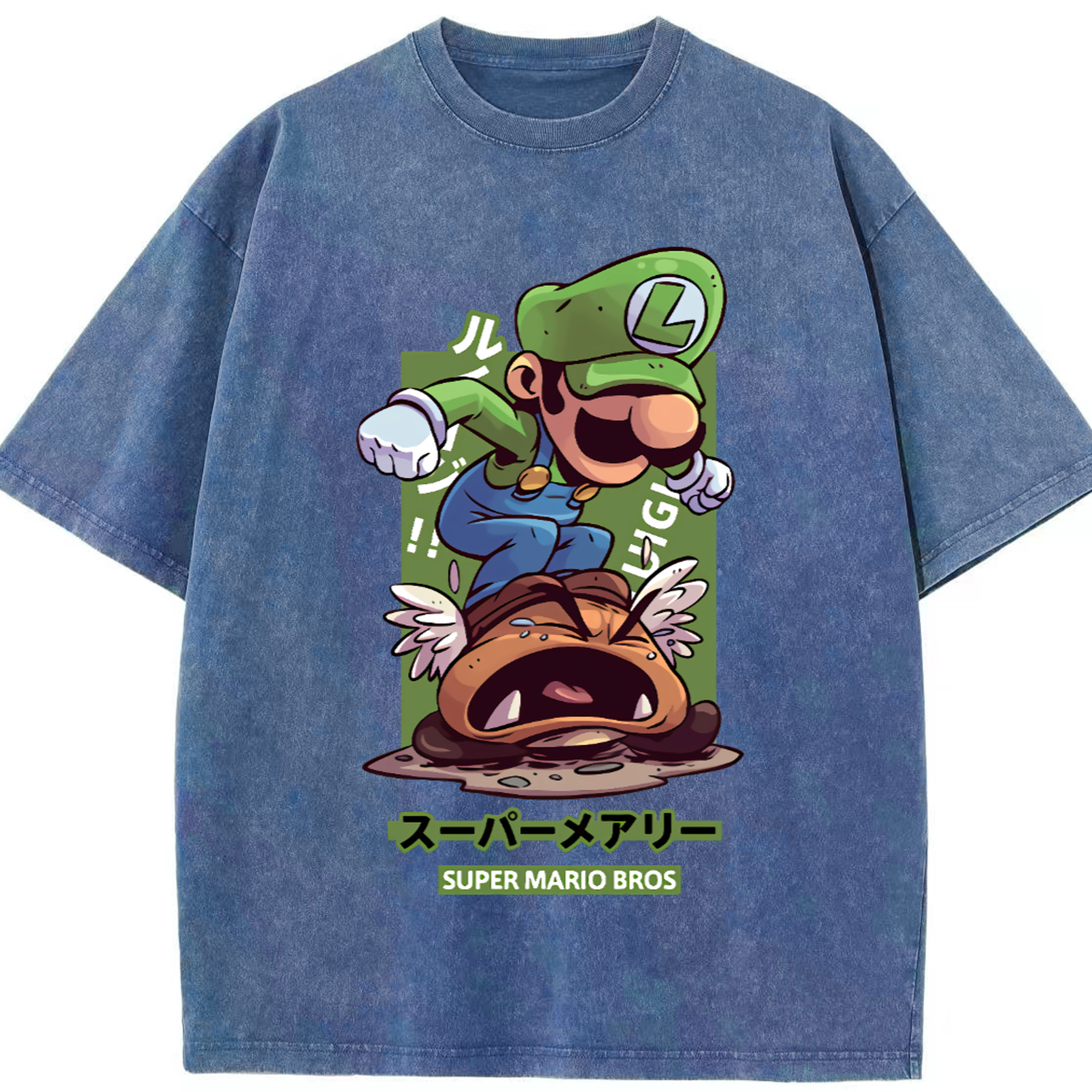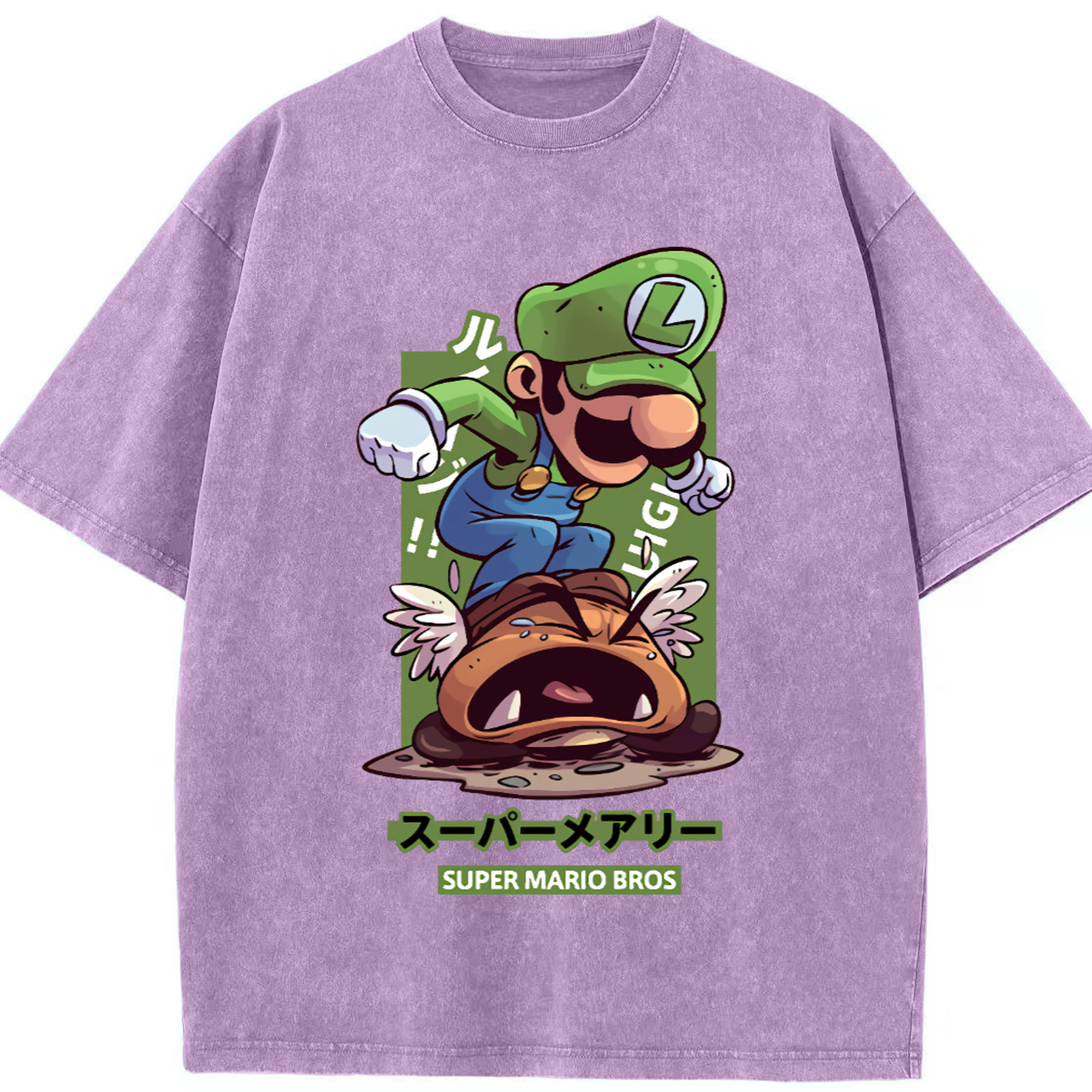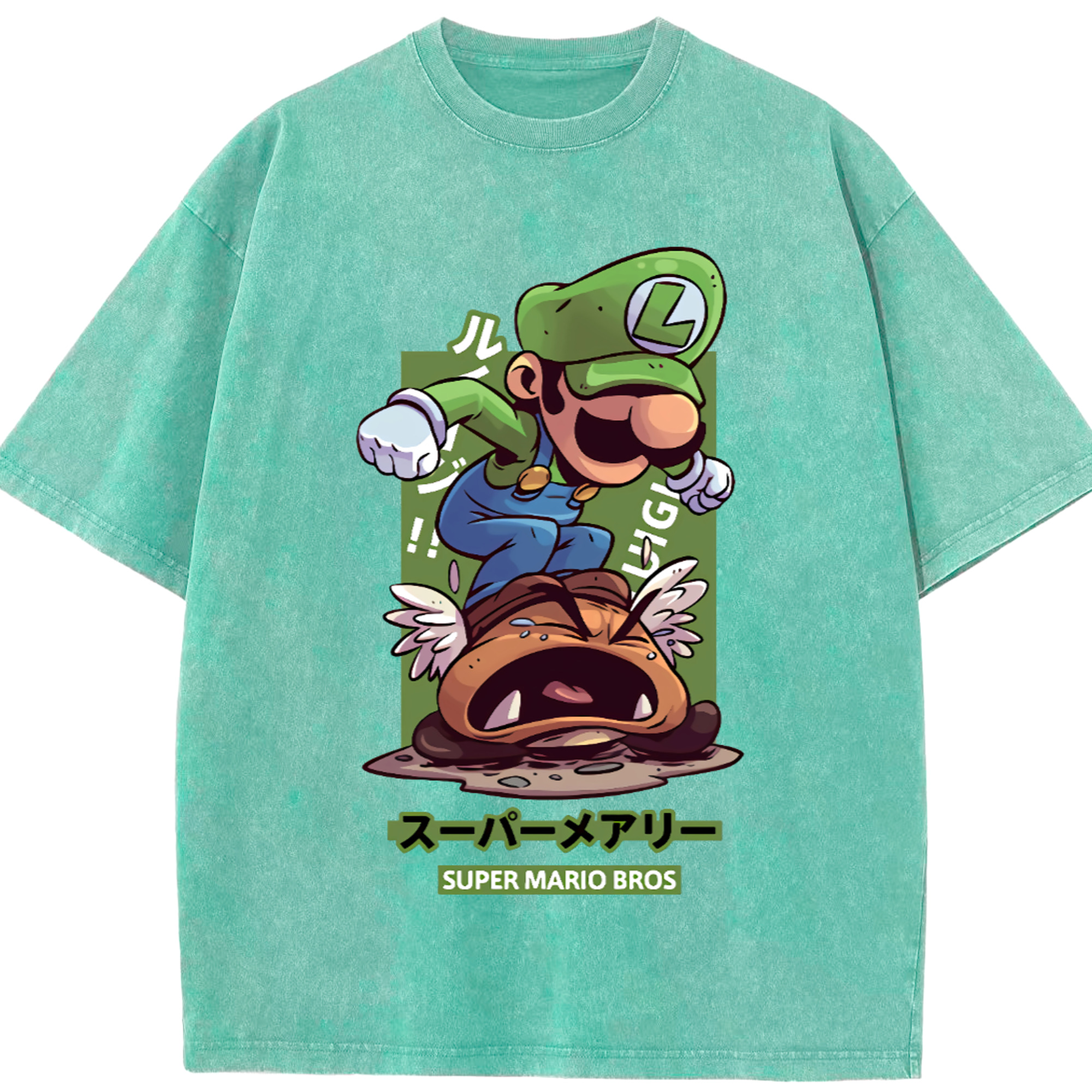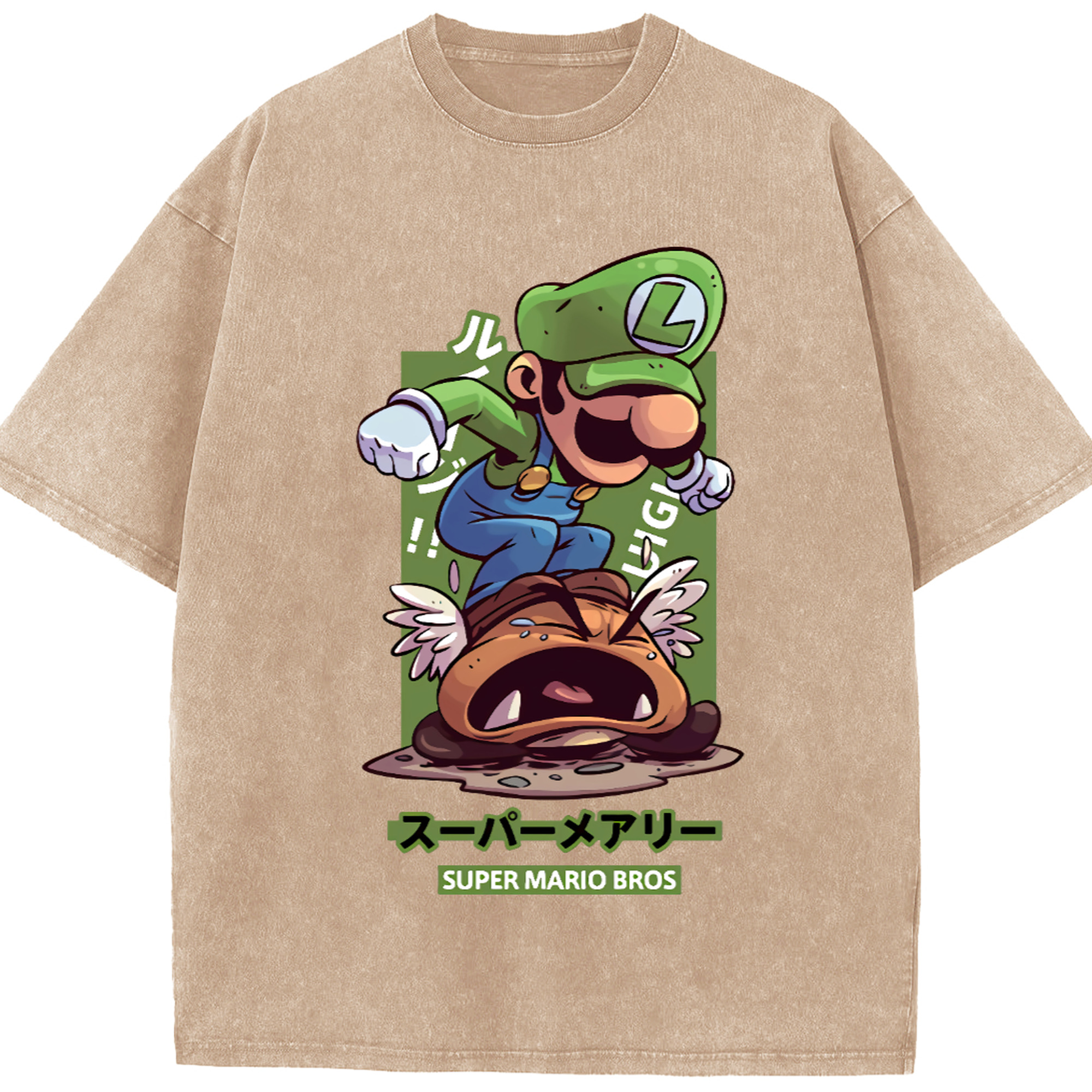 Nintendo Luigi 'Stamp Goomba' Cartoon Art T-shirt - Washed Vintage Look 230g Cotton Oversized T-Shirt With Front Heat Transfer Print – Soft, Lightweight, Stylish Fit – Comfortable Casual Wear For Sports & Everyday Use