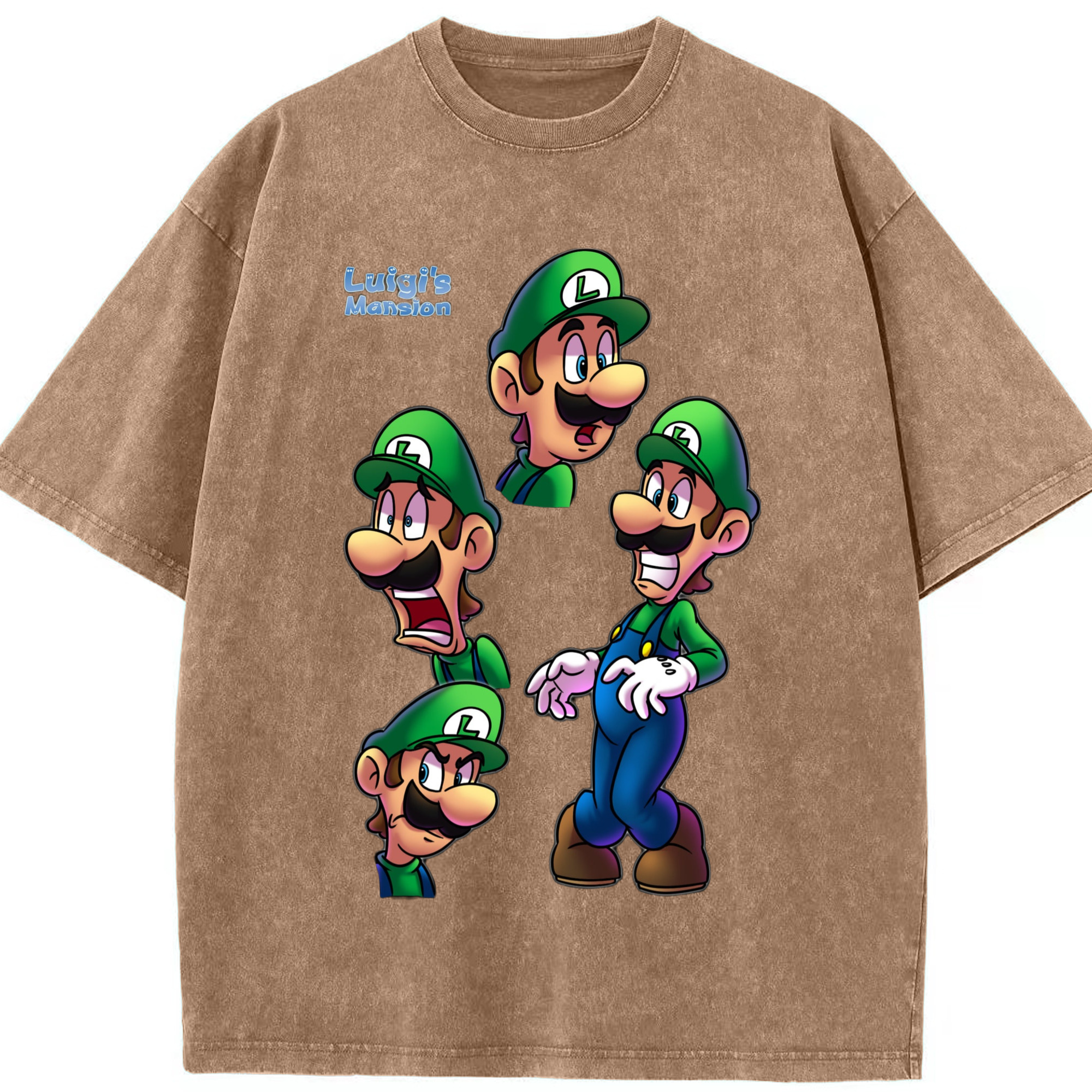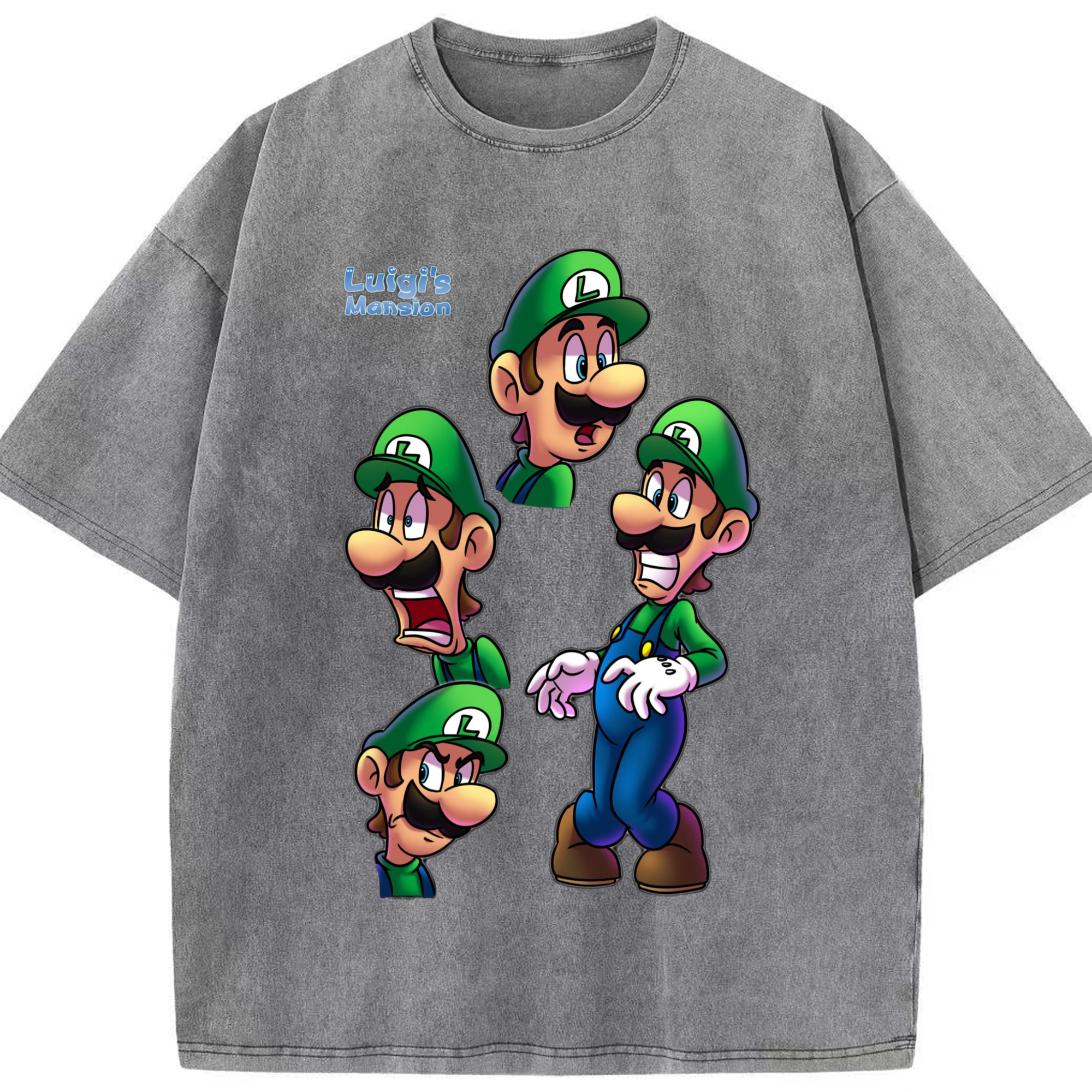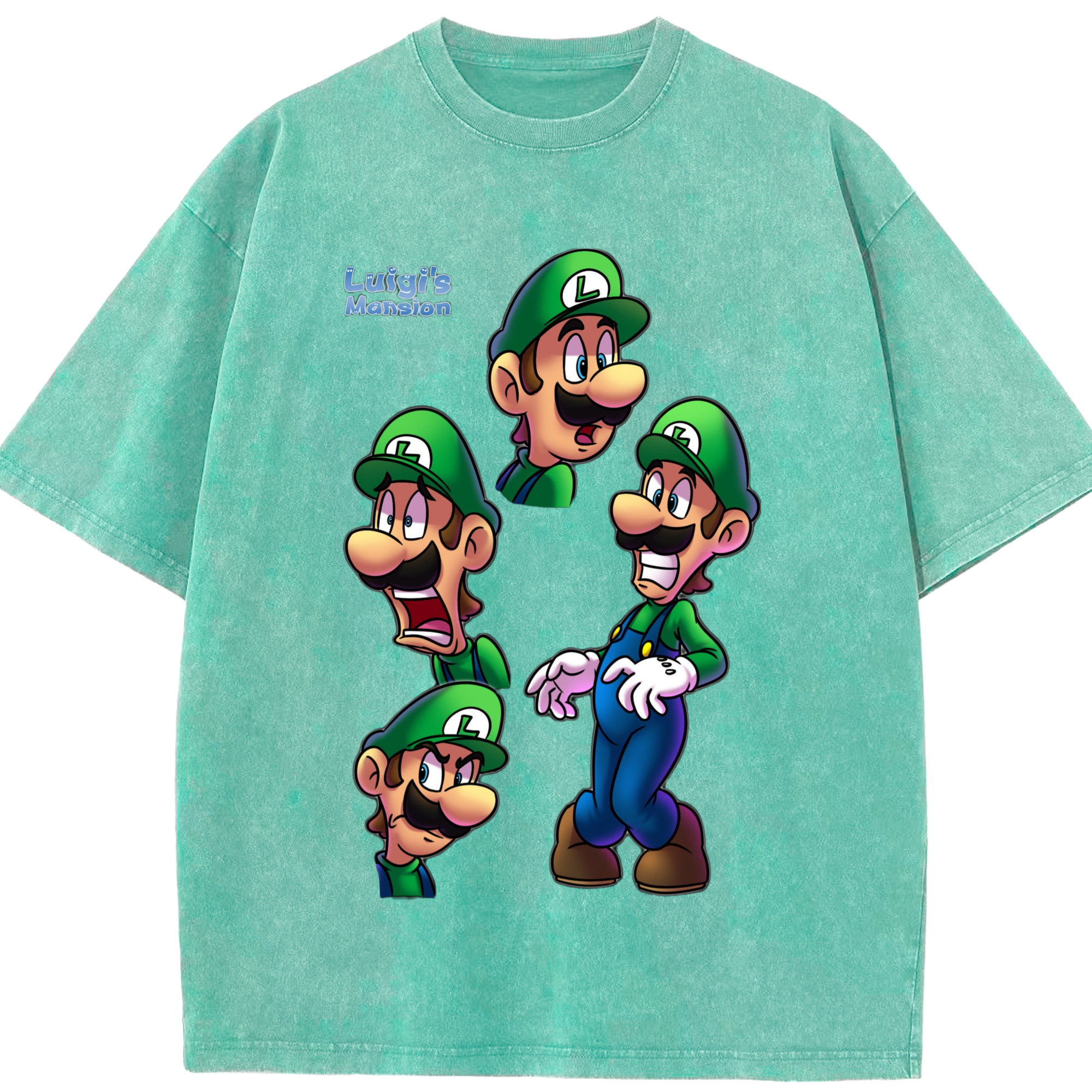 Nintendo Luigi fearful expression t-shirt - Washed Vintage Look 230g Cotton Oversized T-Shirt With Front Heat Transfer Print – Soft, Lightweight, Stylish Fit – Comfortable Casual Wear For Sports & Everyday Use