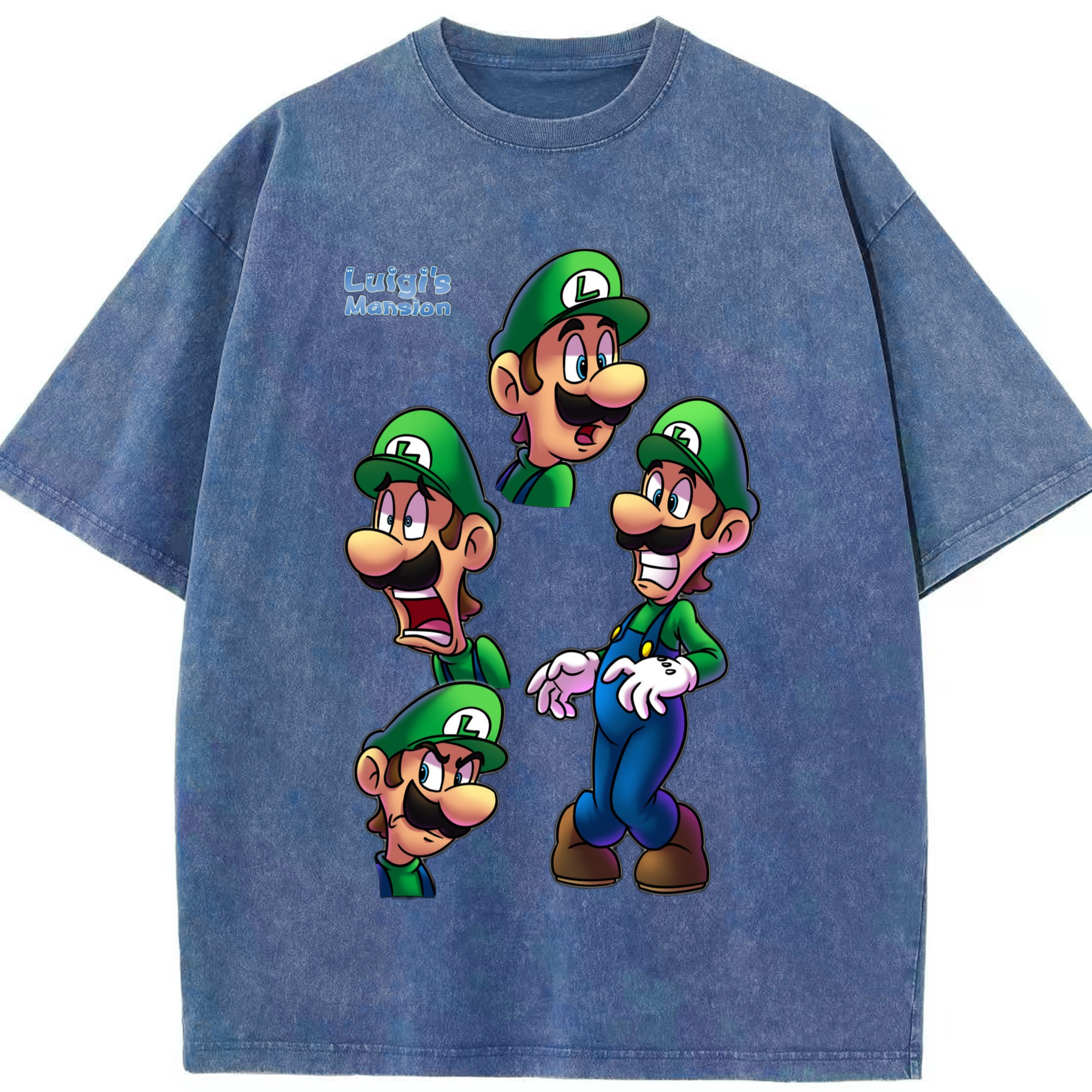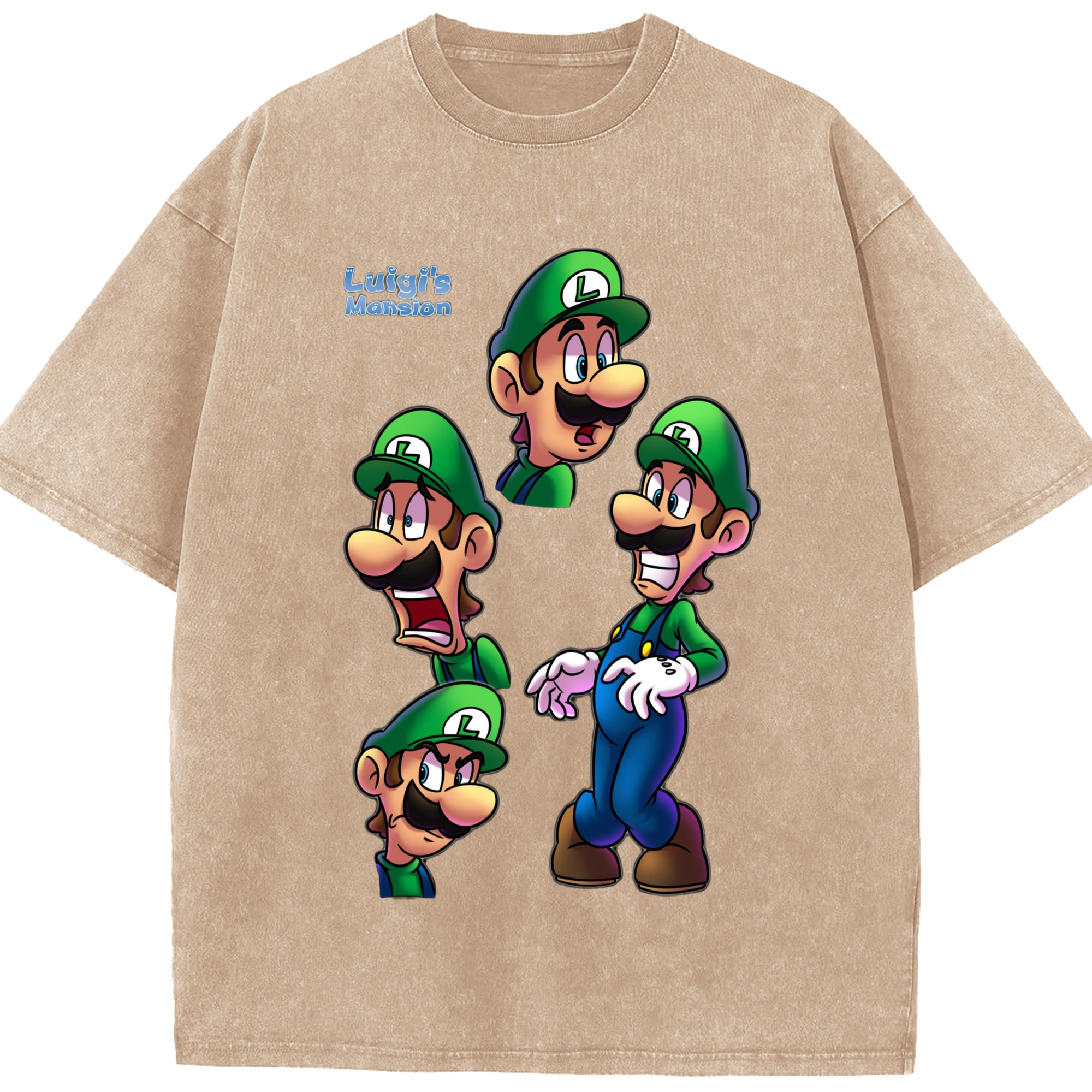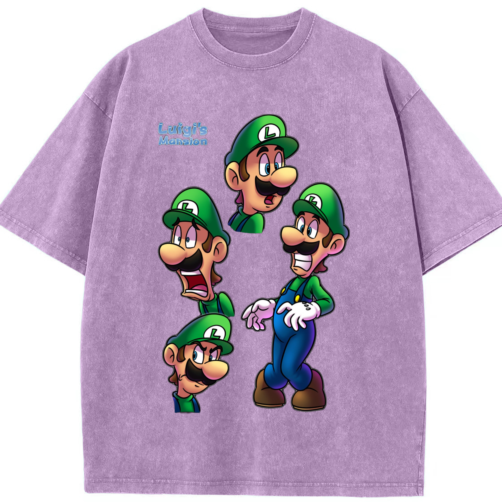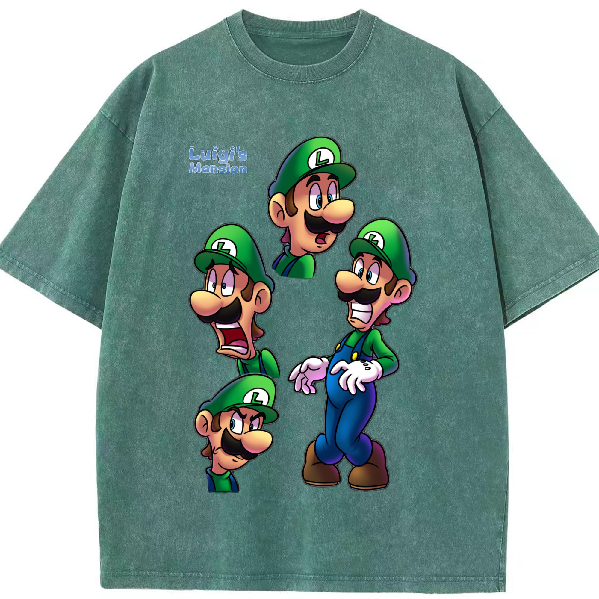 Nintendo Luigi fearful expression t-shirt - Washed Vintage Look 230g Cotton Oversized T-Shirt With Front Heat Transfer Print – Soft, Lightweight, Stylish Fit – Comfortable Casual Wear For Sports & Everyday Use