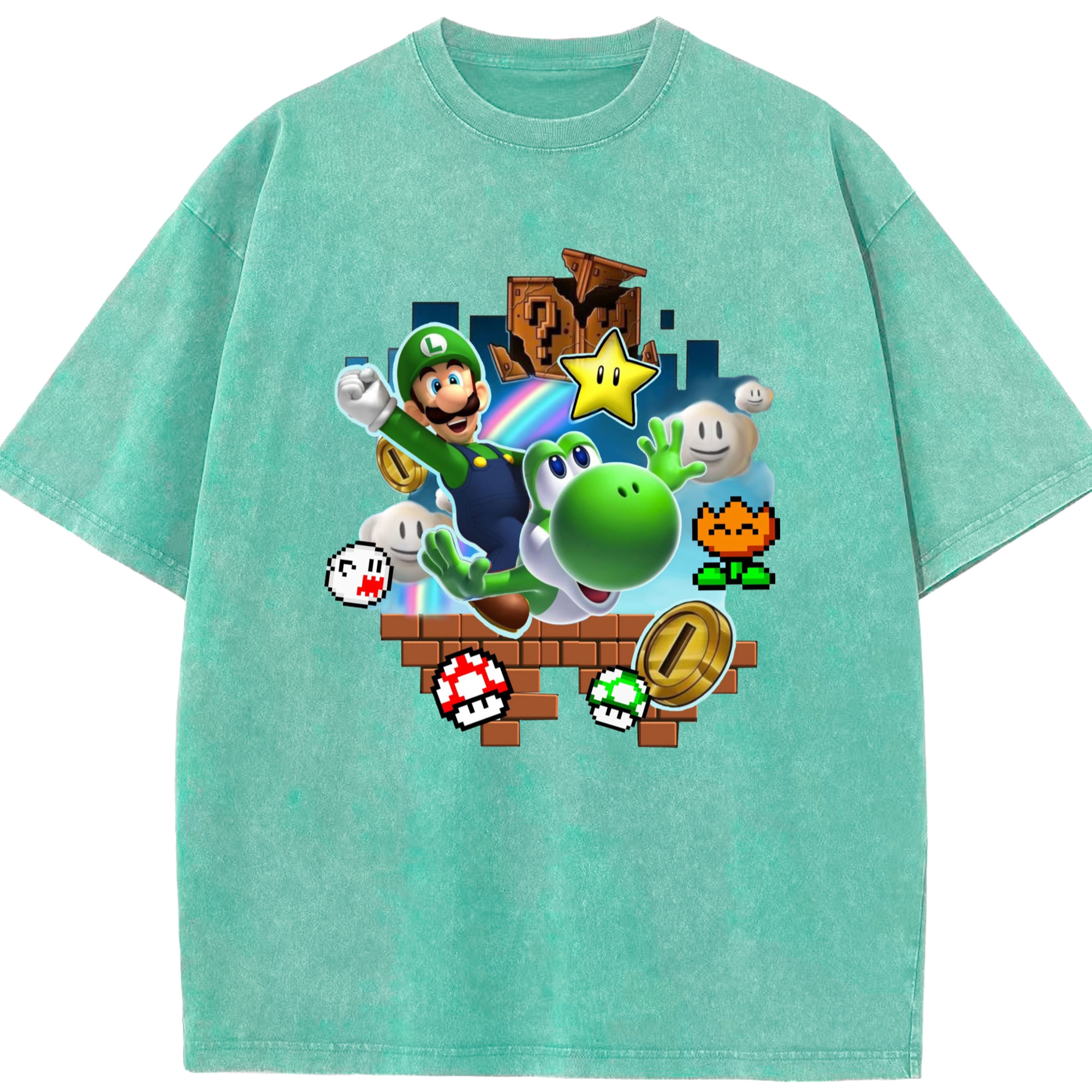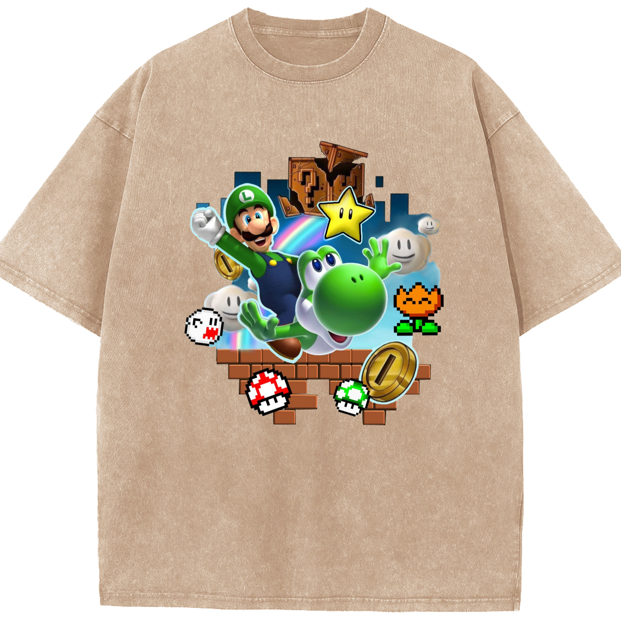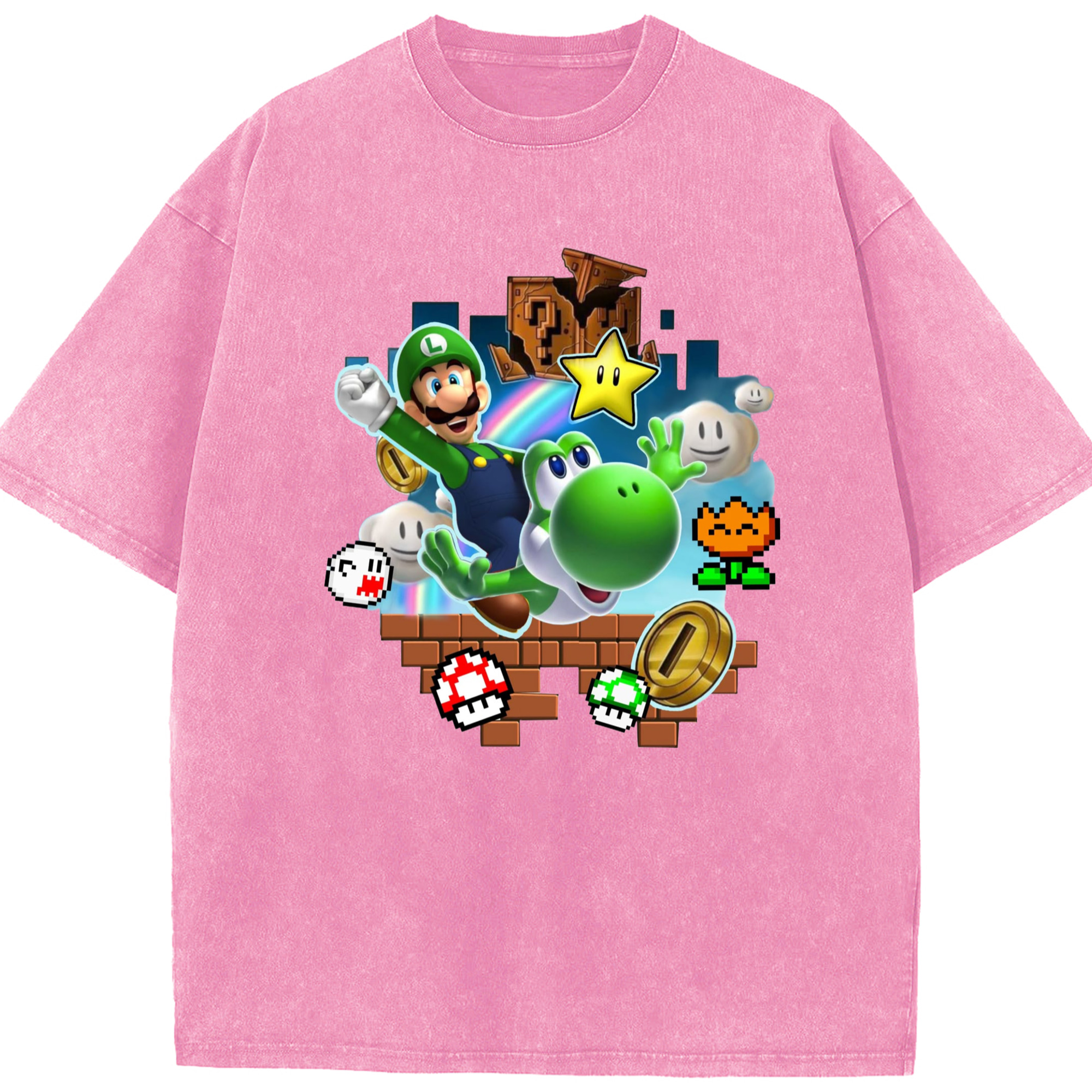 Nintendo mario and yoshi t shirts - Washed Vintage Look 230g Cotton Oversized T-Shirt With Front Heat Transfer Print – Soft, Lightweight, Stylish Fit – Comfortable Casual Wear For Sports & Everyday Use