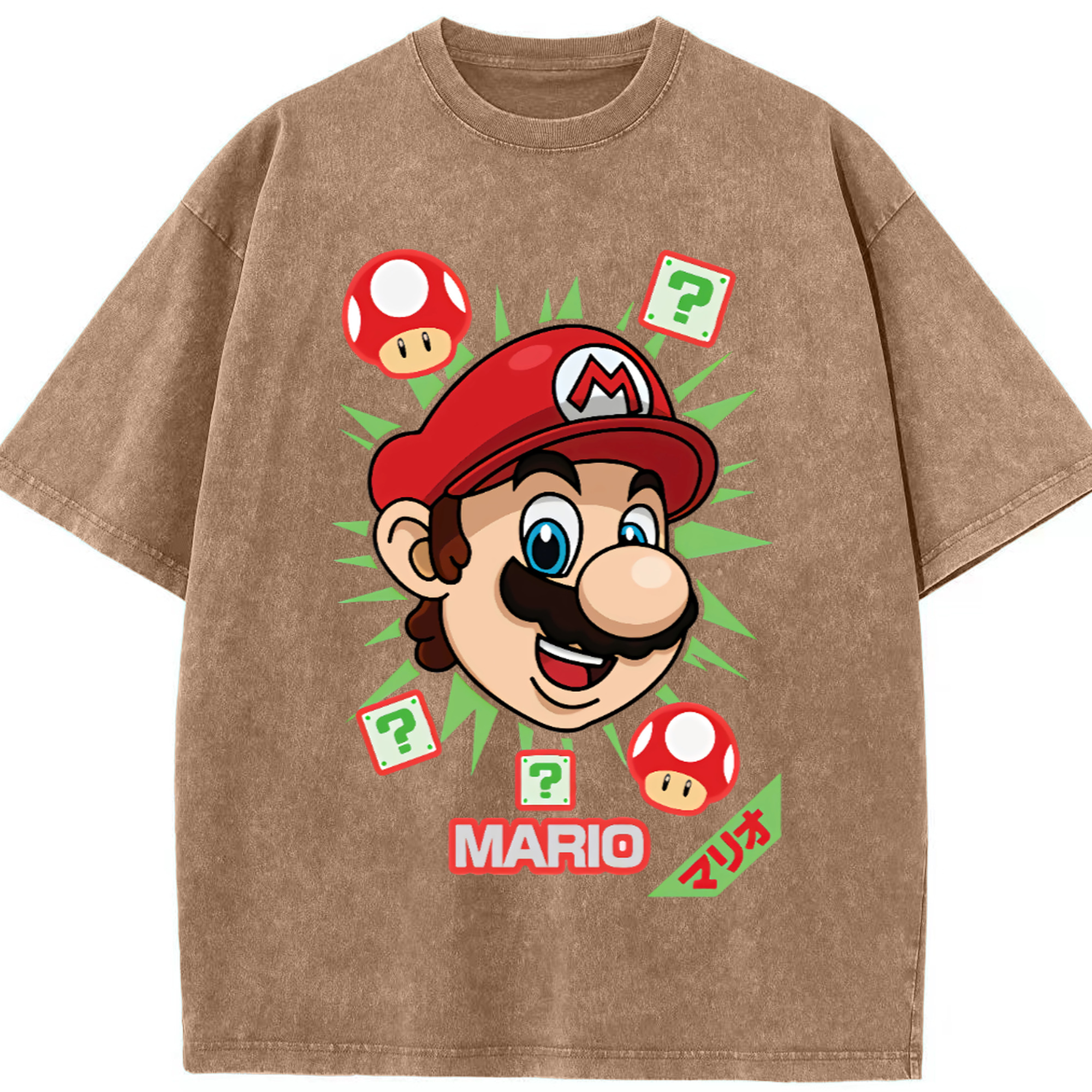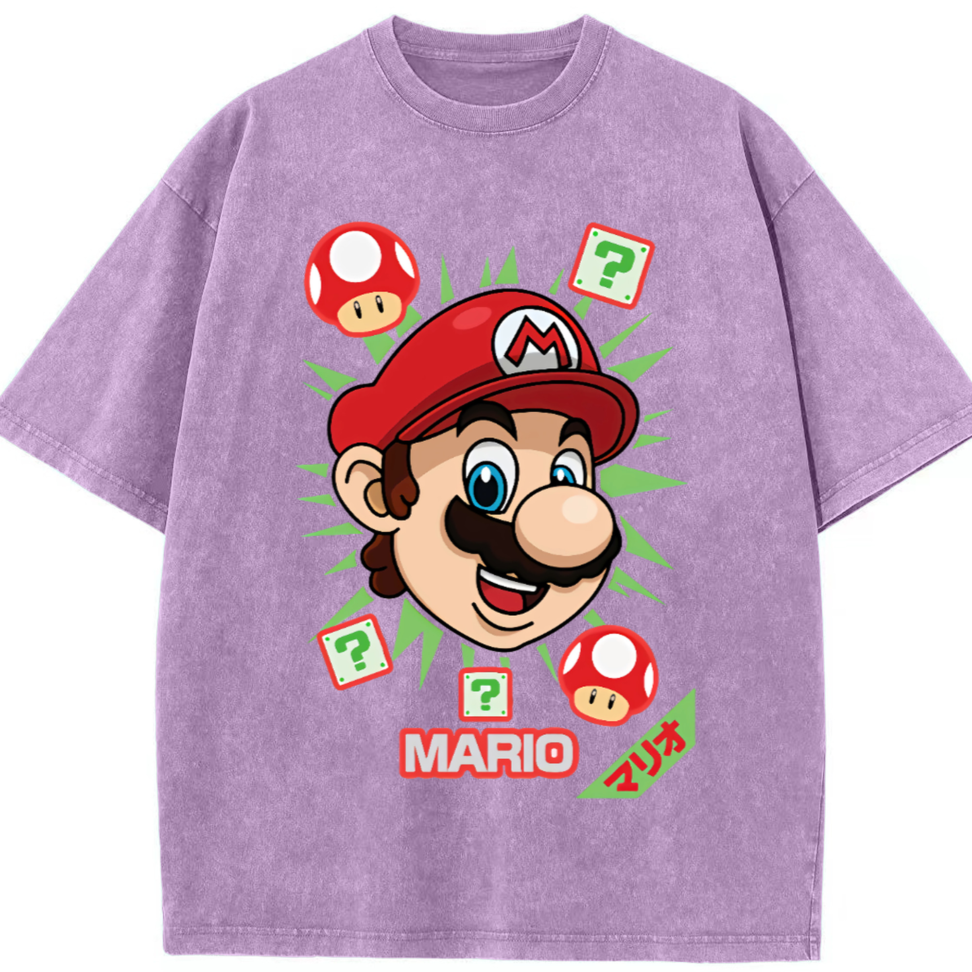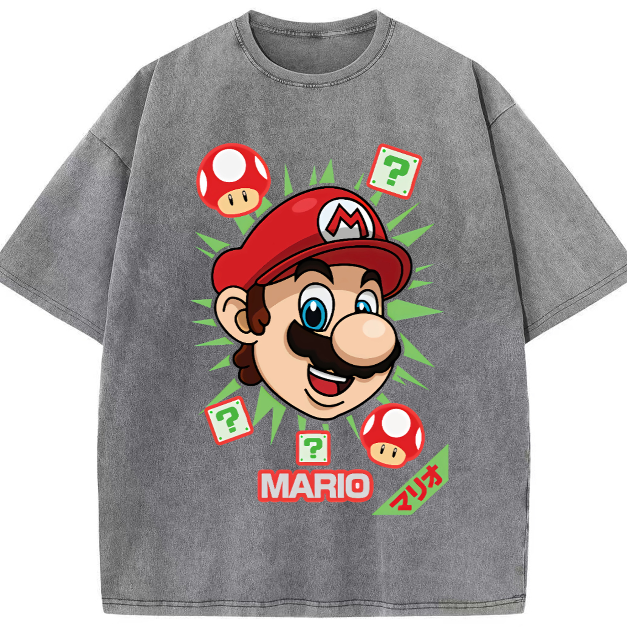 Nintendo mario cartoon profile t-shirt - Washed Vintage Look 230g Cotton Oversized T-Shirt With Front Heat Transfer Print – Soft, Lightweight, Stylish Fit – Comfortable Casual Wear For Sports & Everyday Use