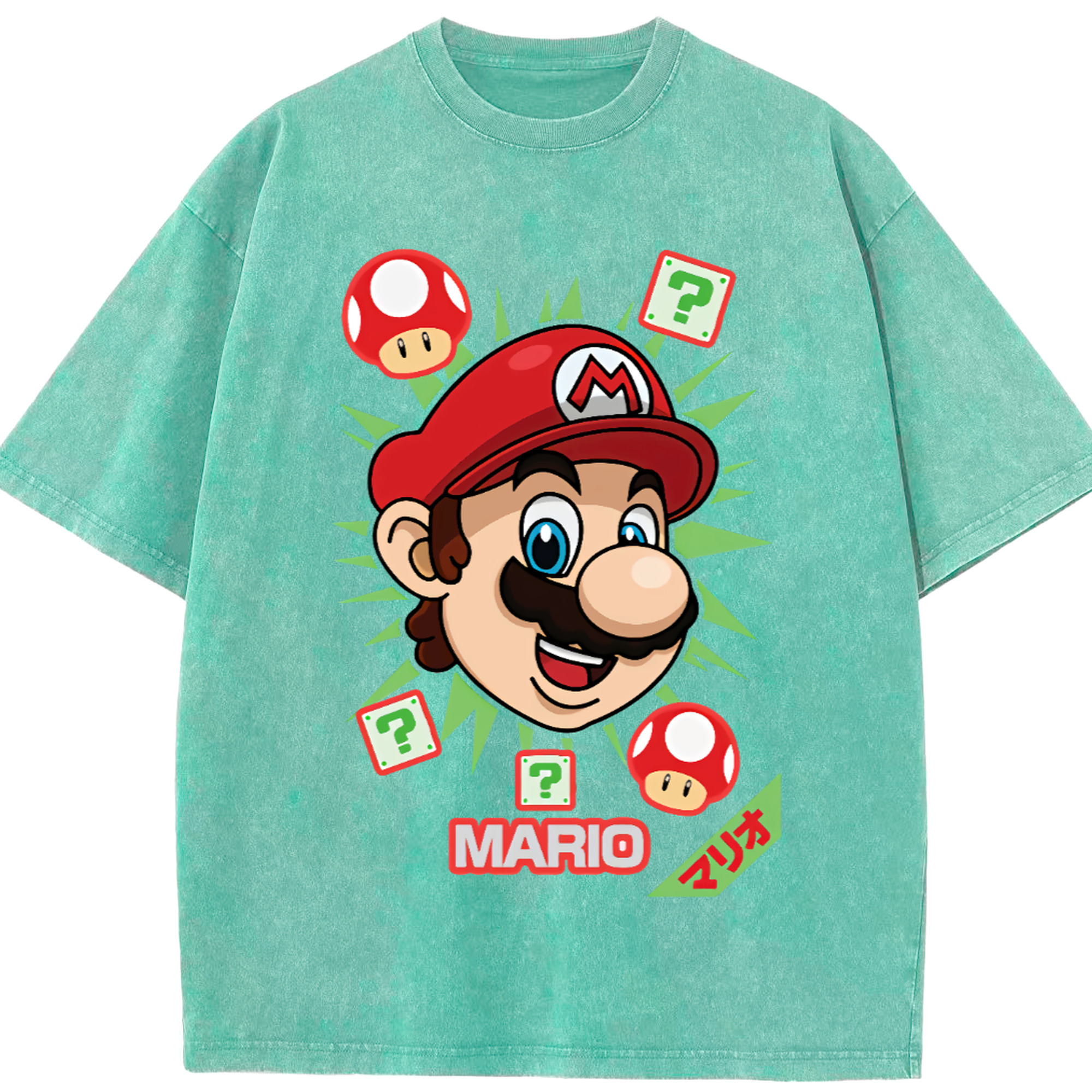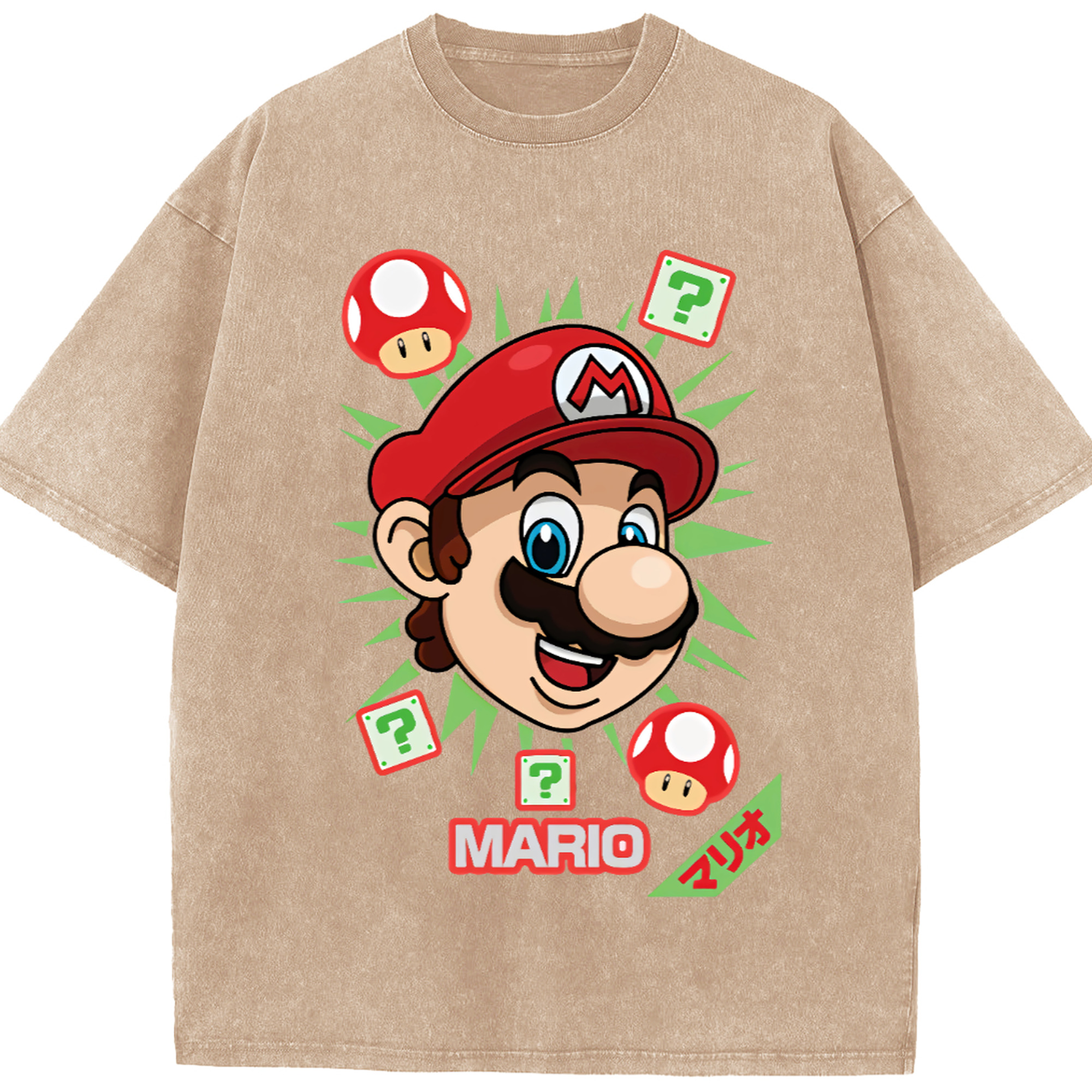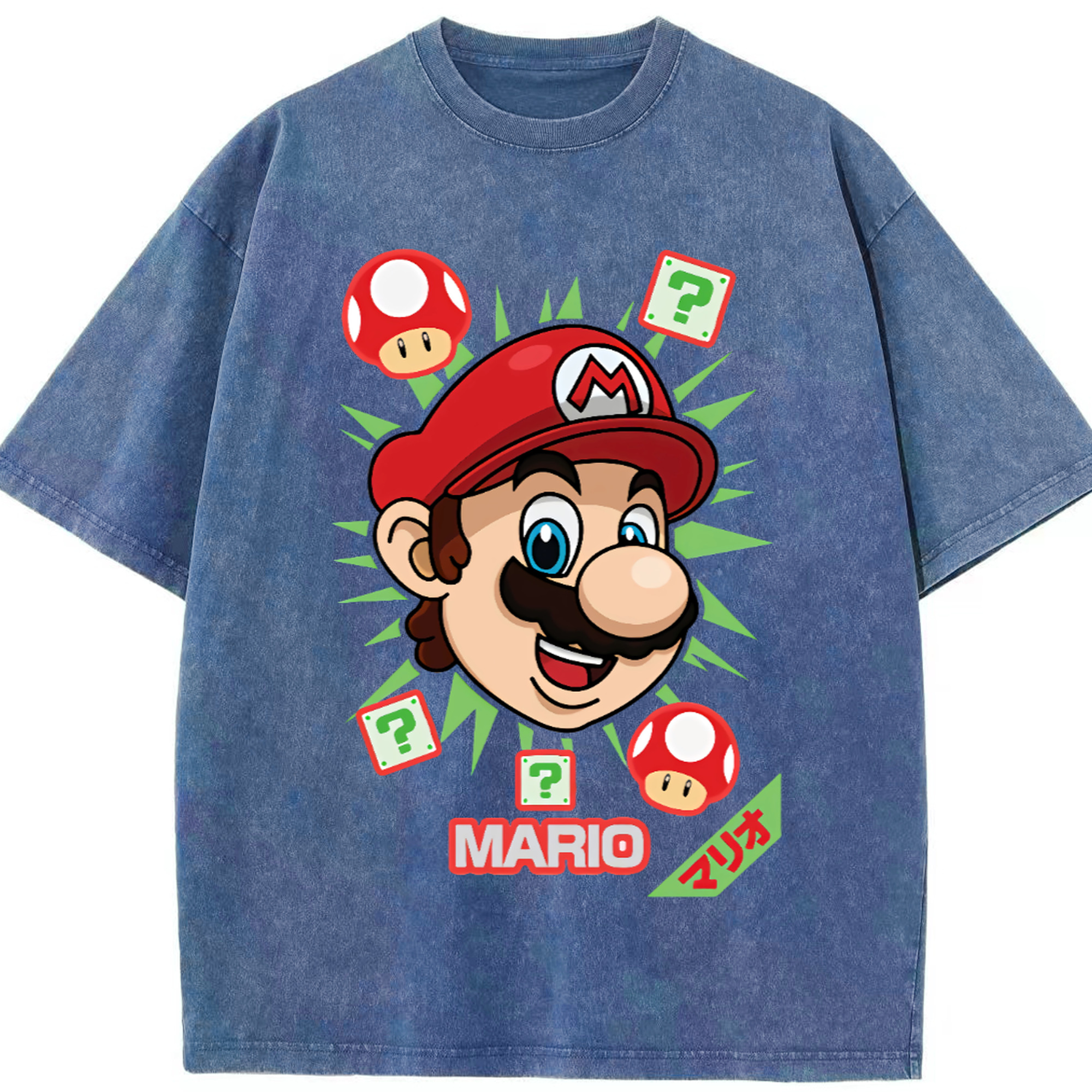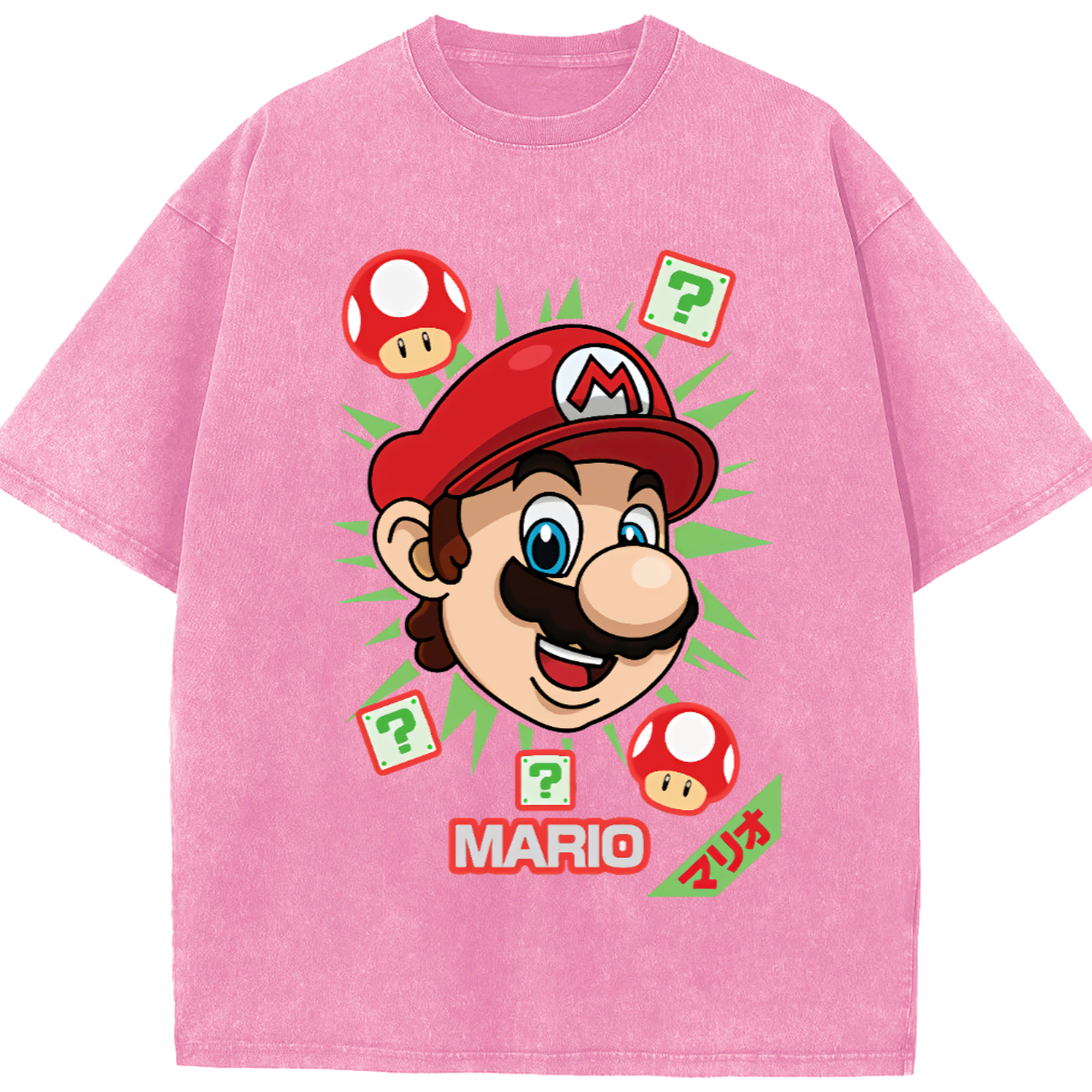 Nintendo mario cartoon profile t-shirt - Washed Vintage Look 230g Cotton Oversized T-Shirt With Front Heat Transfer Print – Soft, Lightweight, Stylish Fit – Comfortable Casual Wear For Sports & Everyday Use