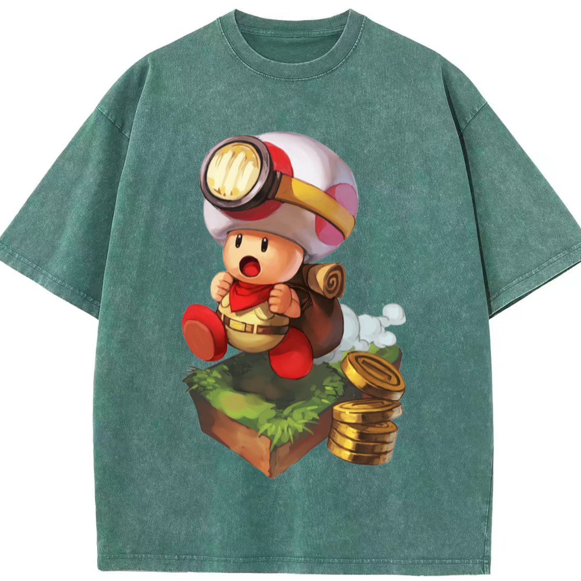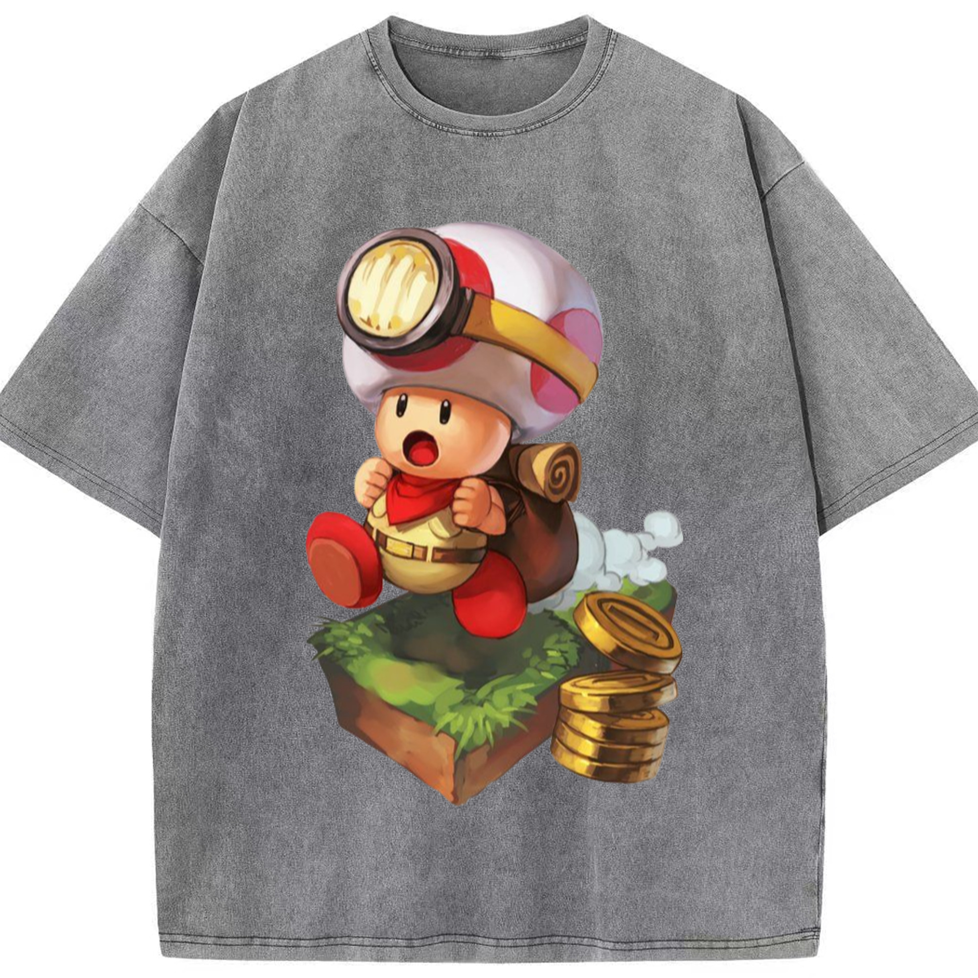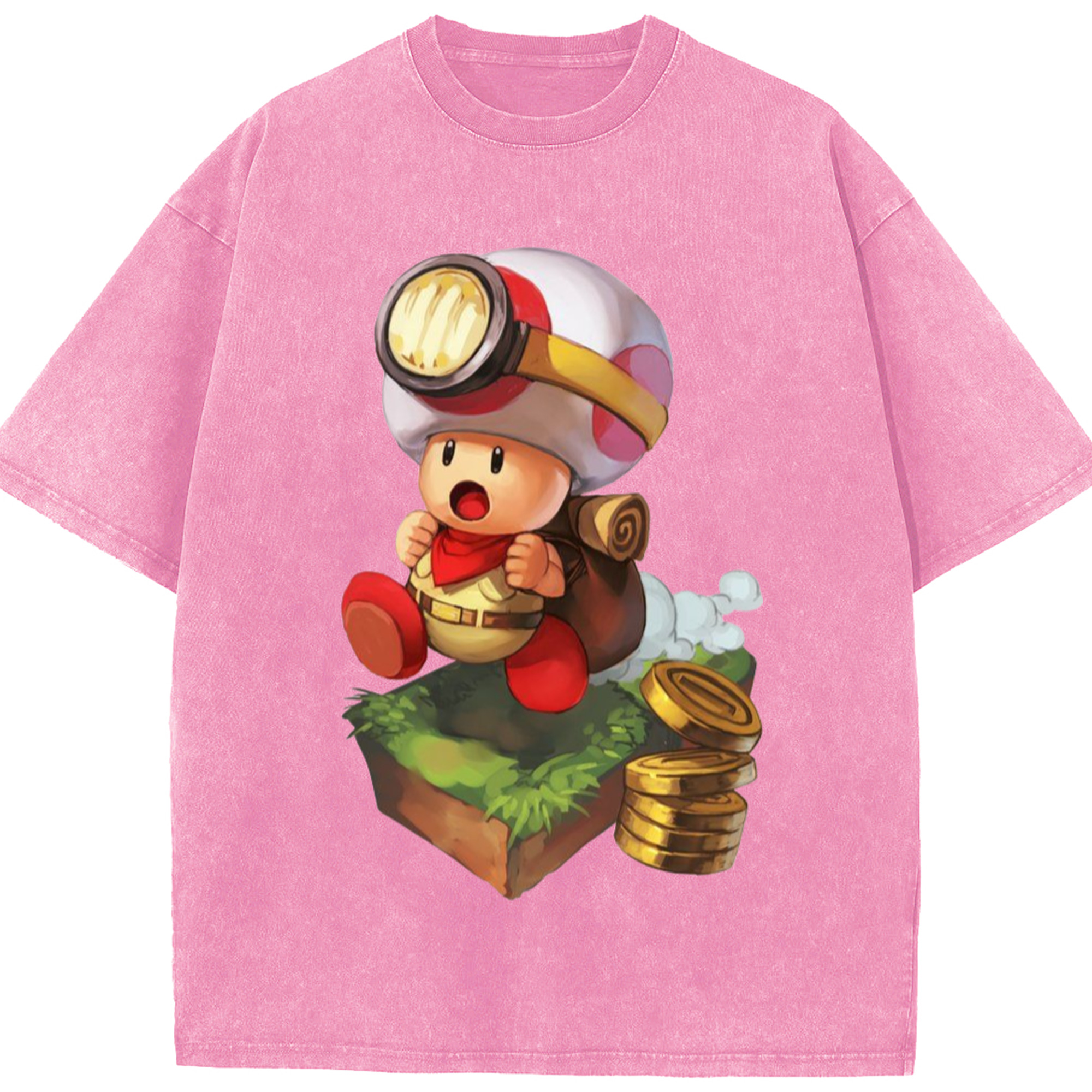 Nintendo Red 'find cion' Toad Shirt - Washed Vintage Look 230g Cotton Oversized T-Shirt With Front Heat Transfer Print – Soft, Lightweight, Stylish Fit – Comfortable Casual Wear For Sports & Everyday Use